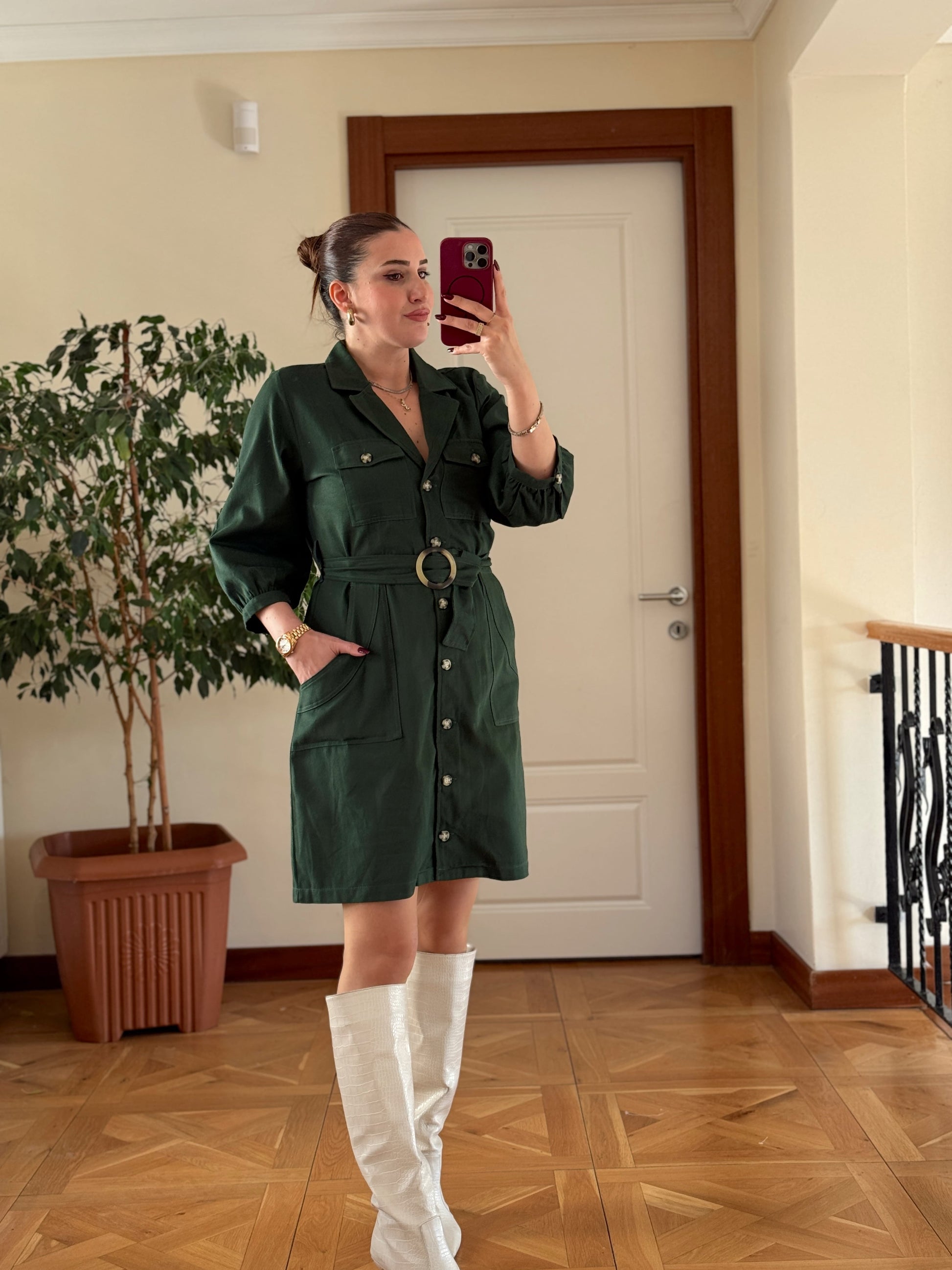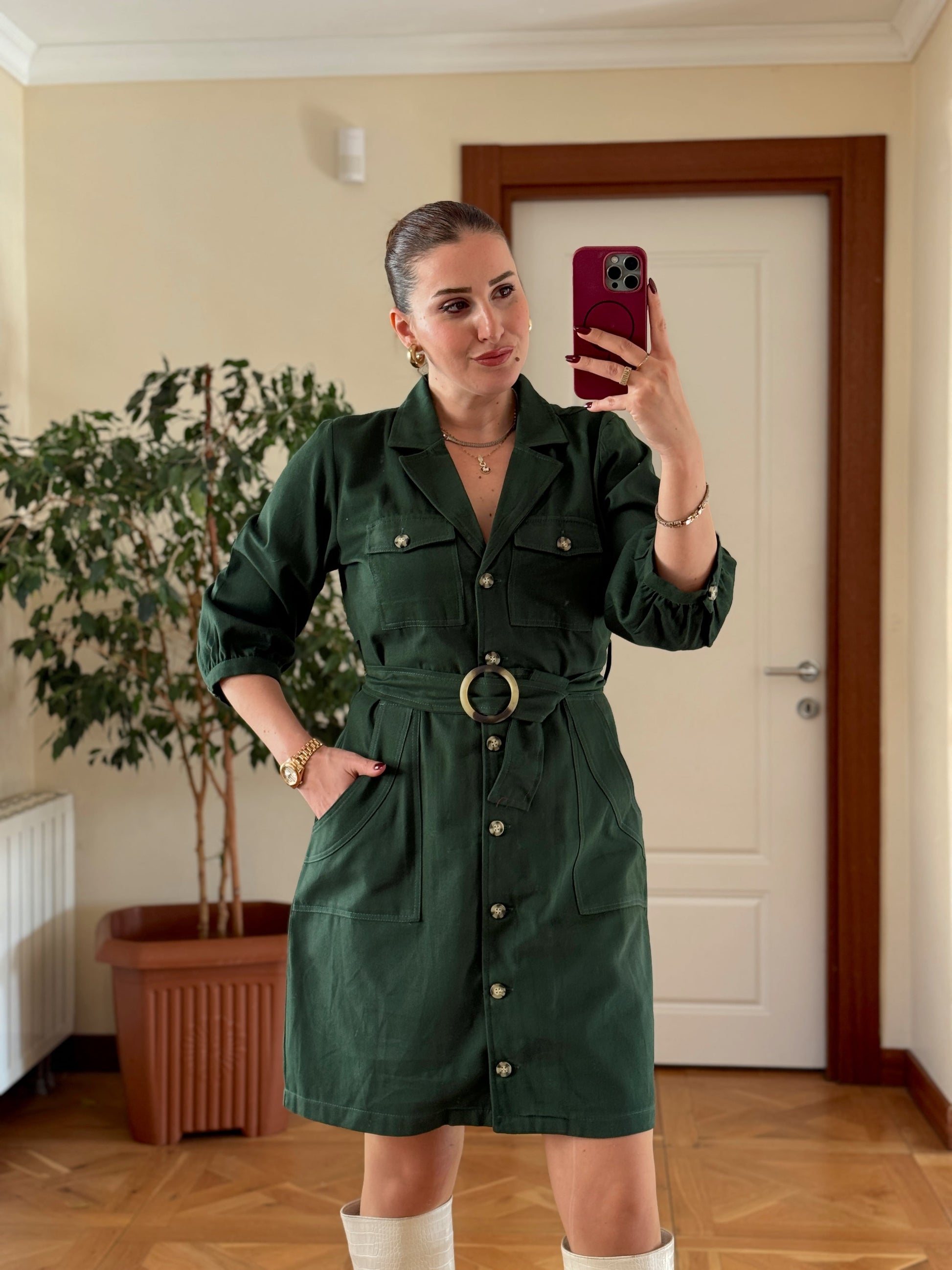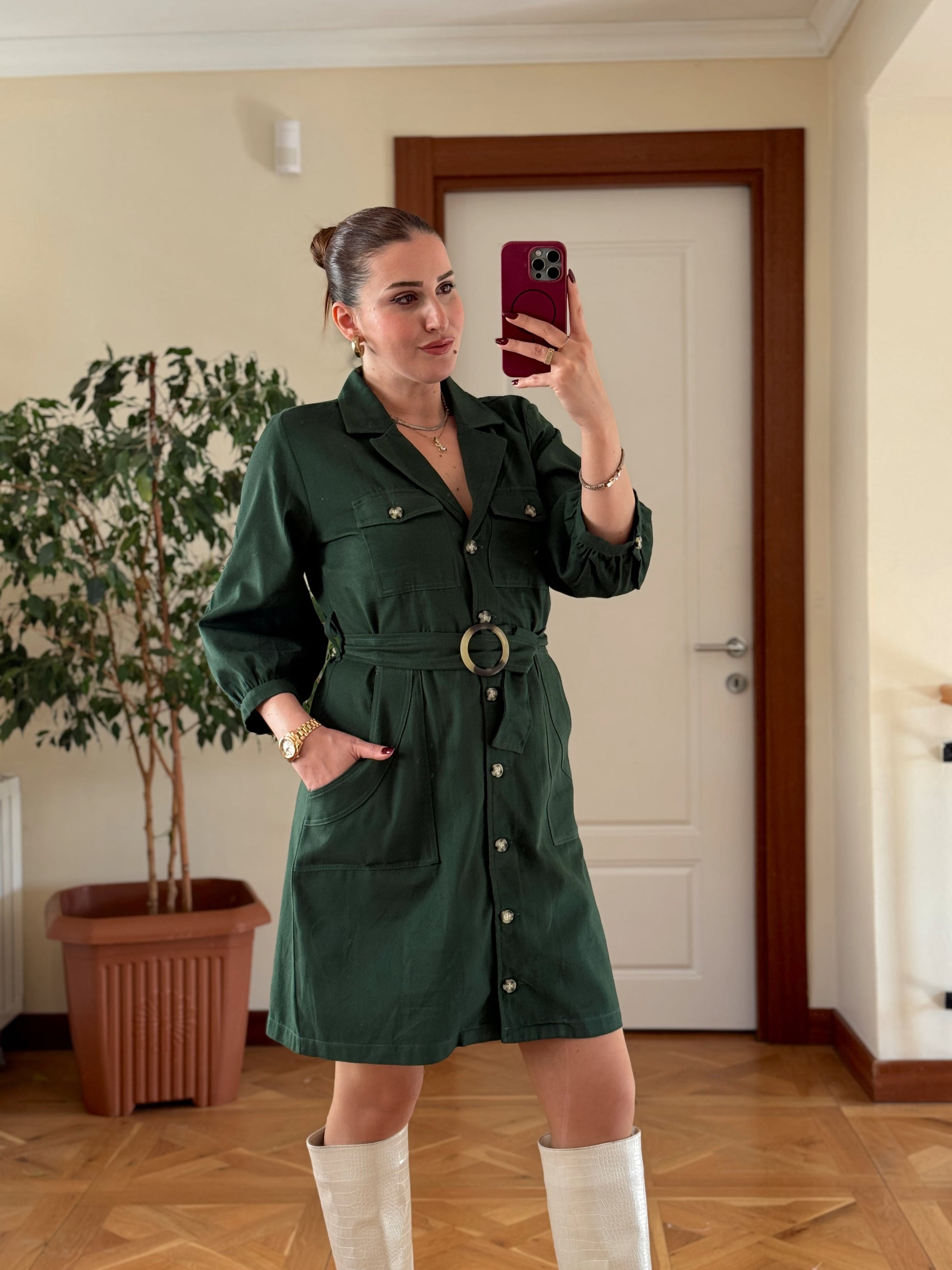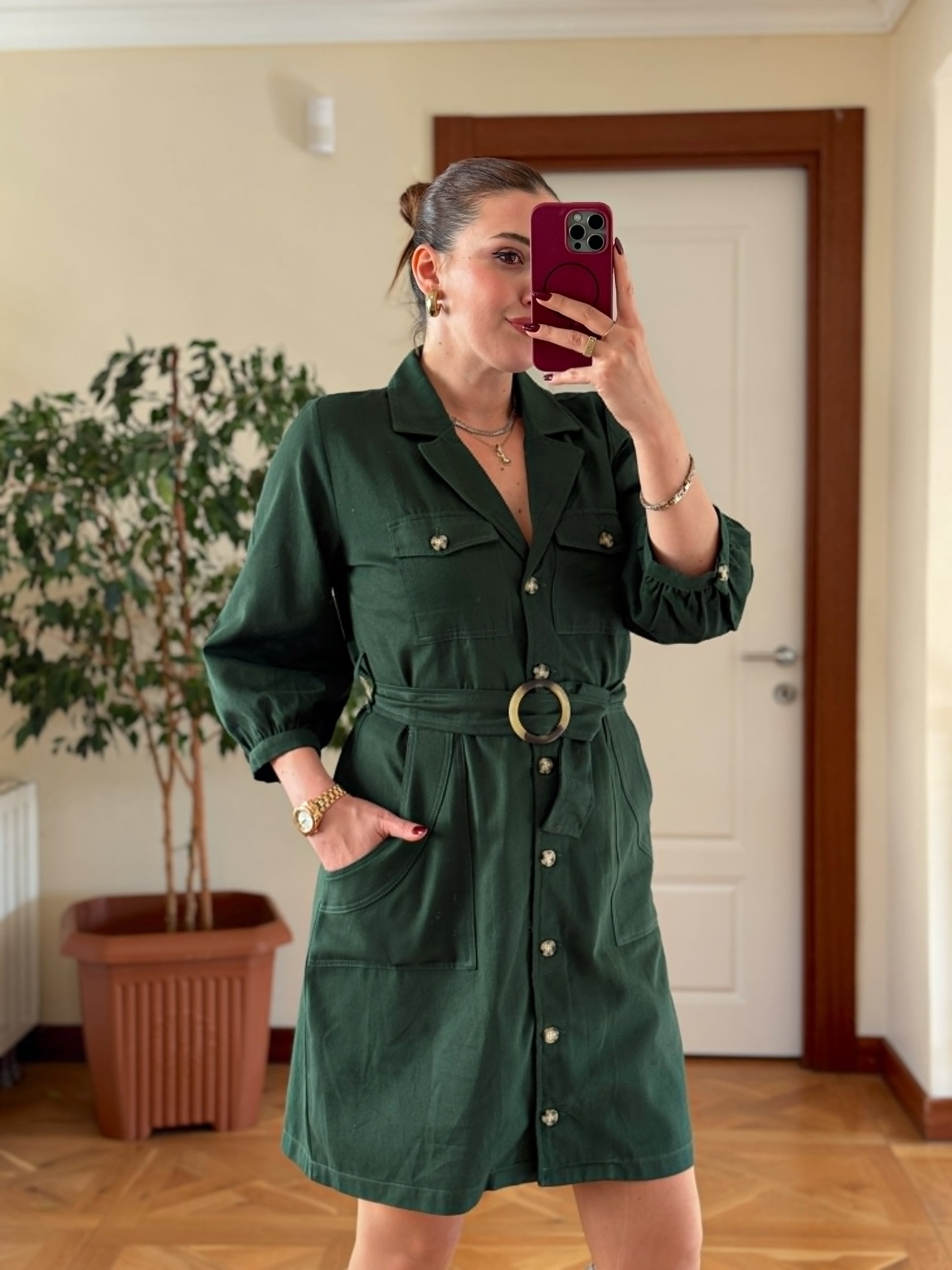 Kruvaze yaka cepli full düğme elbise-YEŞİL