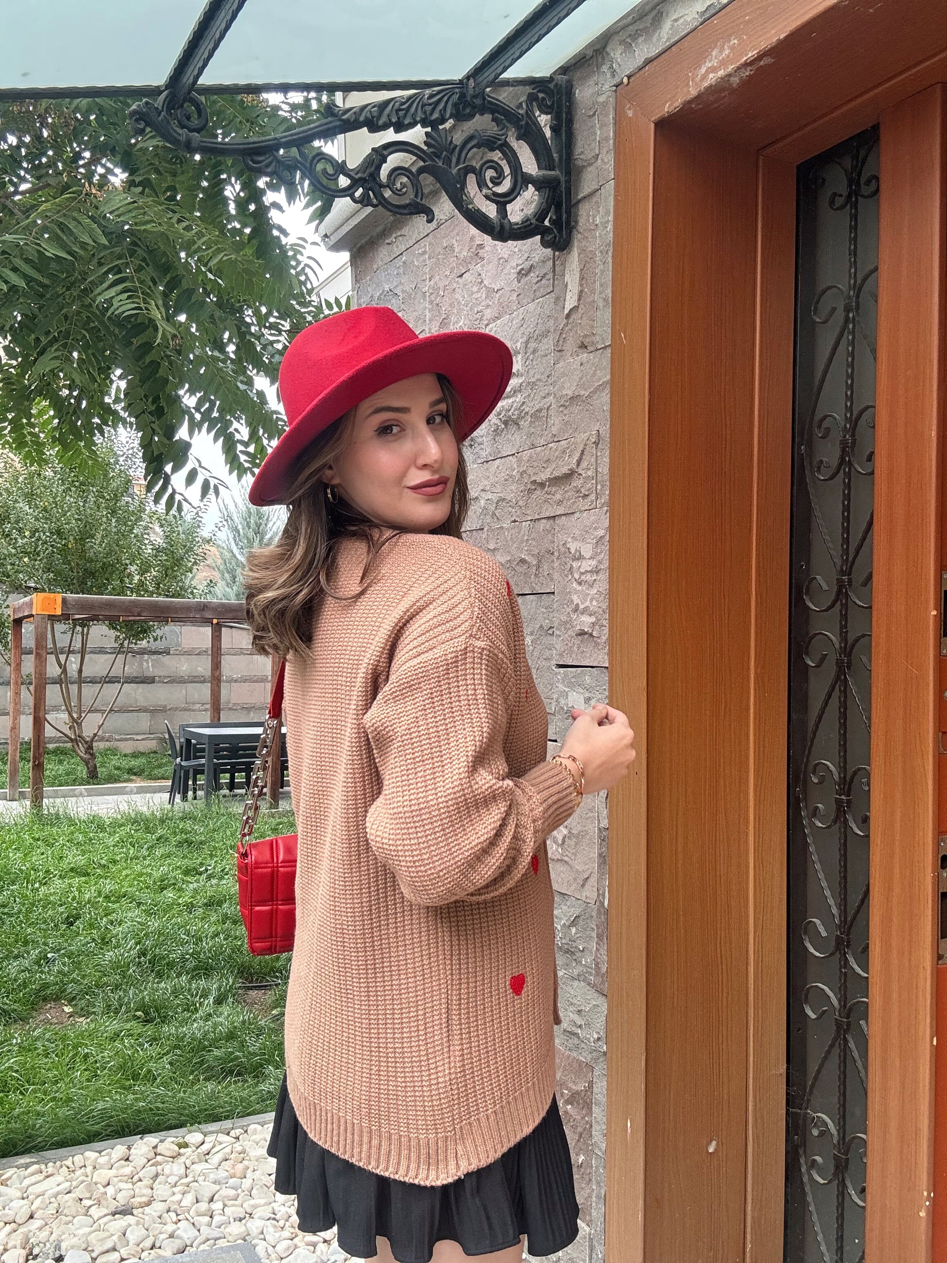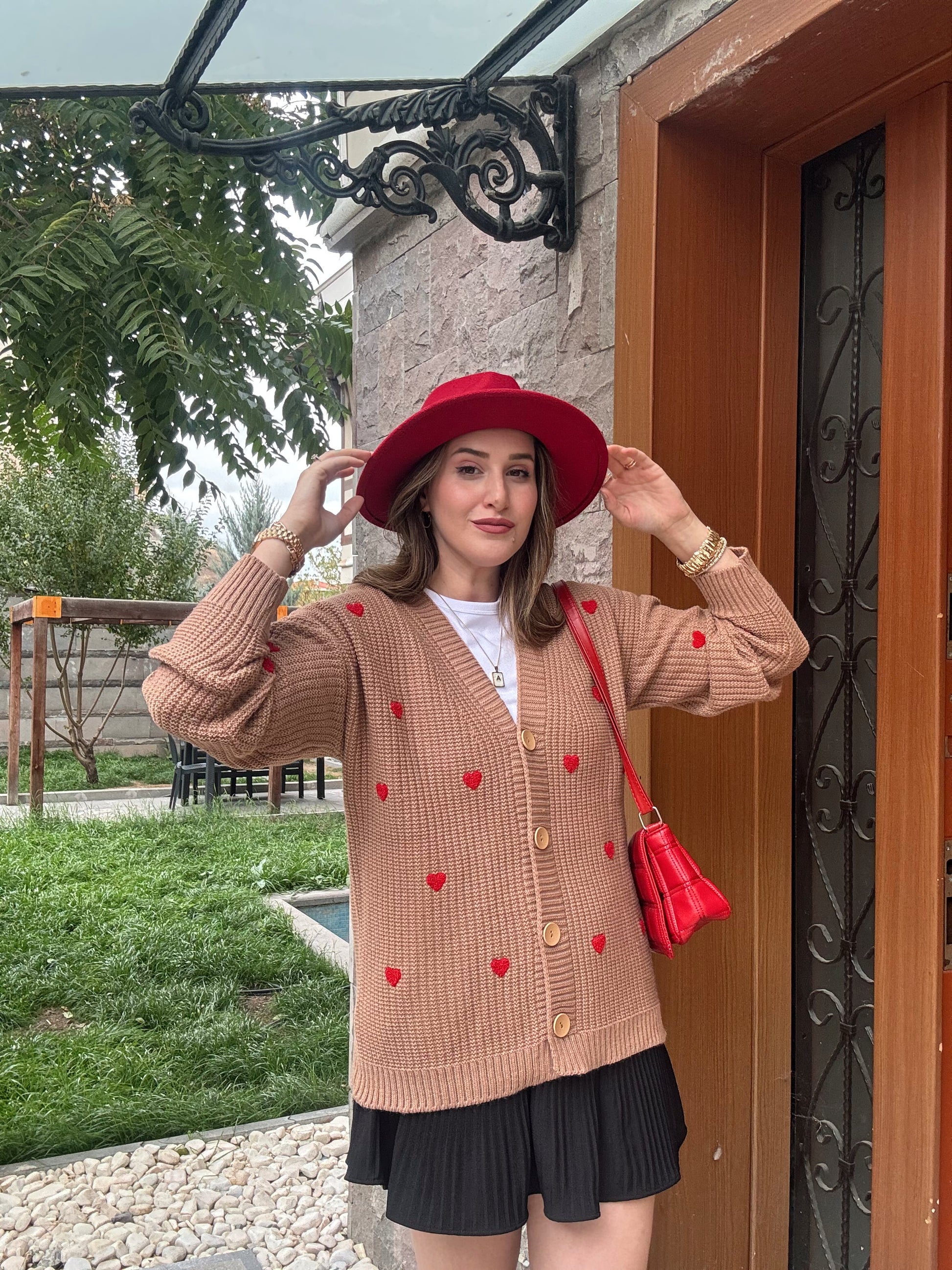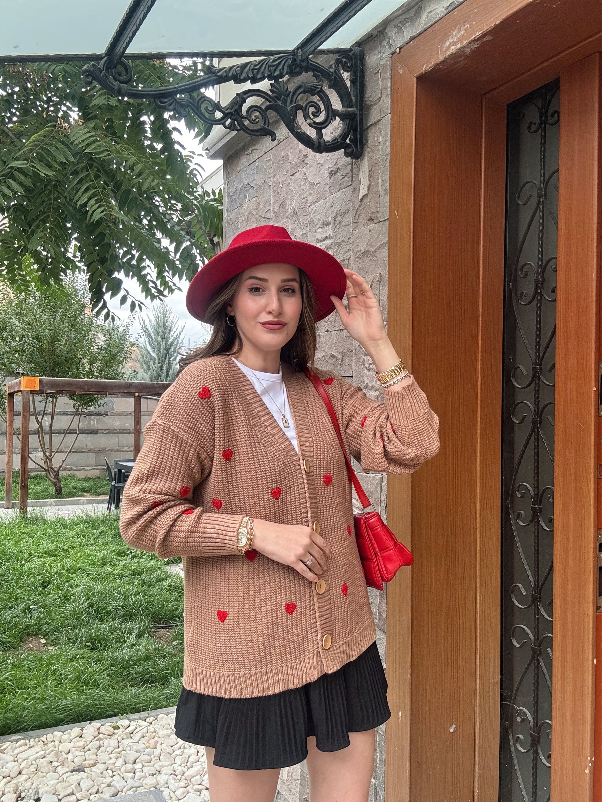 Küçük Kalpli Düğmeli Hırka - CAMEL