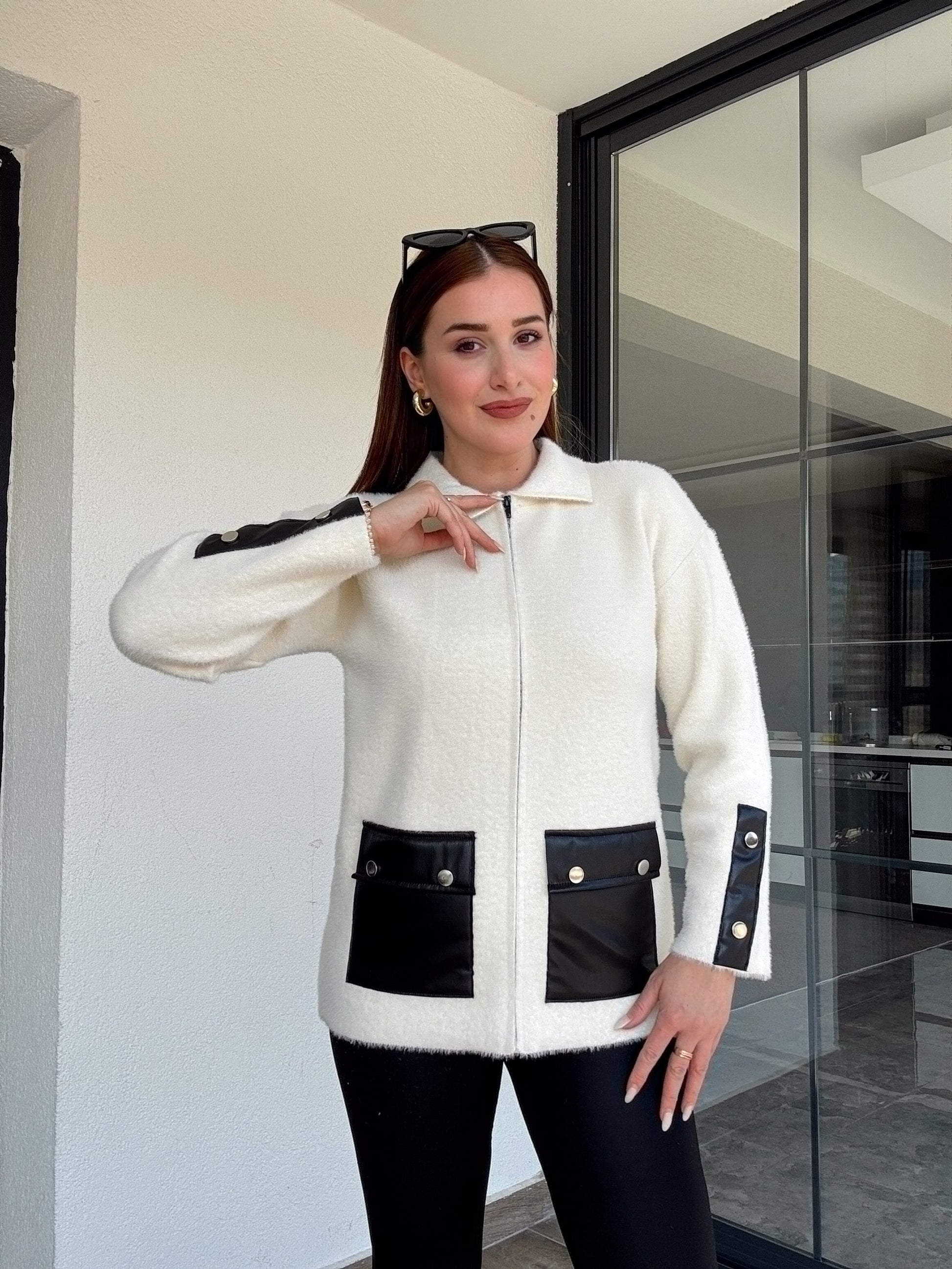 Liliyana deri cepli fermuarlı hırka-EKRU