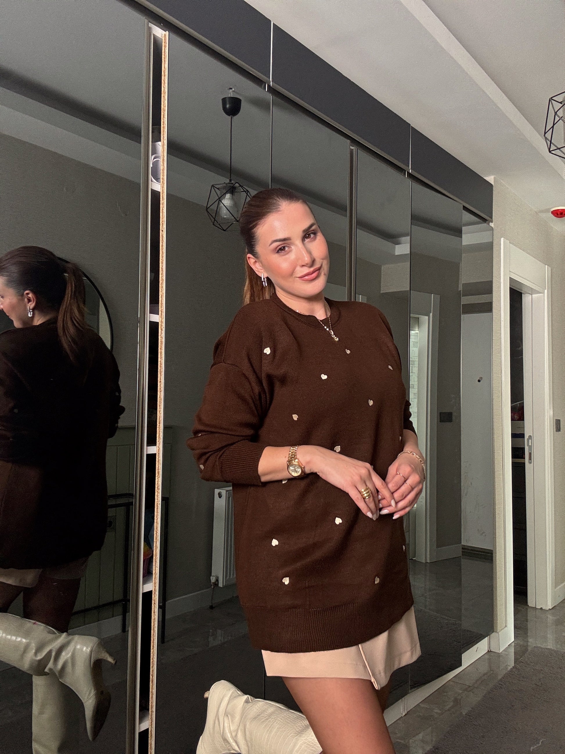Minimal Kalp İşlemeli Triko Kazak Kahve
