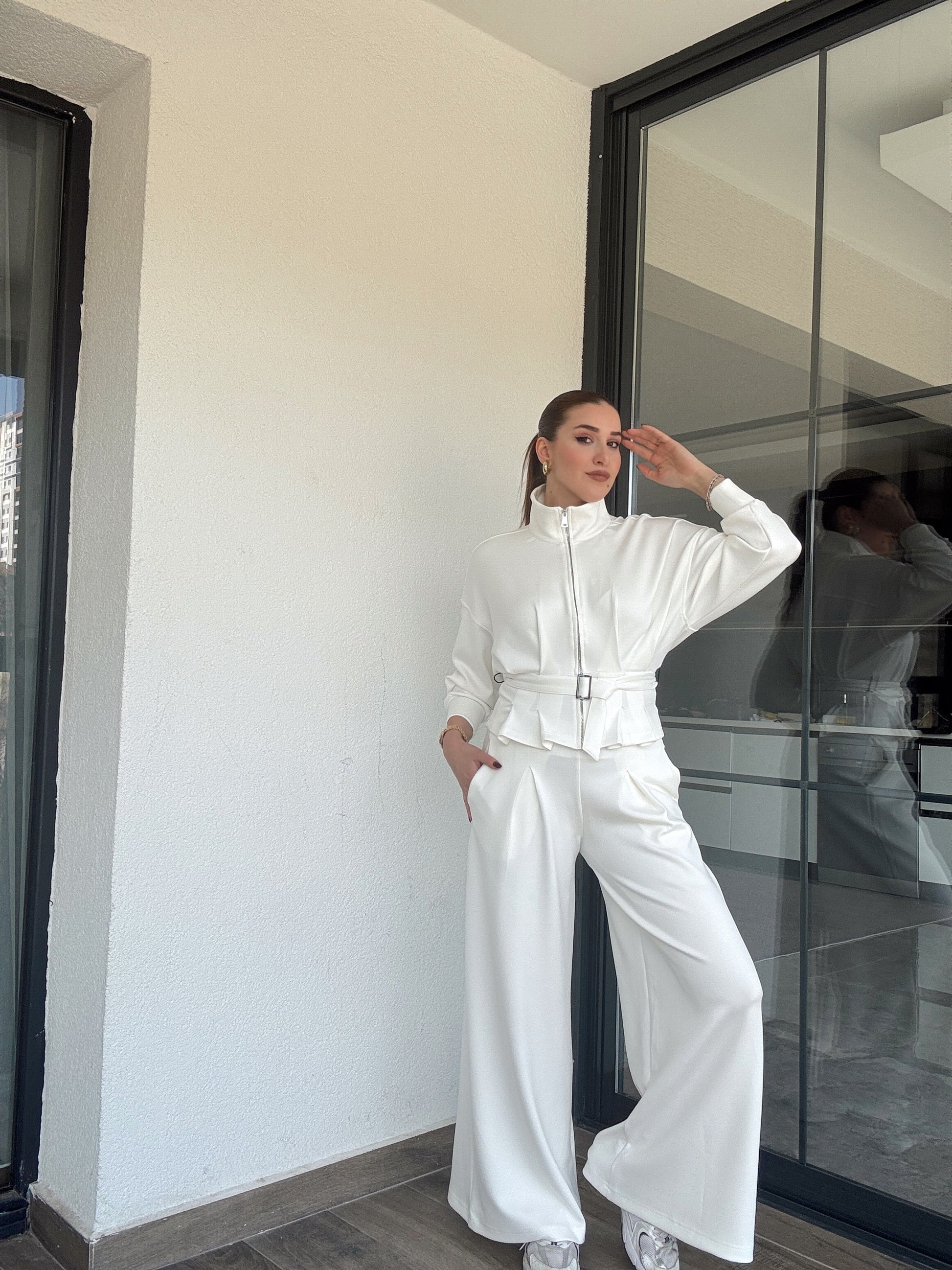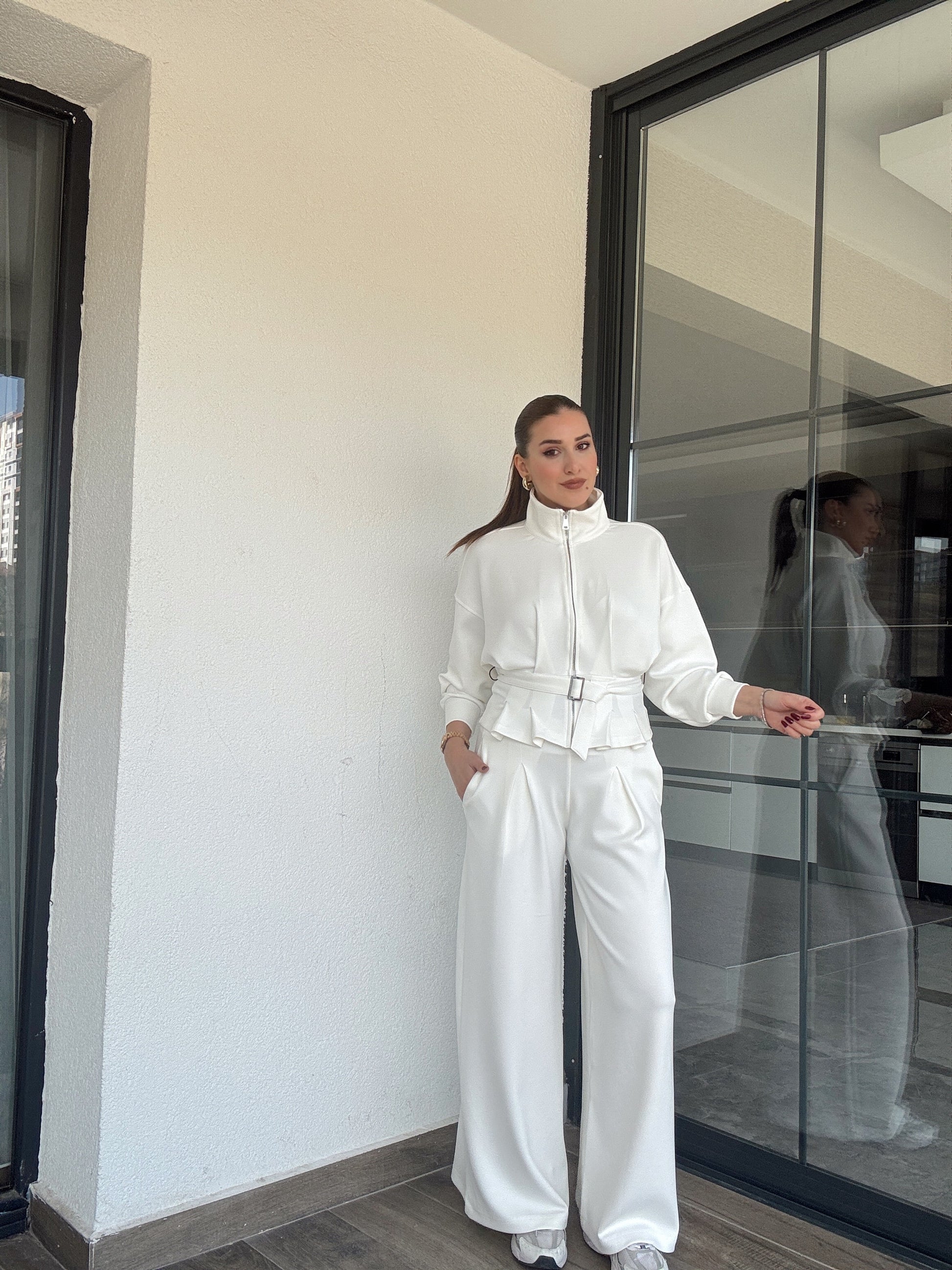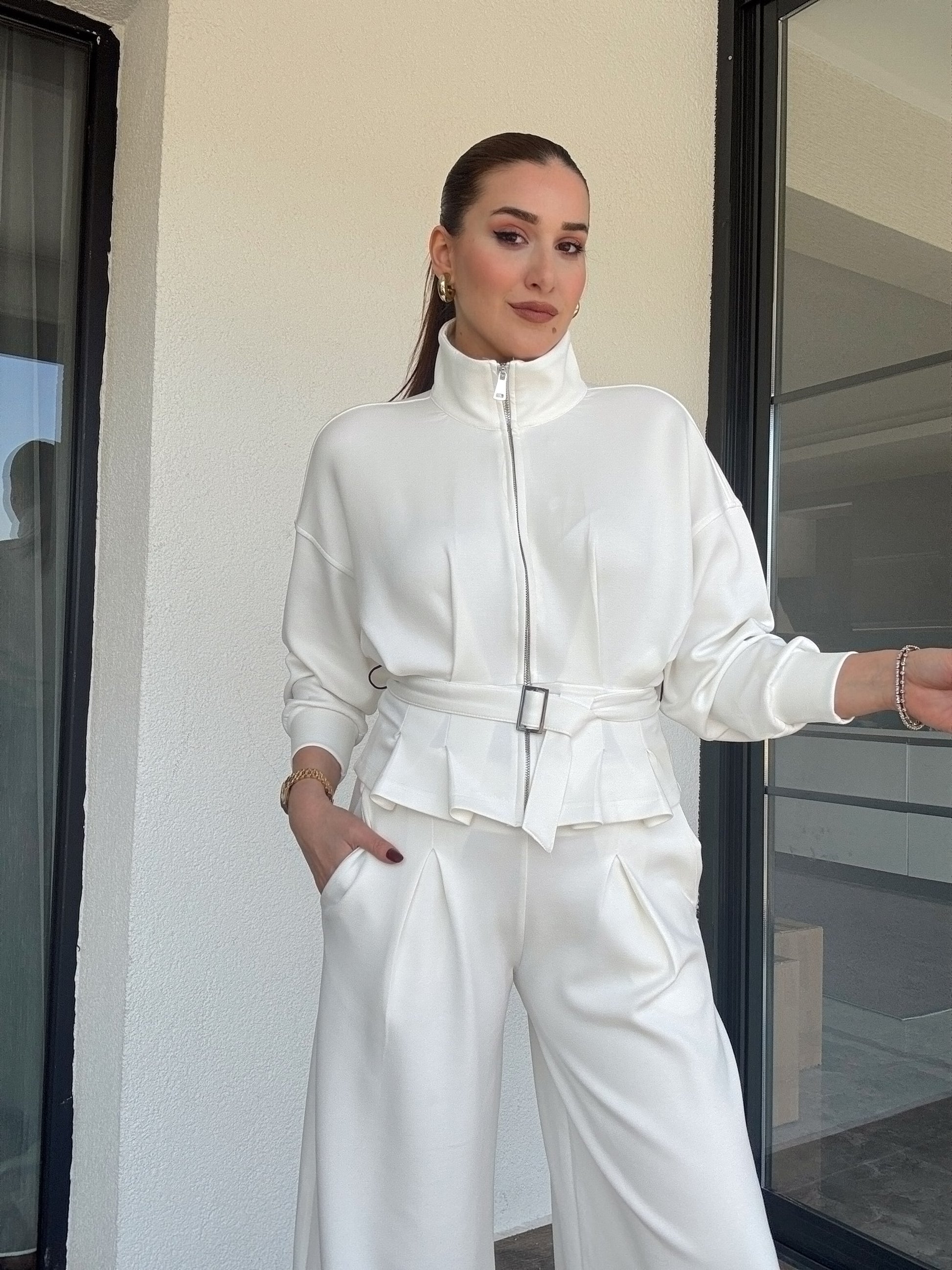 Modal kumaş dik yaka etek pileli ceket pantolon takım-BEYAZ