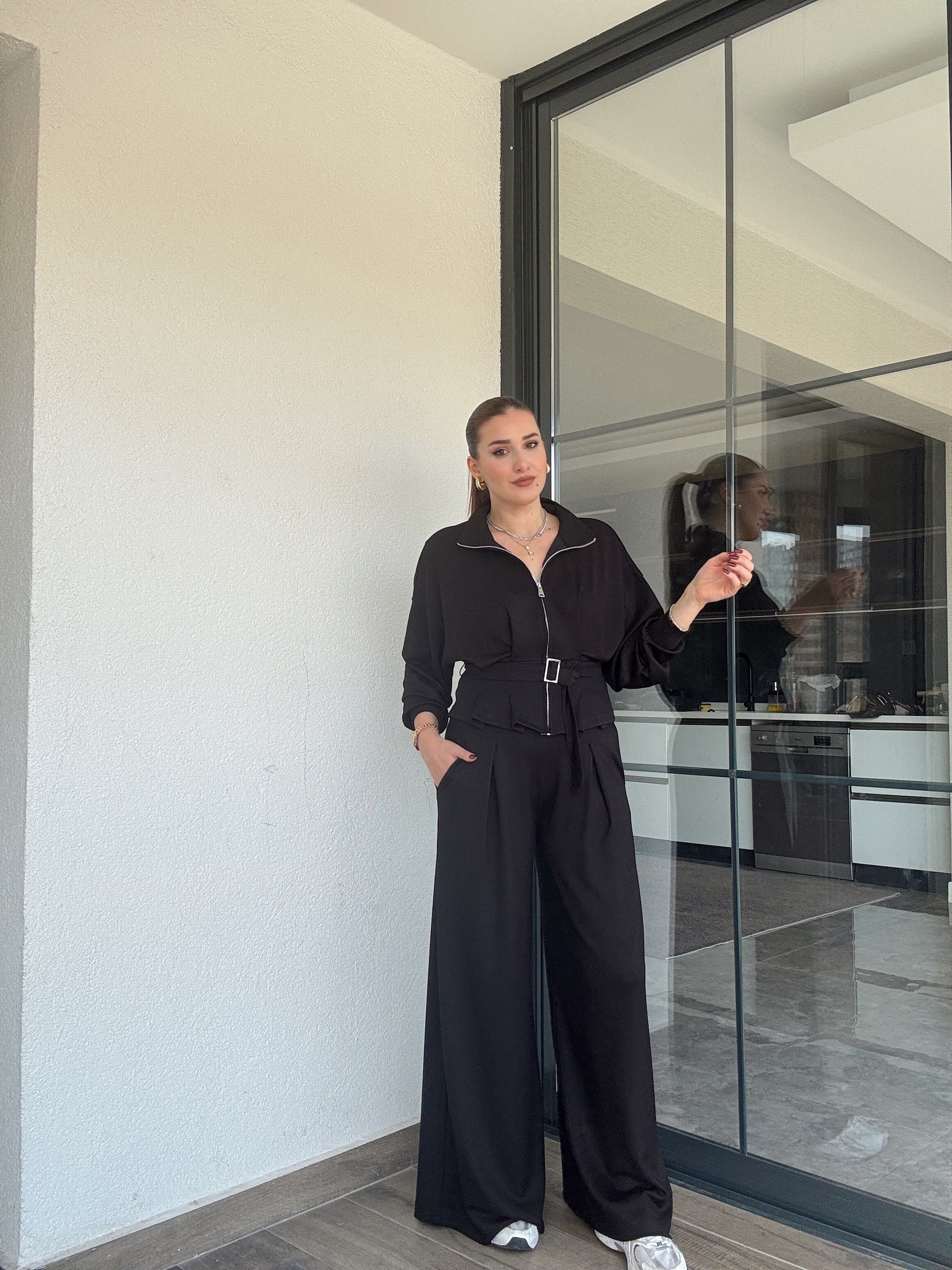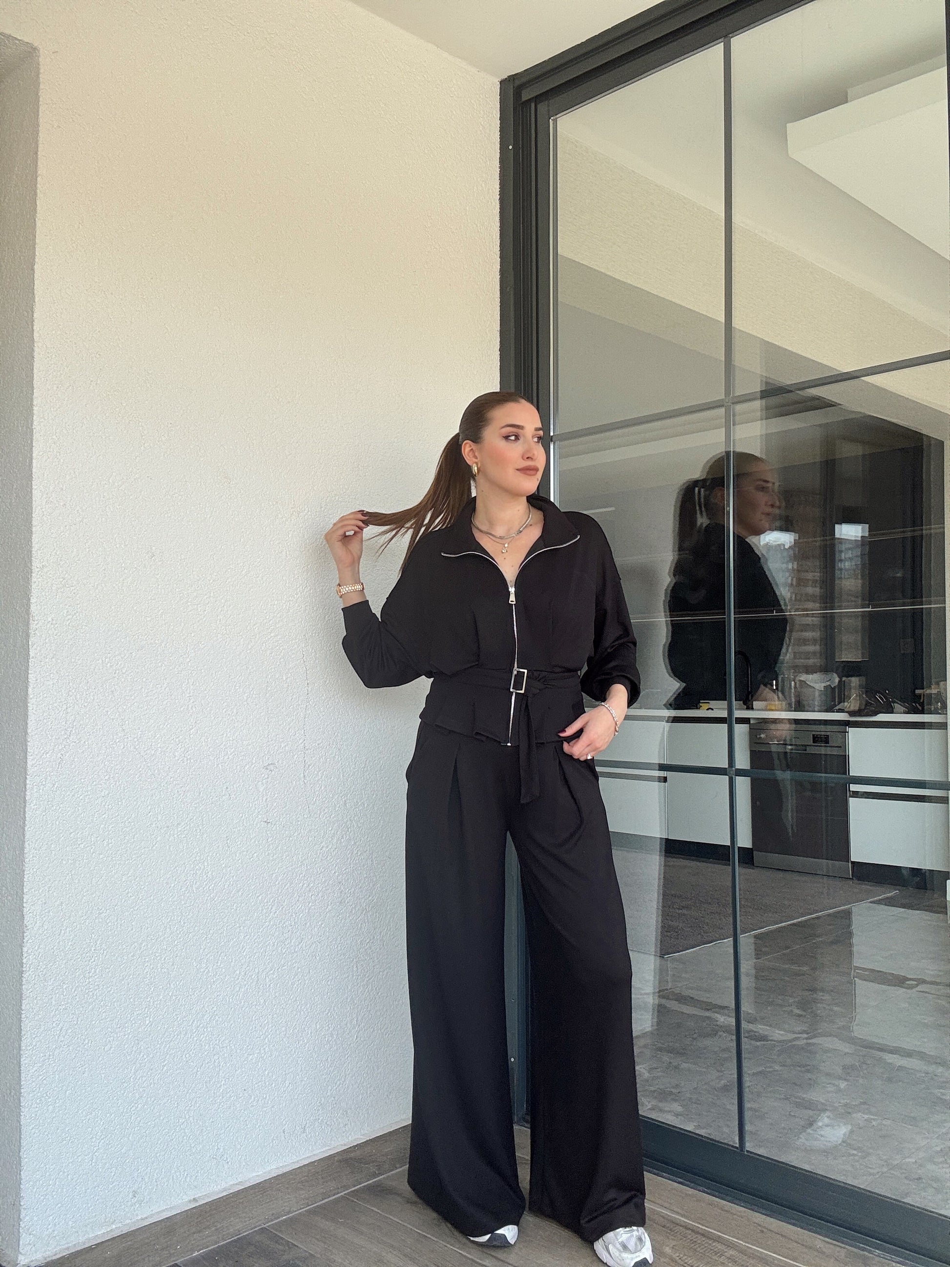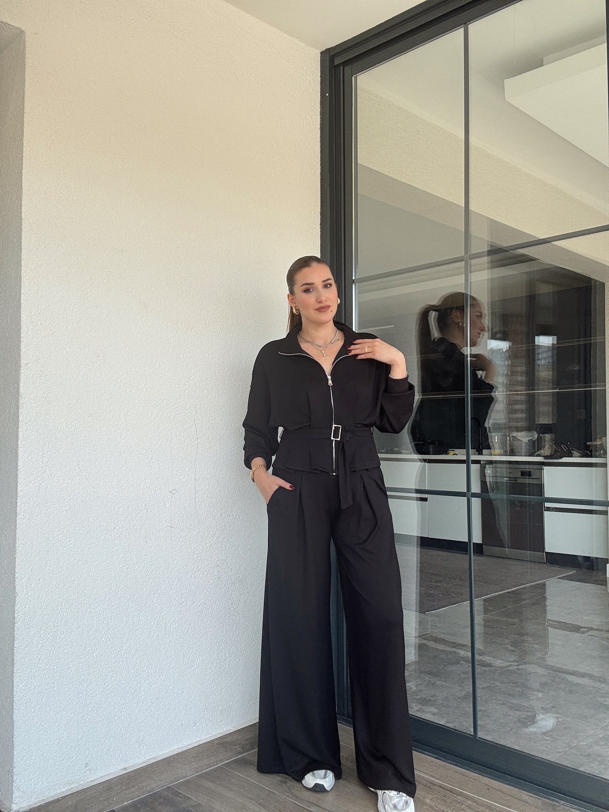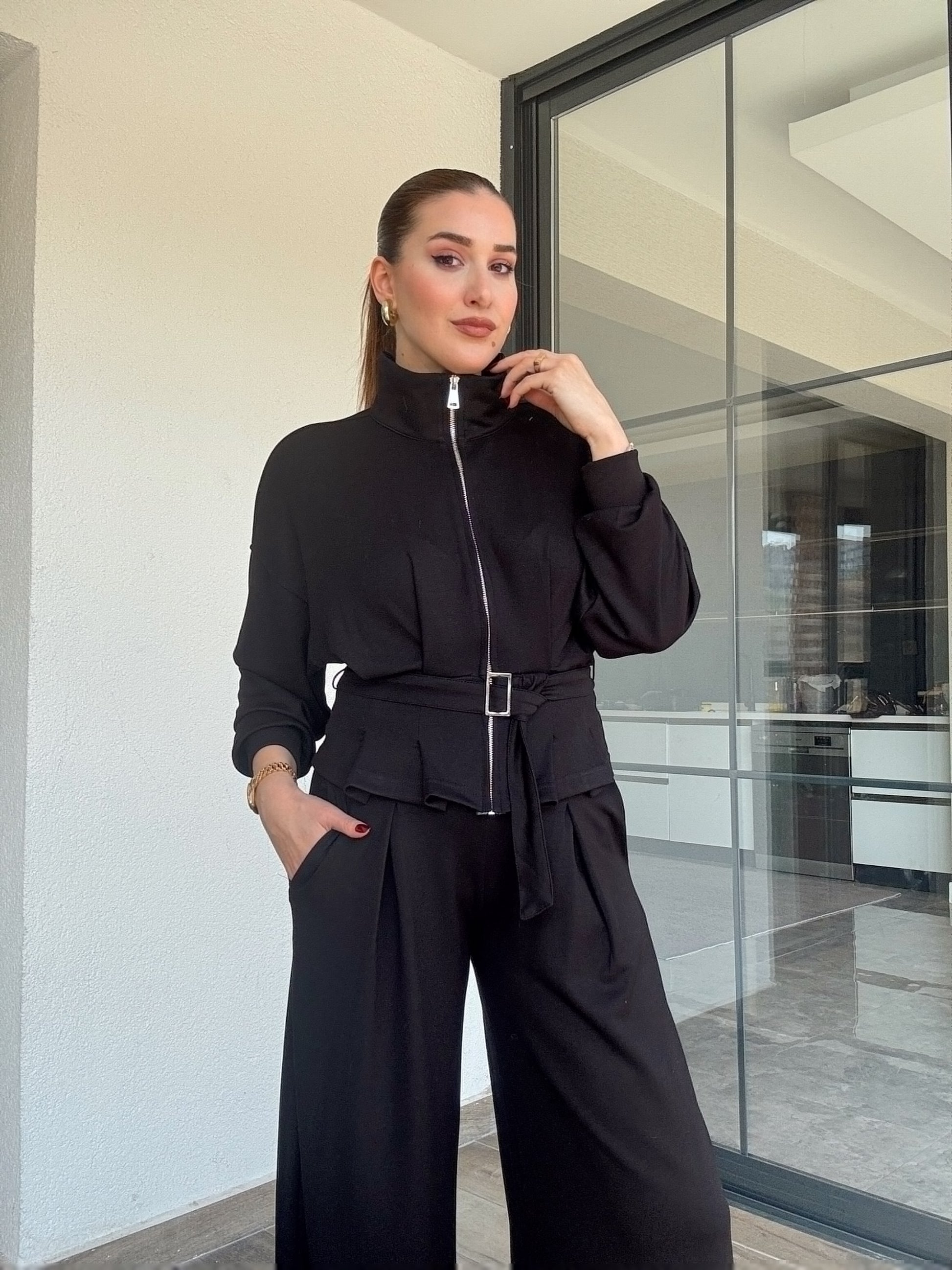Modal kumaş dik yaka etek pileli ceket pantolon takım-SİYAH