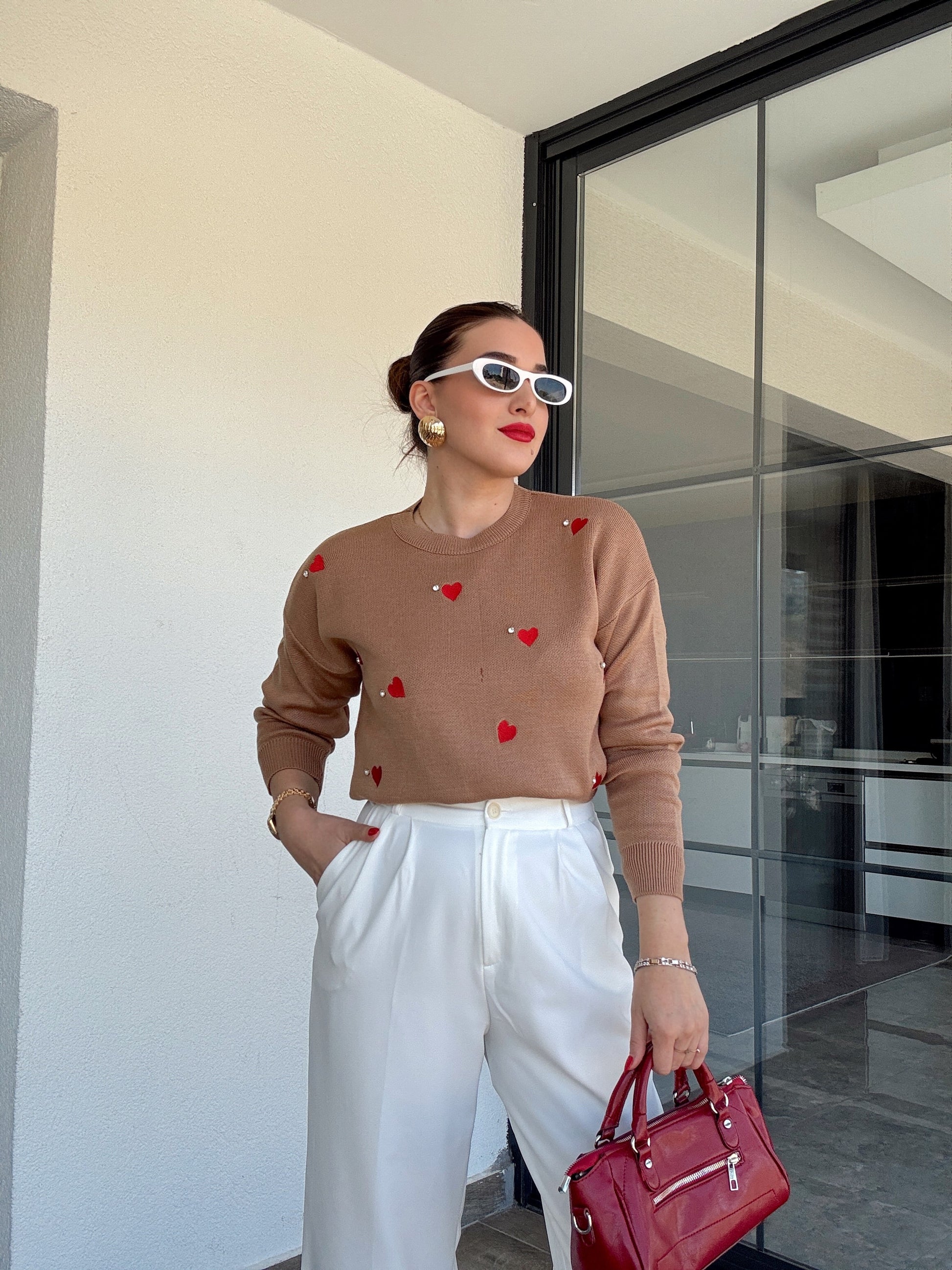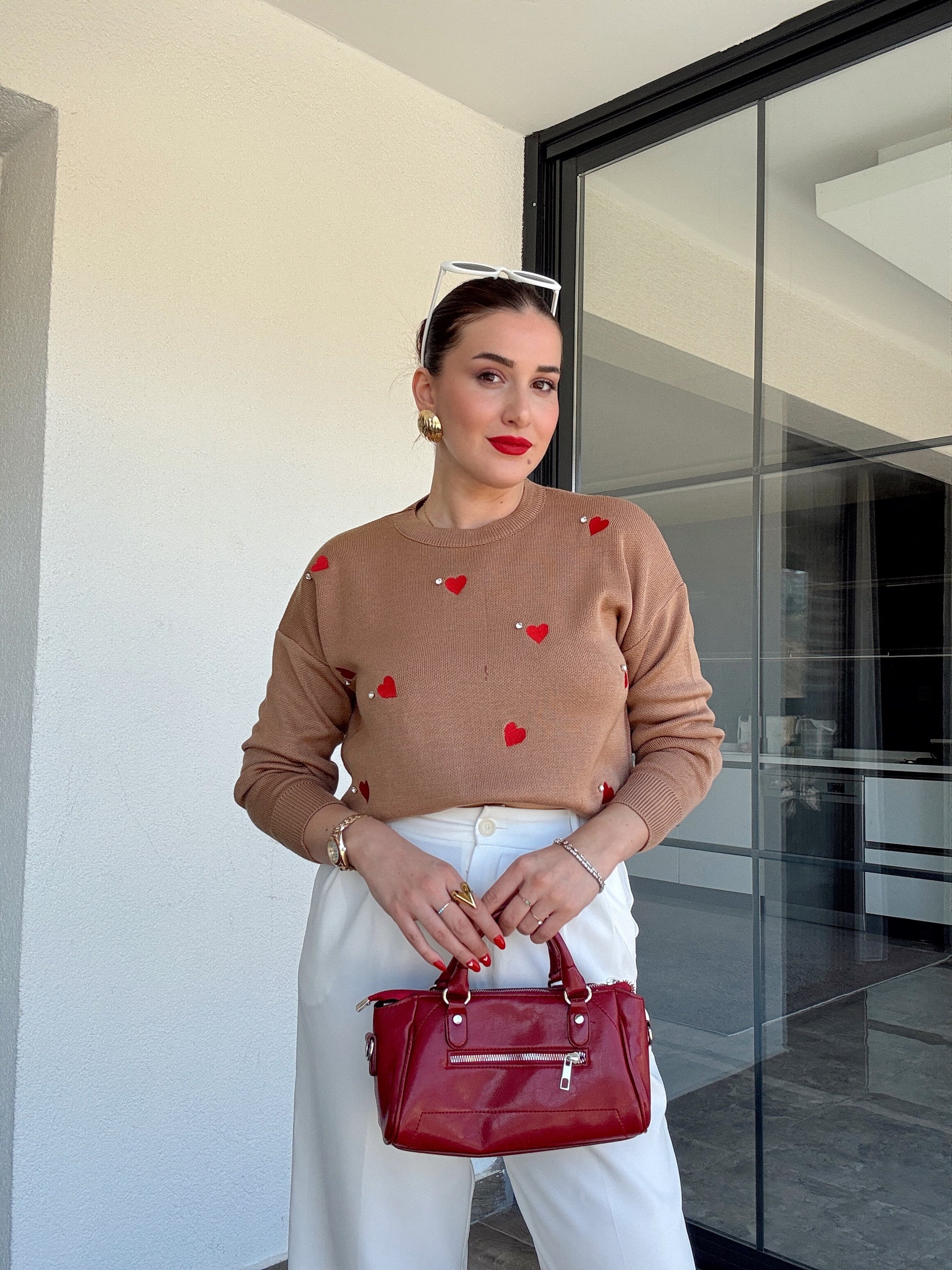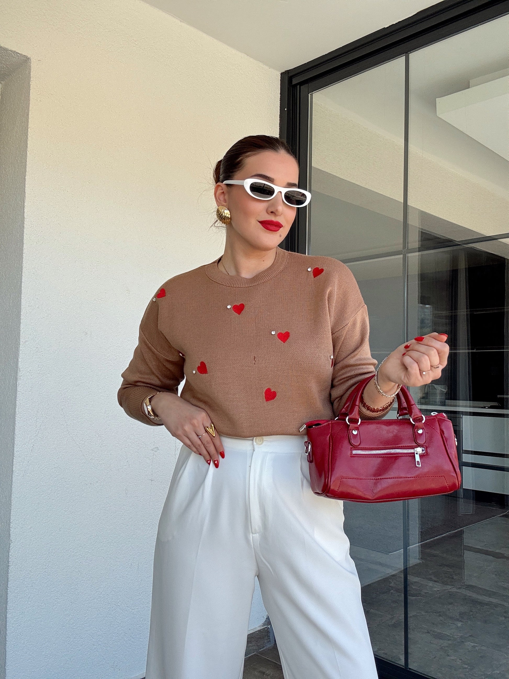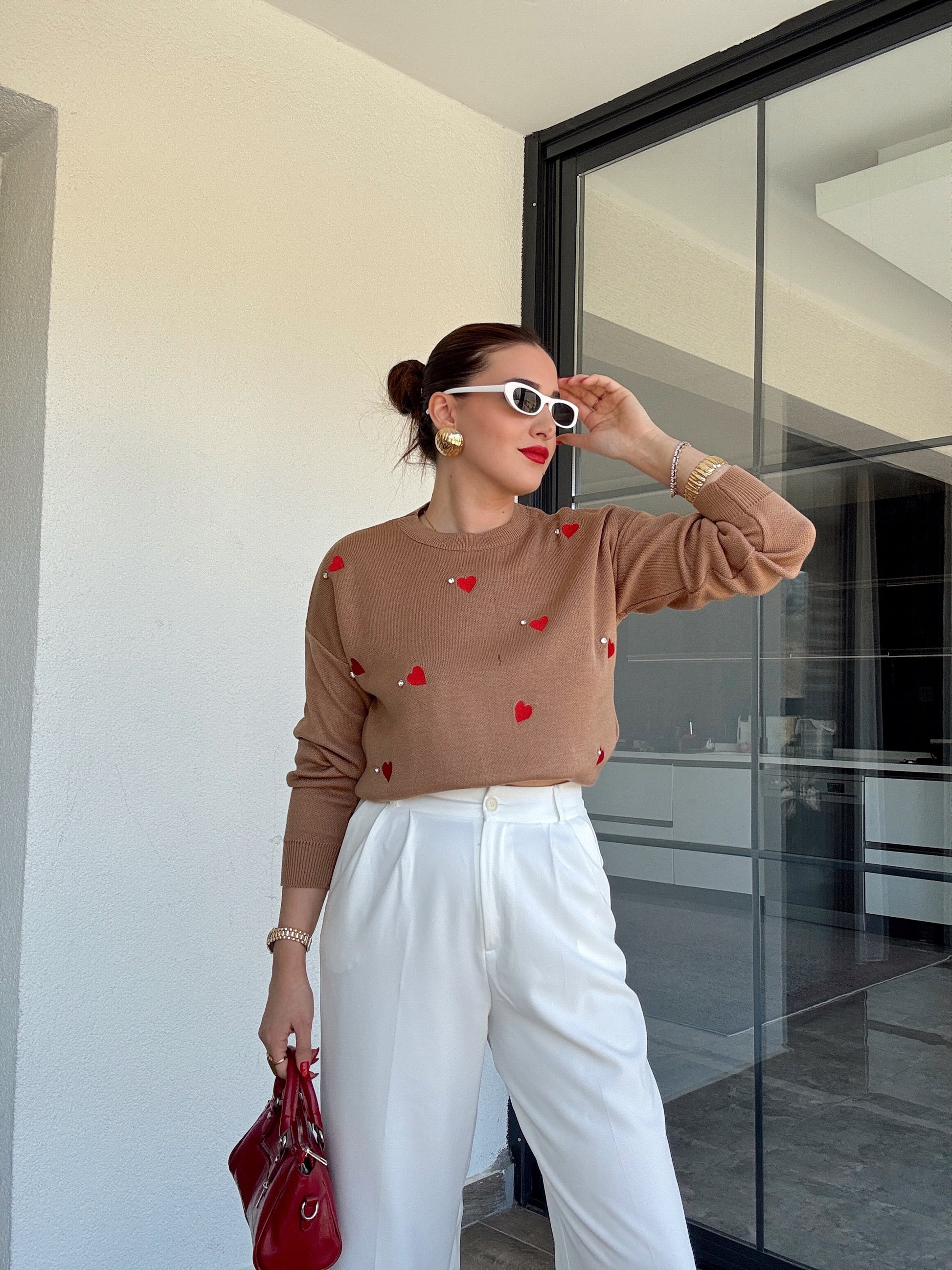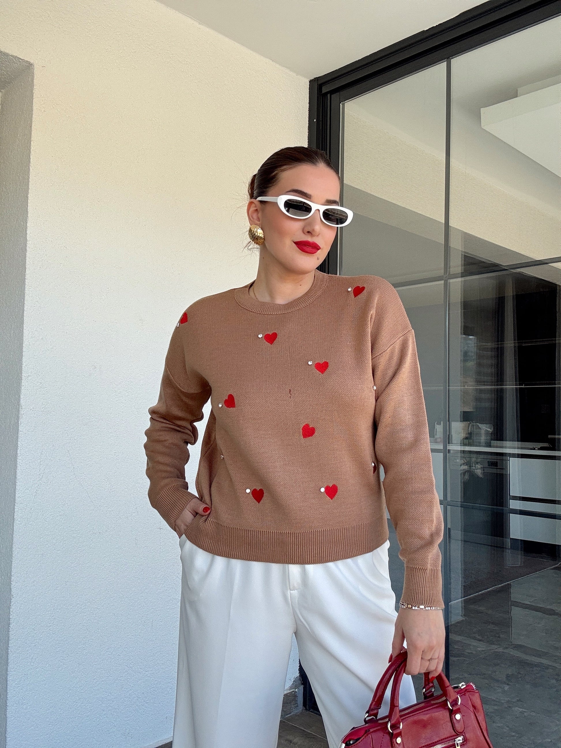 Nakışlı kalpli taş detaylı kazak CAMEL