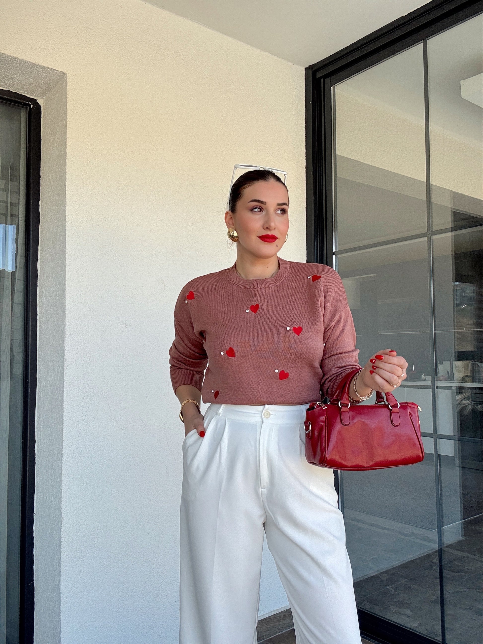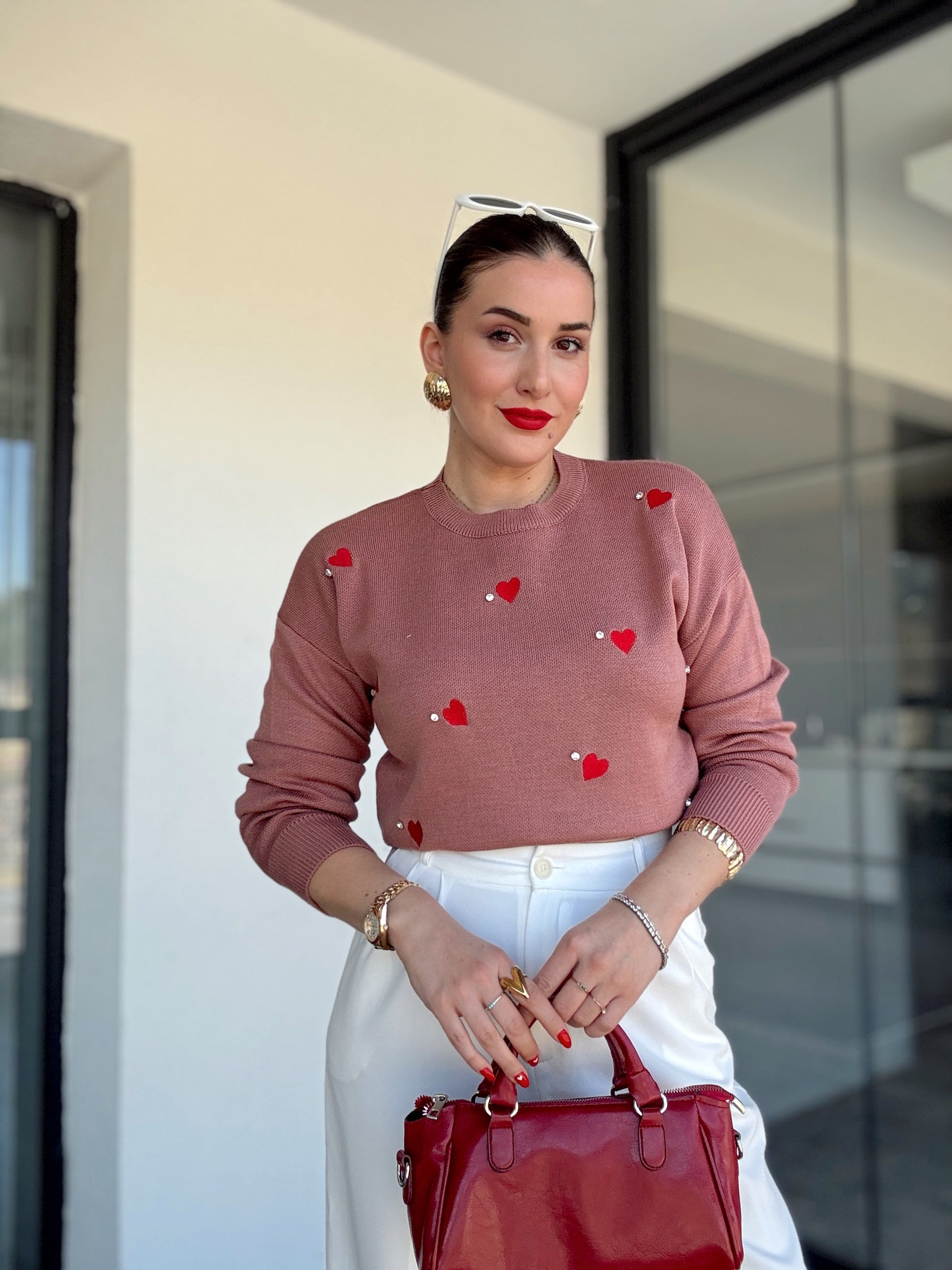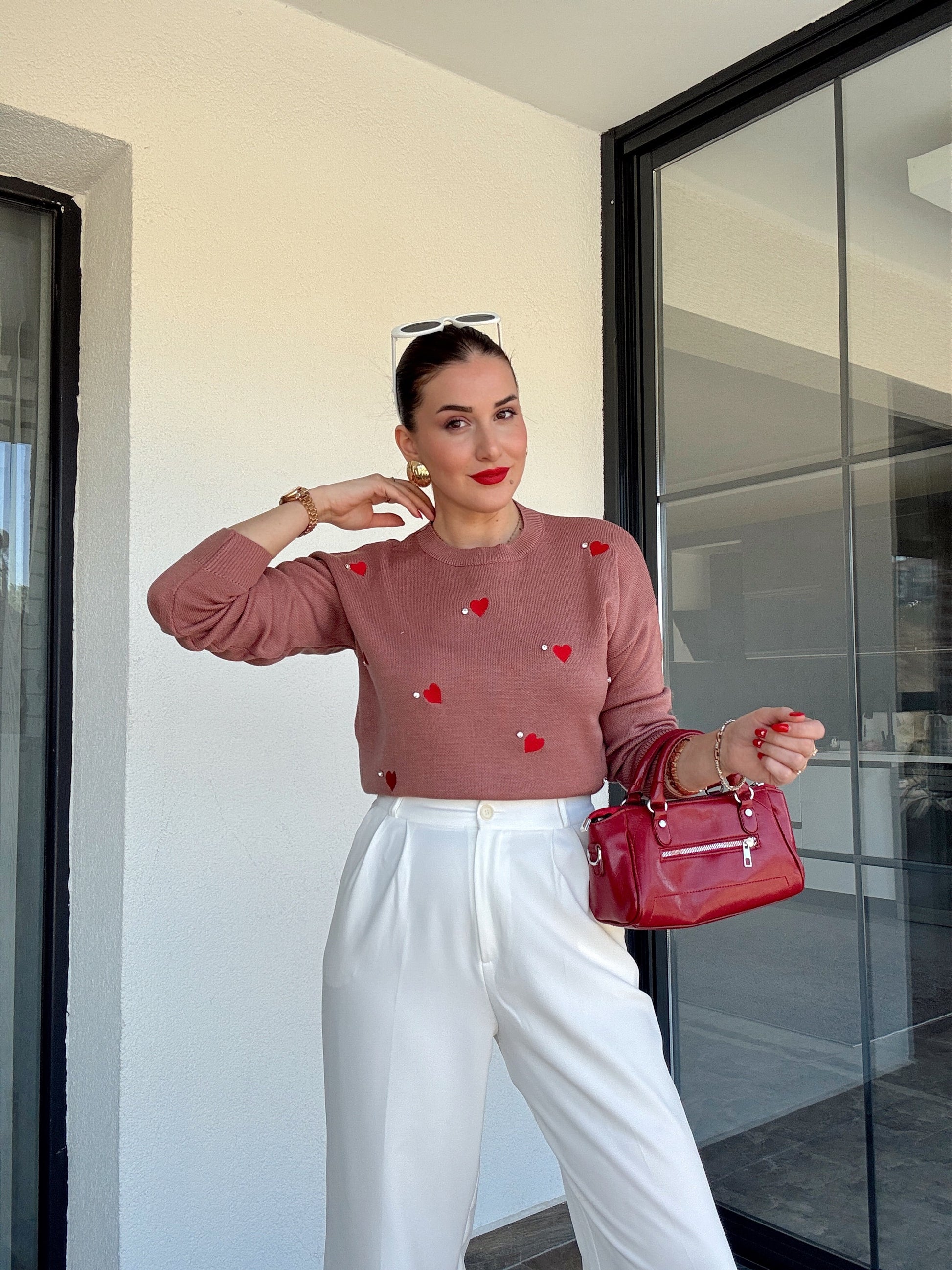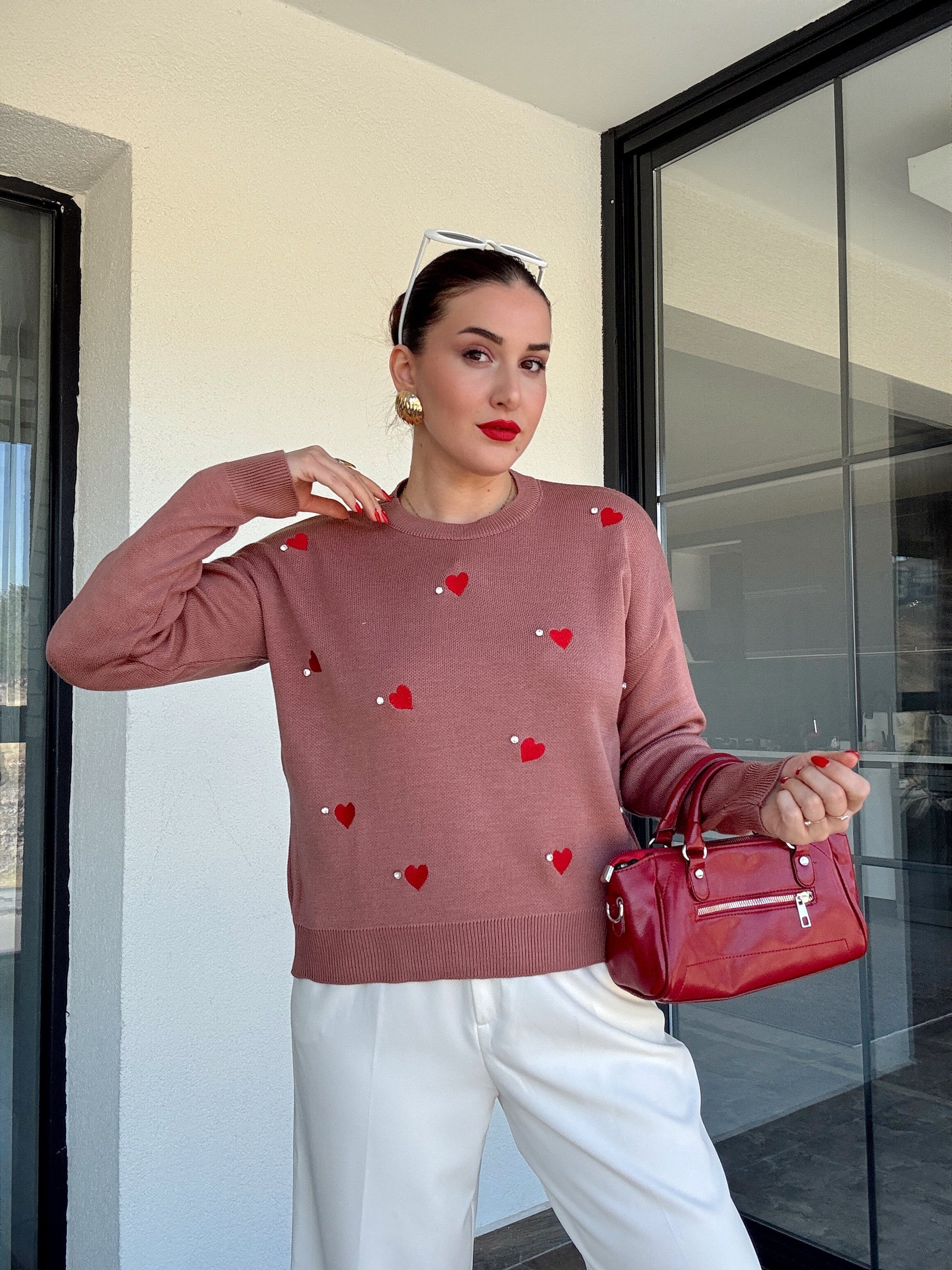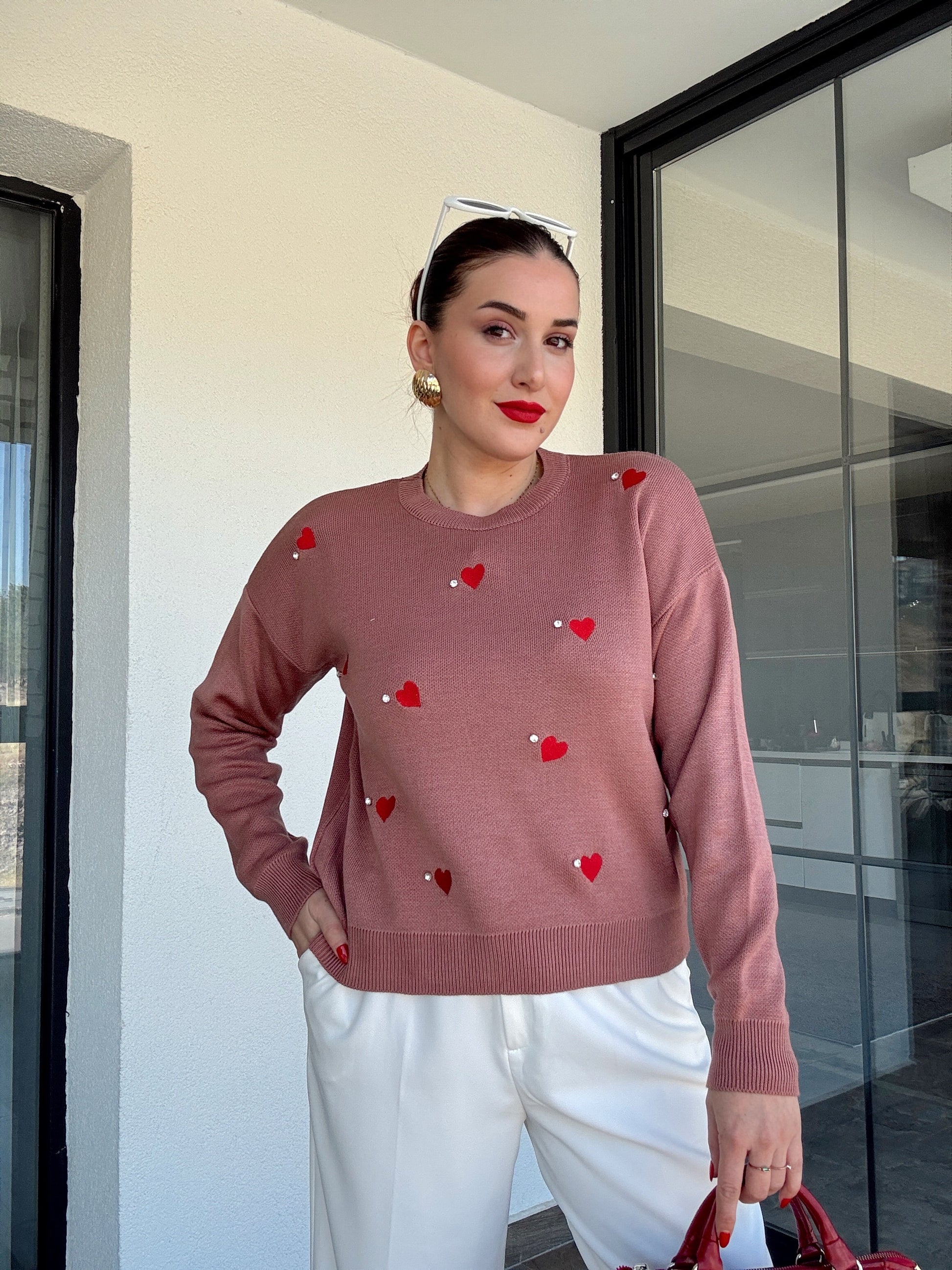 Nakışlı kalpli taş detaylı kazak GÜL KURUSU