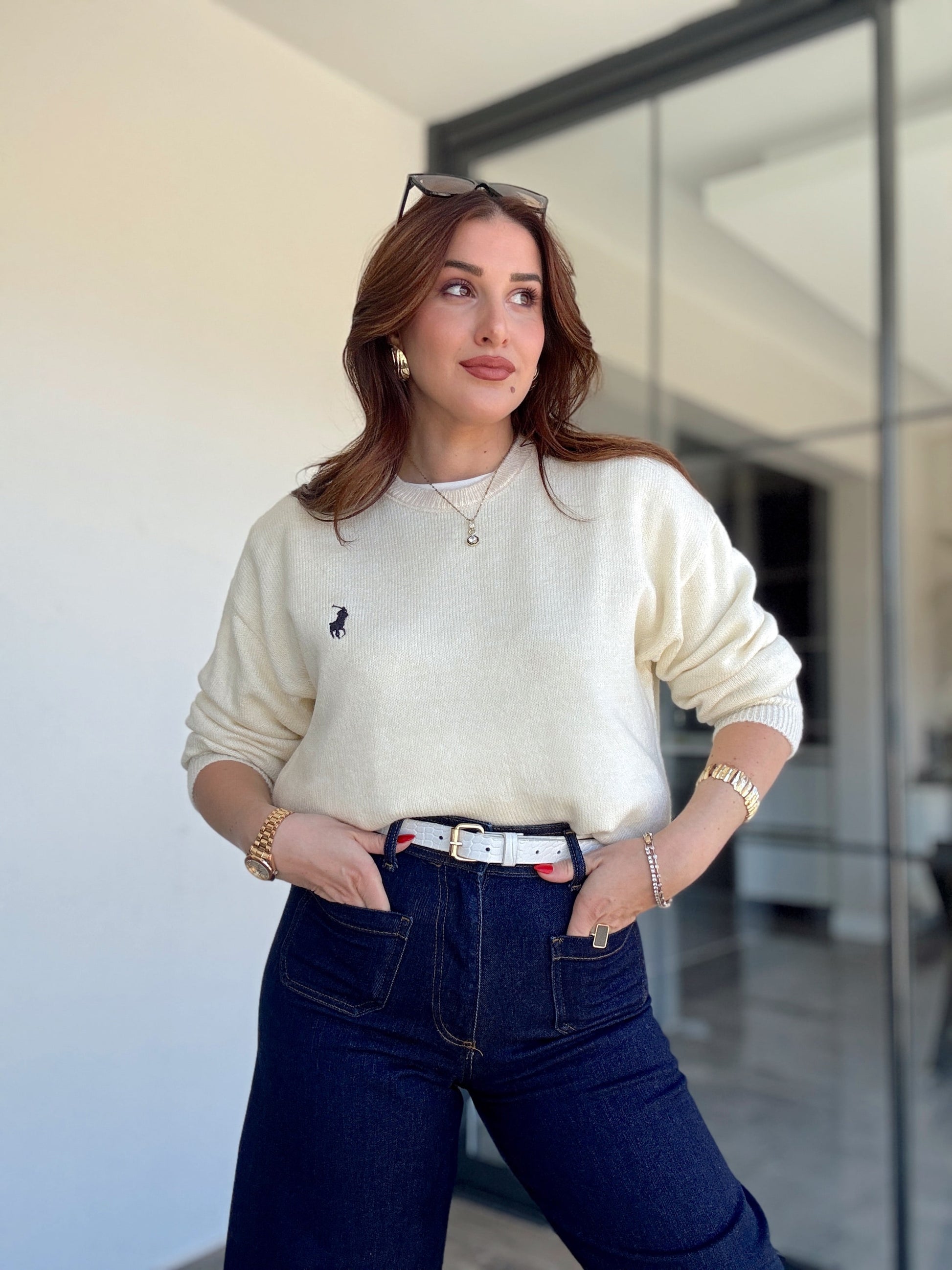 Nakışlı Oversize Triko Kazak Ekru