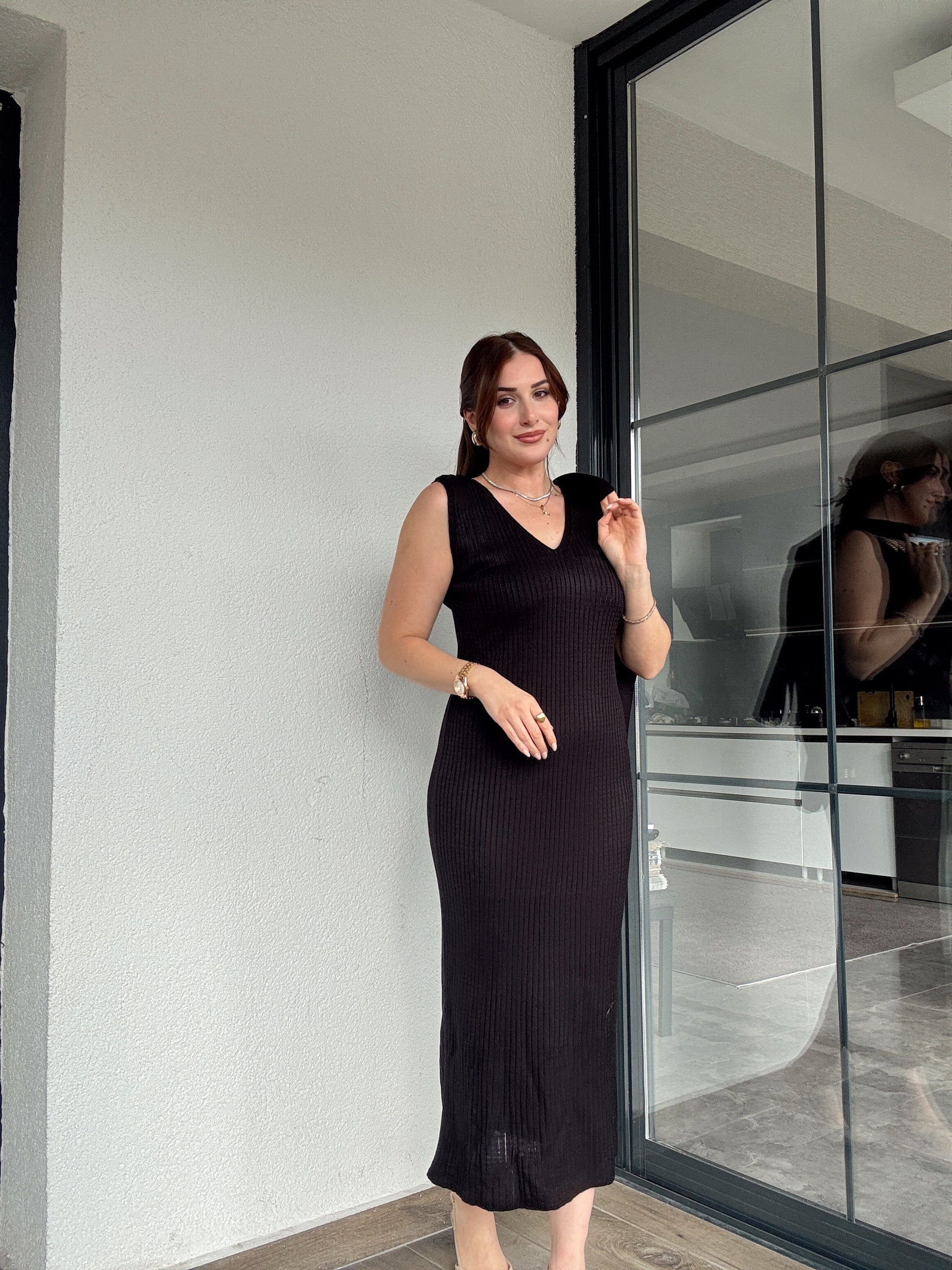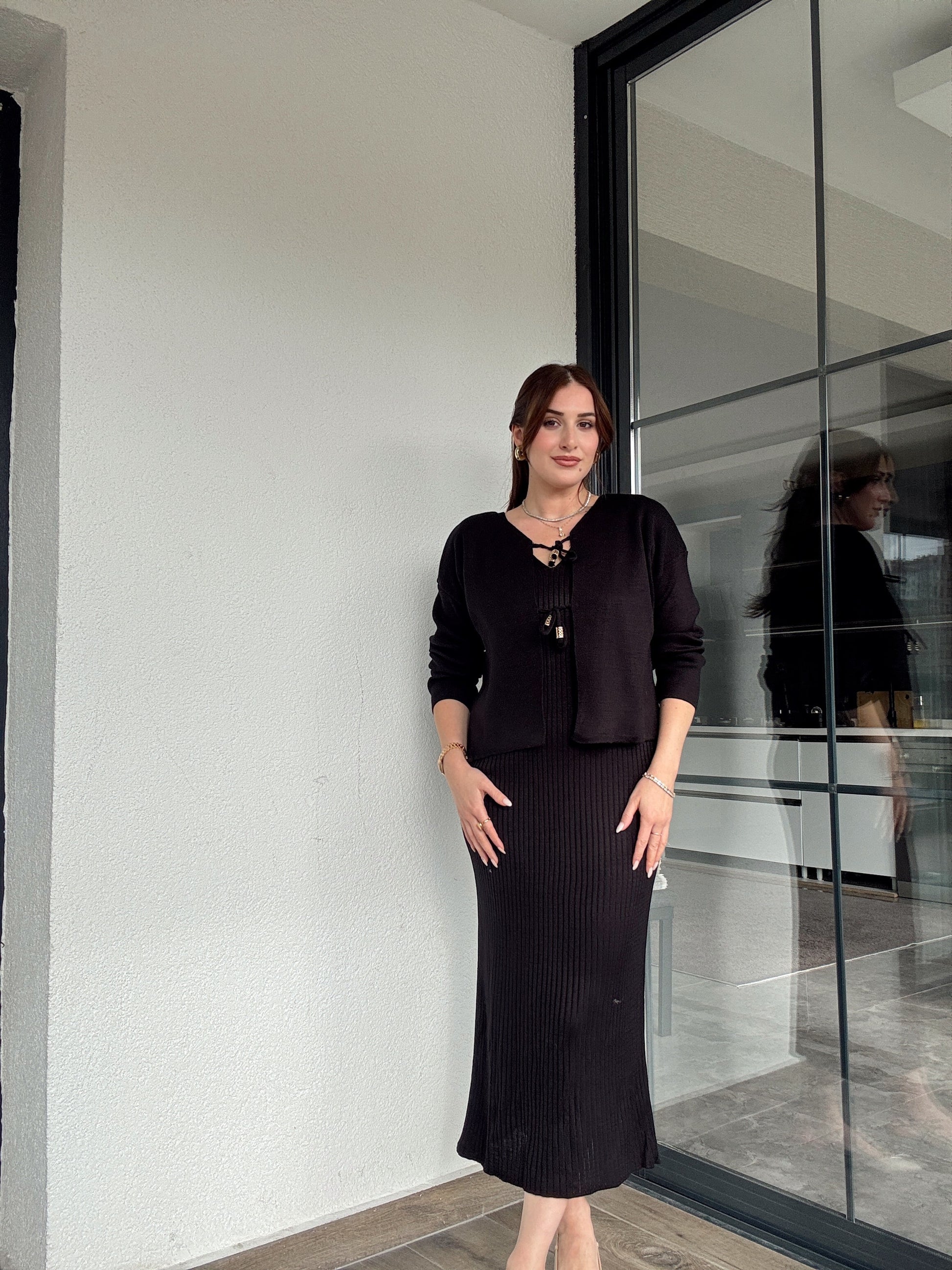 Önü Bağlama Jileli Triko Takım Siyah