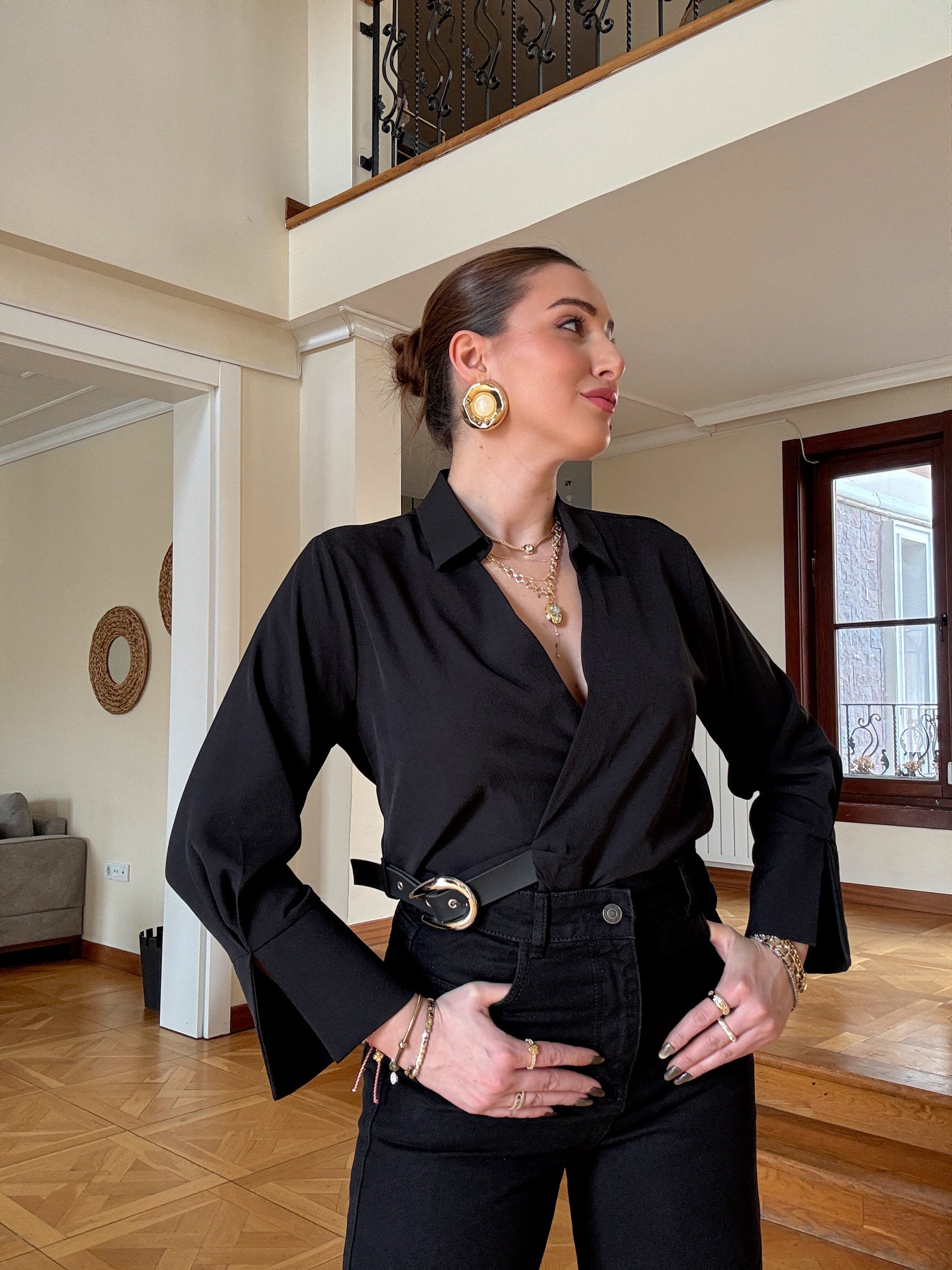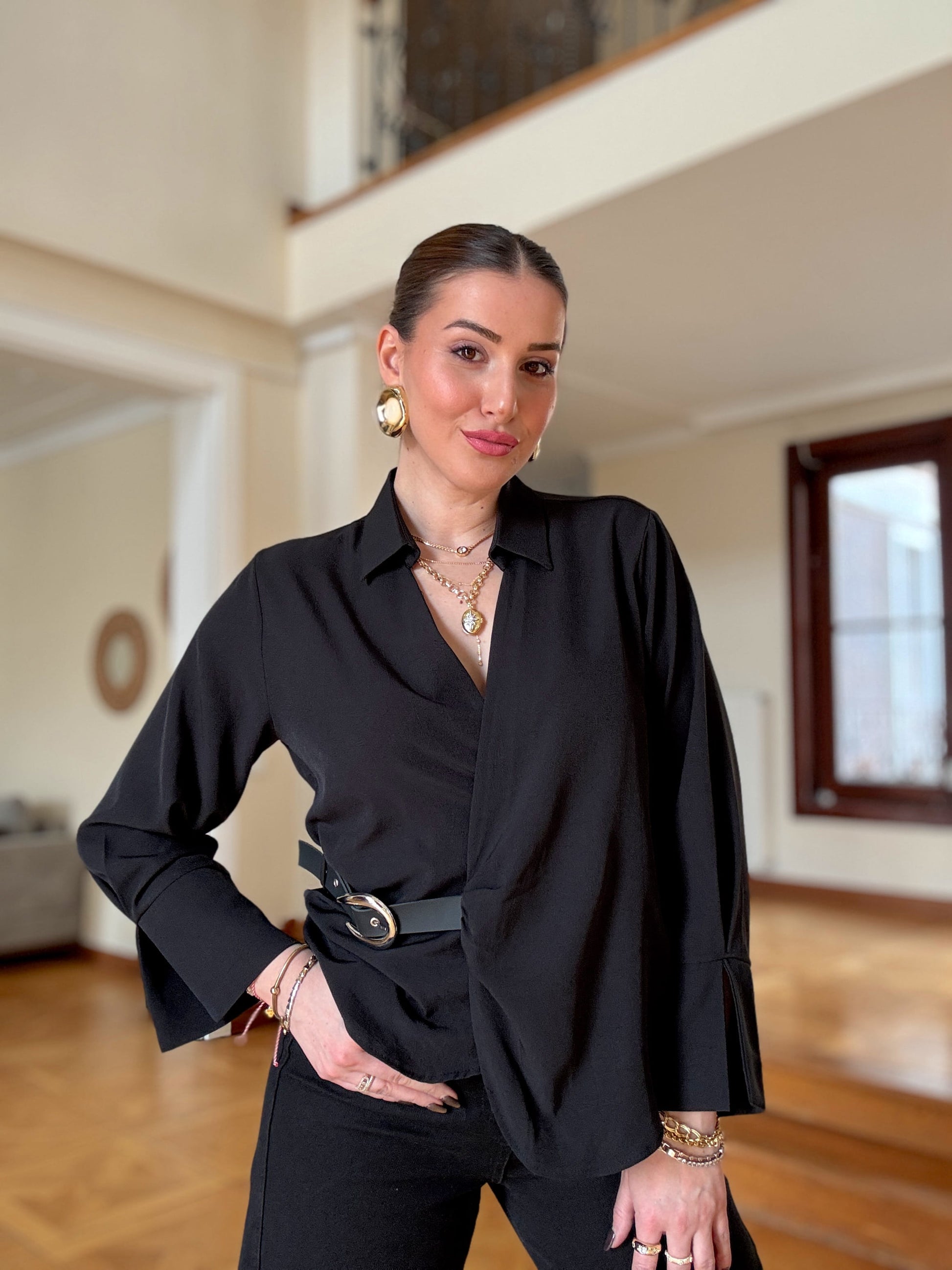 Önü kemer detaylı bluz SİYAH
