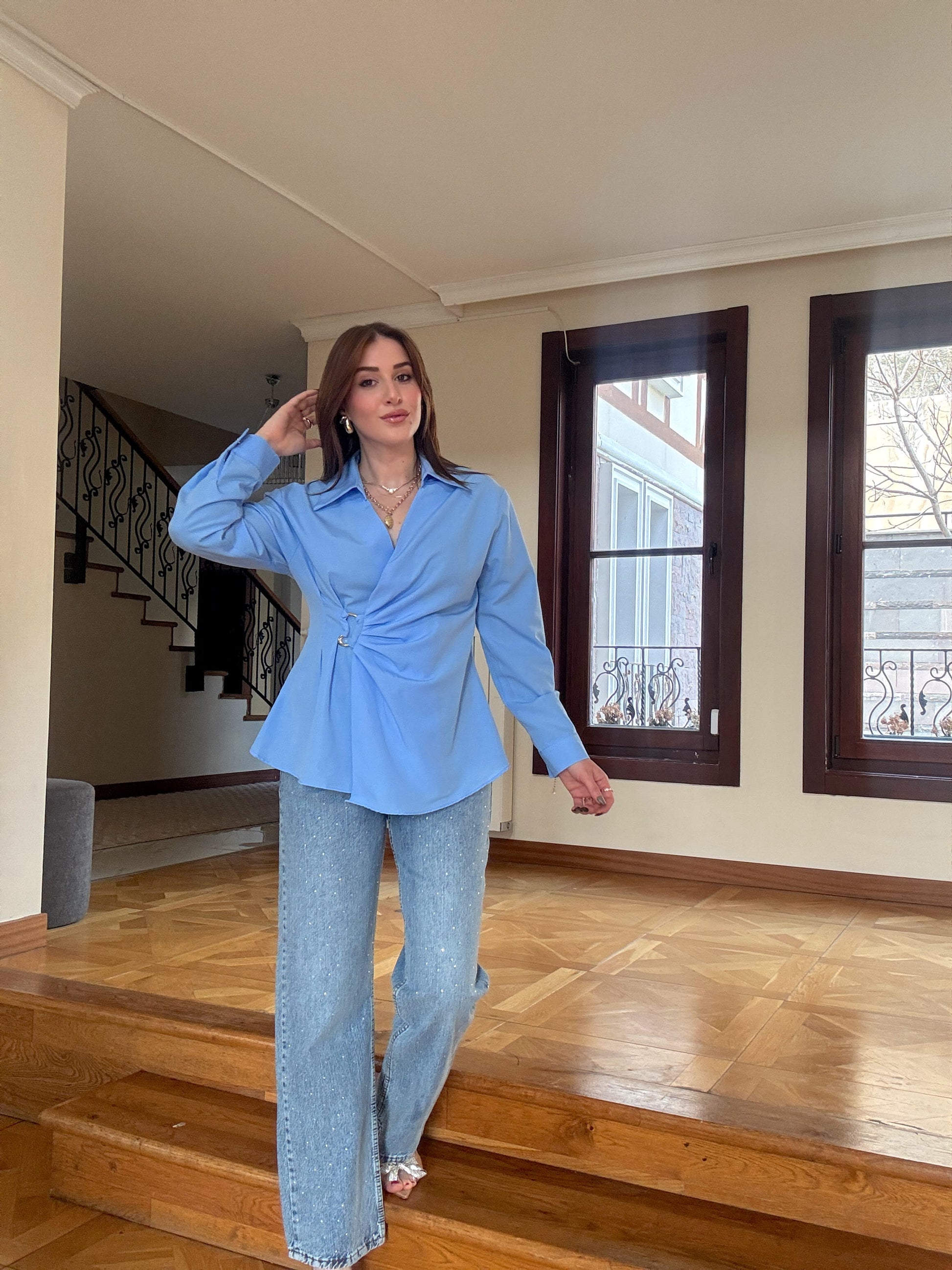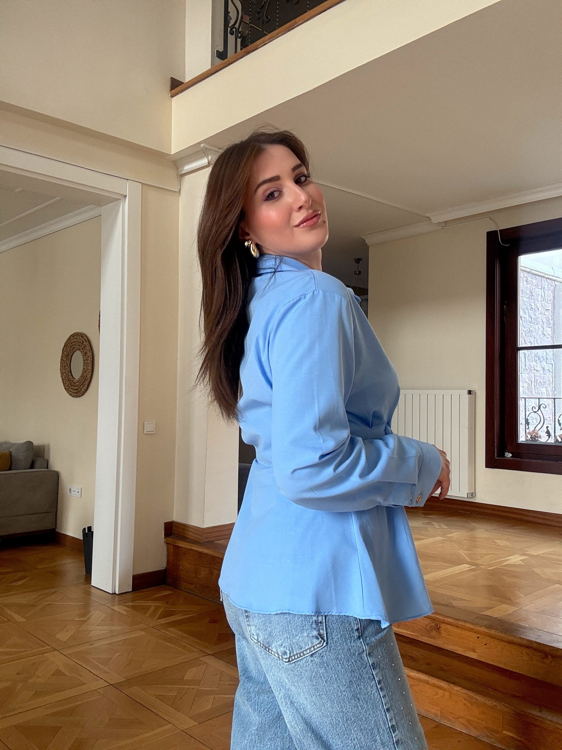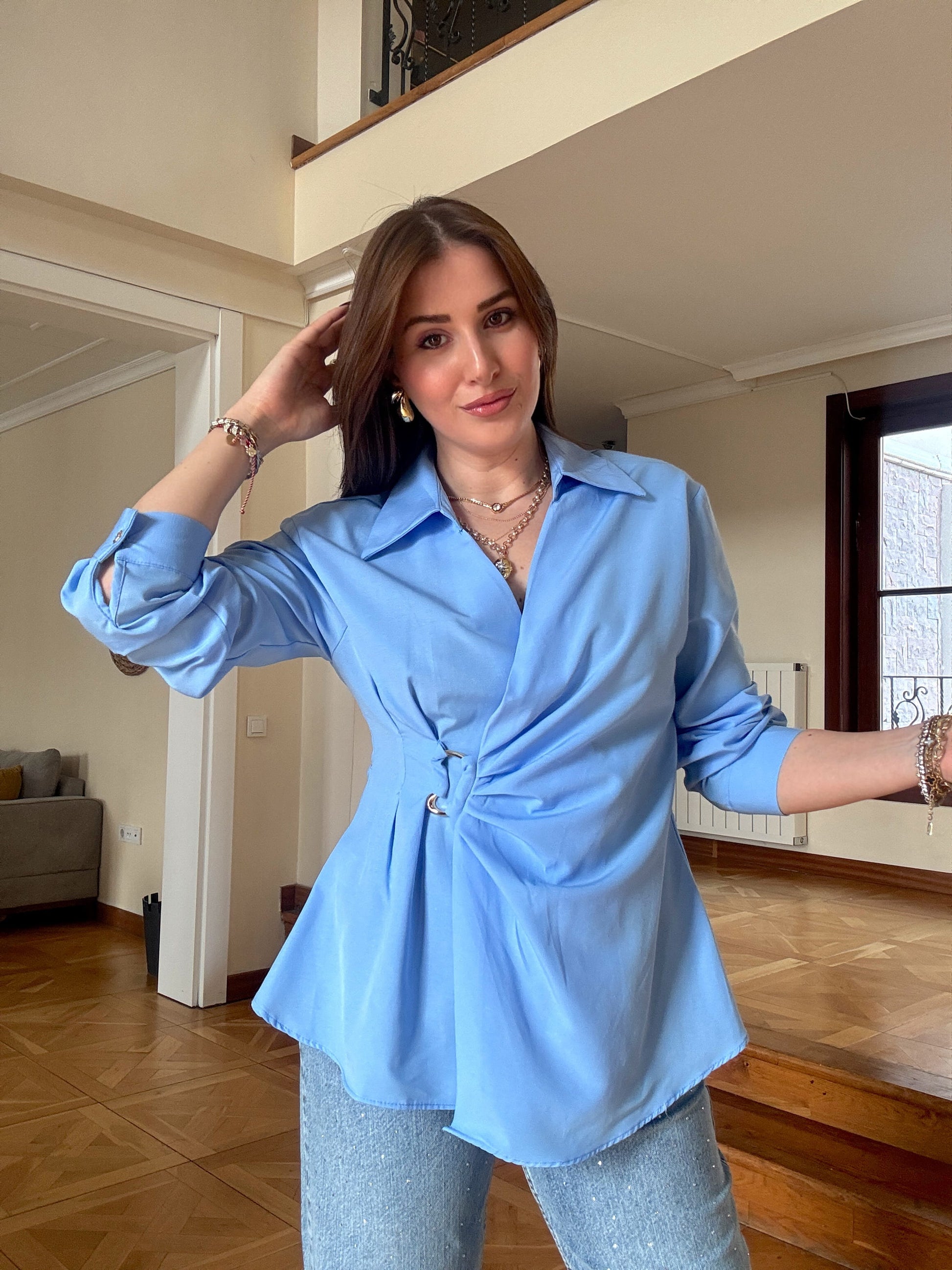 Önü tokalı gömlek-Mavi