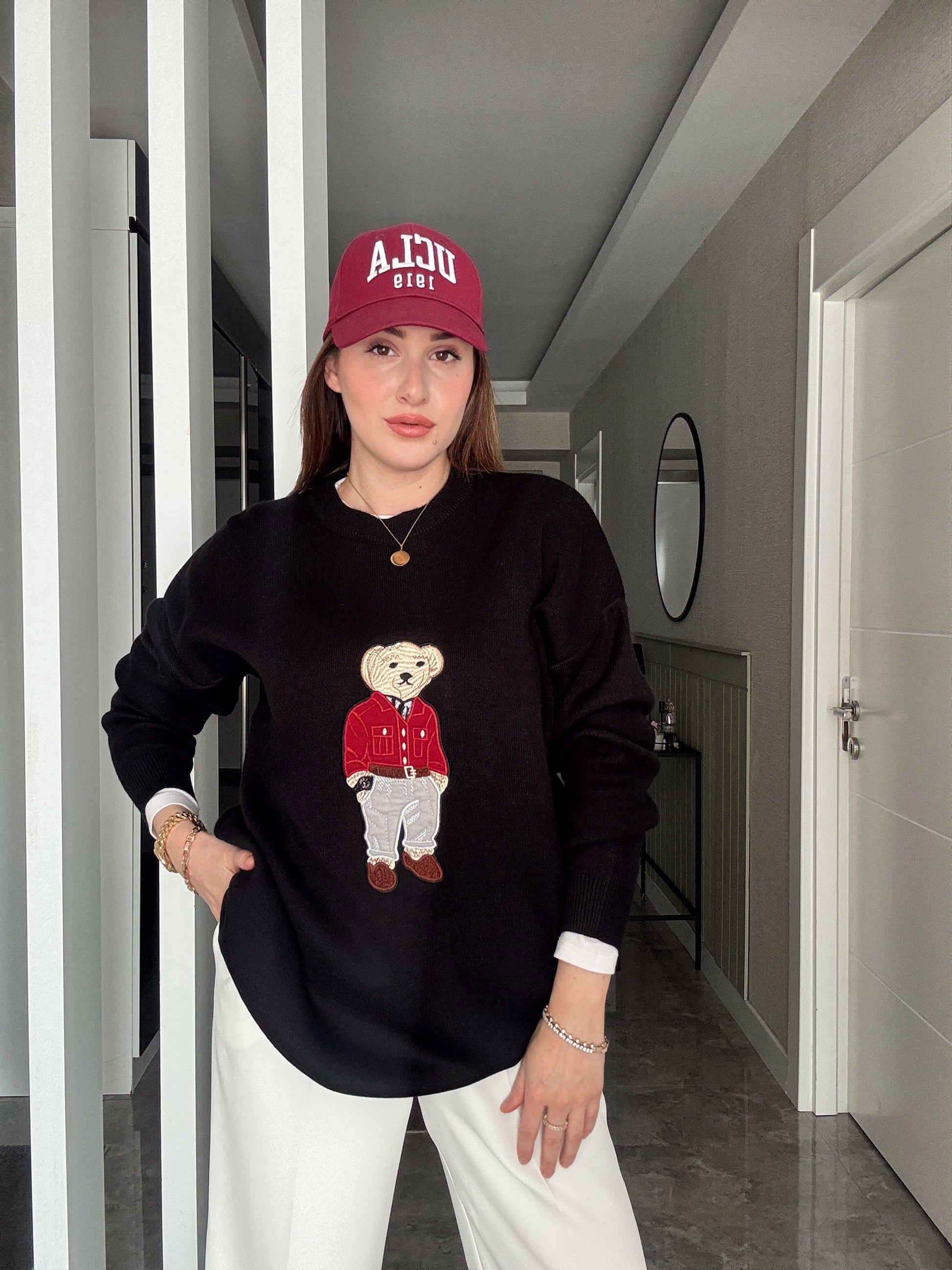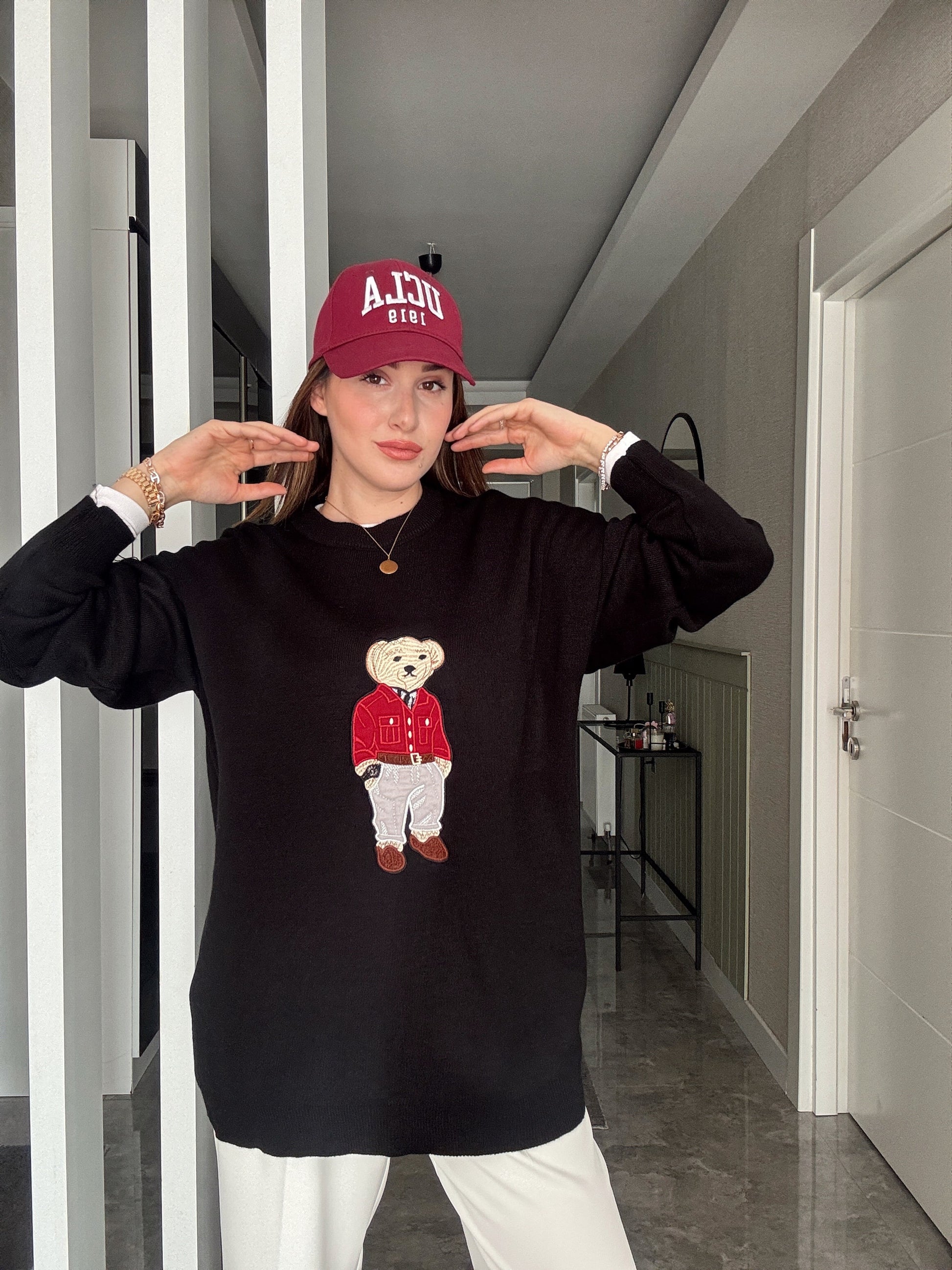 Oversize Ayıcık İşlemeli Kazak SİYAH