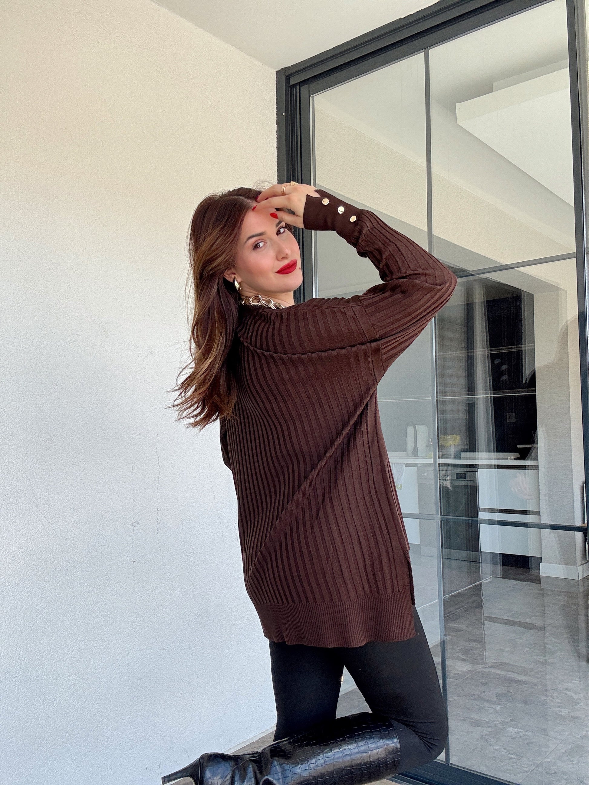 Oversize kesim kol düğmeli kazak KAHVERENGİ