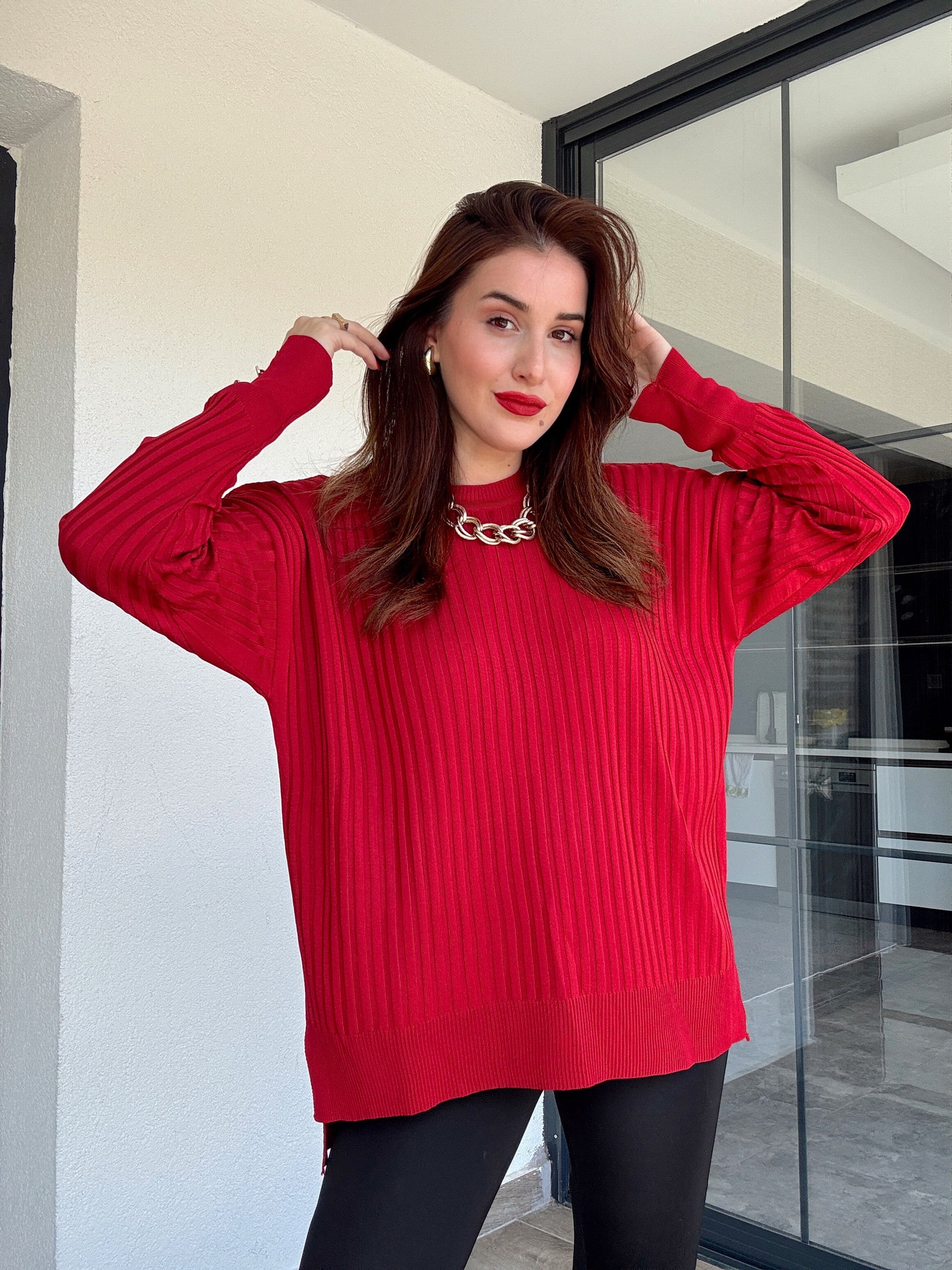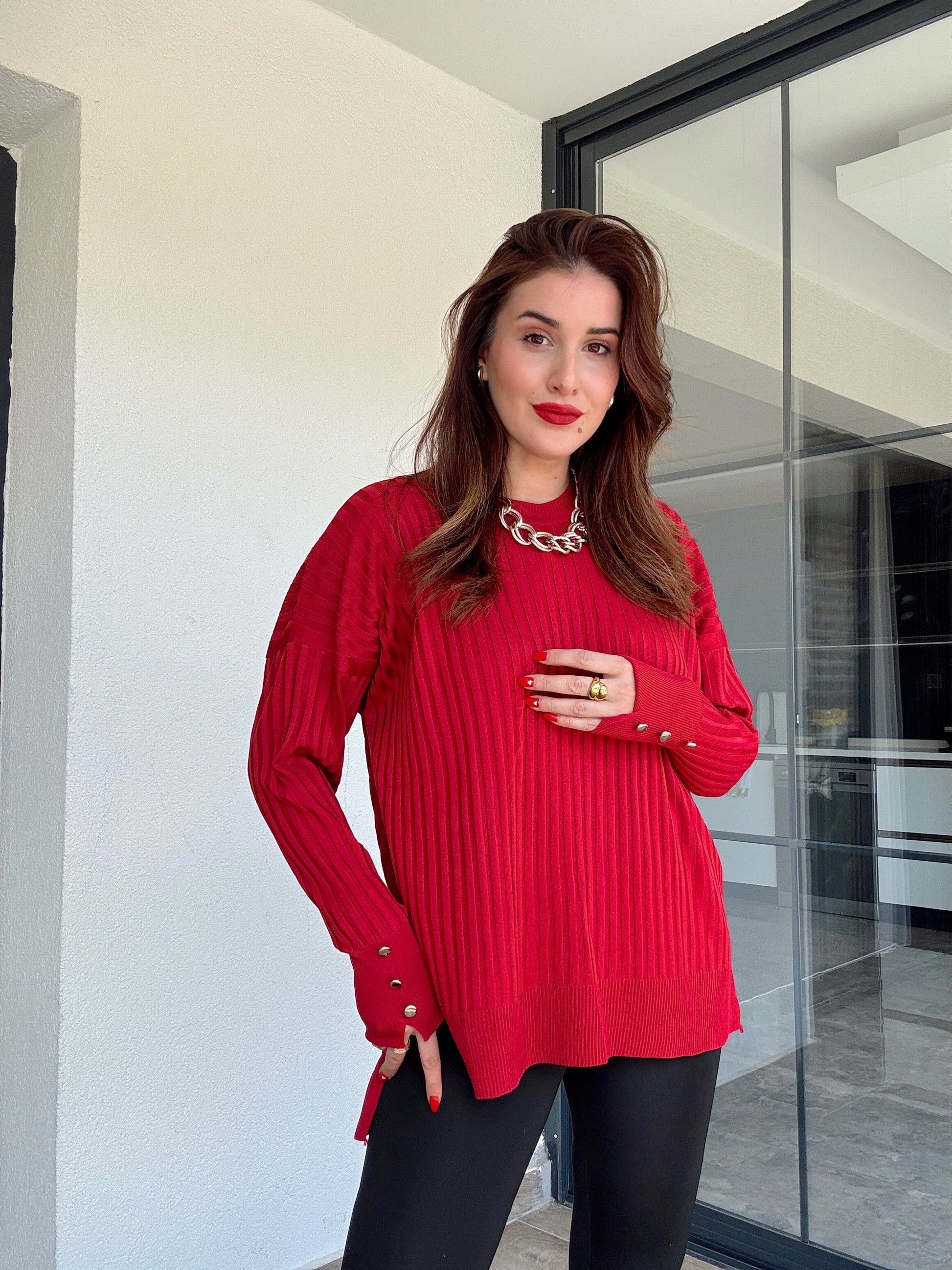 Oversize kesim kol düğmeli kazak KIRMIZI