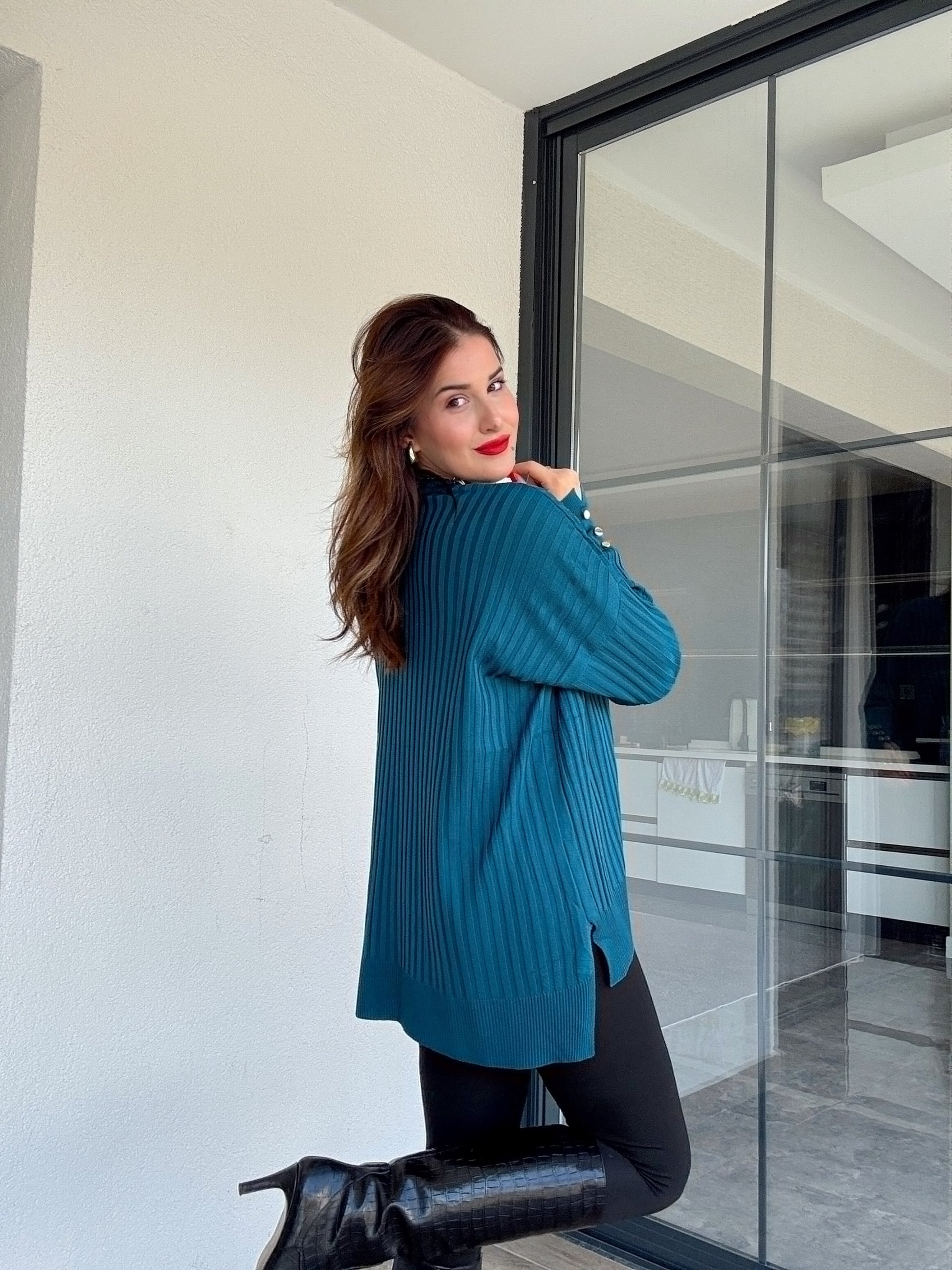 Oversize kesim kol düğmeli kazak YEŞİL