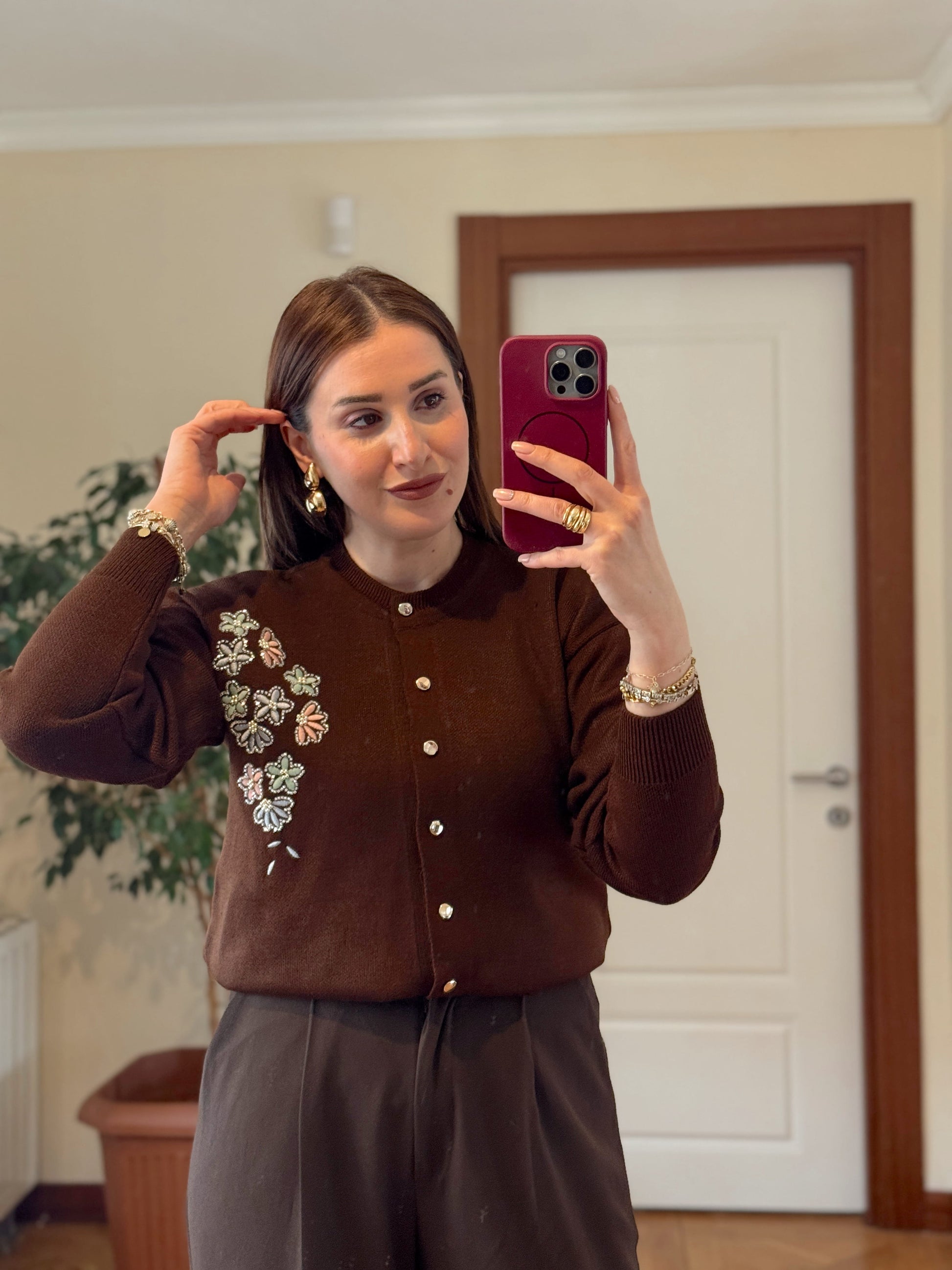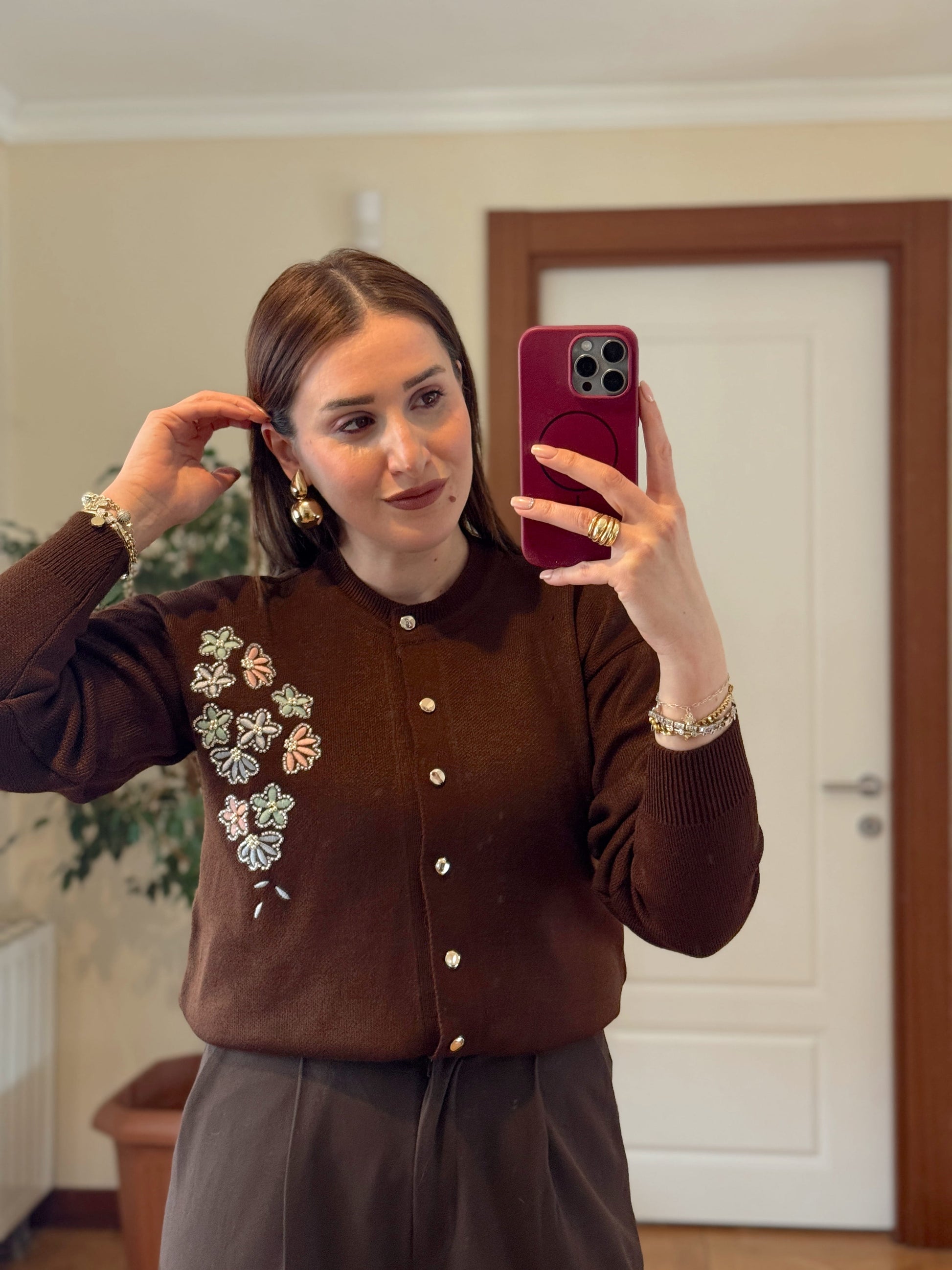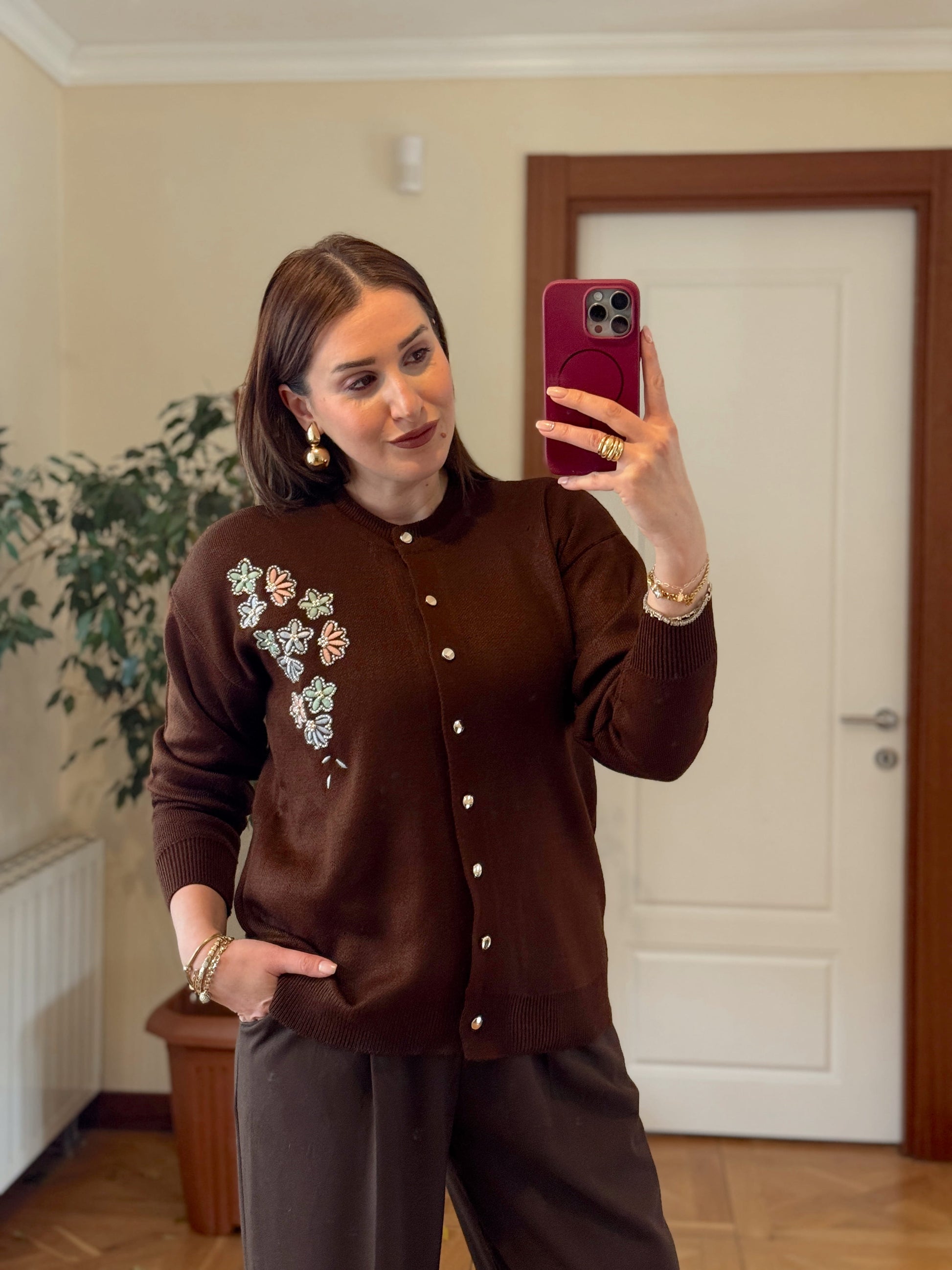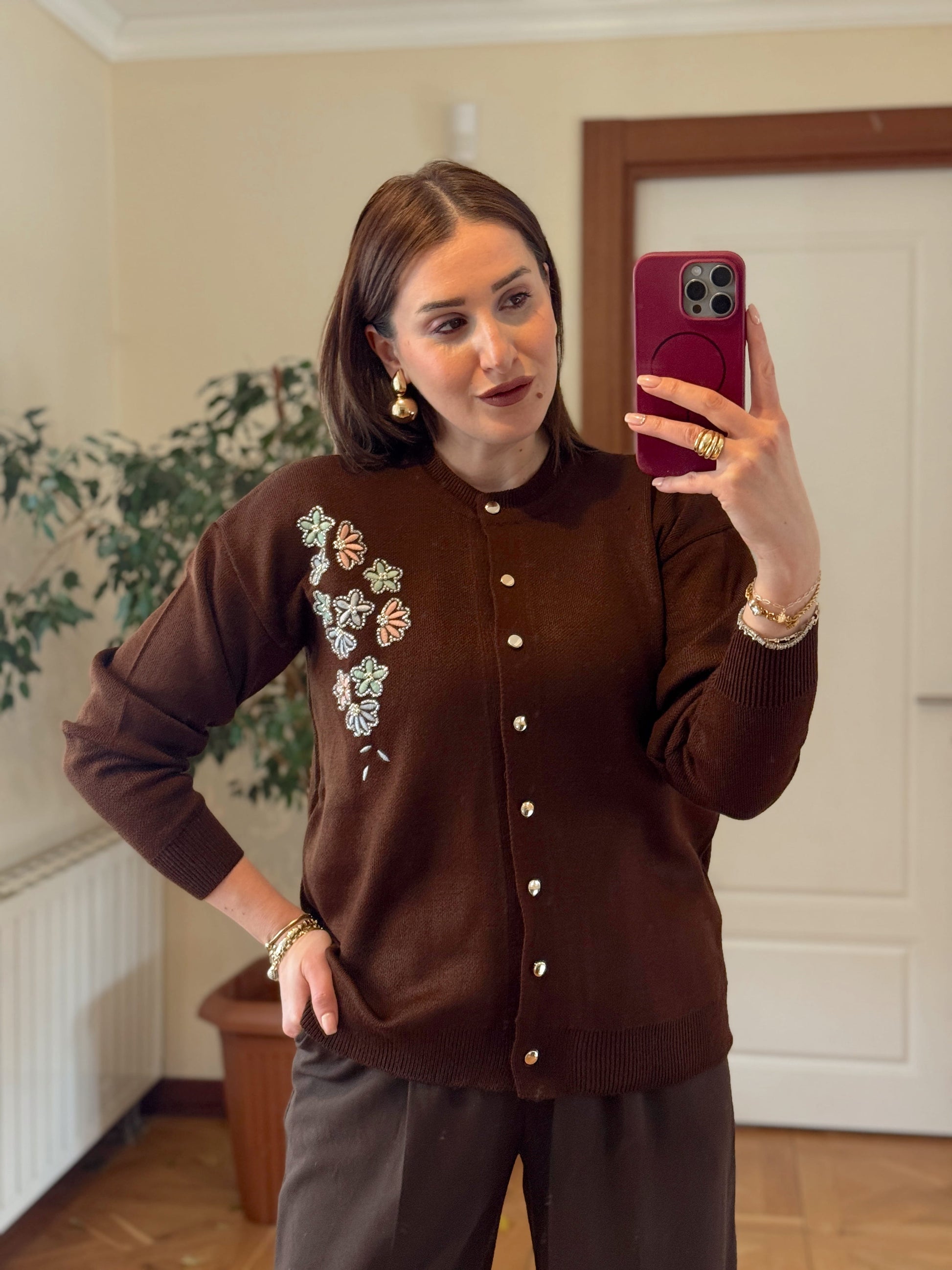 Papatya çiçekli hırka KAHVERENGİ