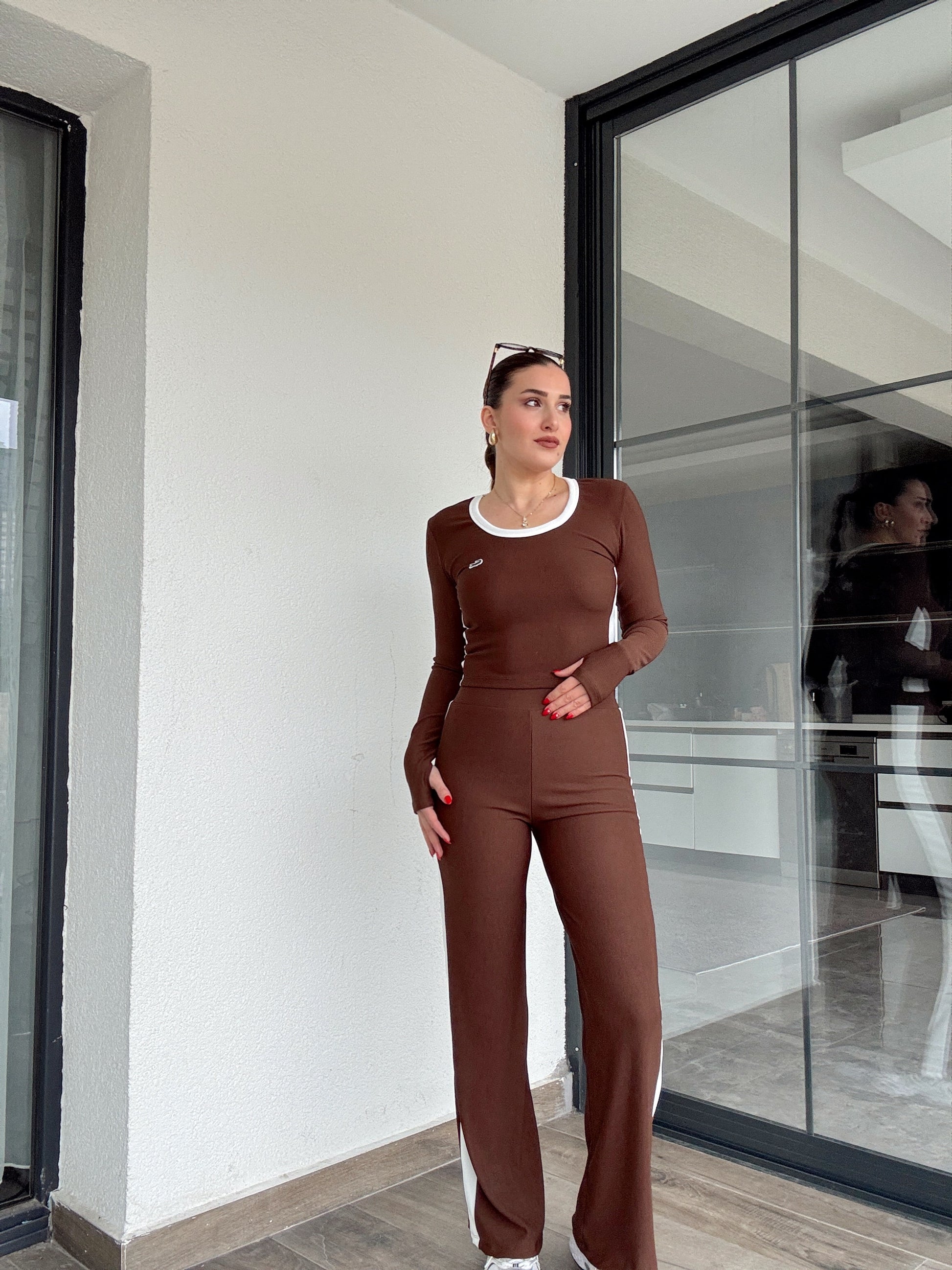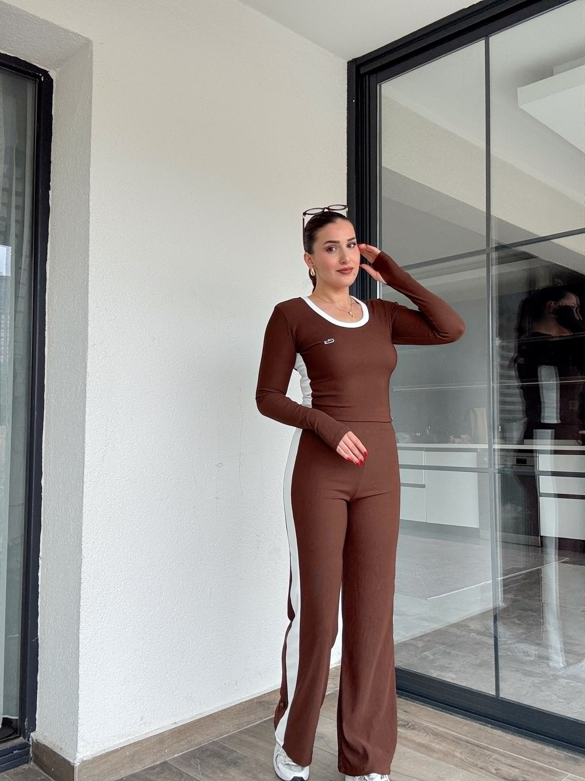 Parmak geçmeli oval yaka nakışlı takım Kahve