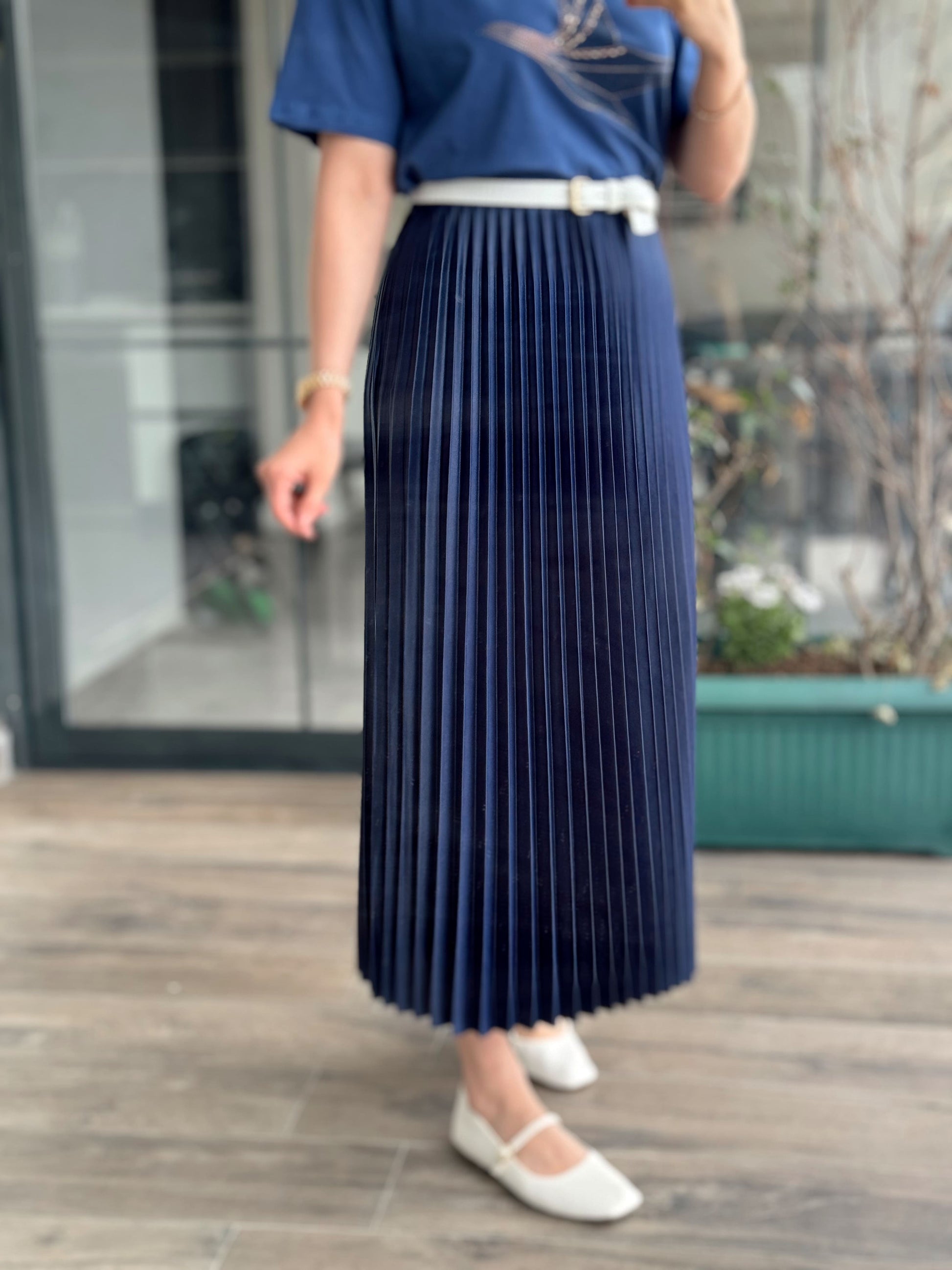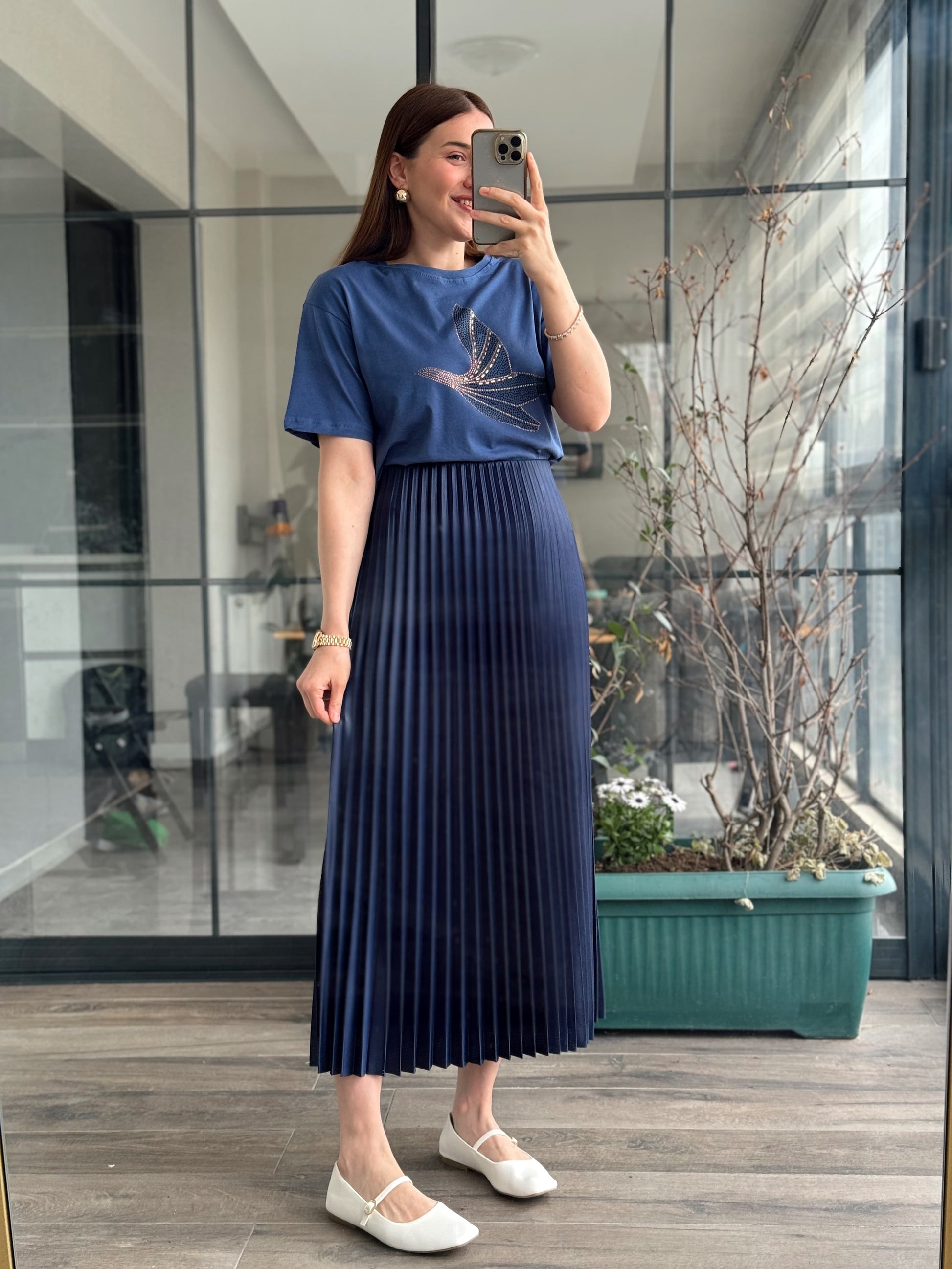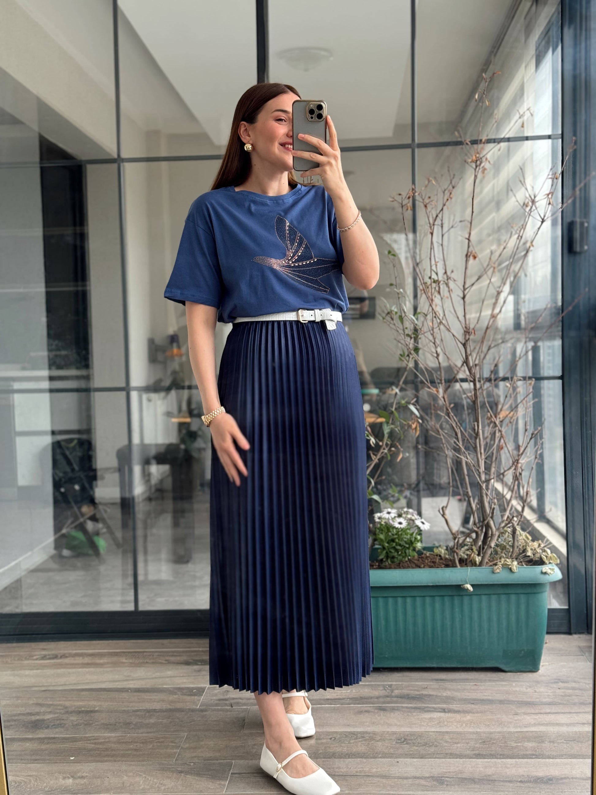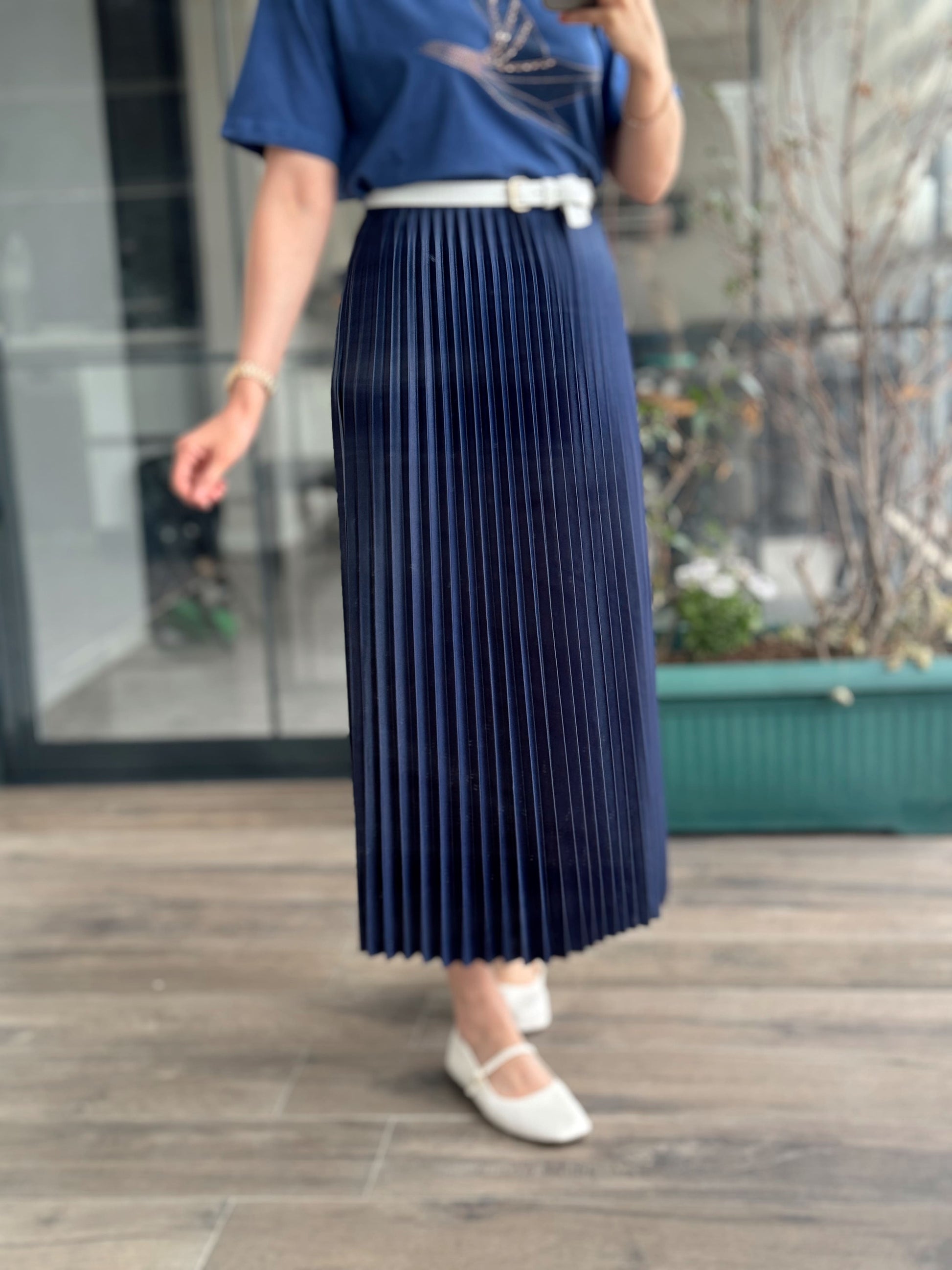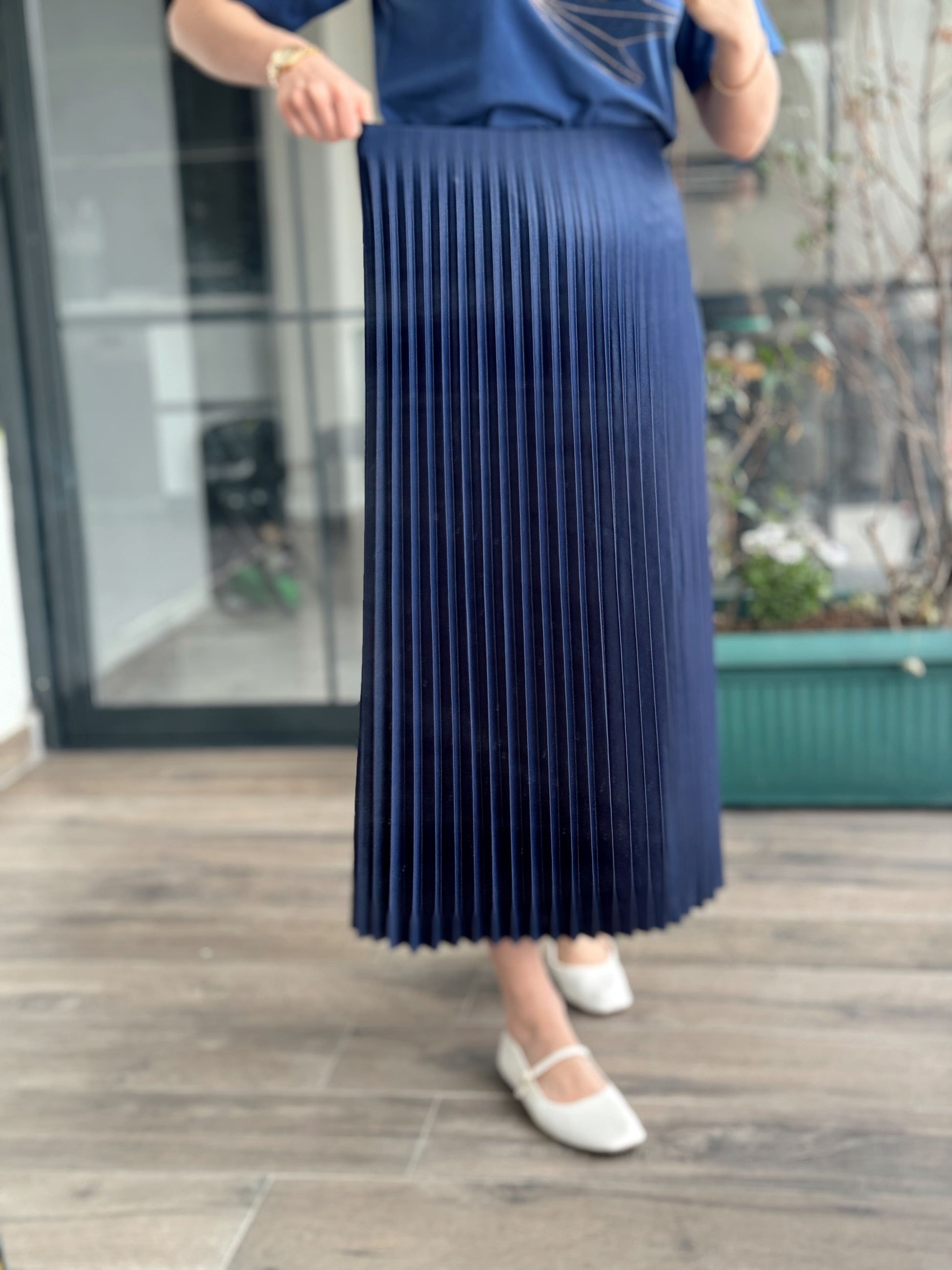 Pliseli Saten Doku Beli Lastikli Etek - LACİVERT