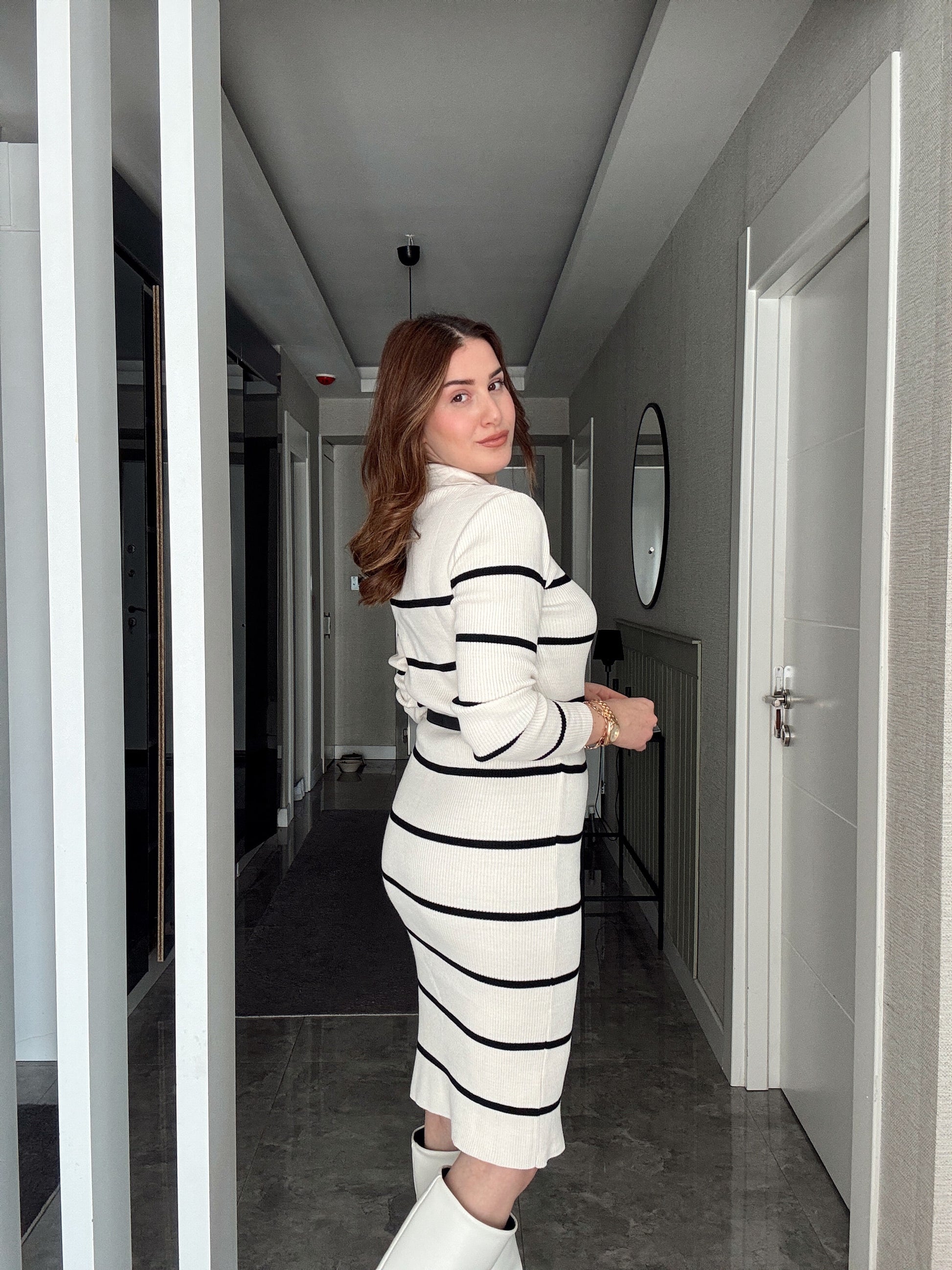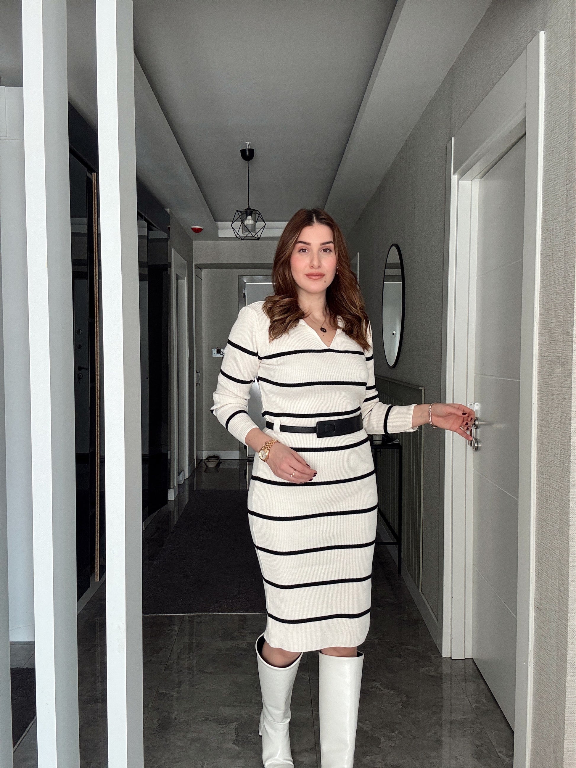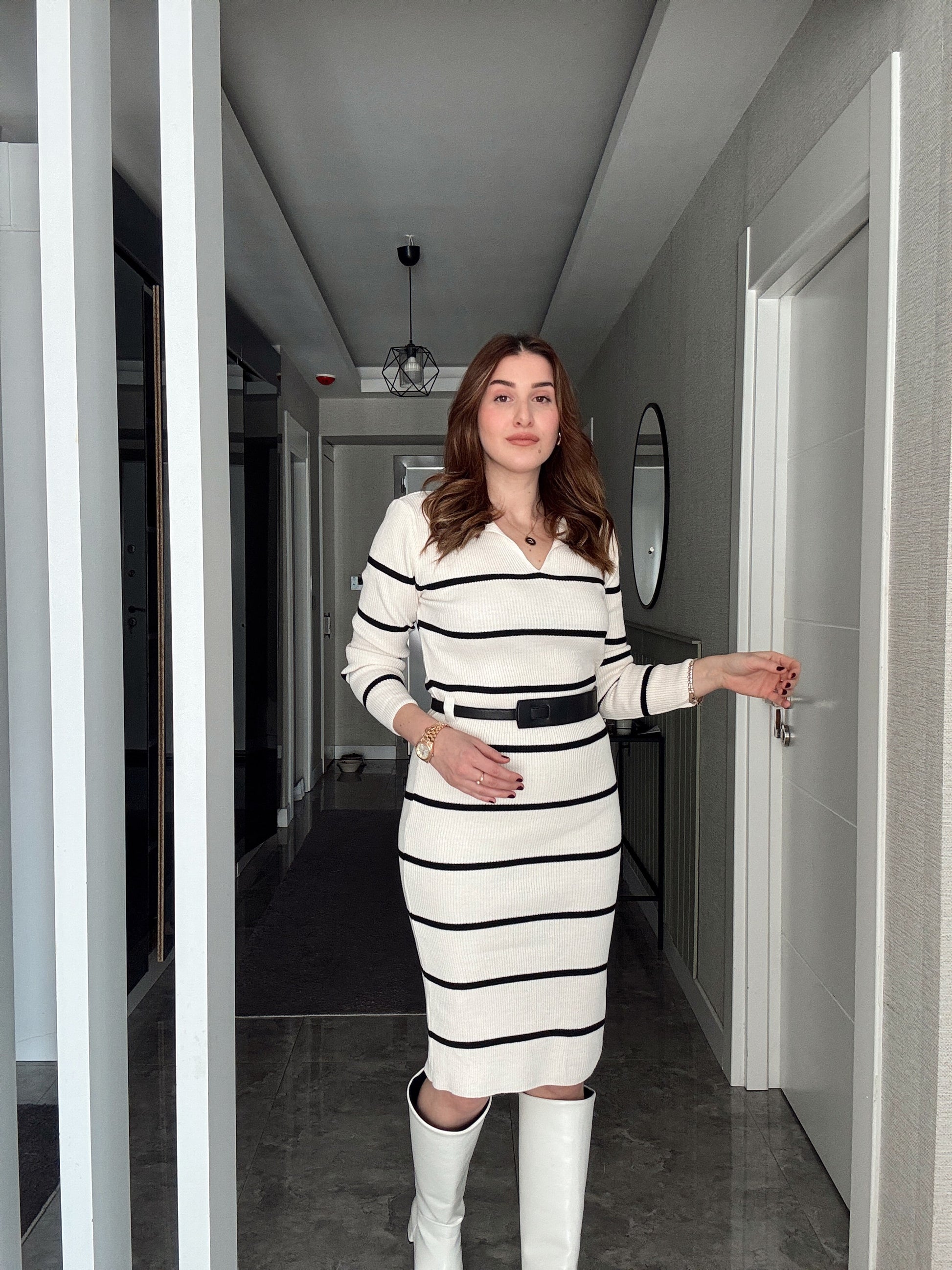 Polo Yaka Çizgili Kemerli Triko Elbise - BEJ