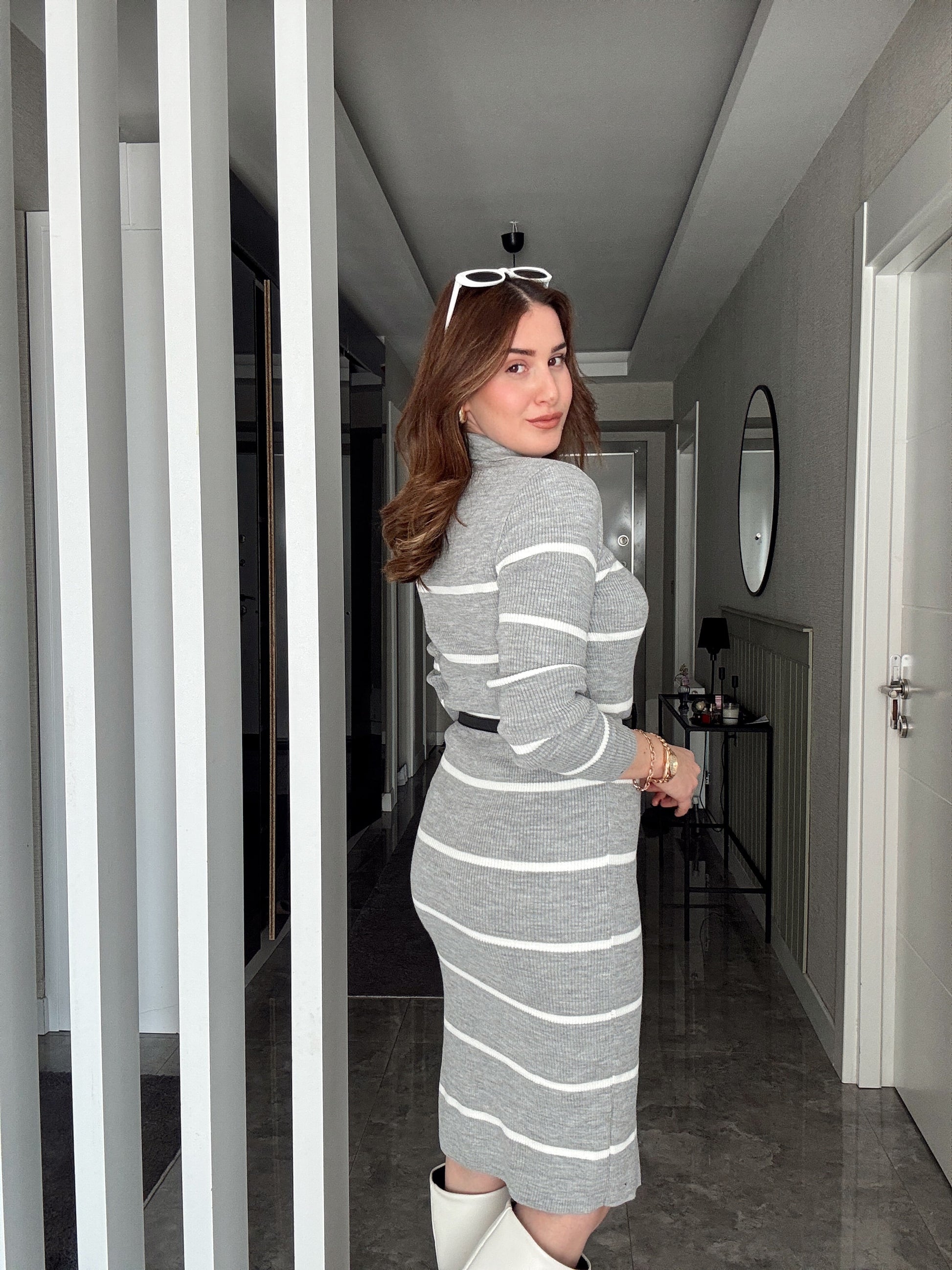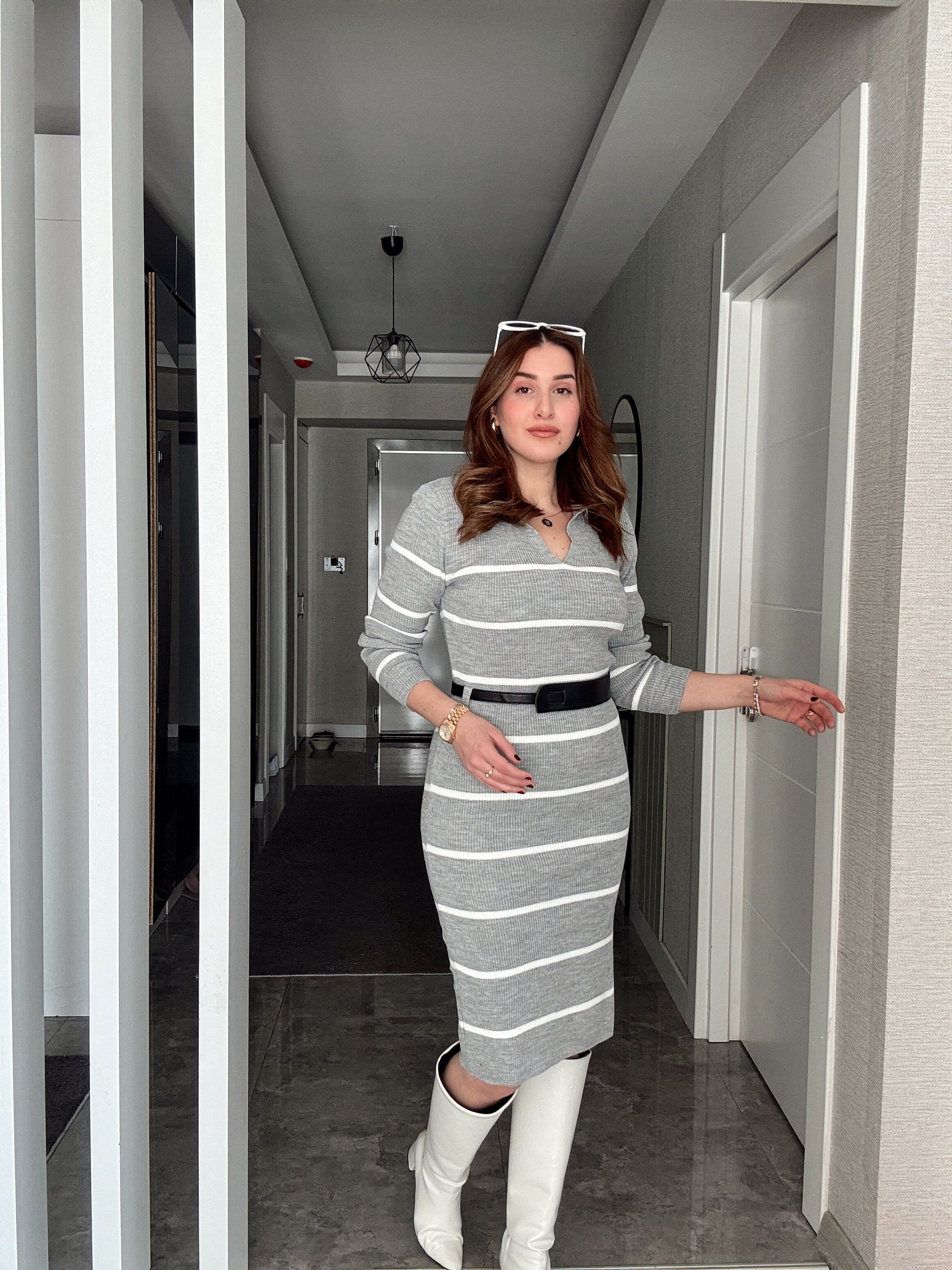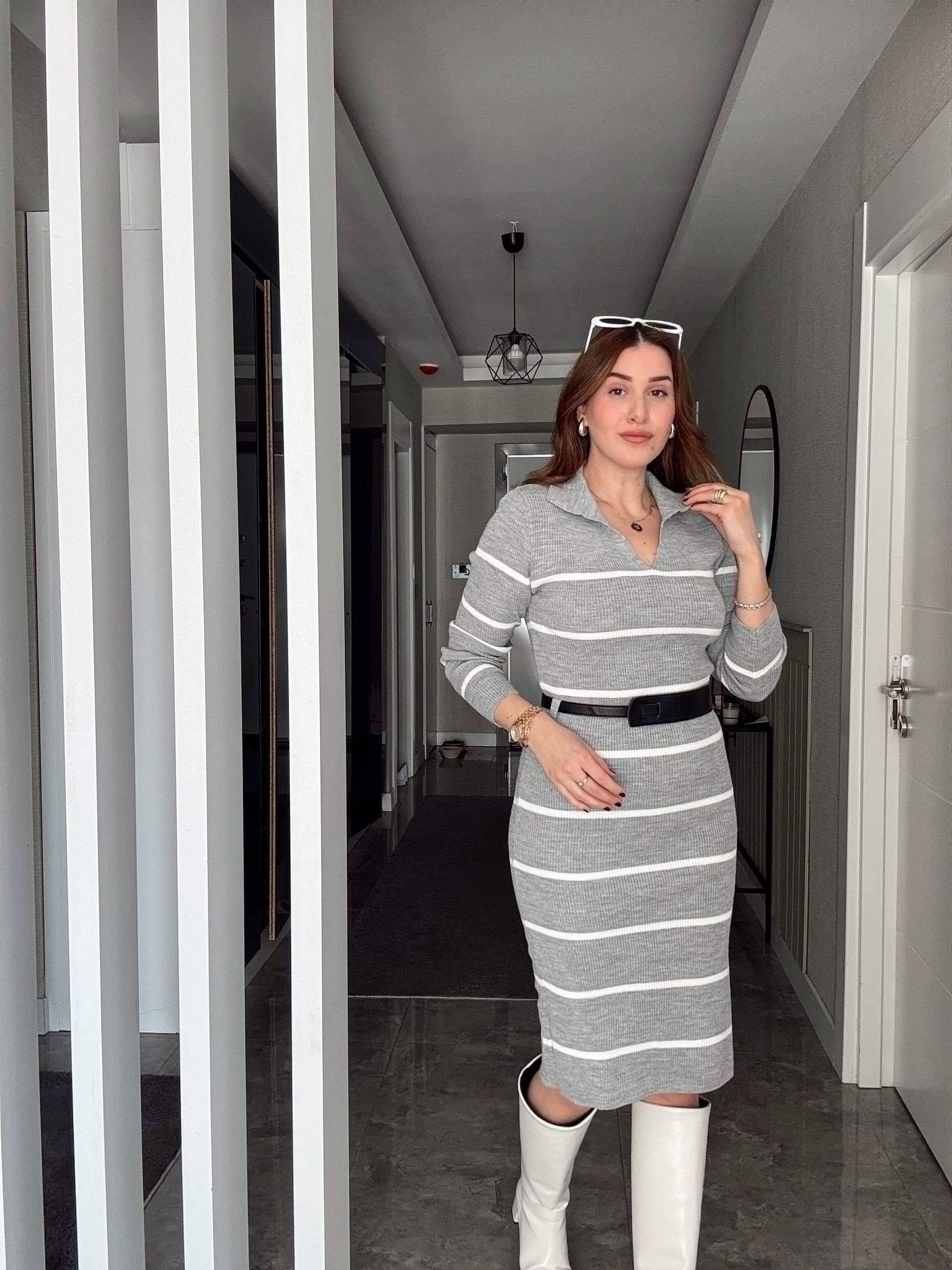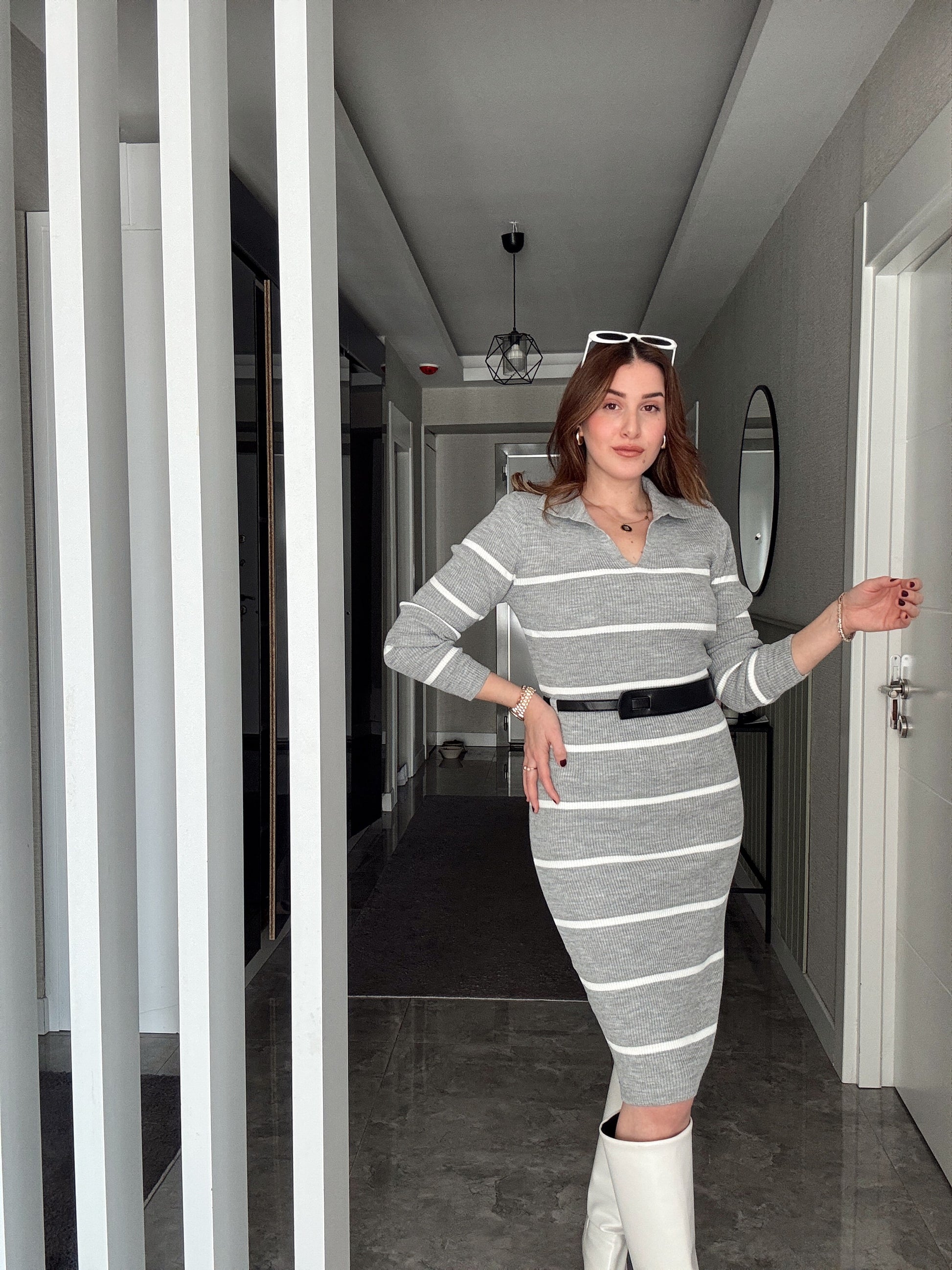 Polo Yaka Çizgili Kemerli Triko Elbise - GRİ