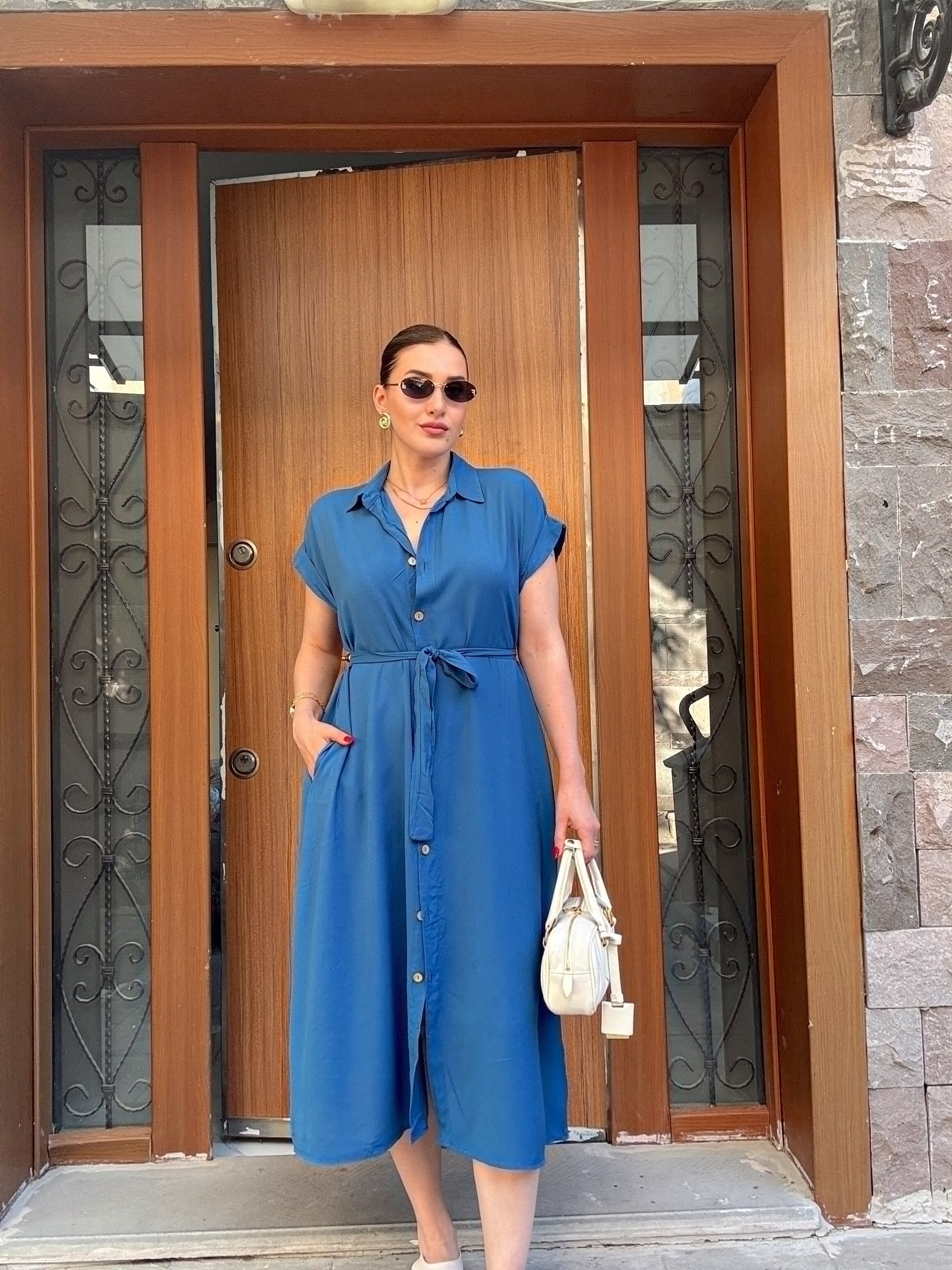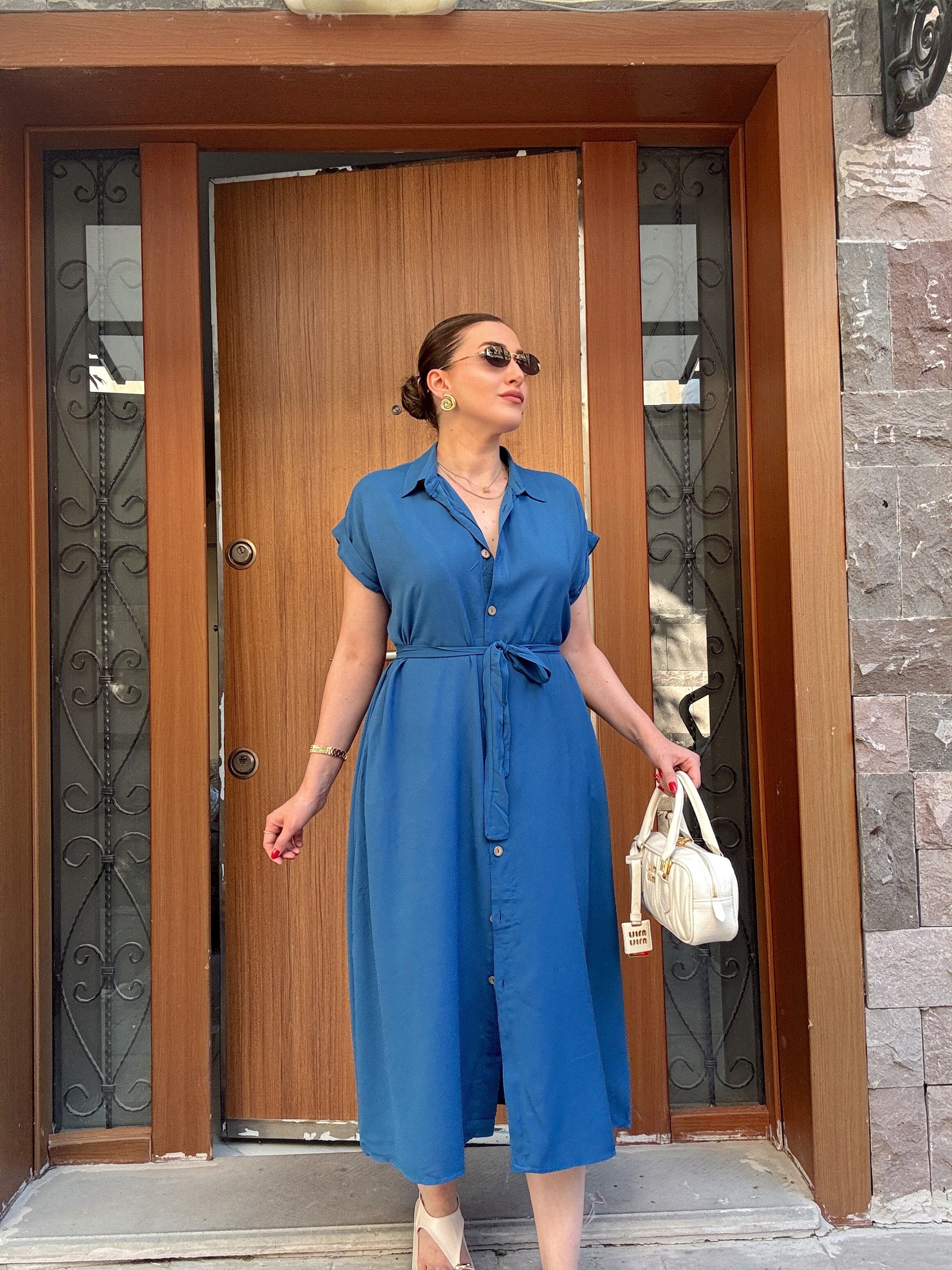 Polo yaka kemerli düğmeli viskon elbise MAVİ