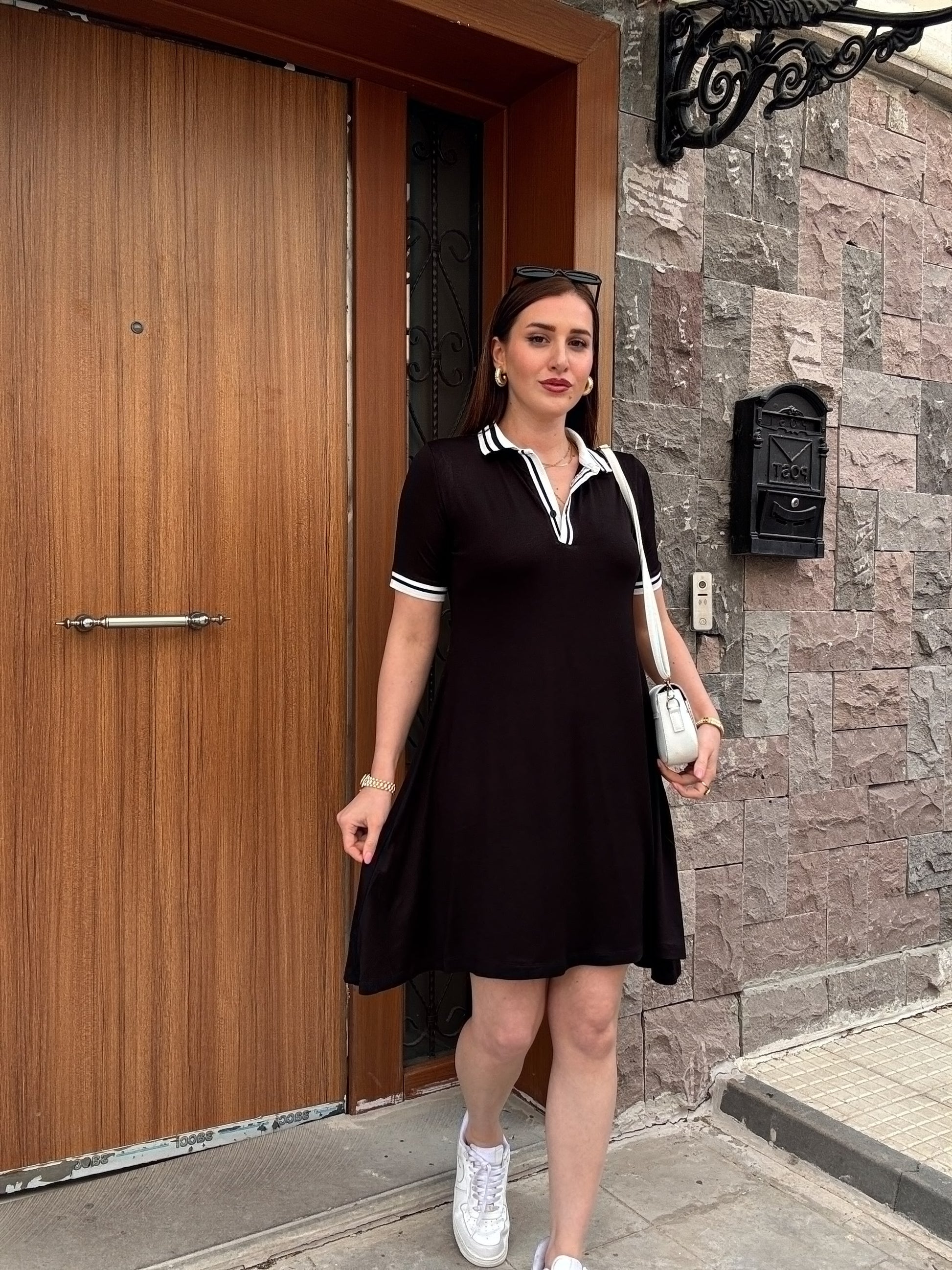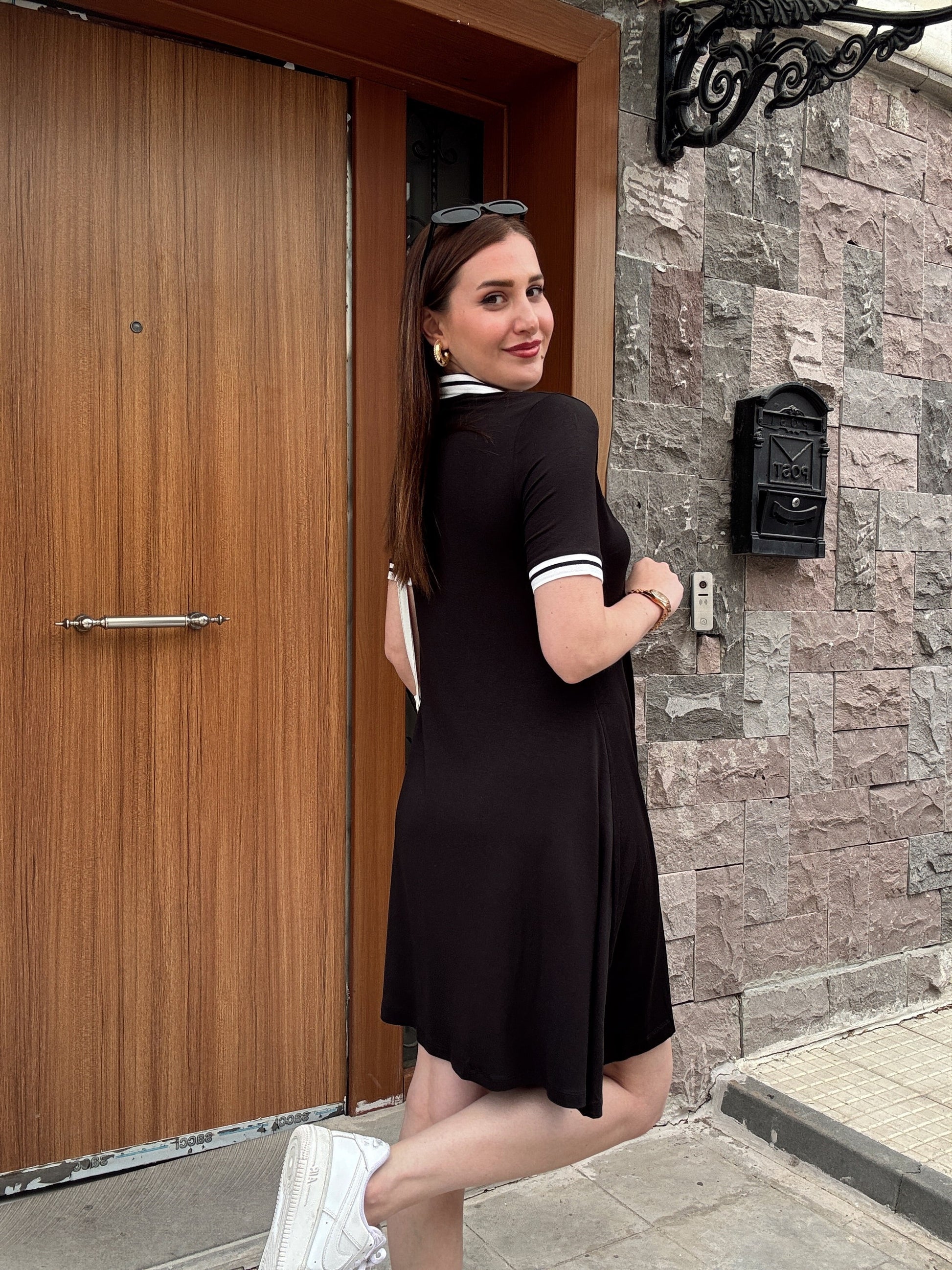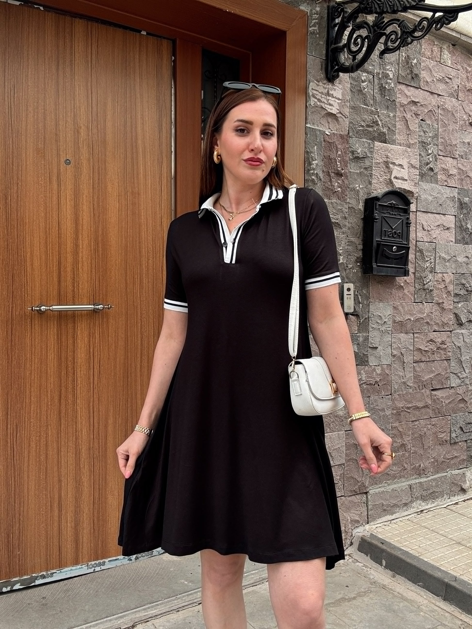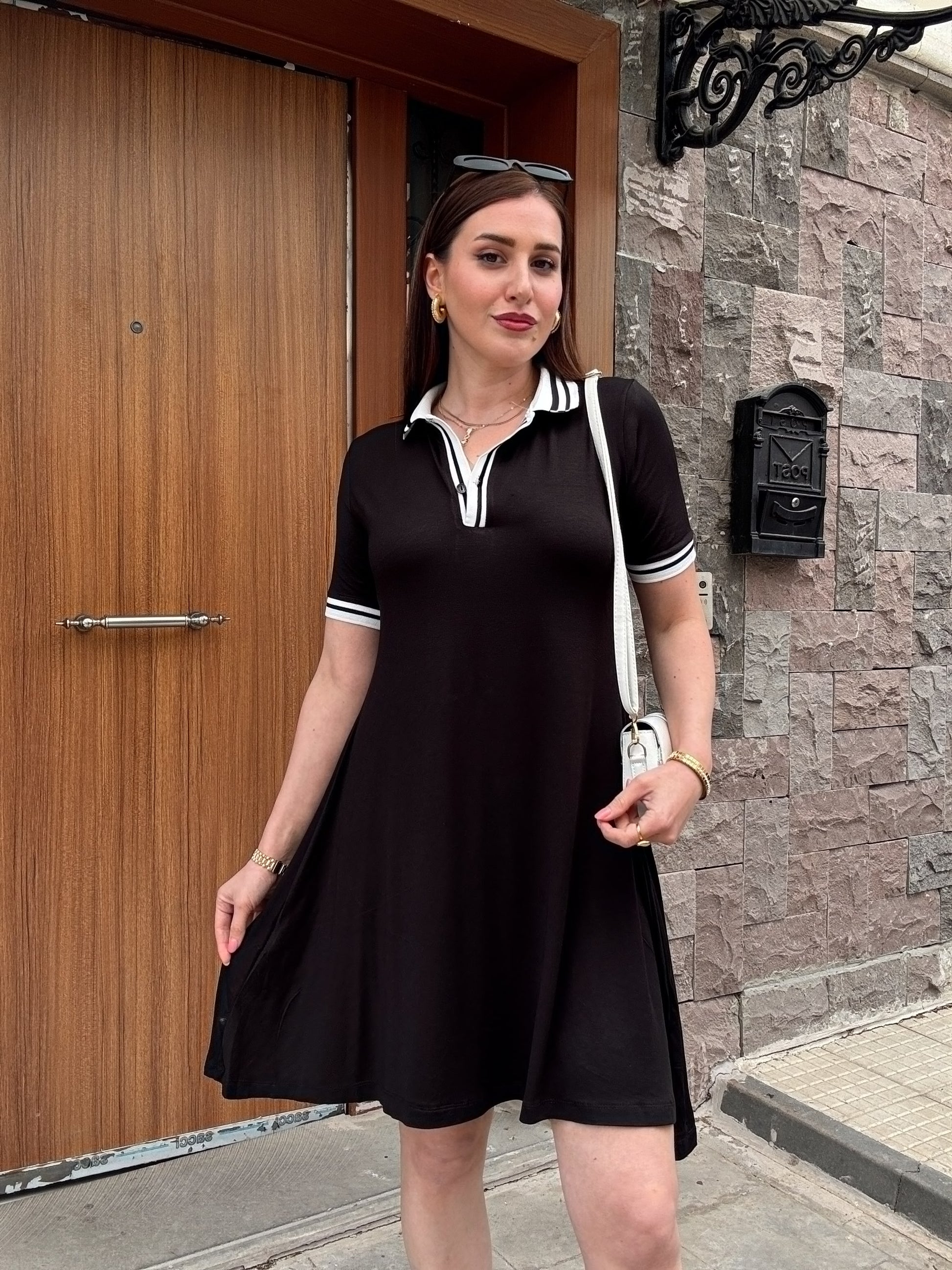Polo yaka pamuklu penye kumaş elbise-SİYAH