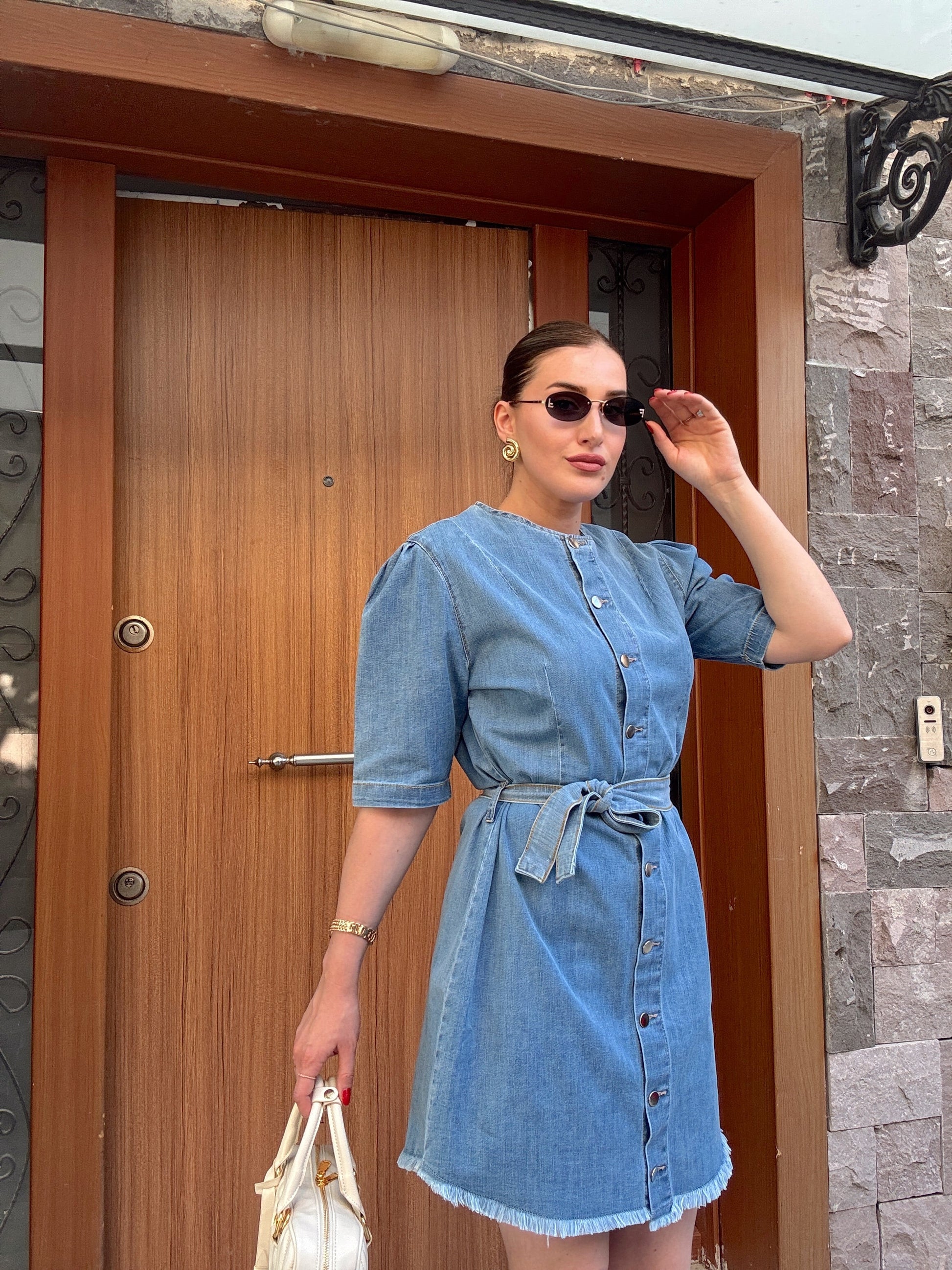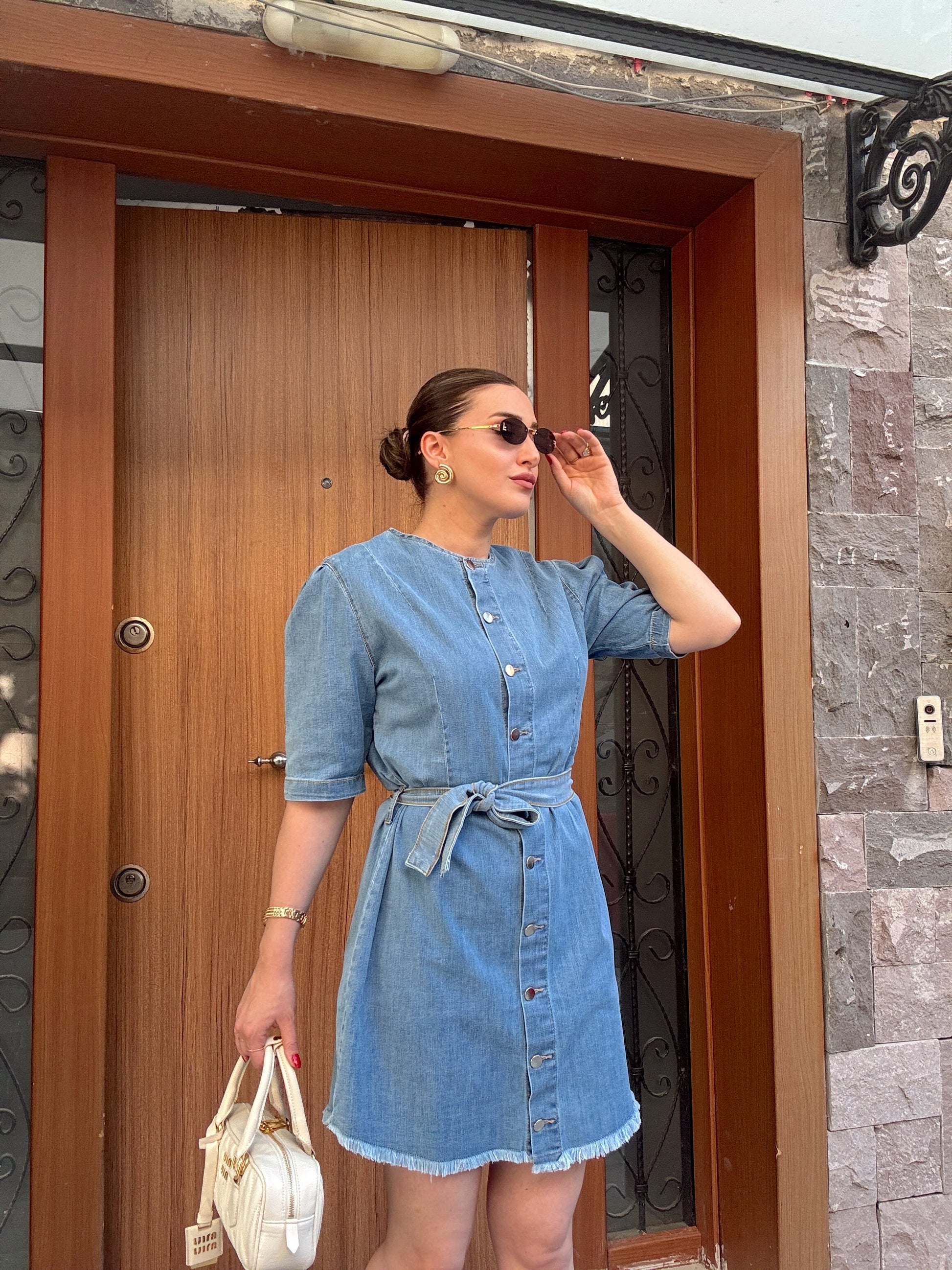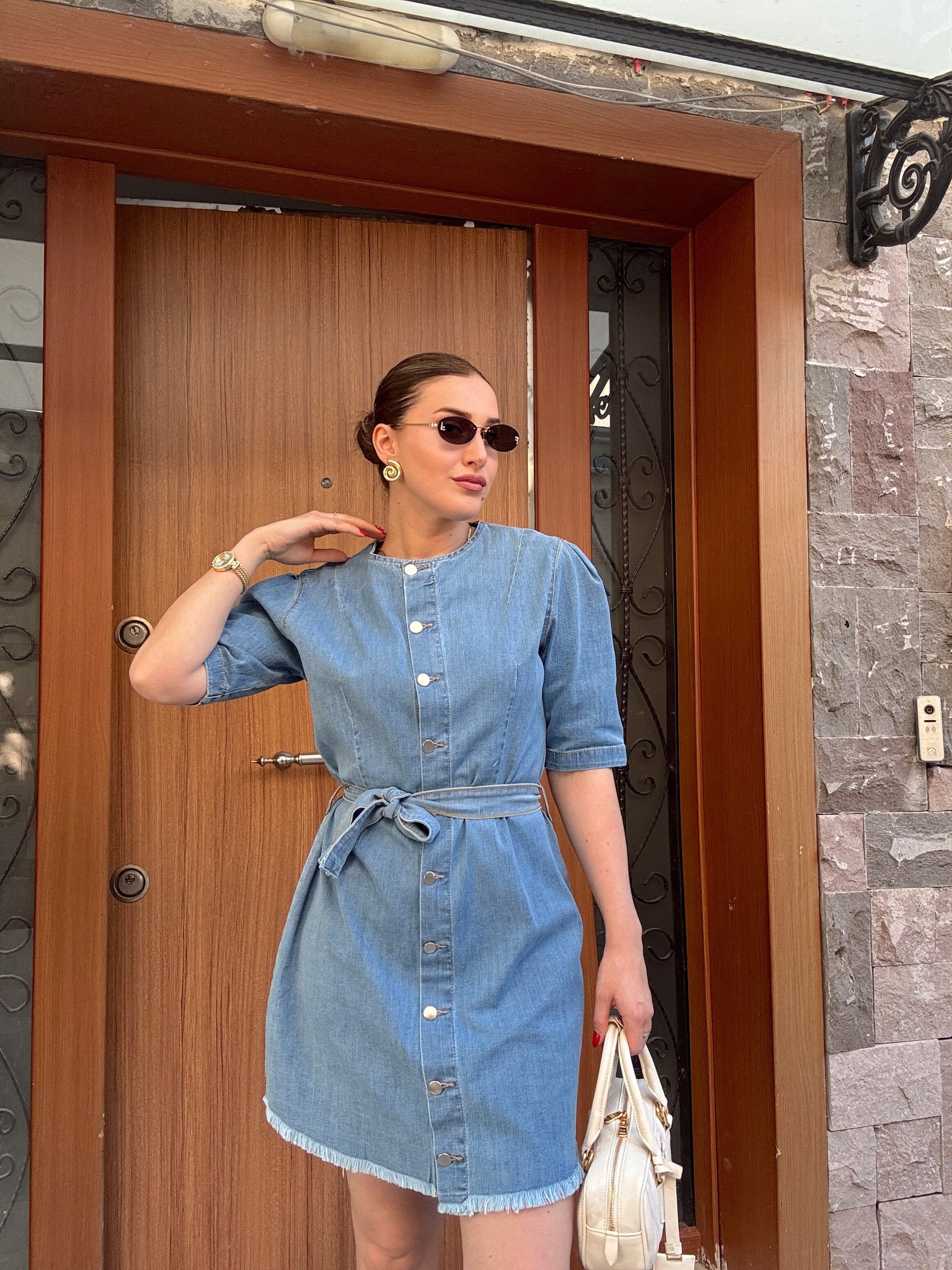 Püskül detaylı kuşaklı kot elbise-AÇIK MAVİ