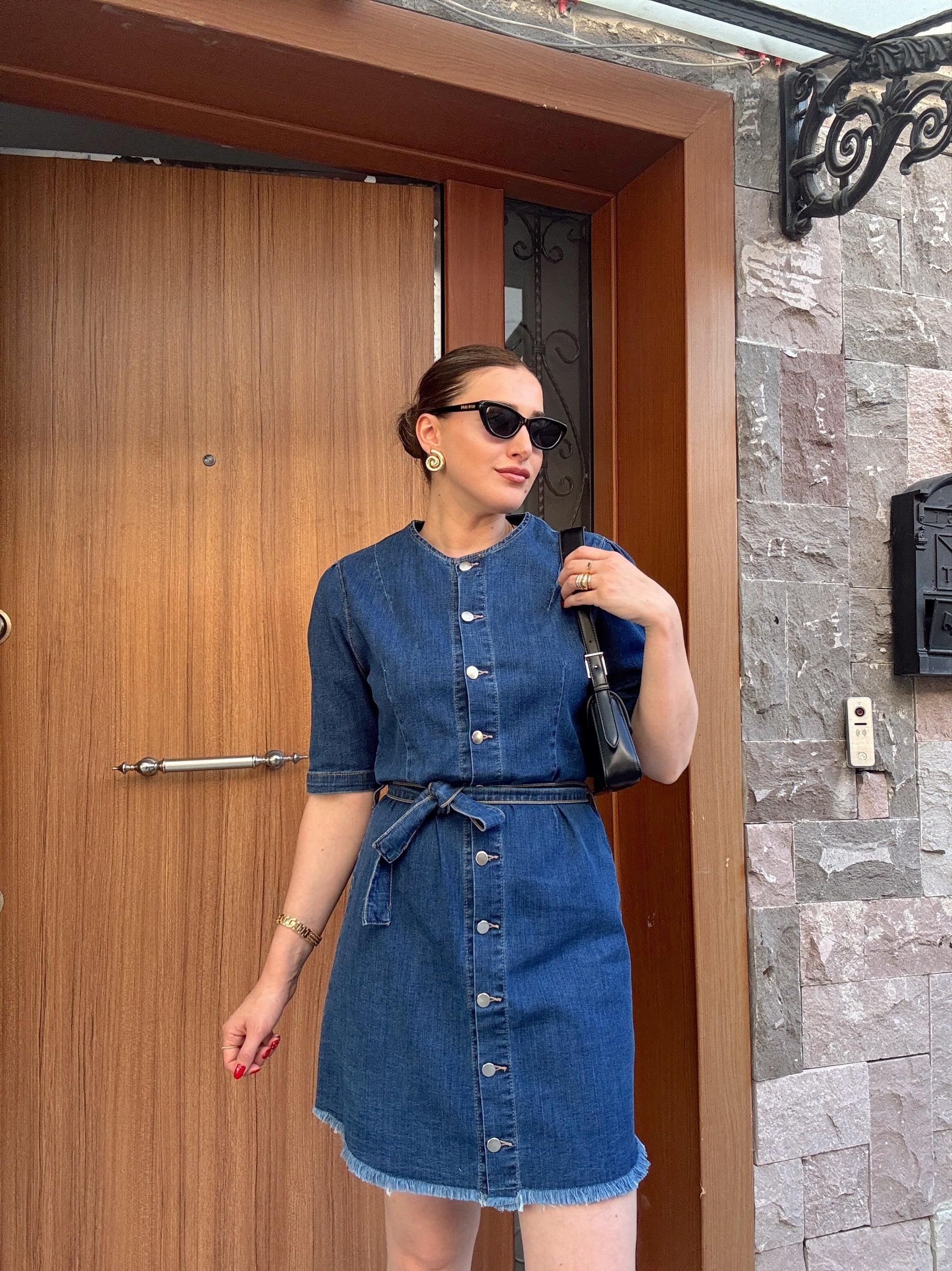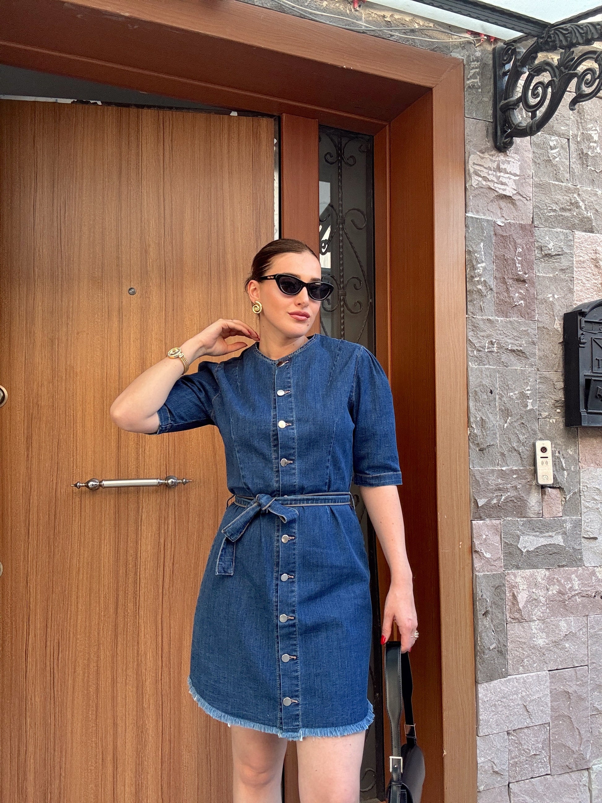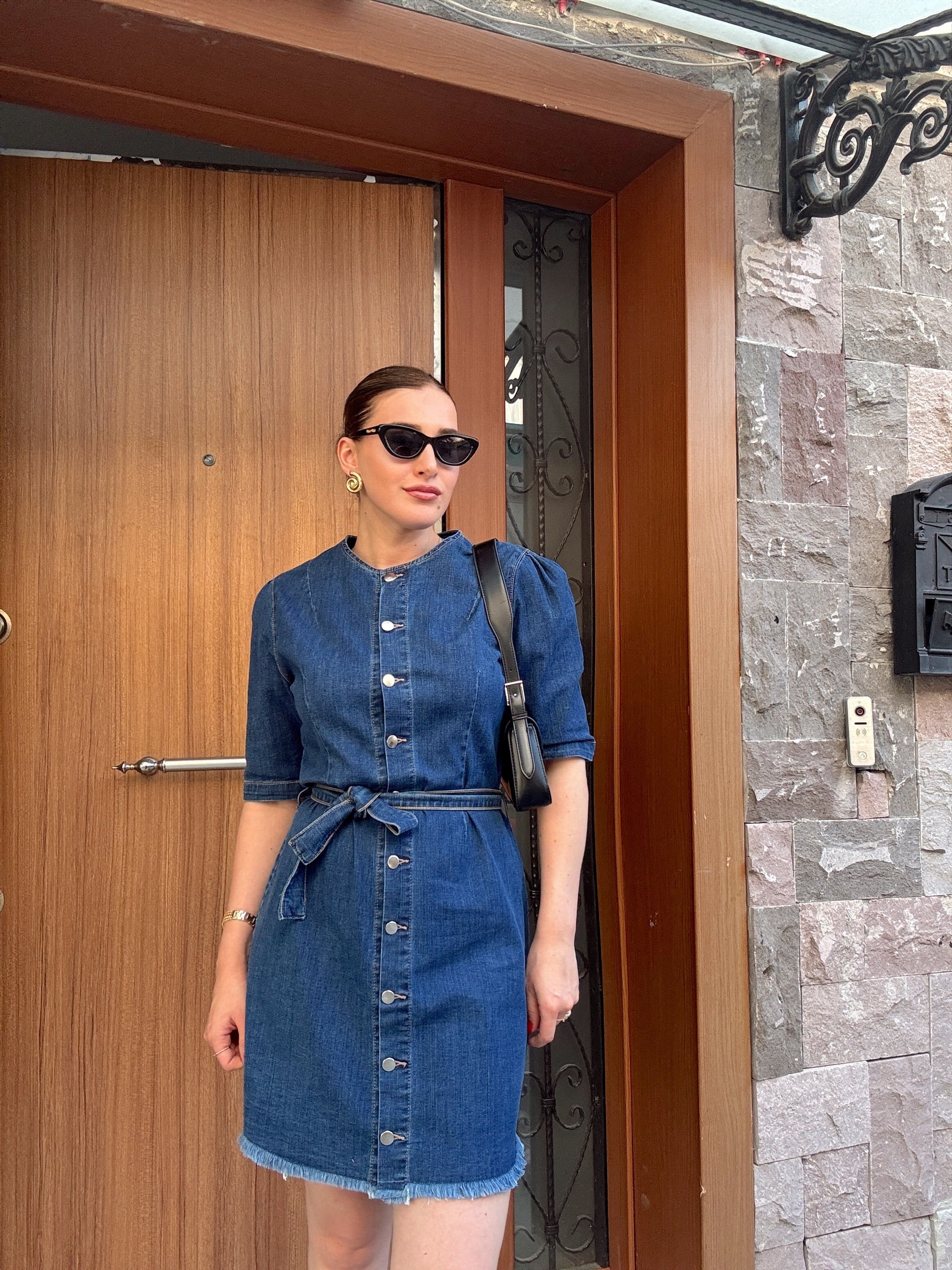 Püskül detaylı kuşaklı kot elbise-KOYU MAVİ