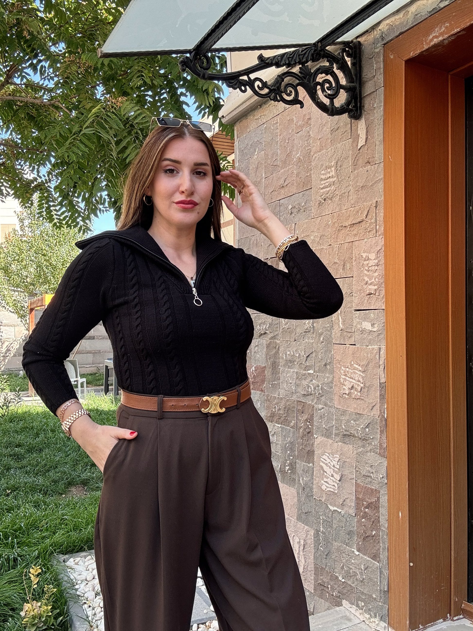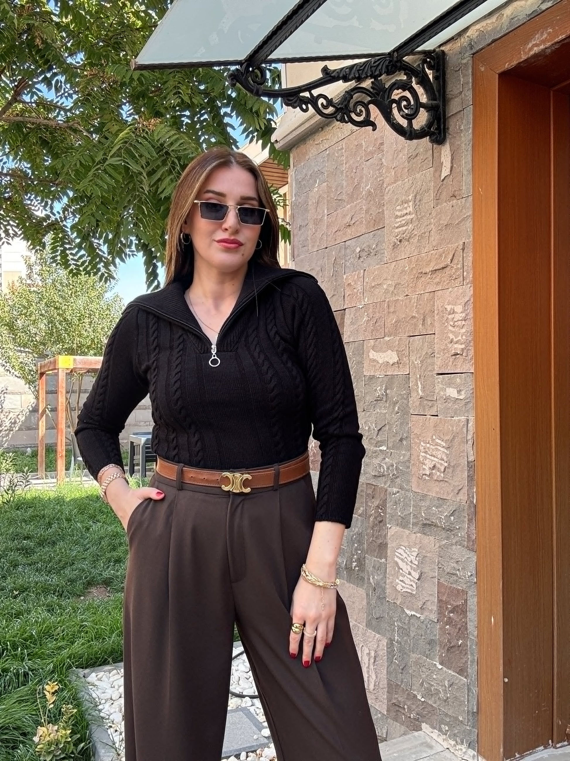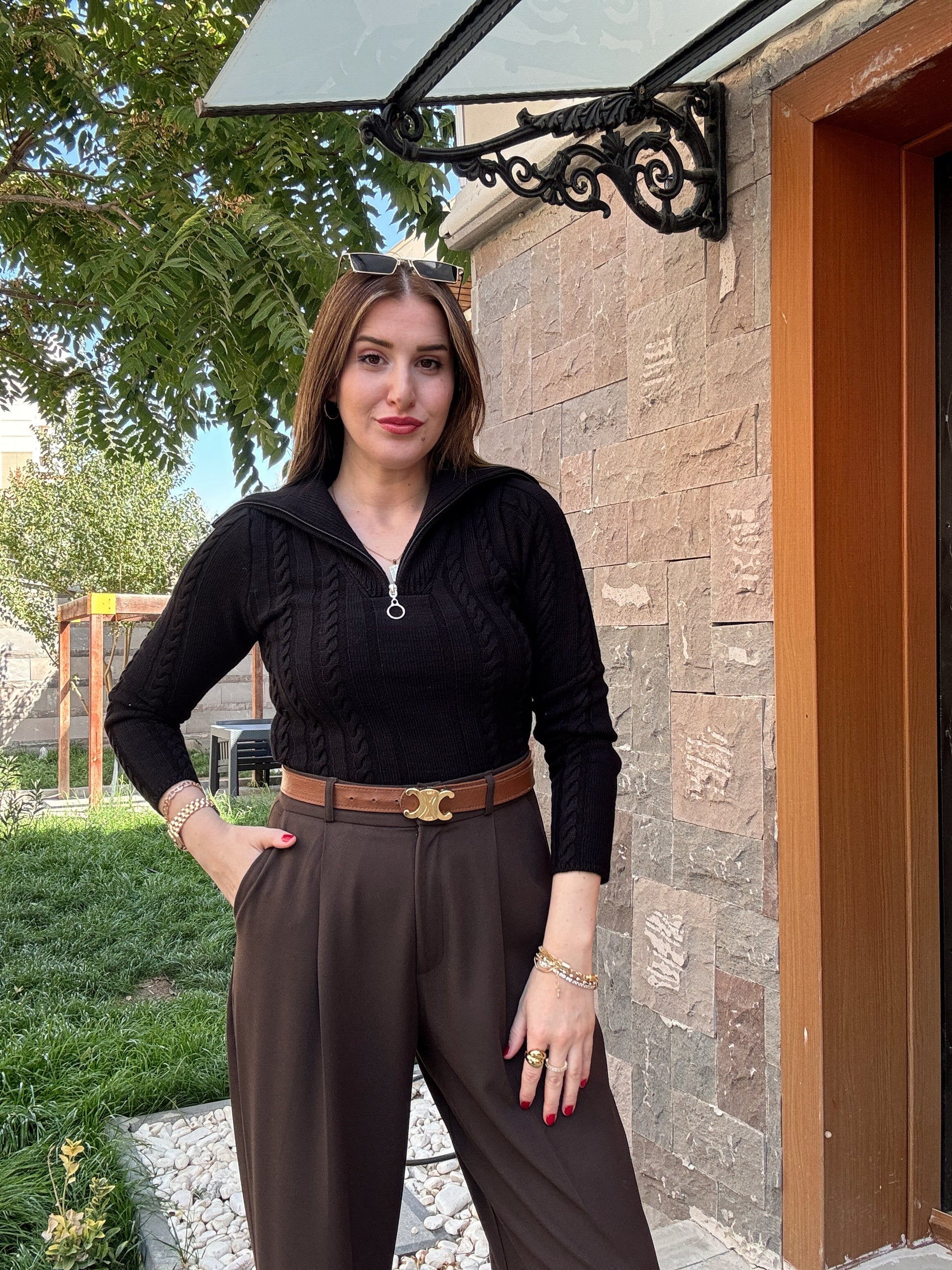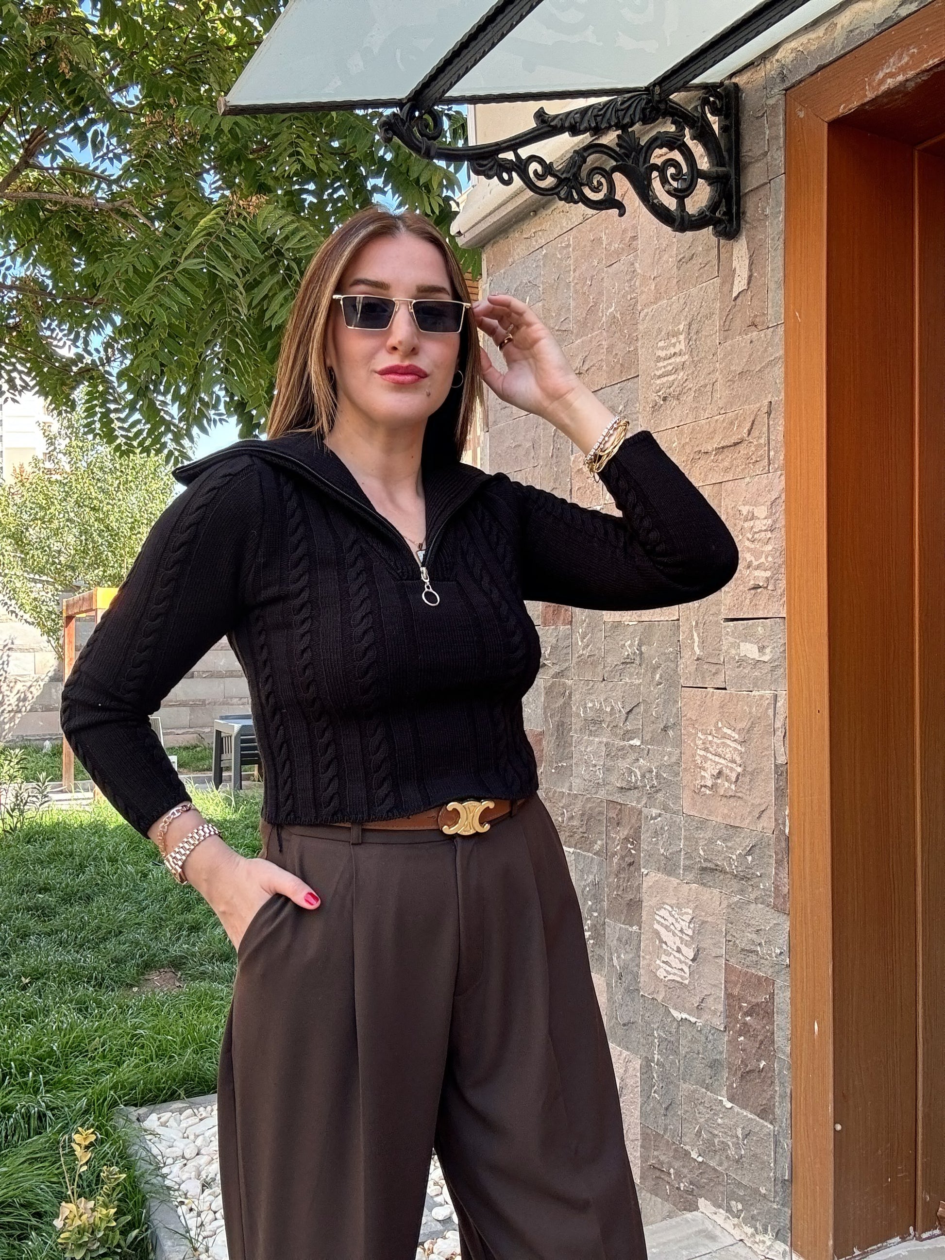 Saç Örgü Fermuarlı Spor Bluz - Siyah