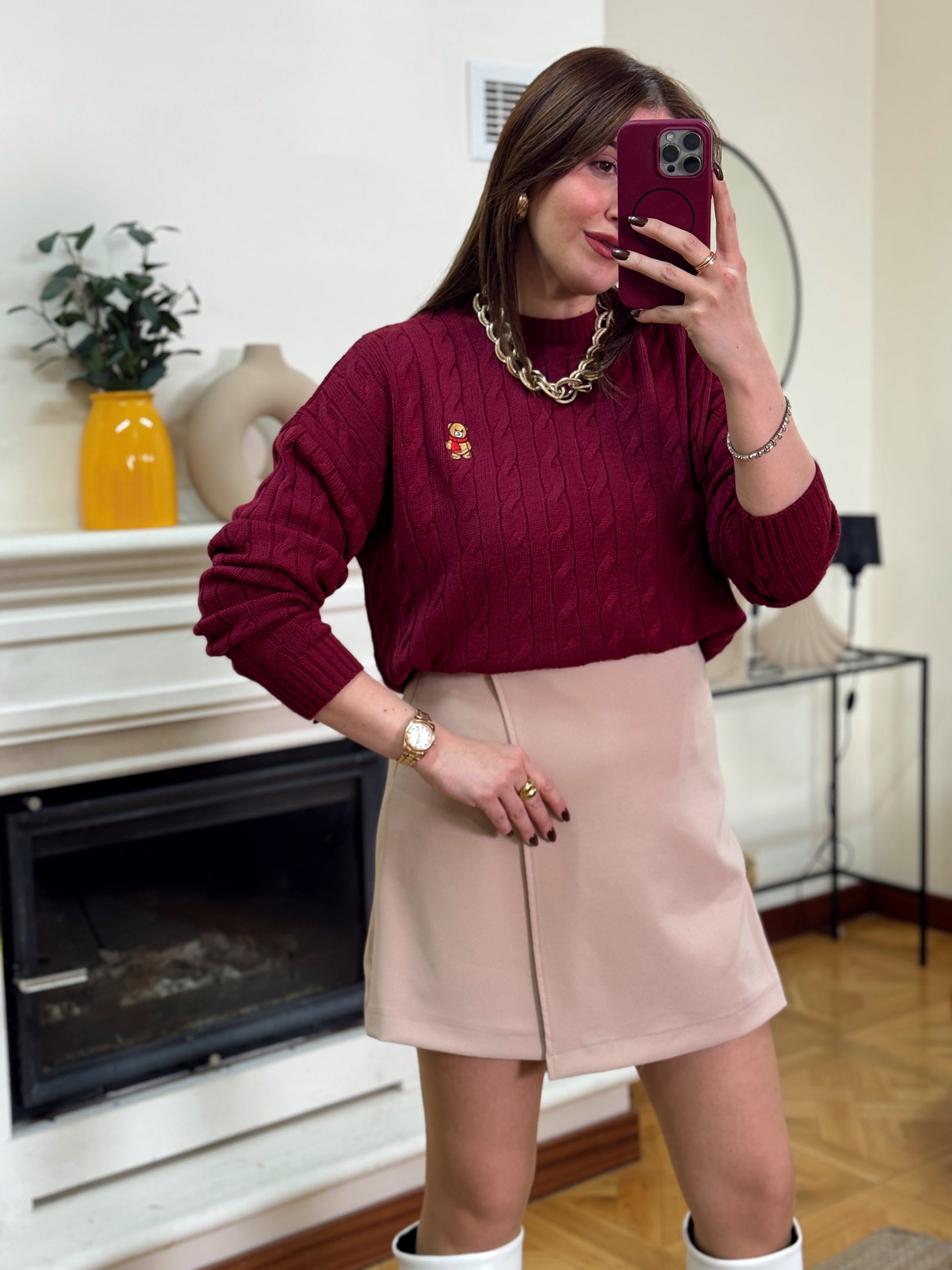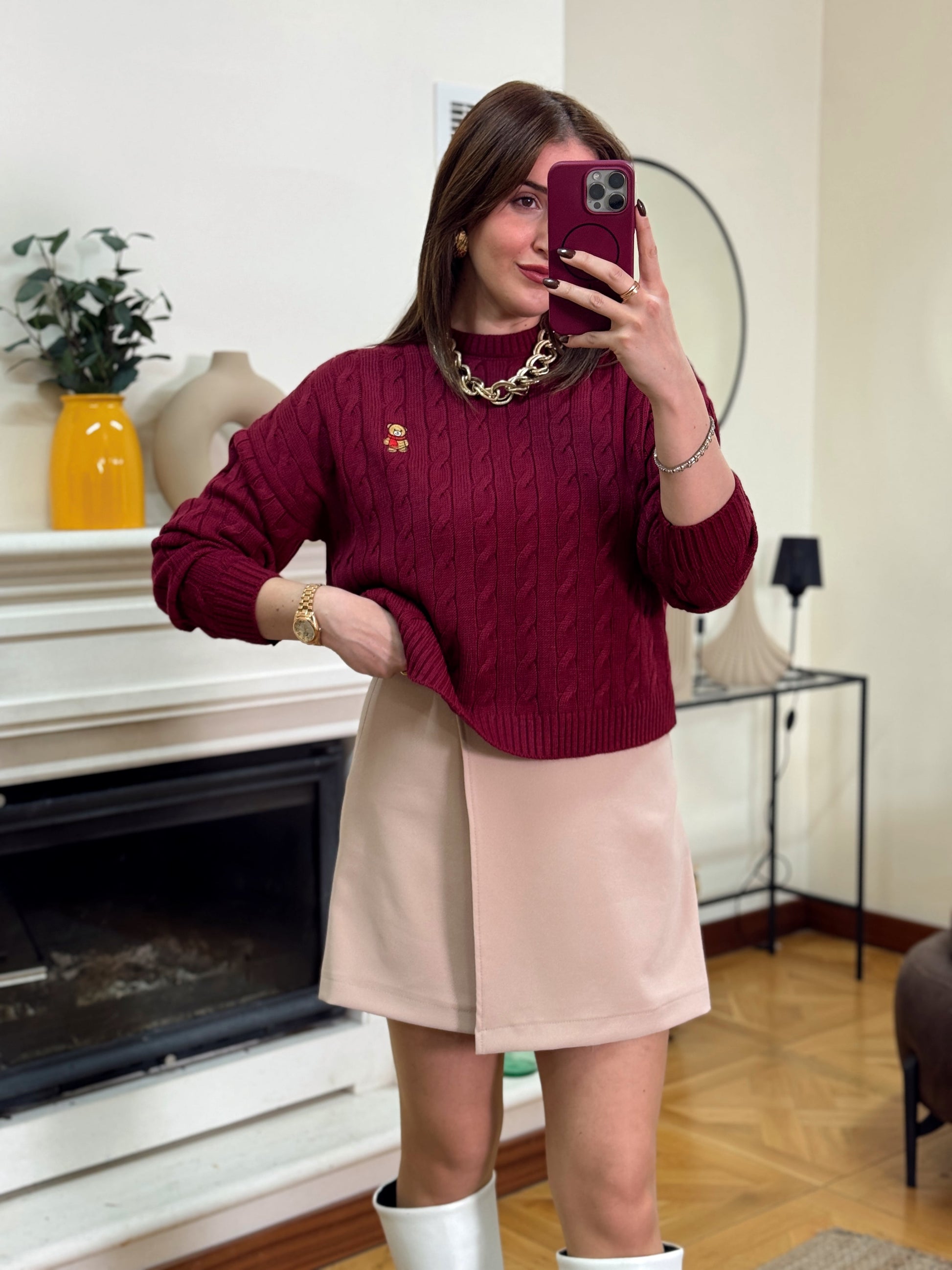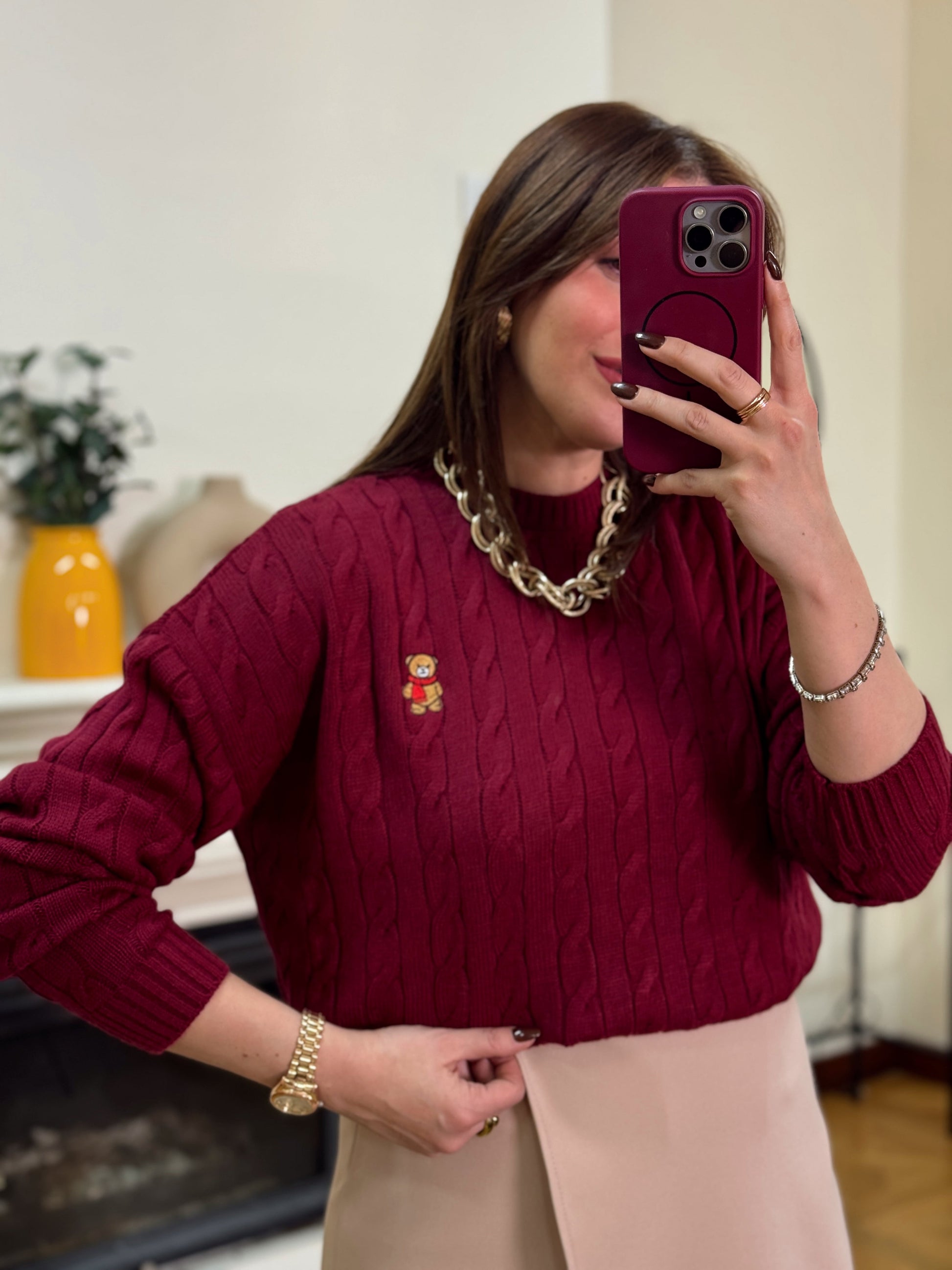 Saç örgü küçük ayıcık işlemeli kazak-BORDO