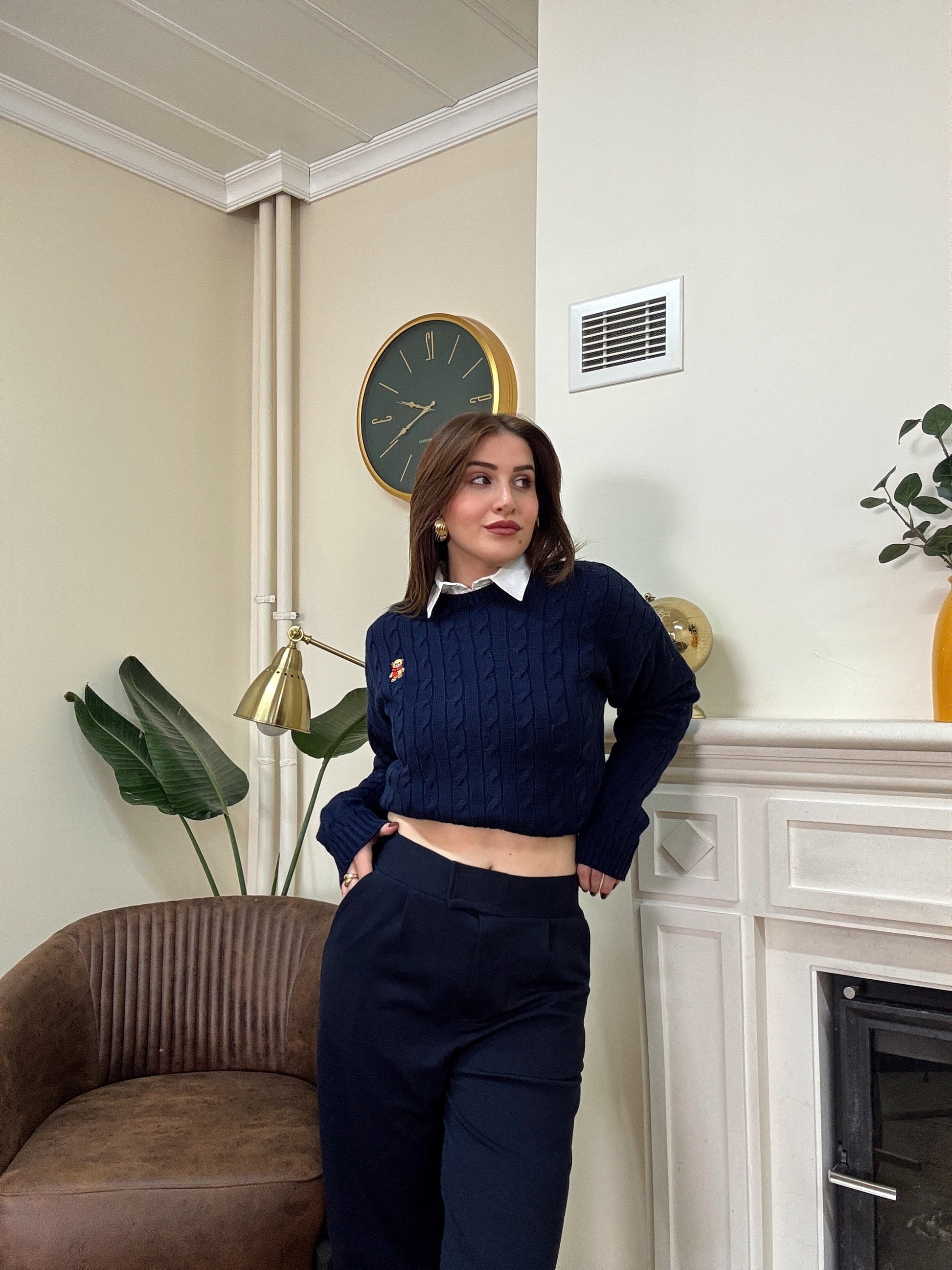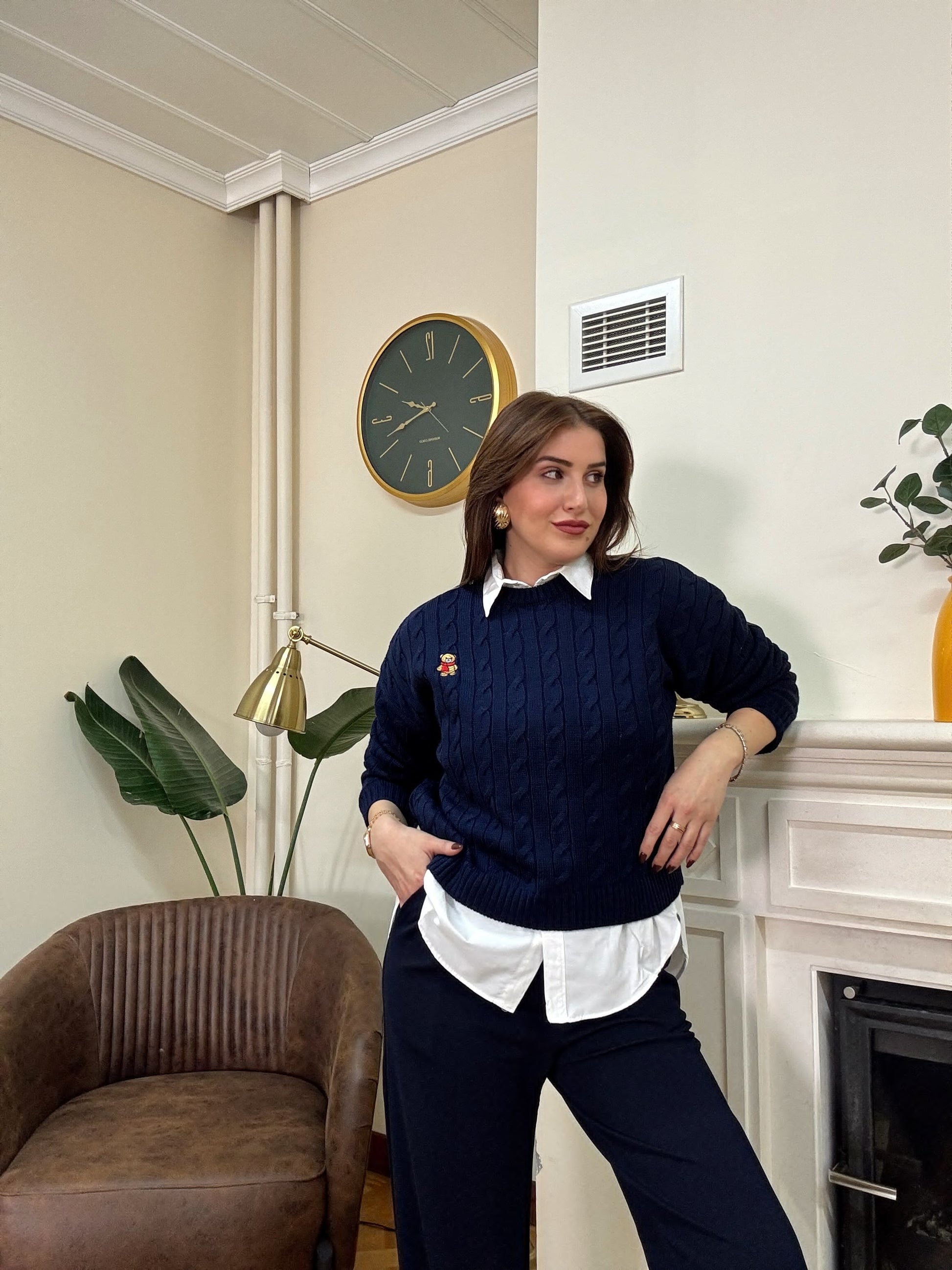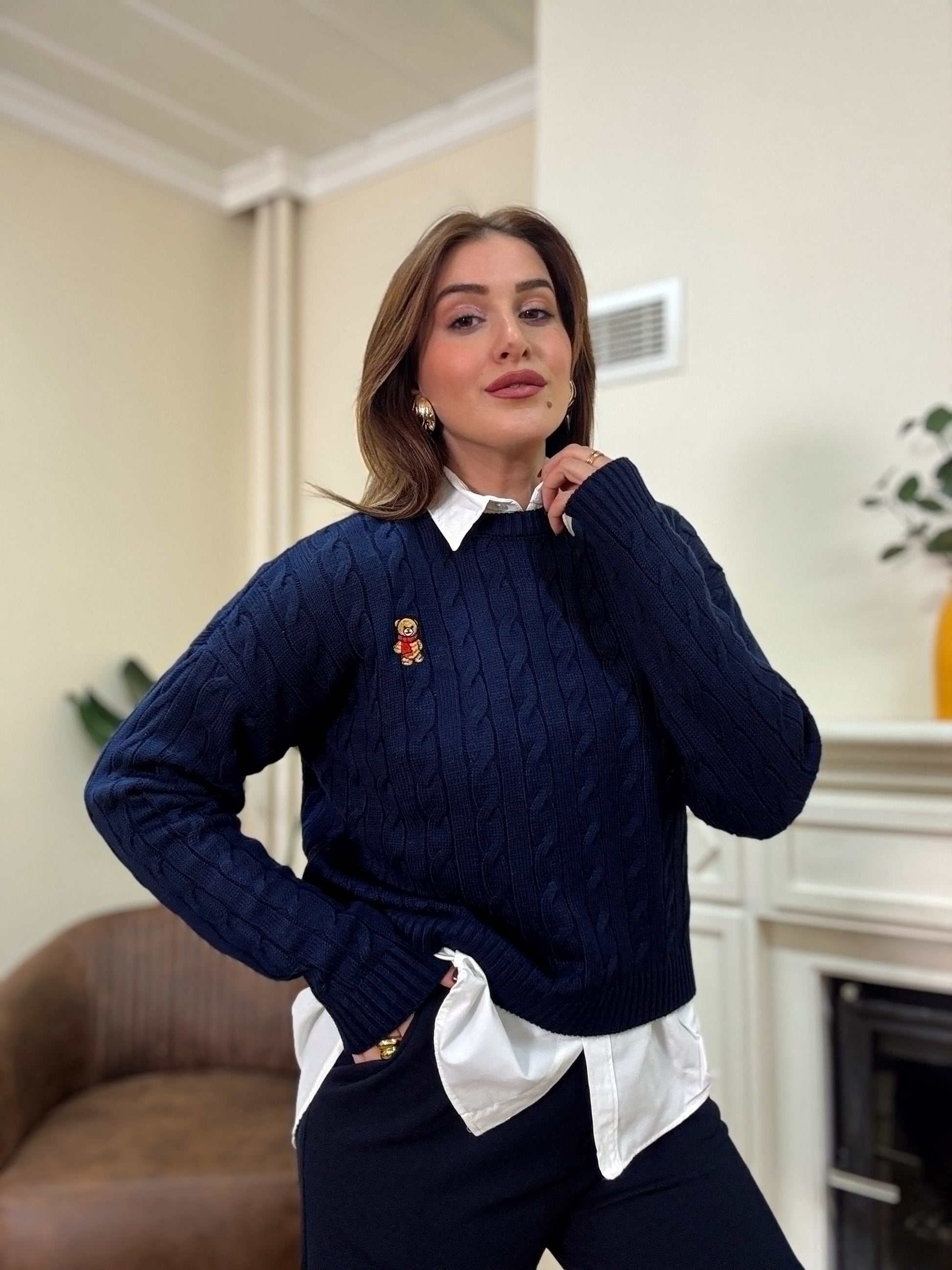 Saç örgü küçük ayıcık işlemeli kazak-LACİVERT