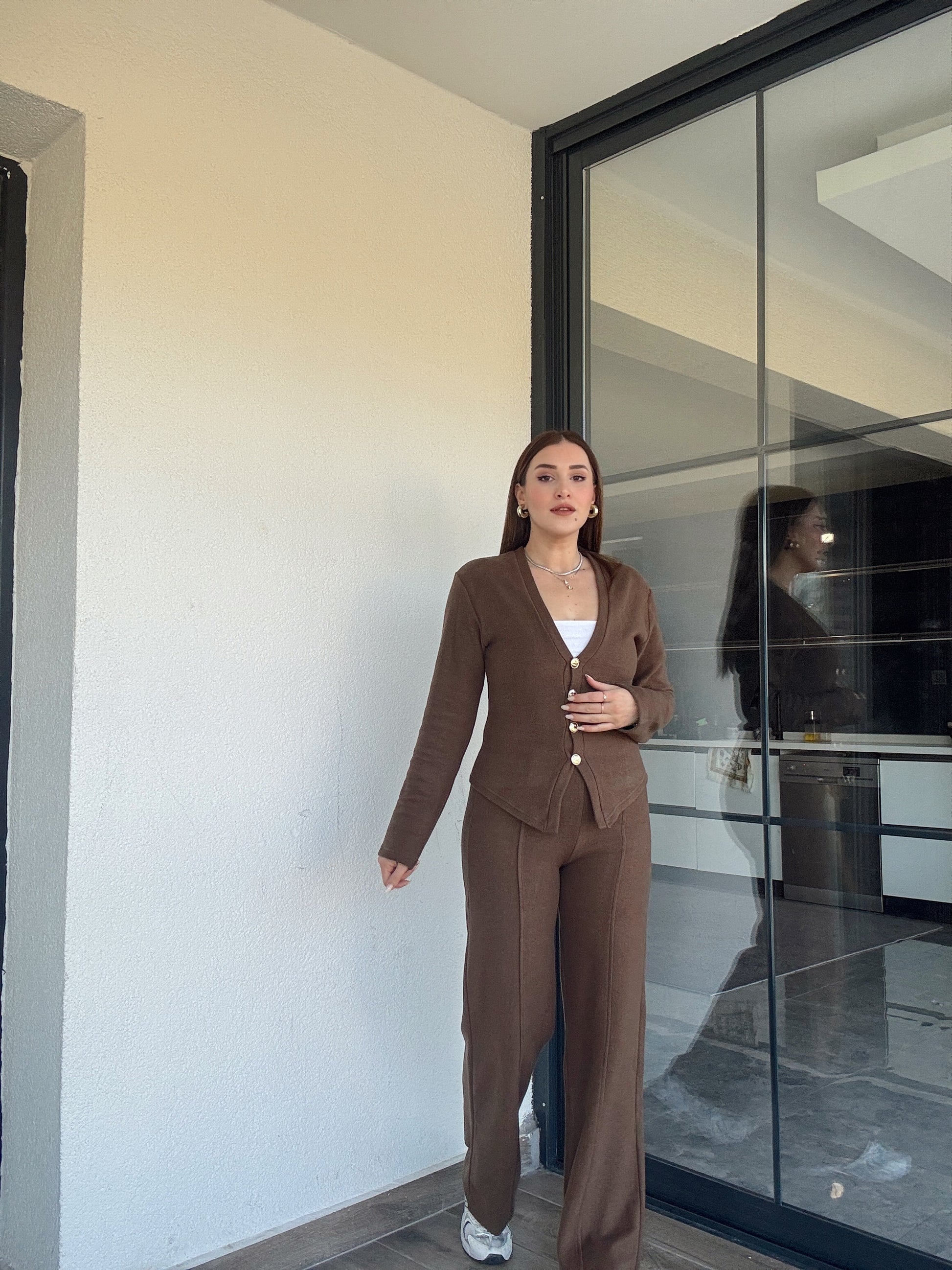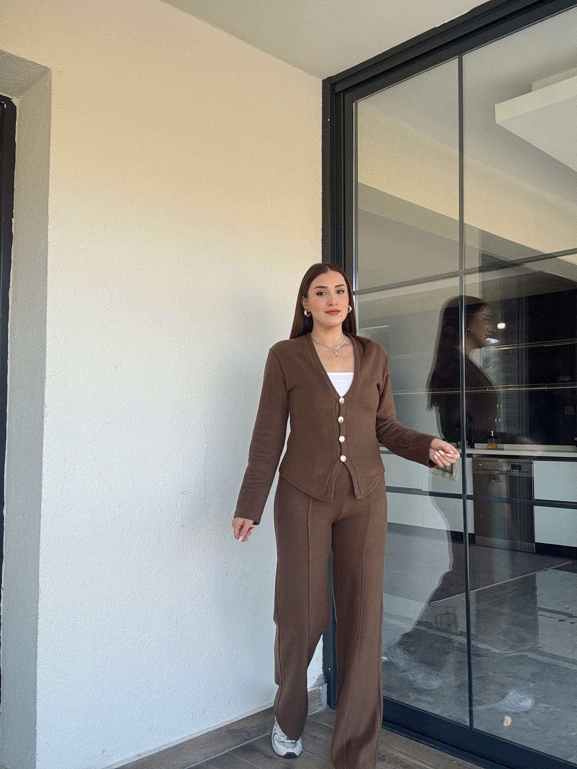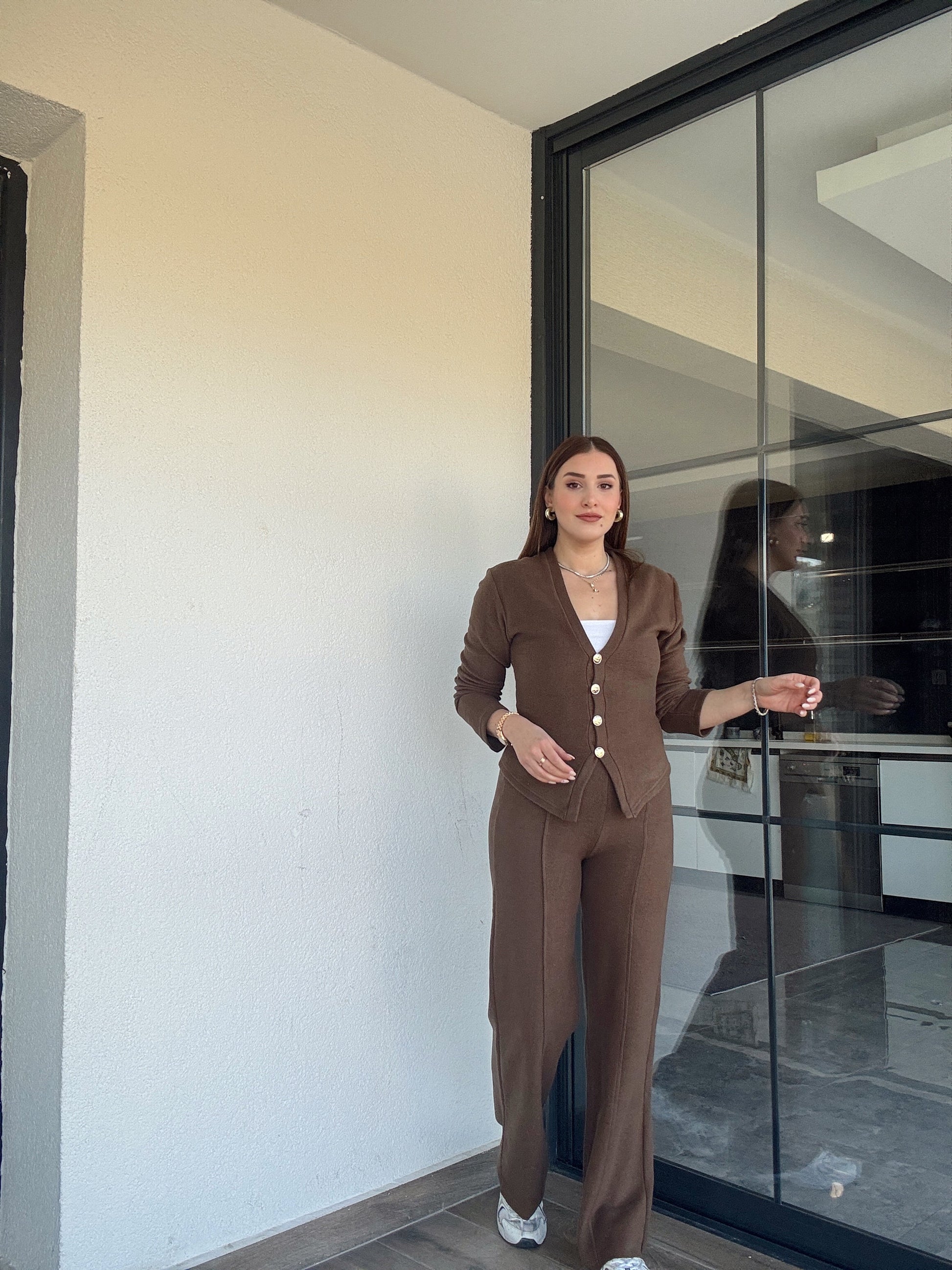 Selanik önü düğmeli ceket çimalı pantolon takım-KAHVERENGİ