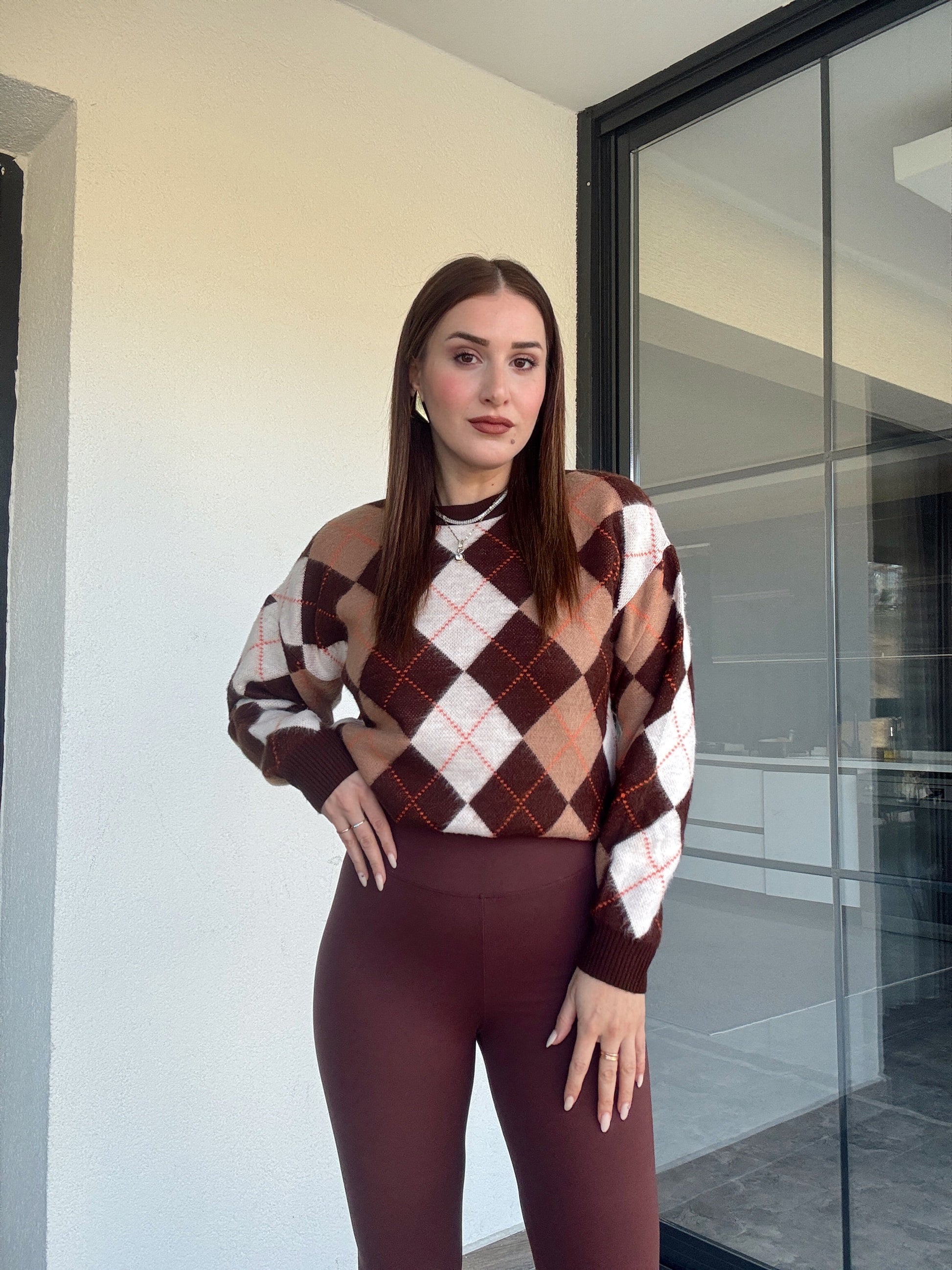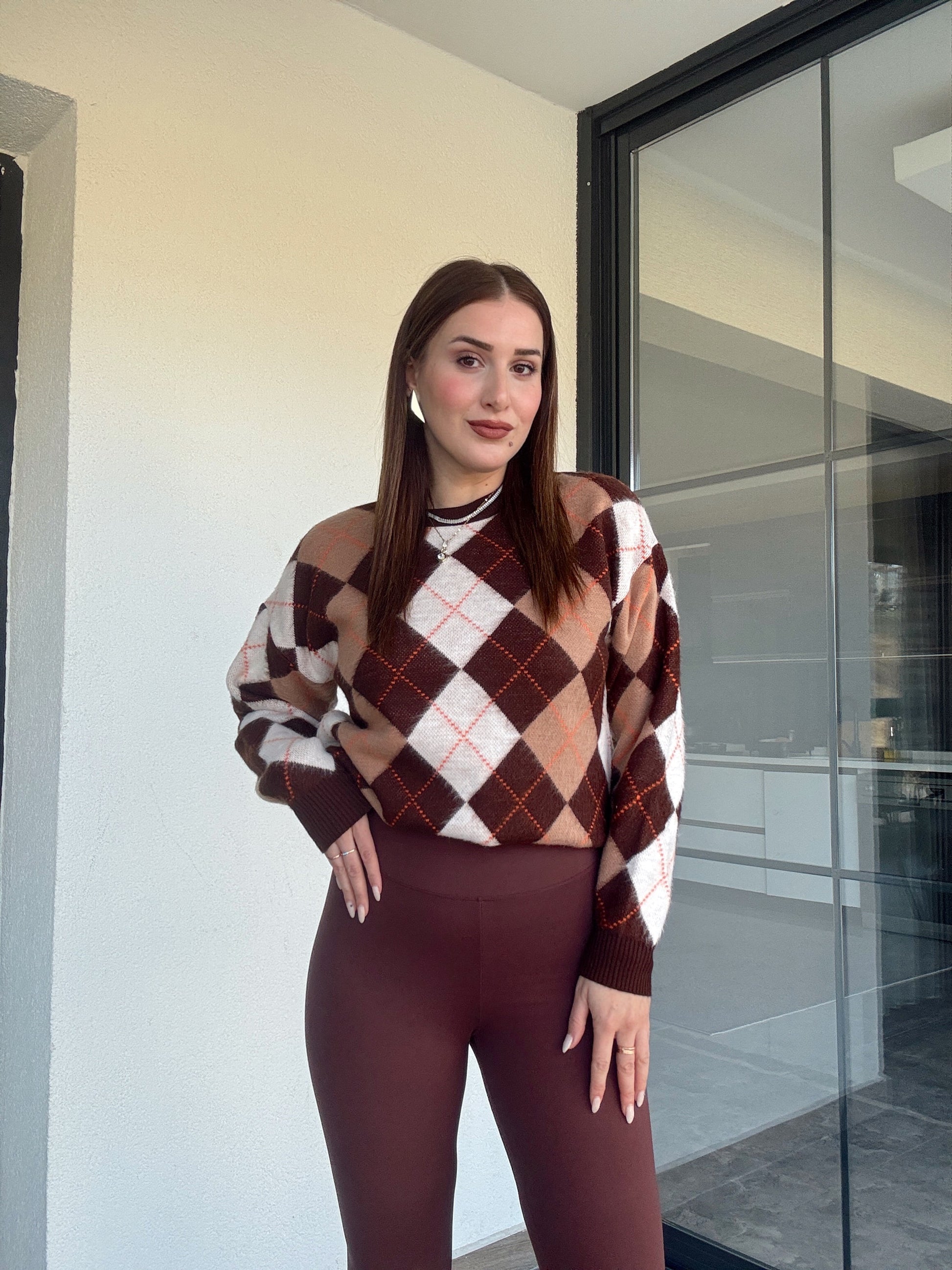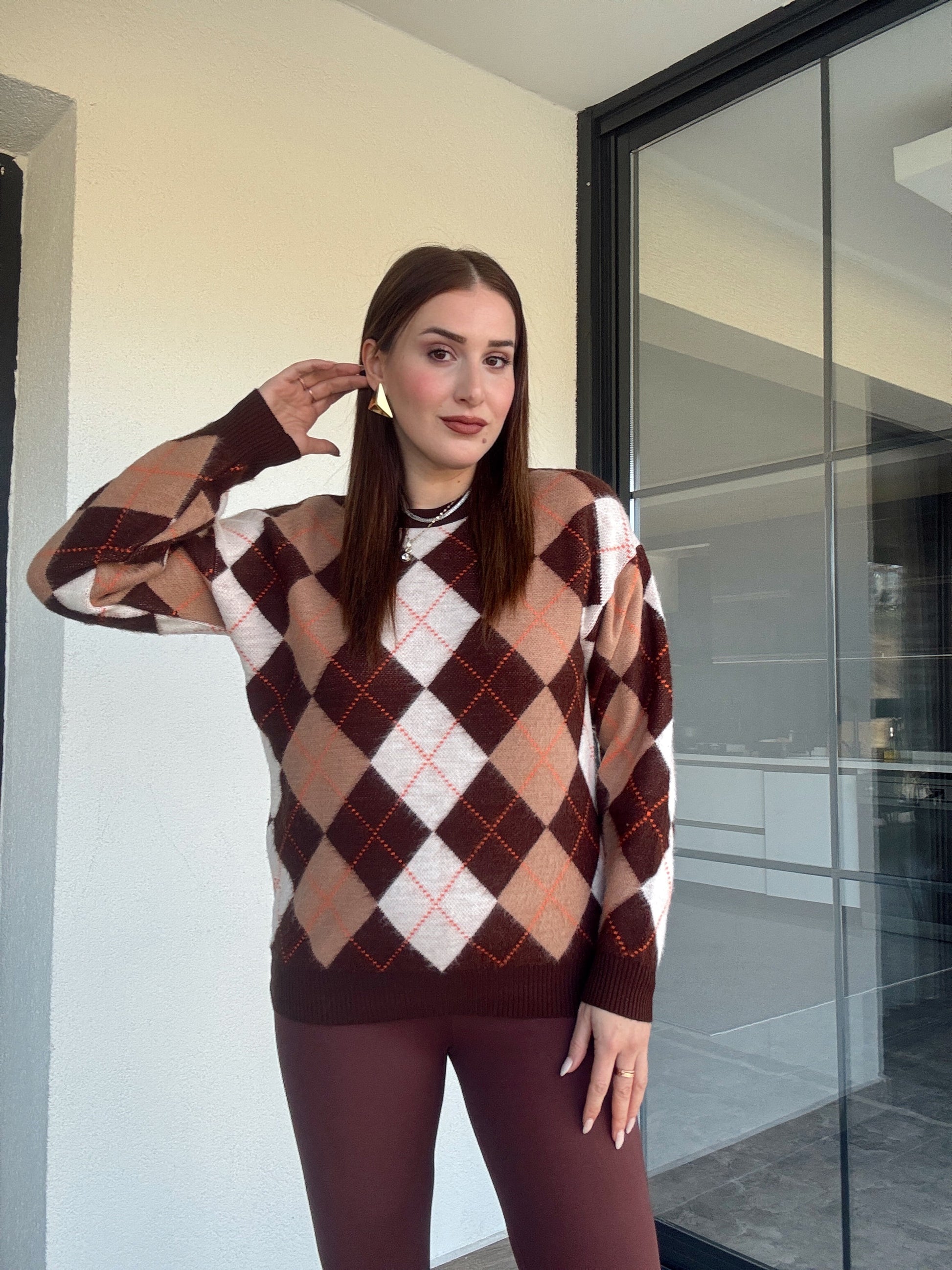 Şerit detaylı baklava desenli kazak-KAHVERENGİ