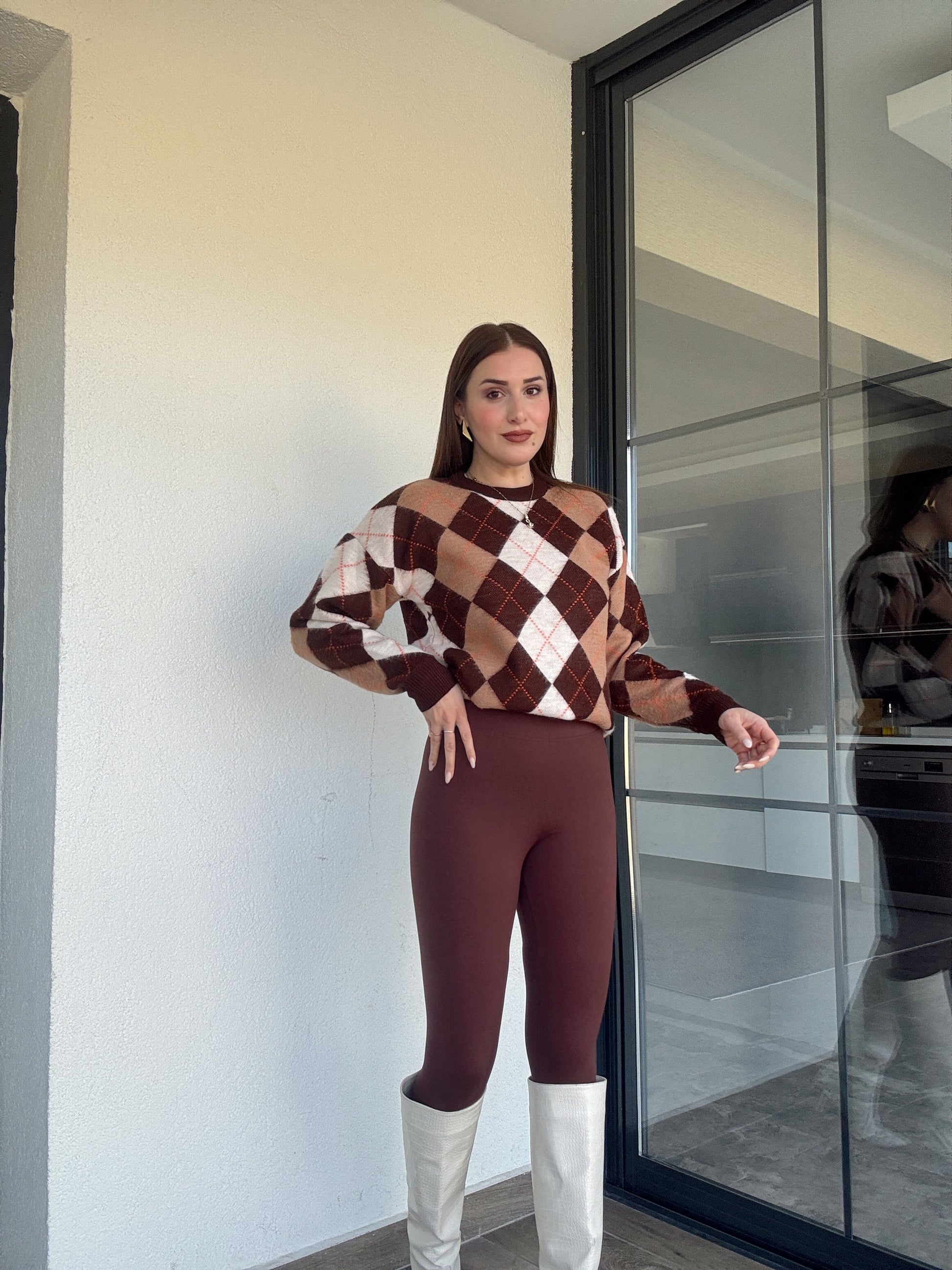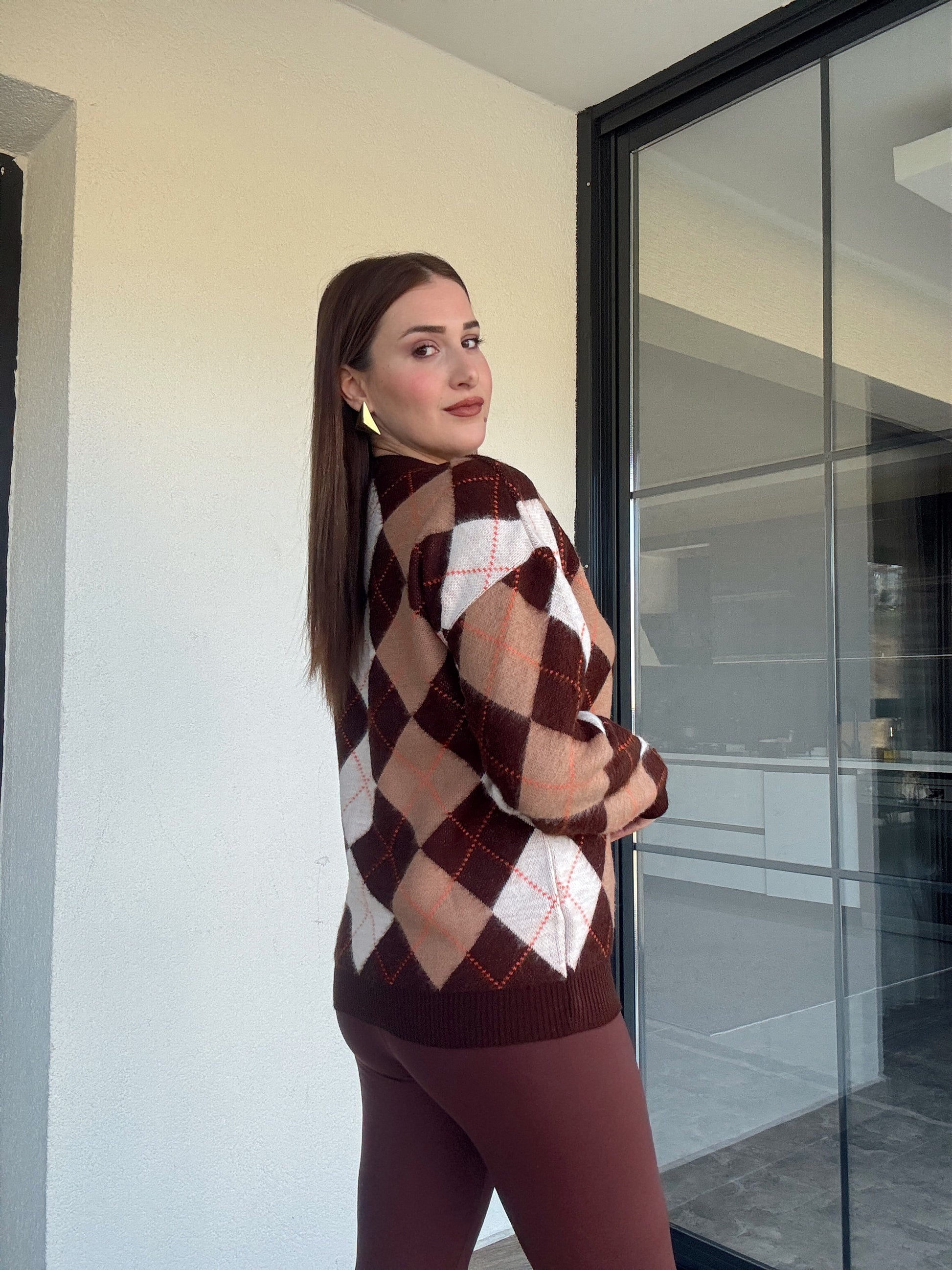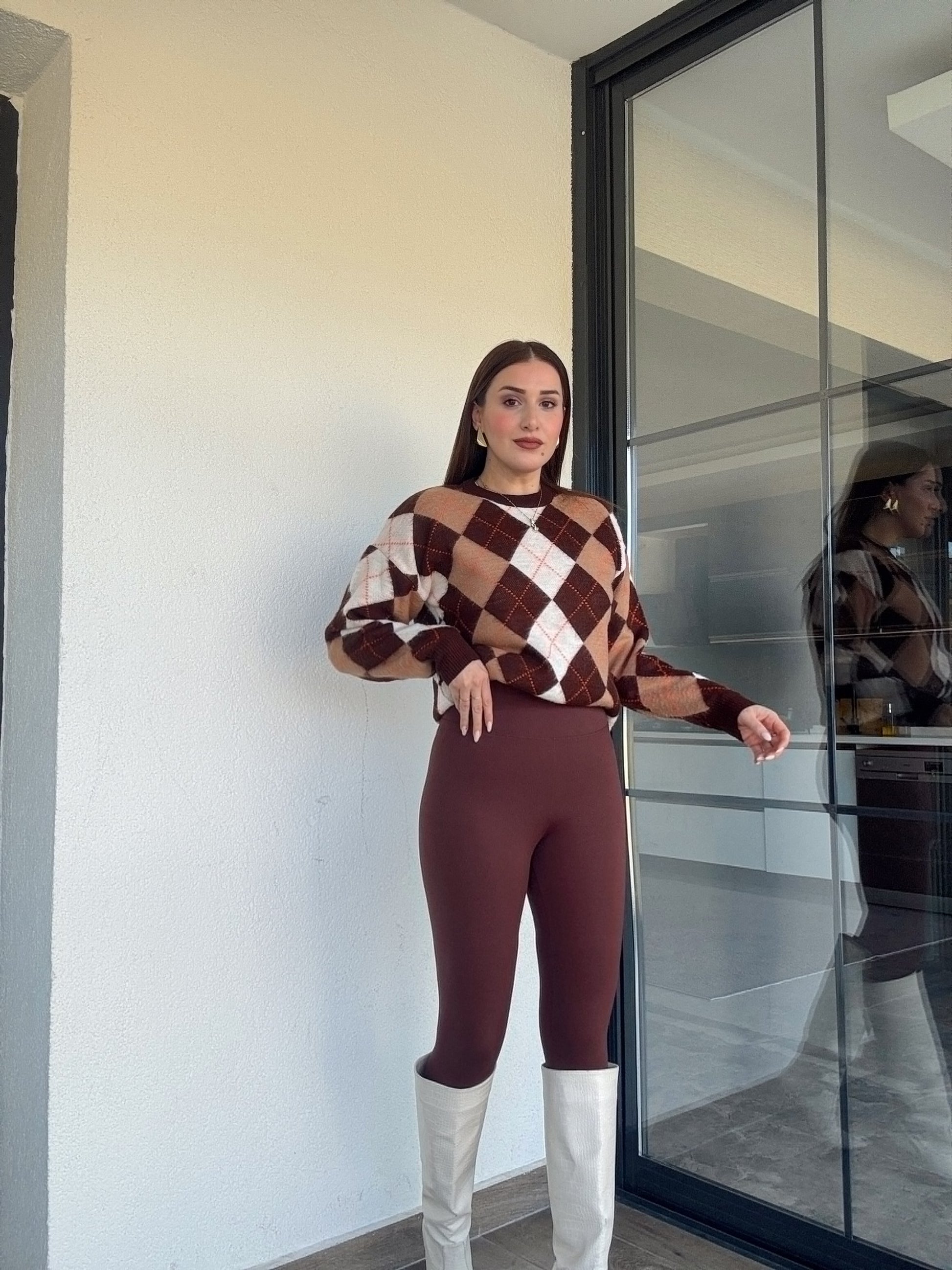 Şerit detaylı baklava desenli kazak-KAHVERENGİ