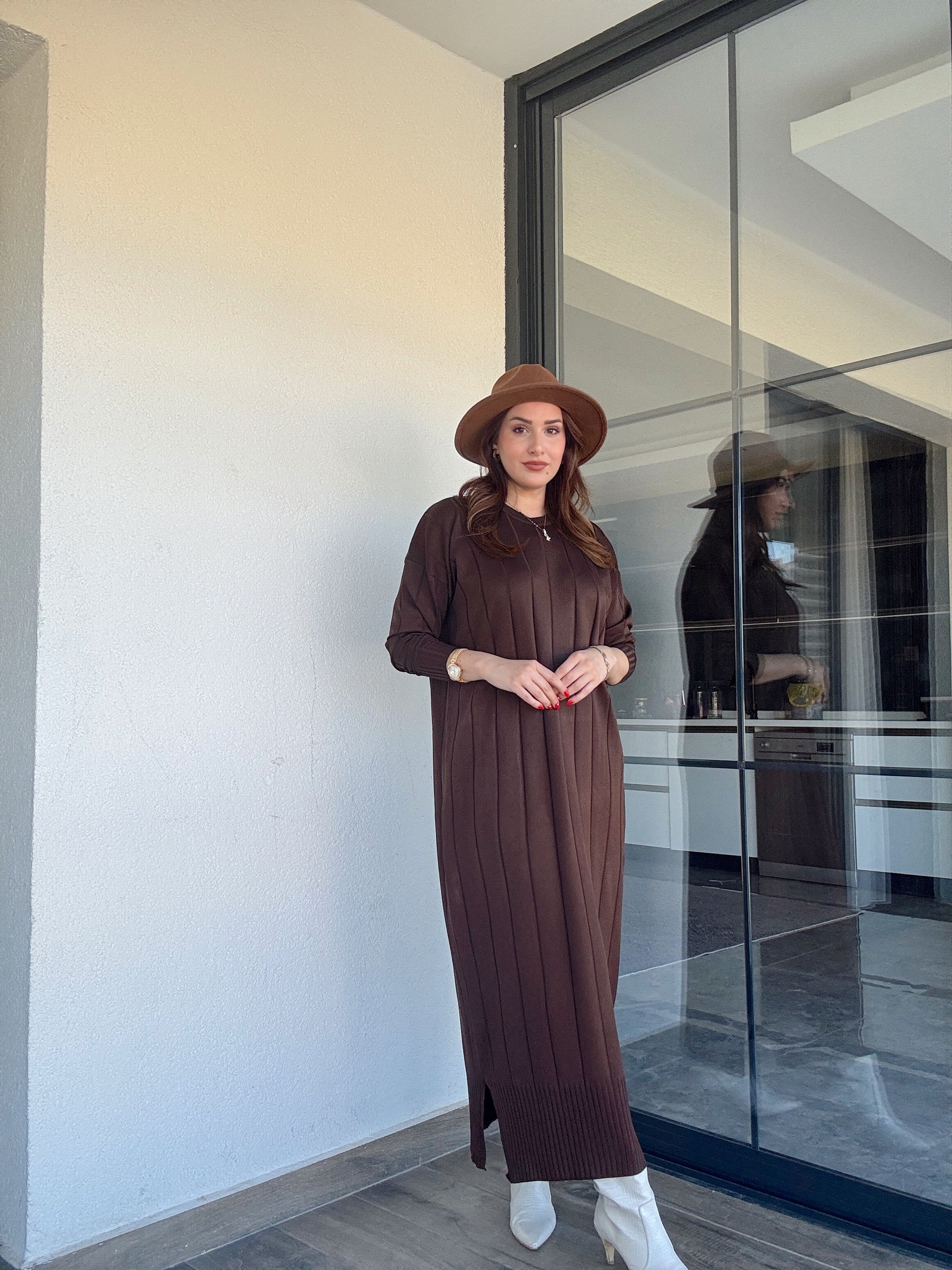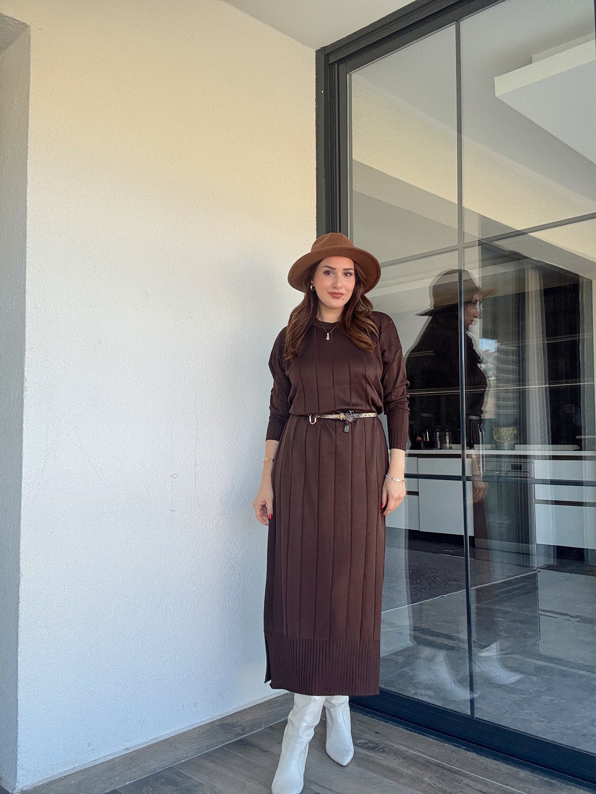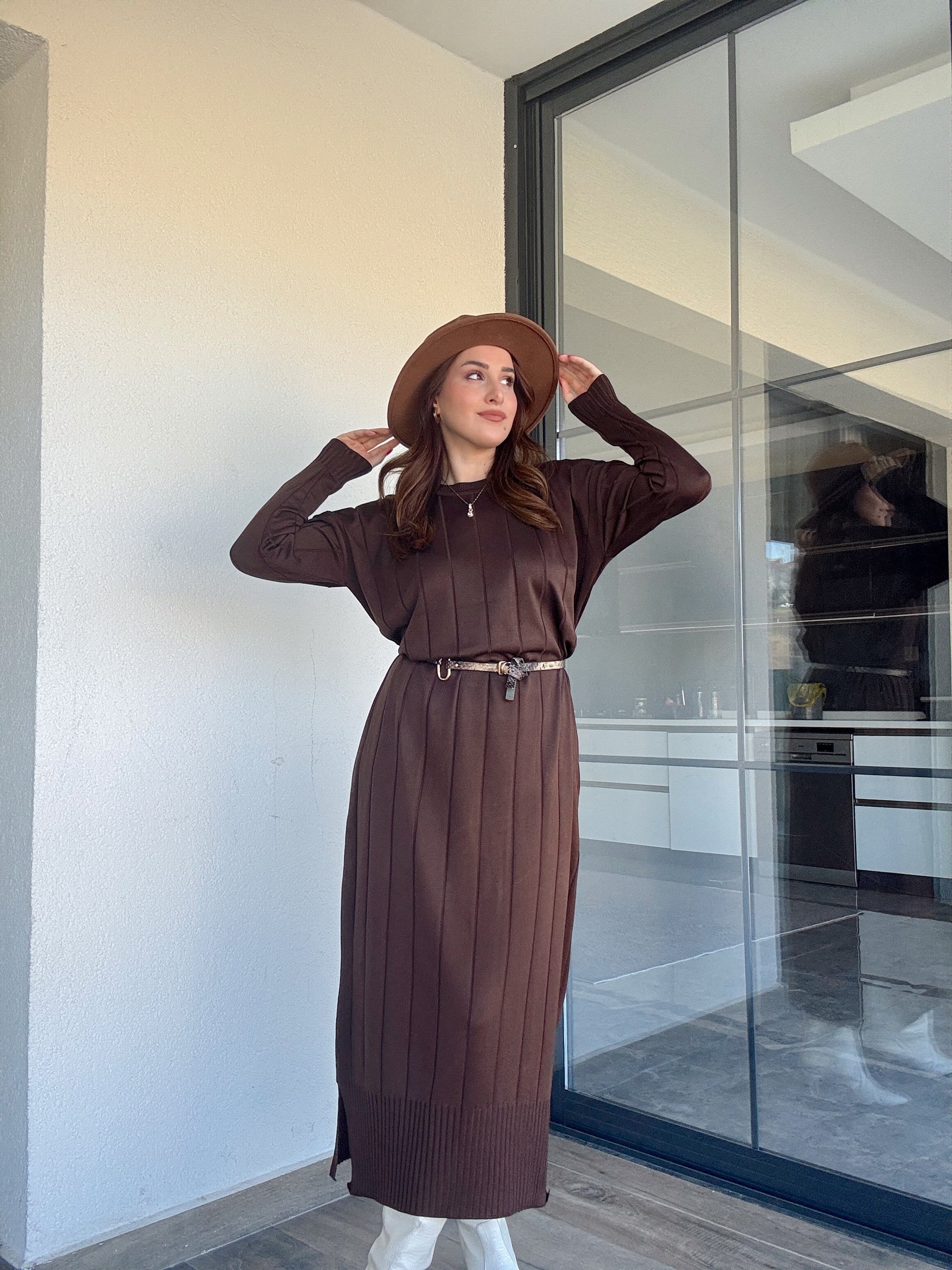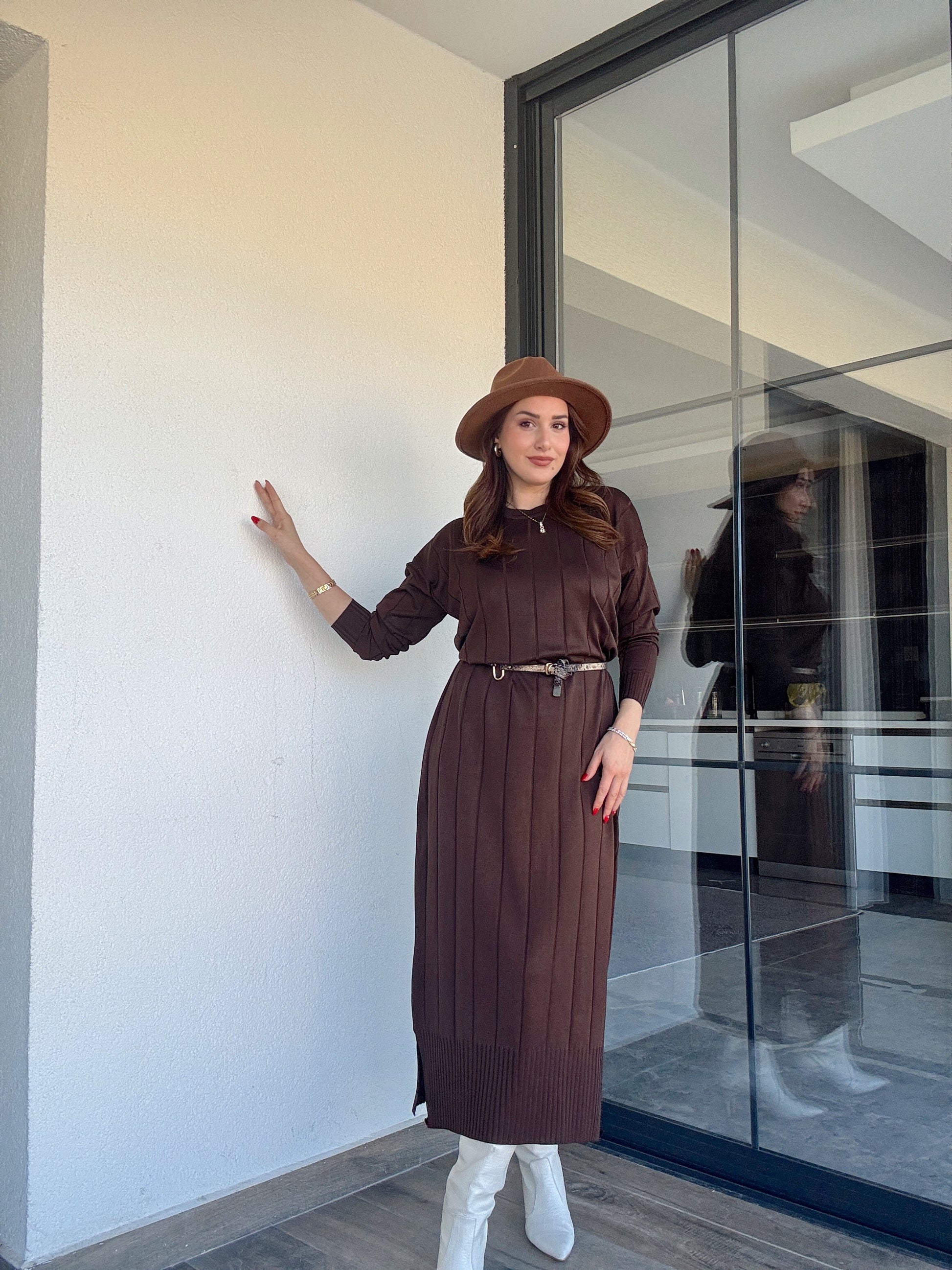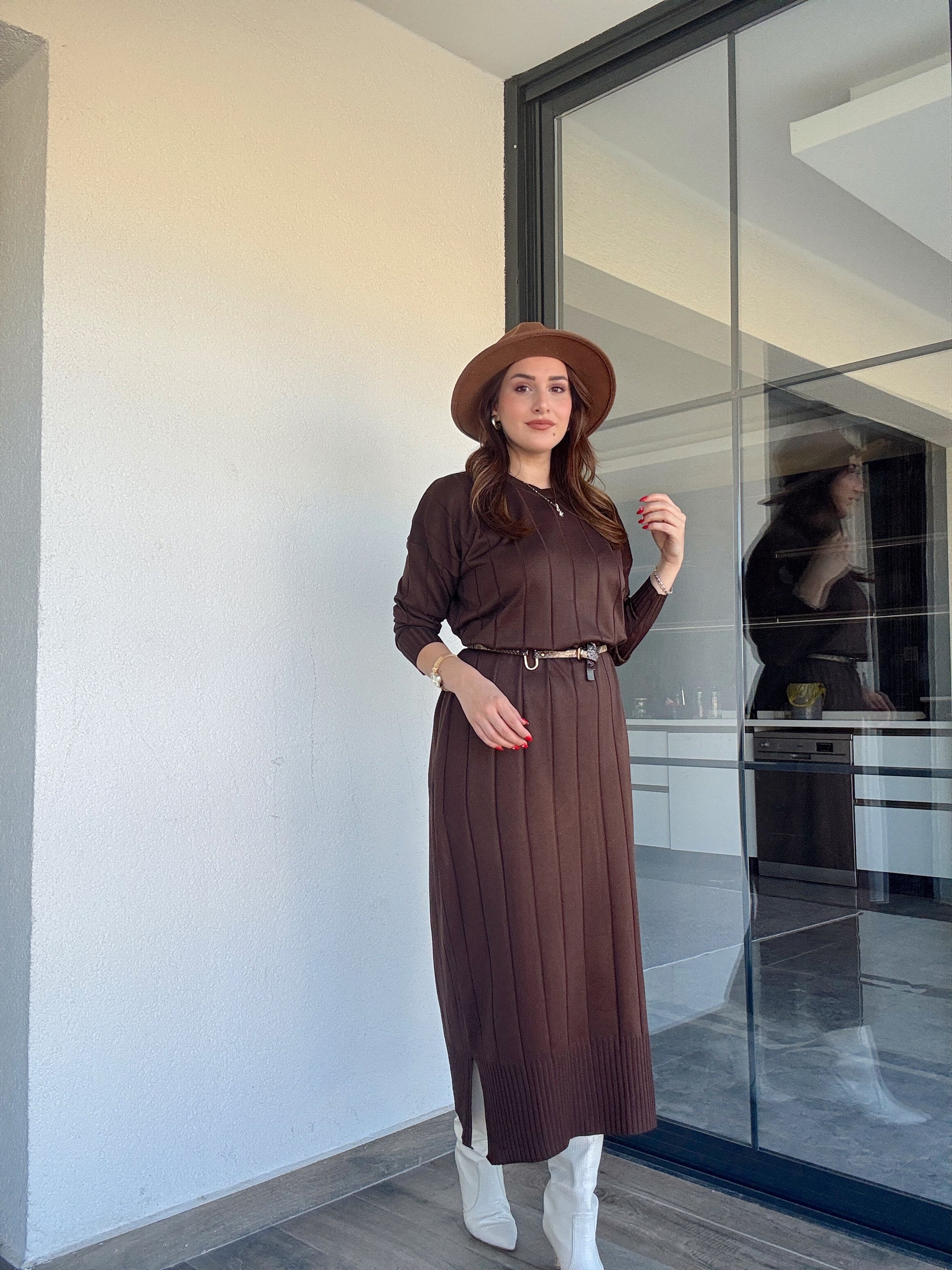 Şerit detaylı uzun triko elbise KAHVERENGİ