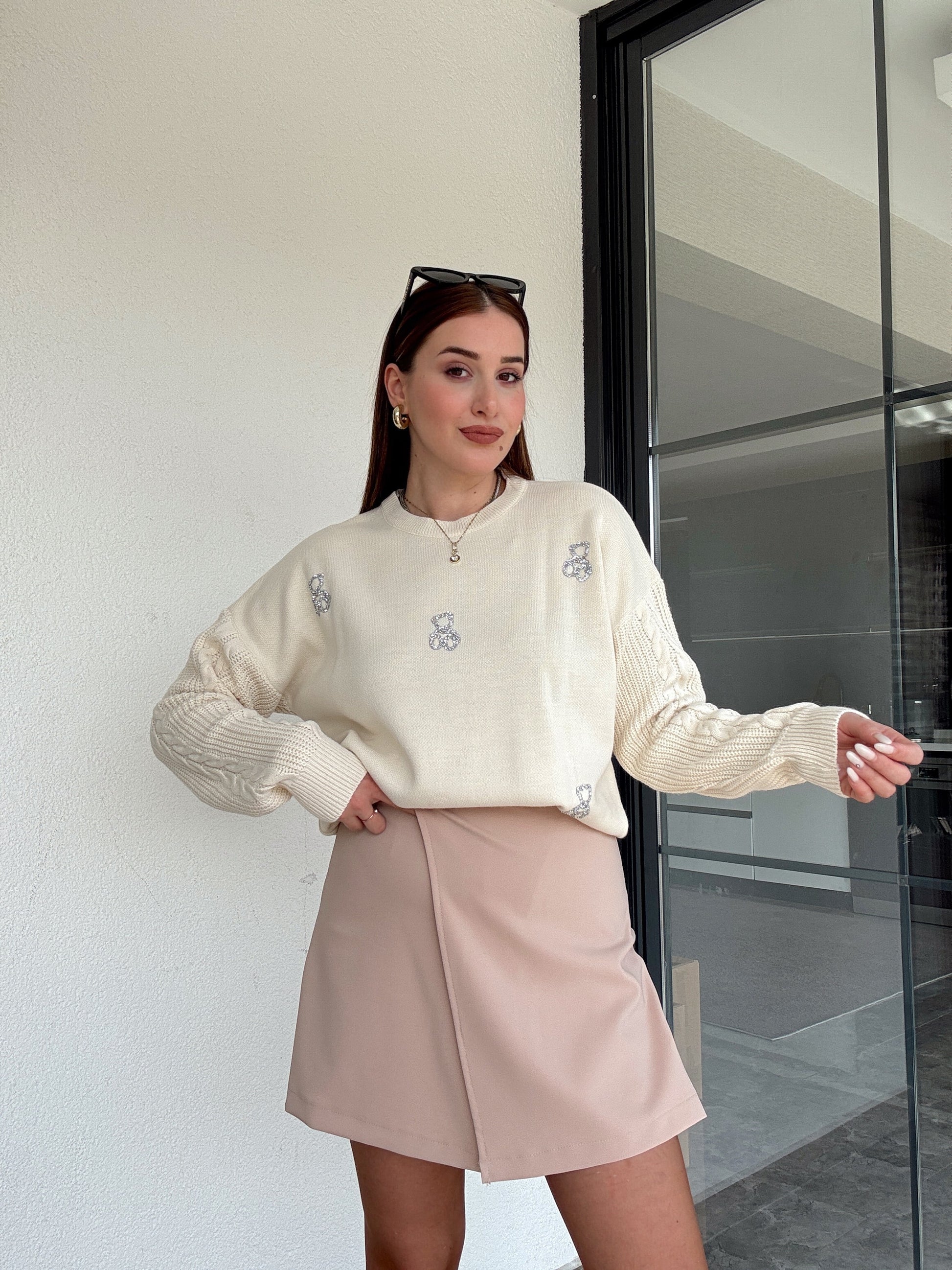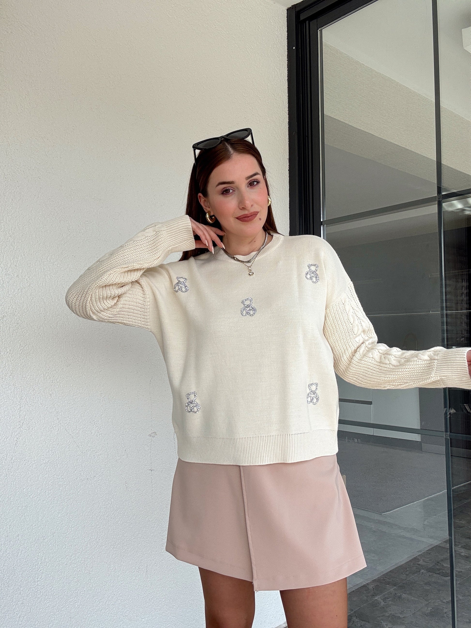 Taş işlemeli ayıcıklı kazak BEJ