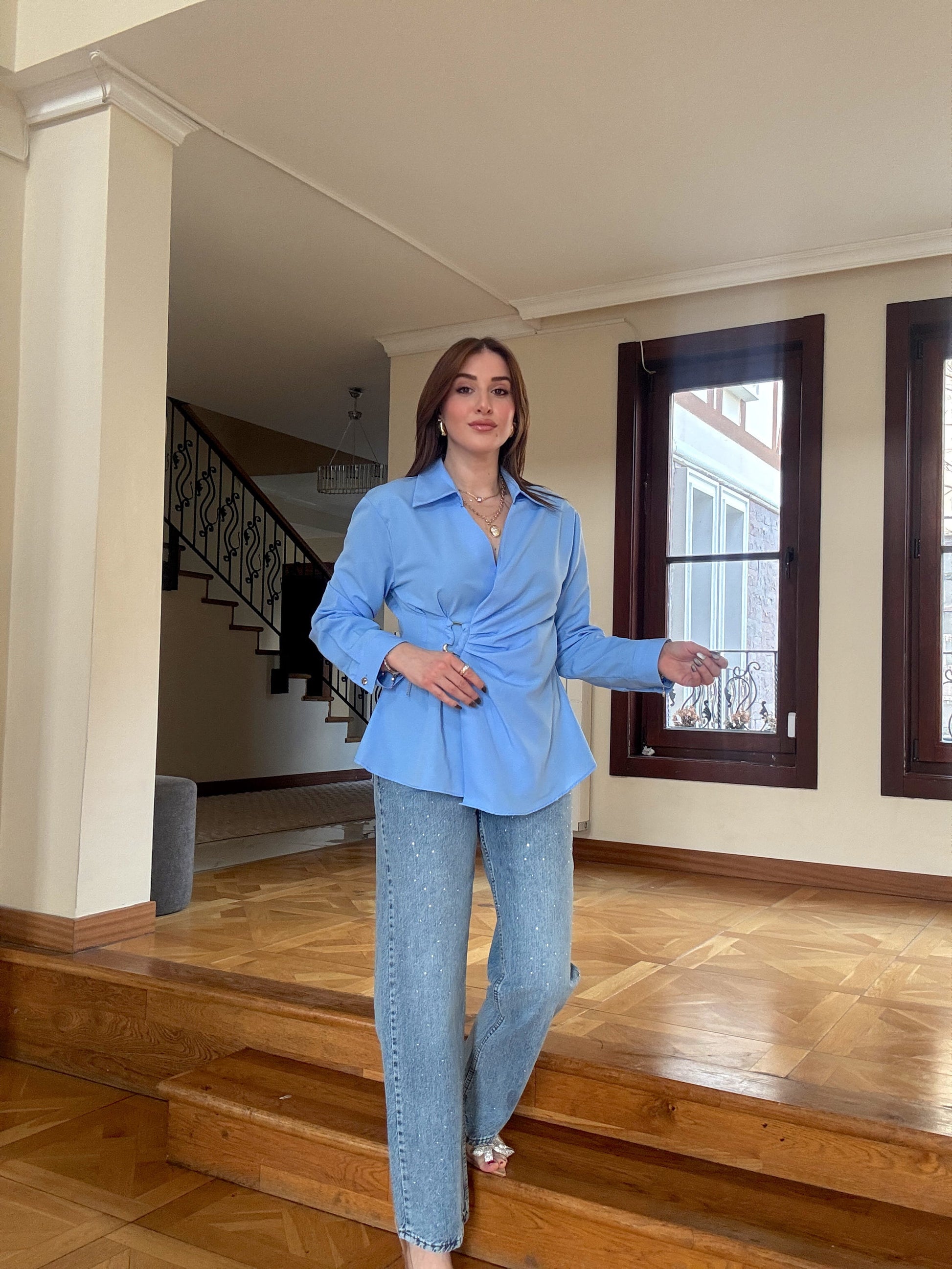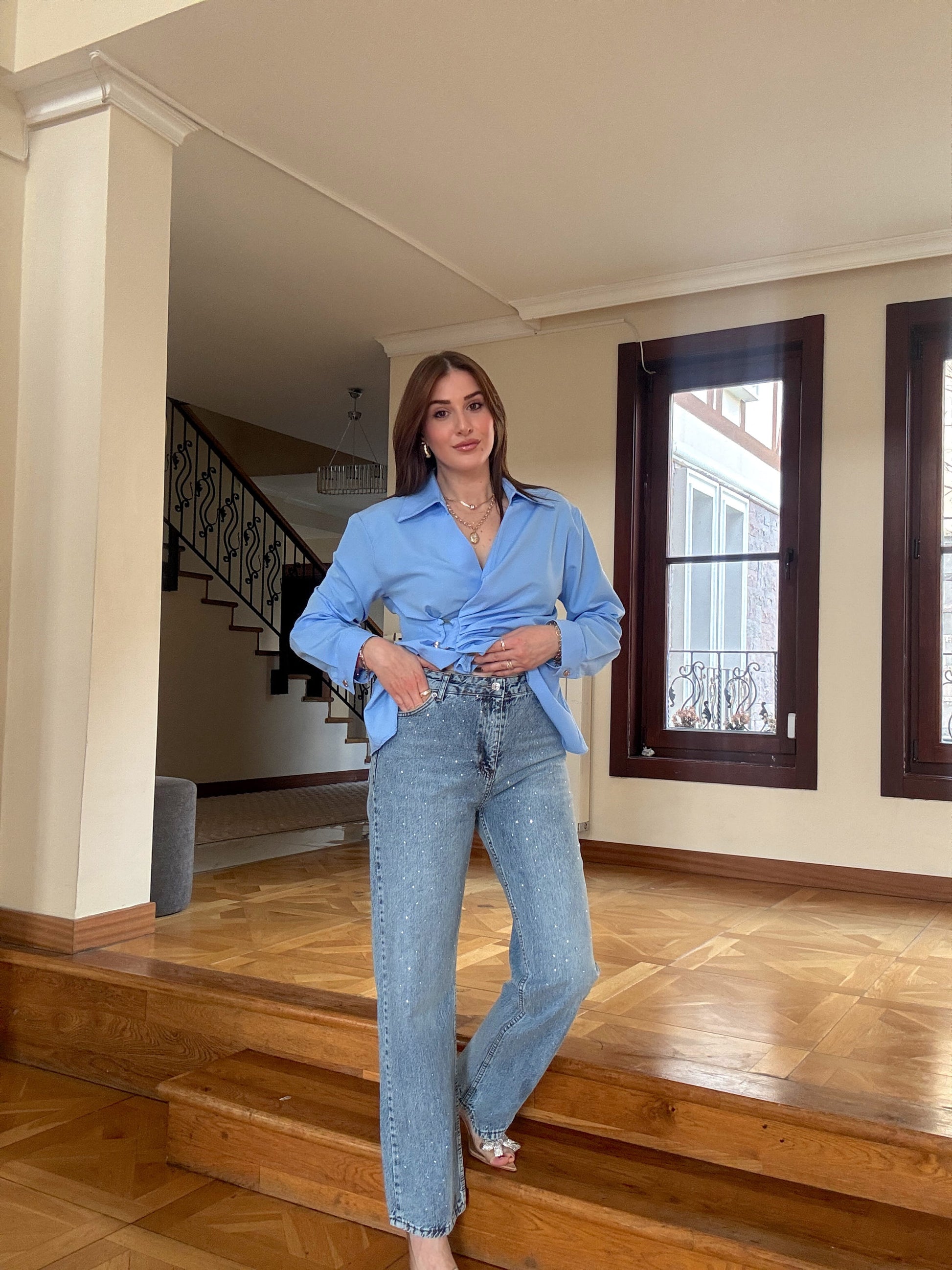 Taşlı Palazzo Jean Pantolon Mavi