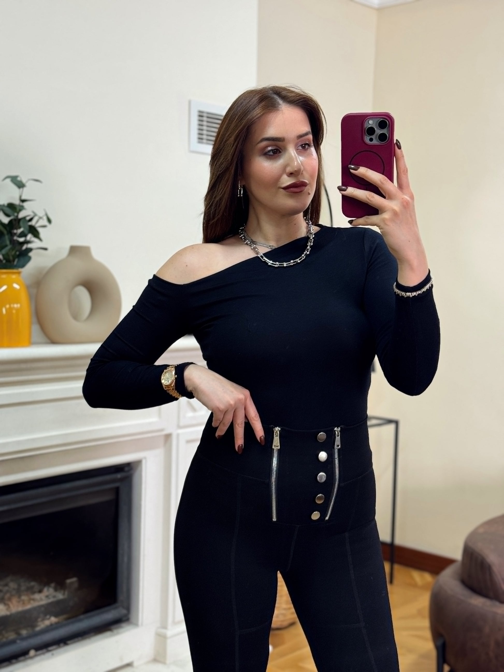 Tek omuz kayık yaka uzun kol badi-SİYAH