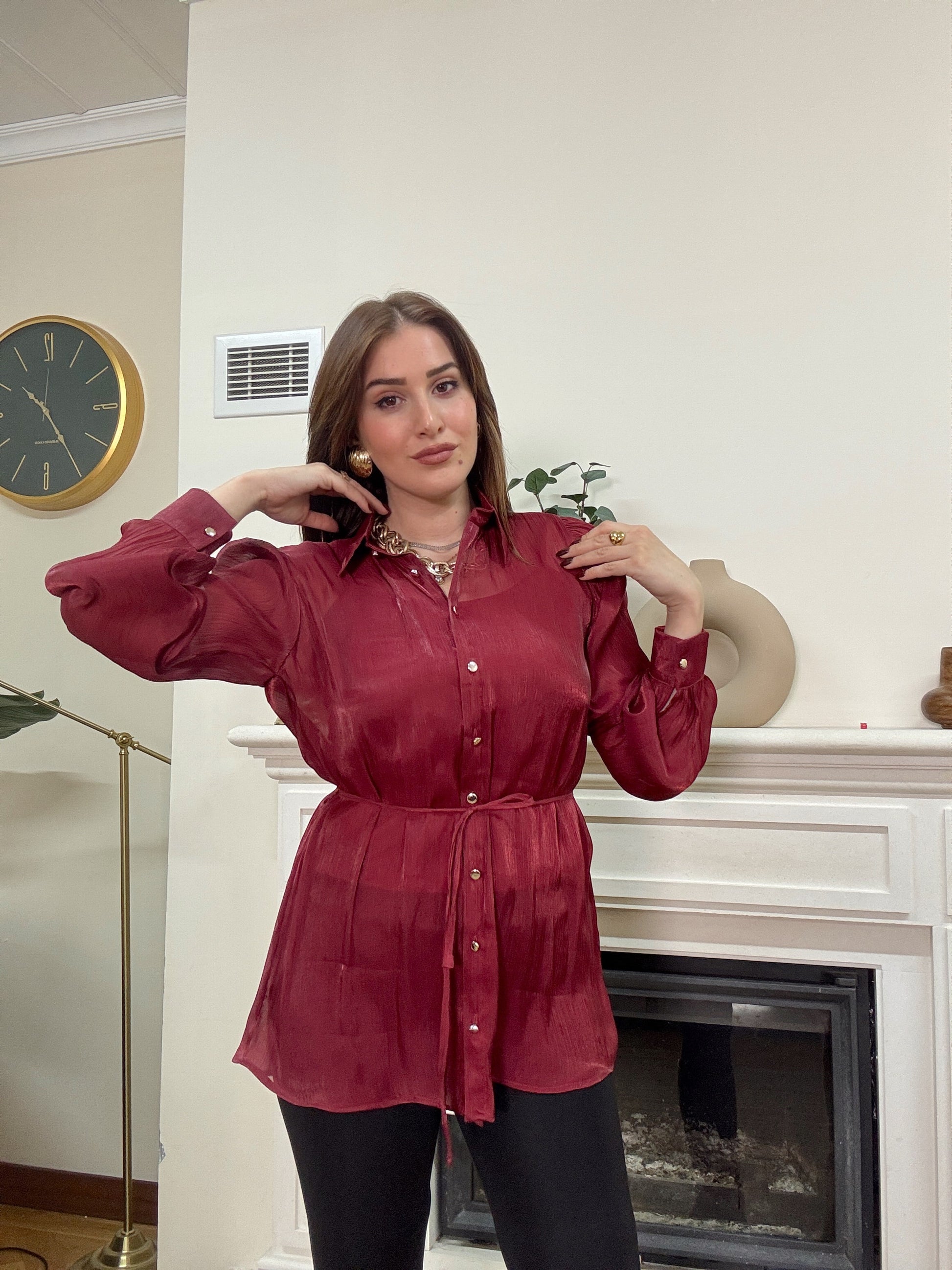 Transparan içi atletli kemerli gömlek BORDO