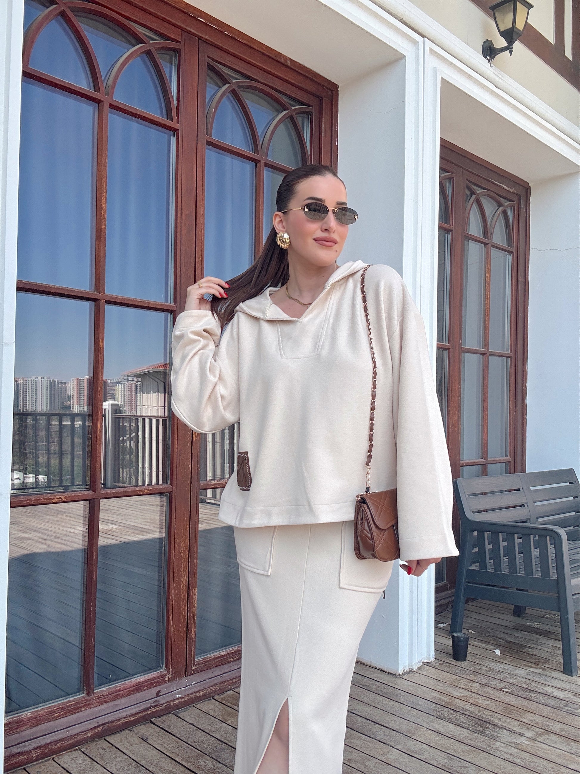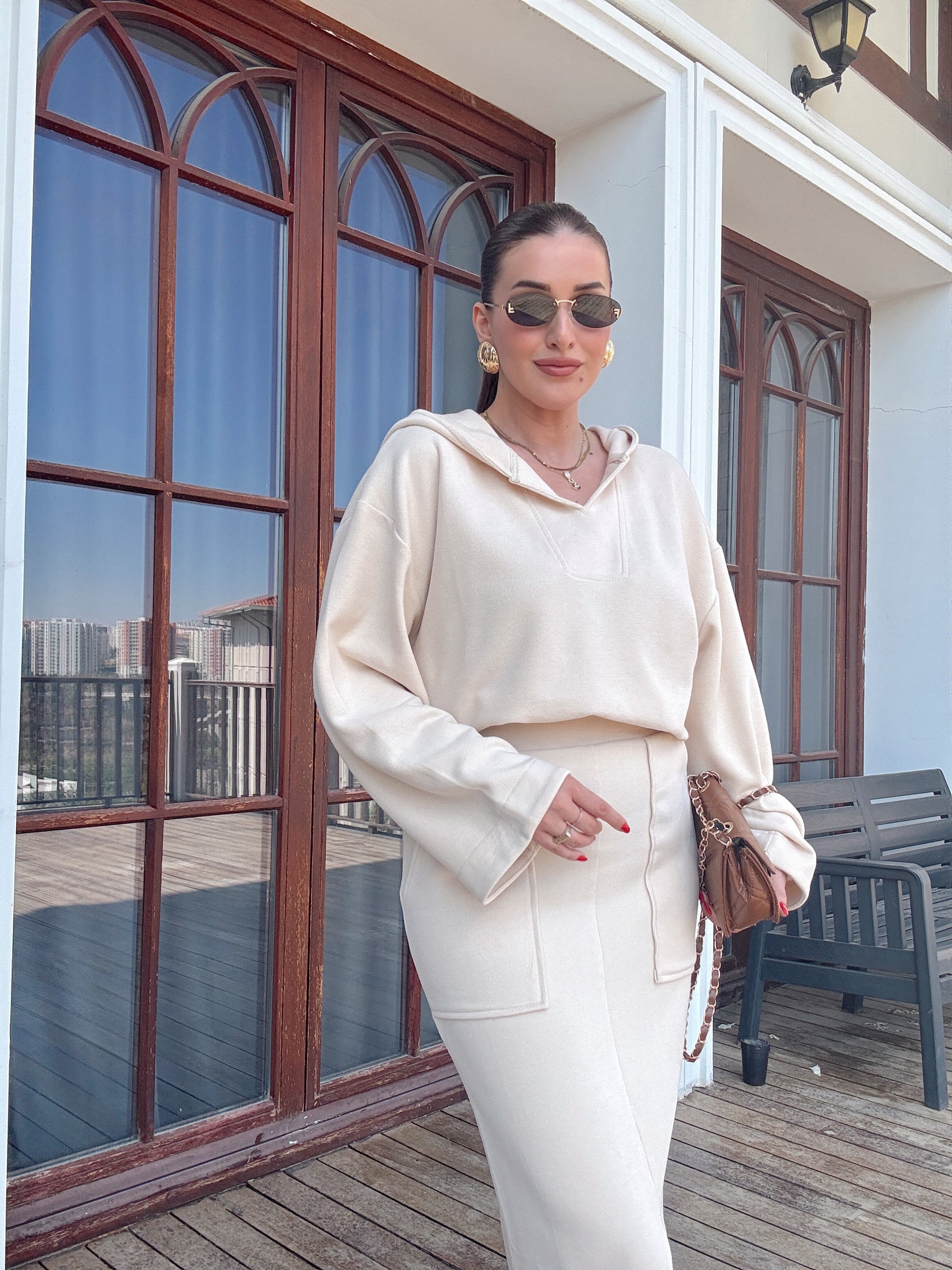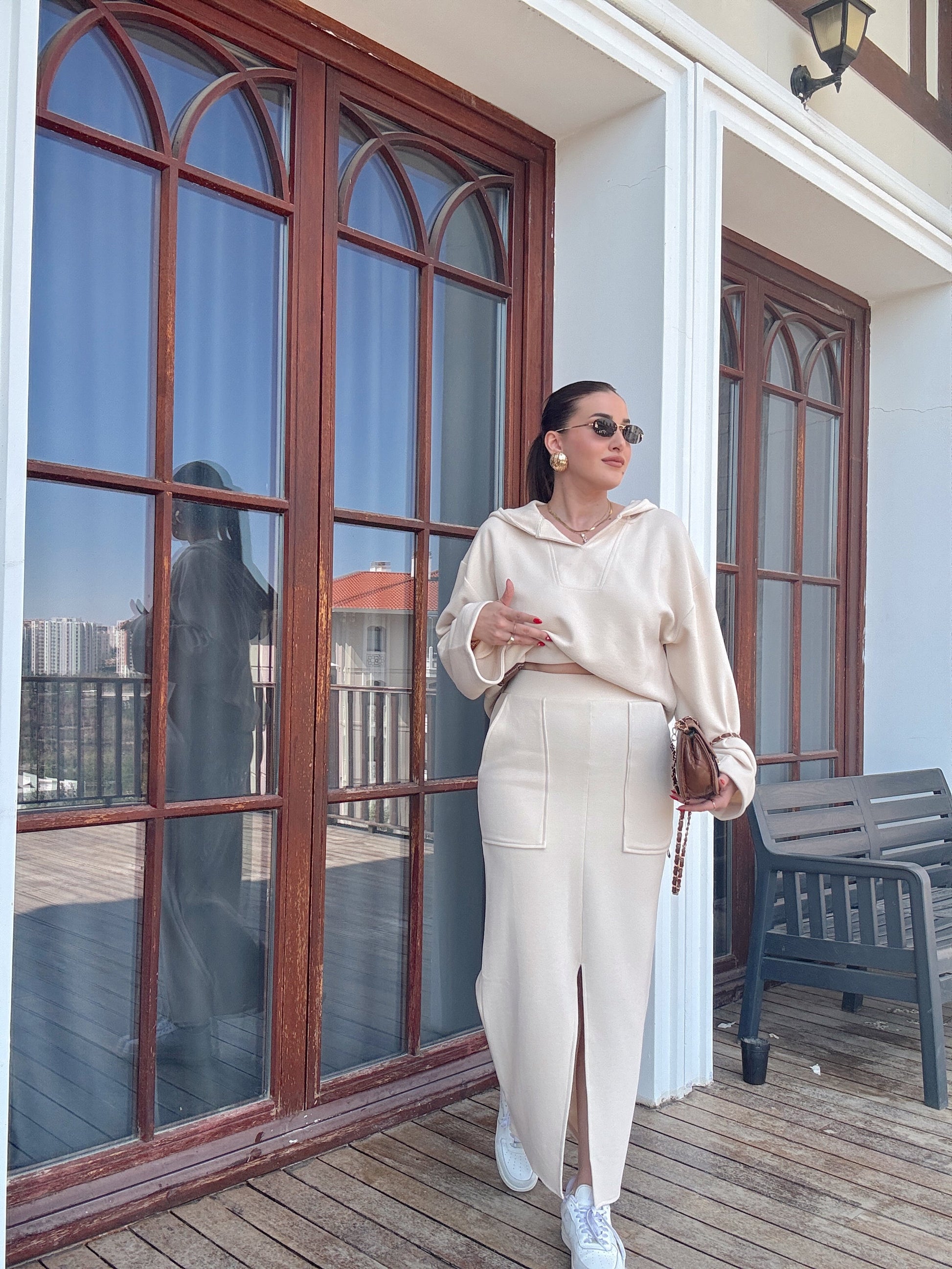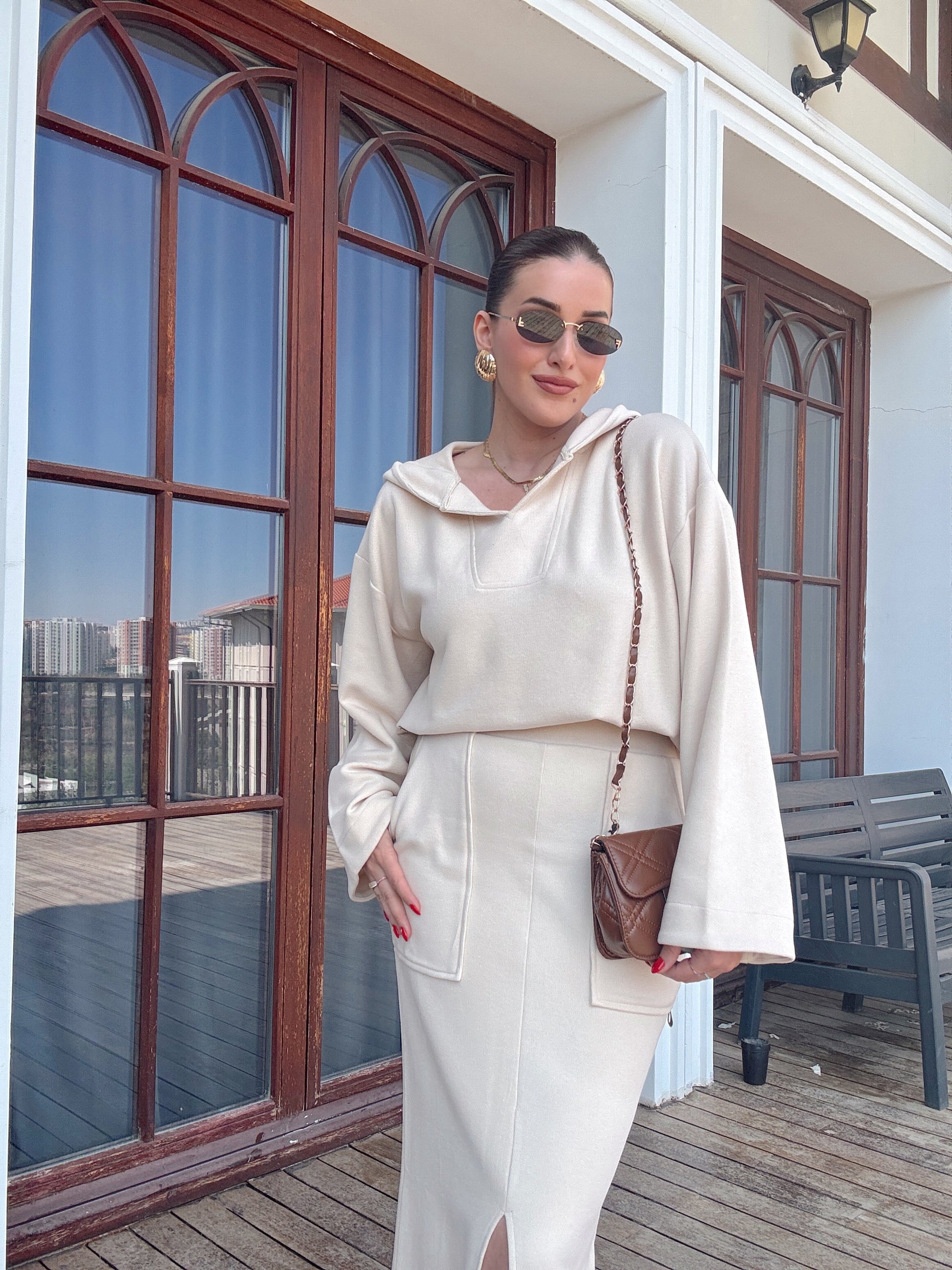 V yaka Kapüşonlu Yırtmaçlı etek takım bej