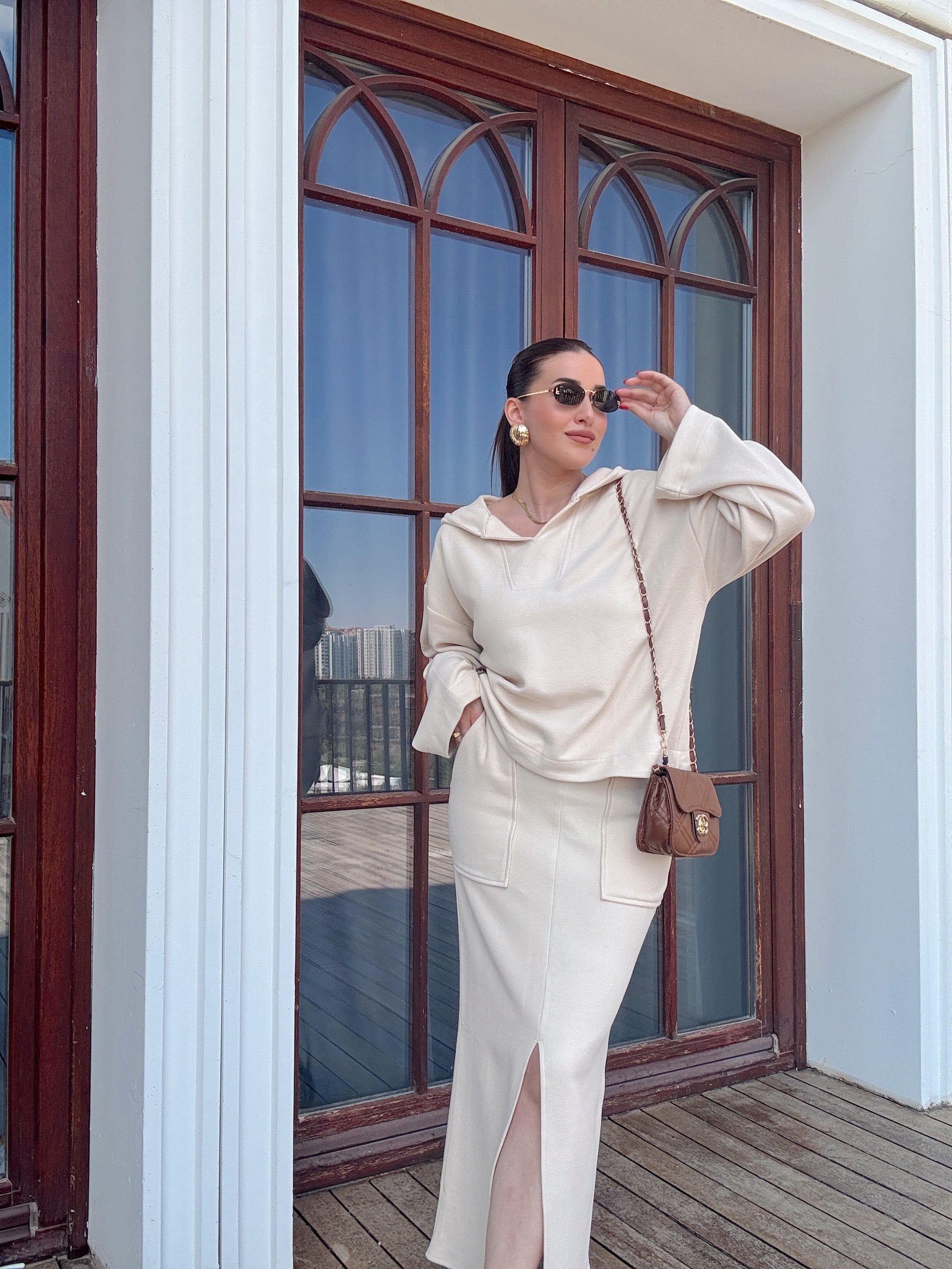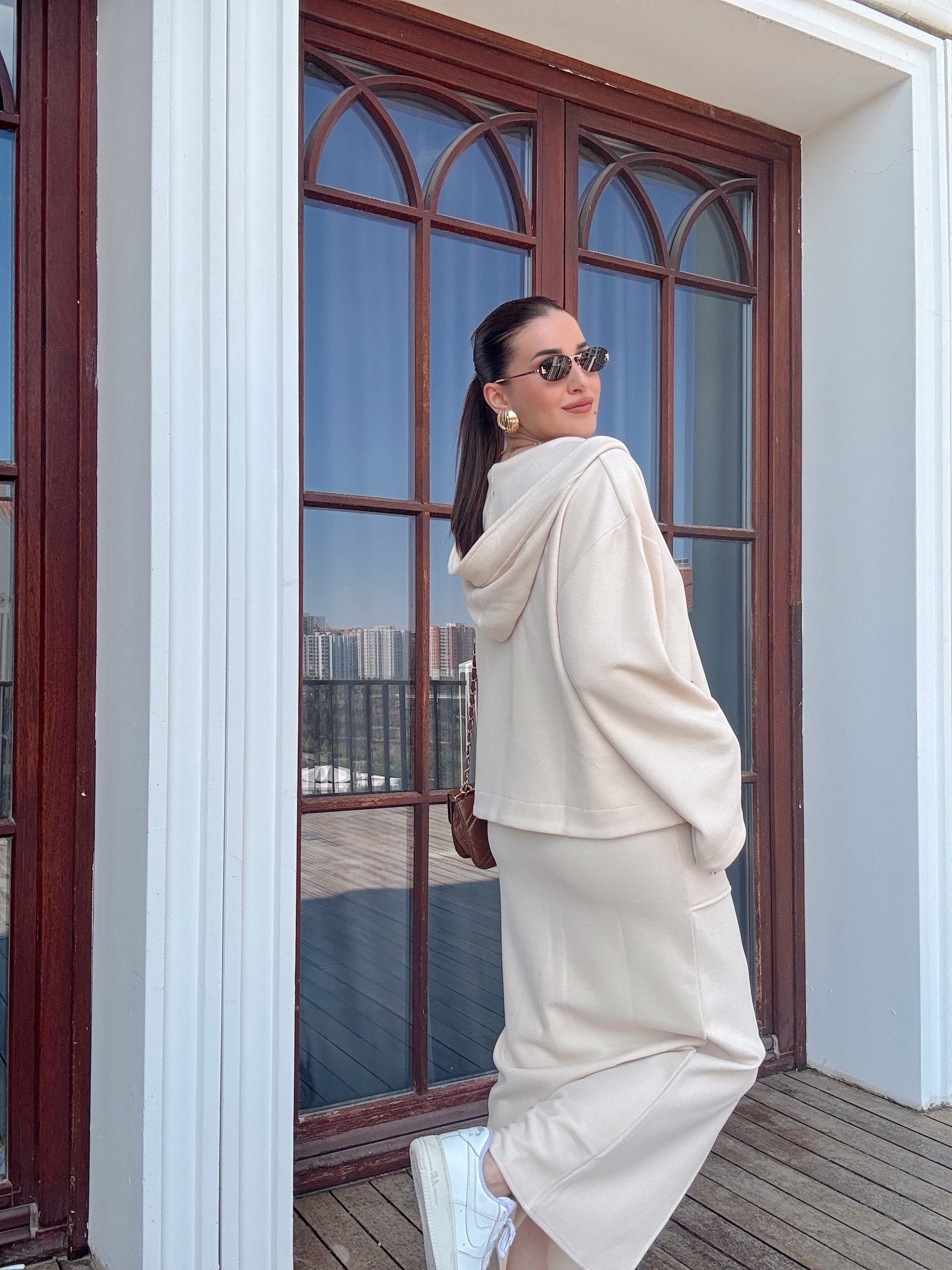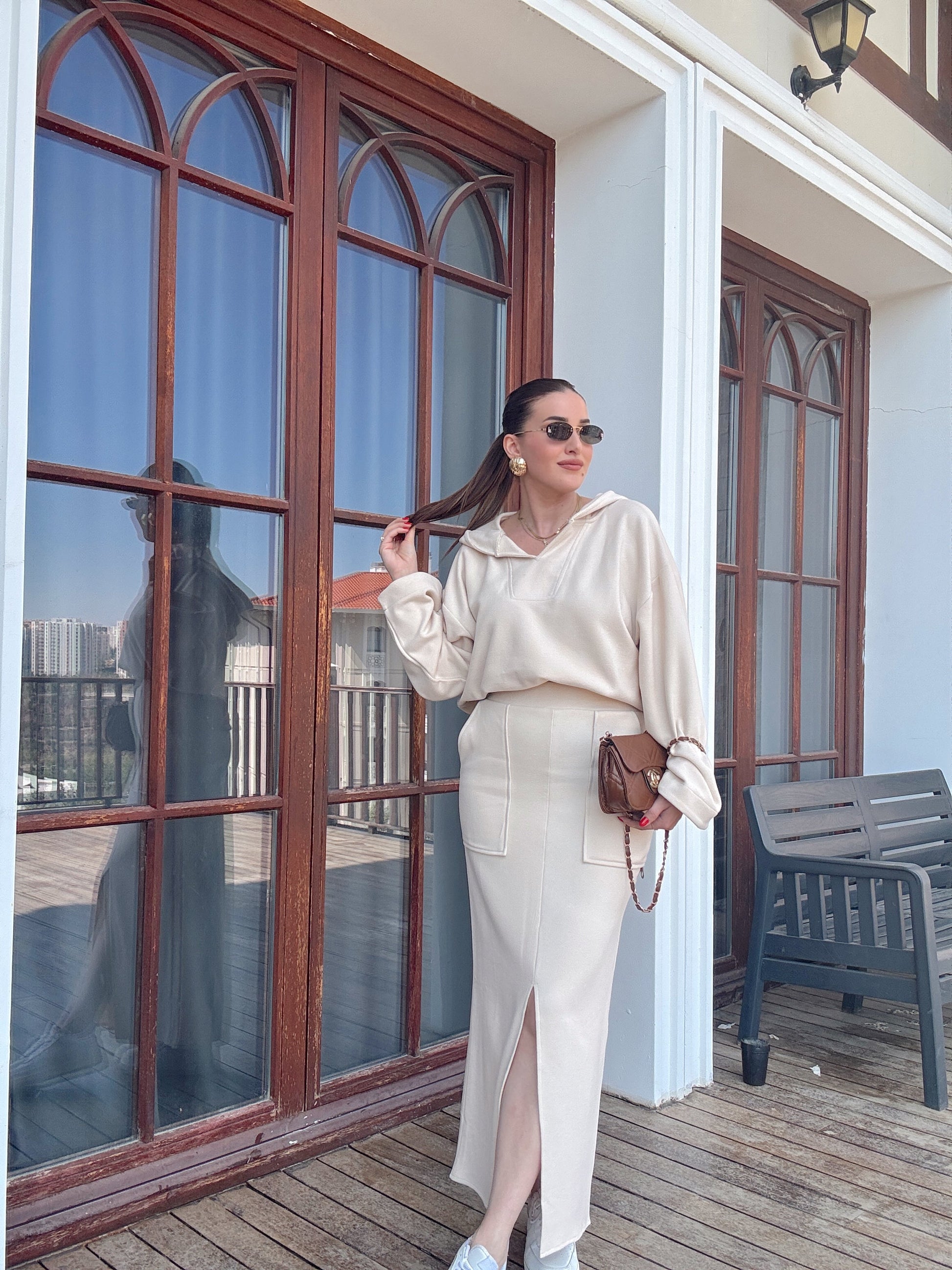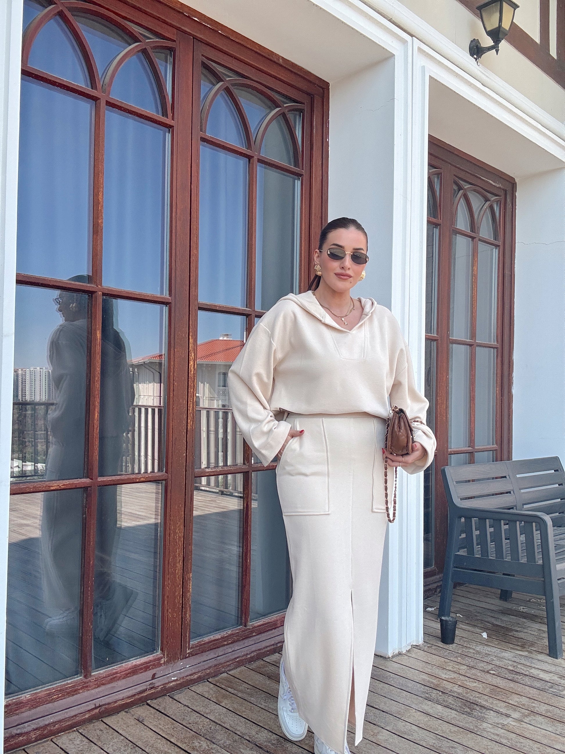 V yaka Kapüşonlu Yırtmaçlı etek takım bej