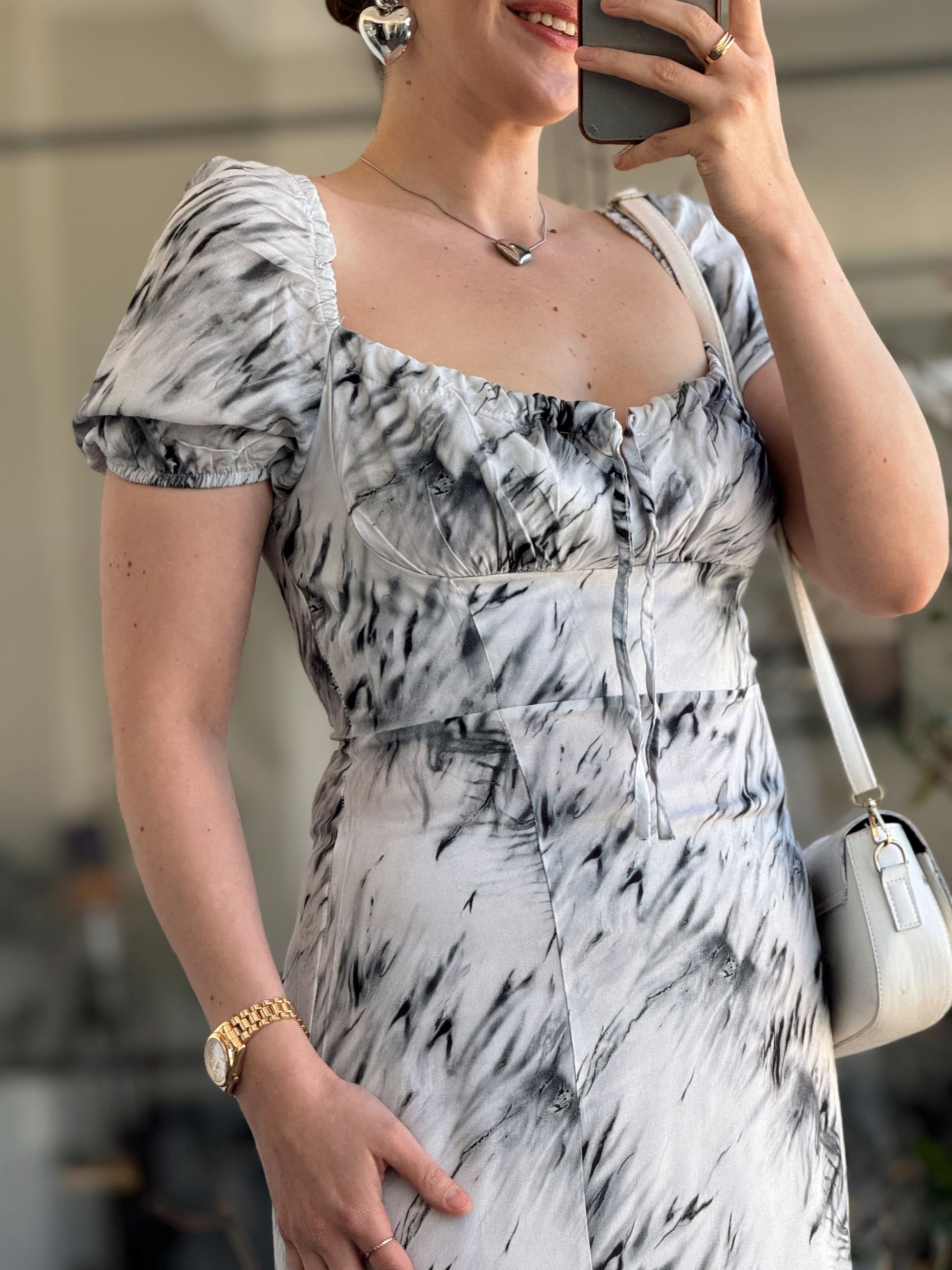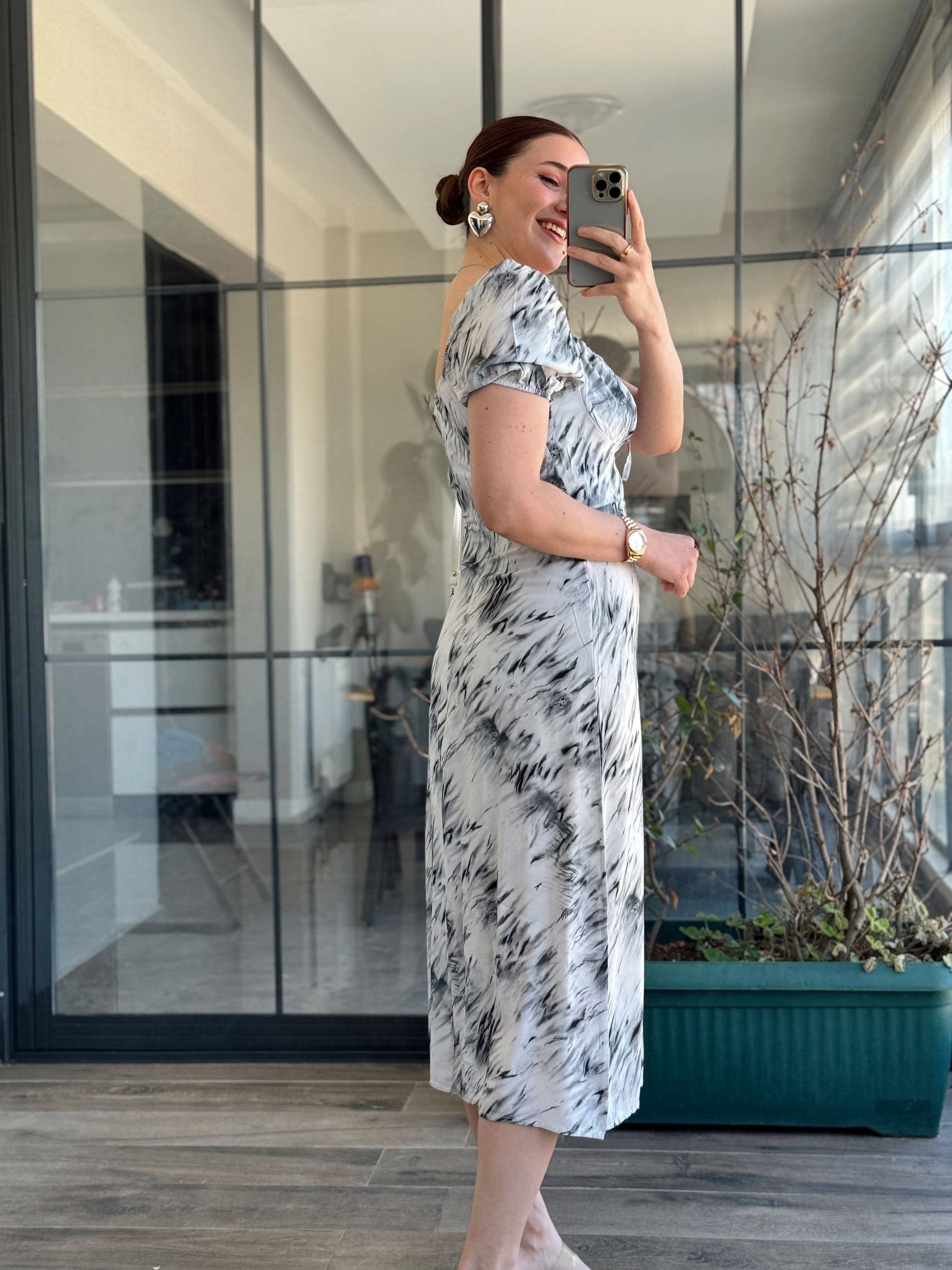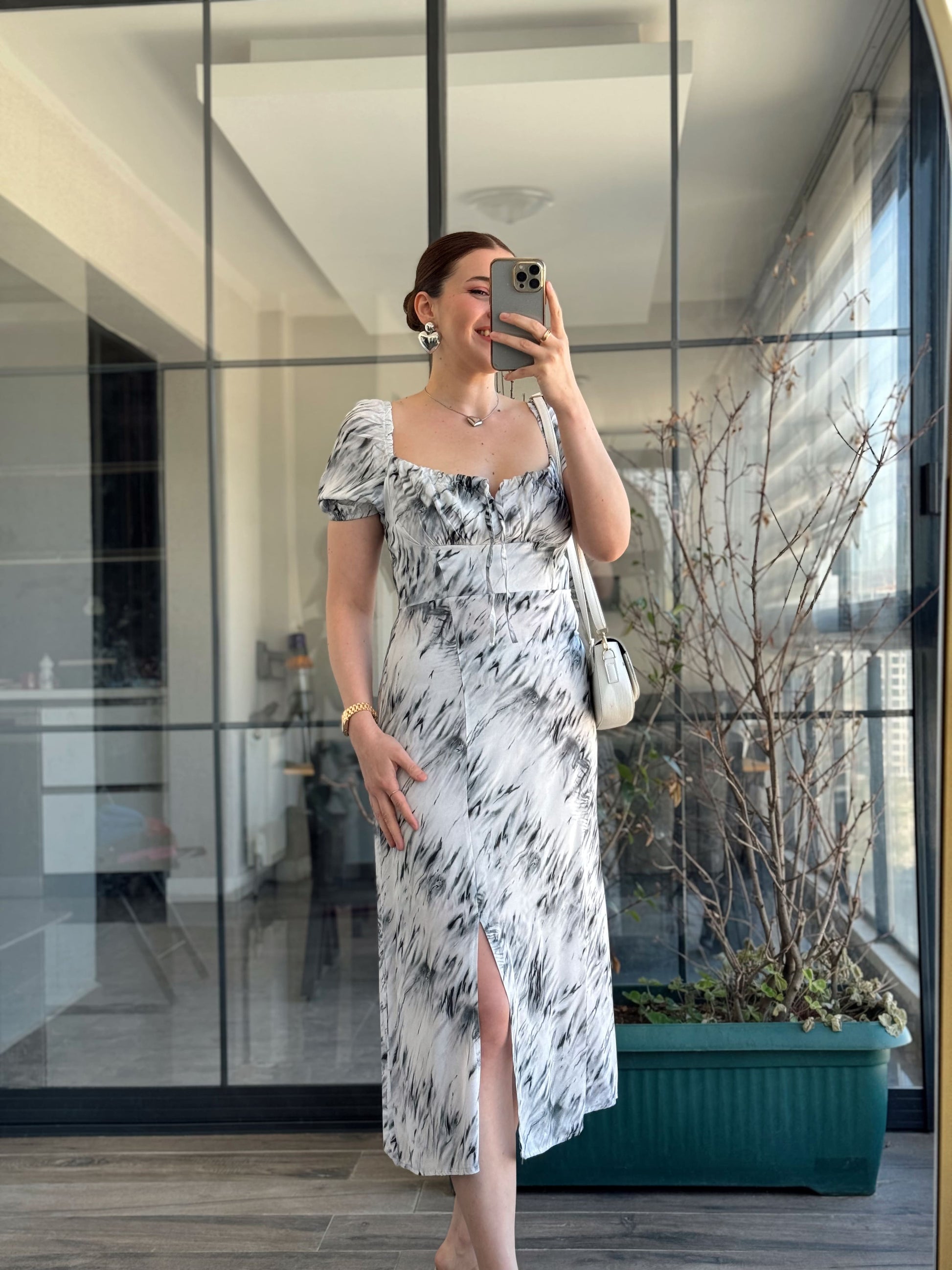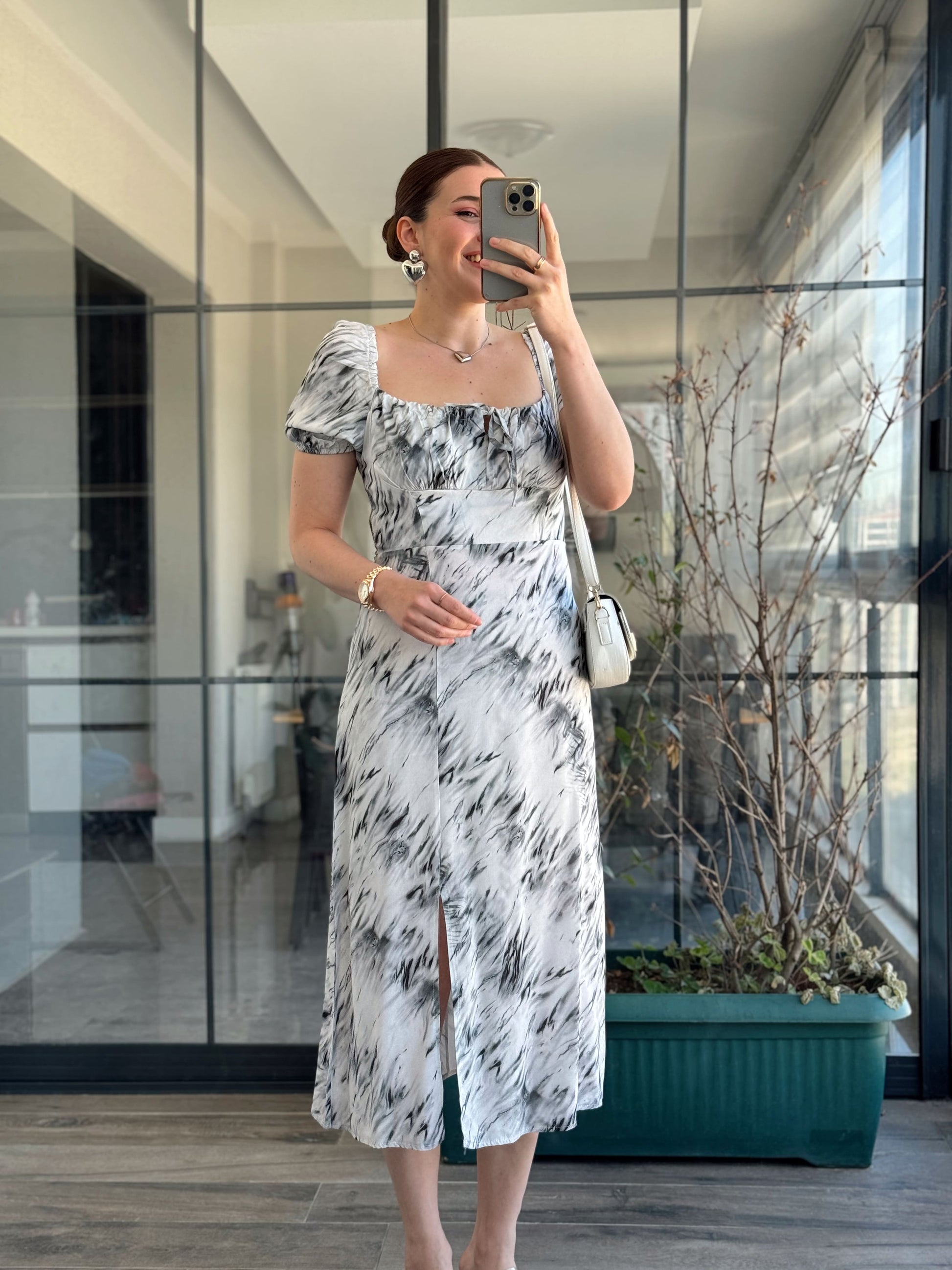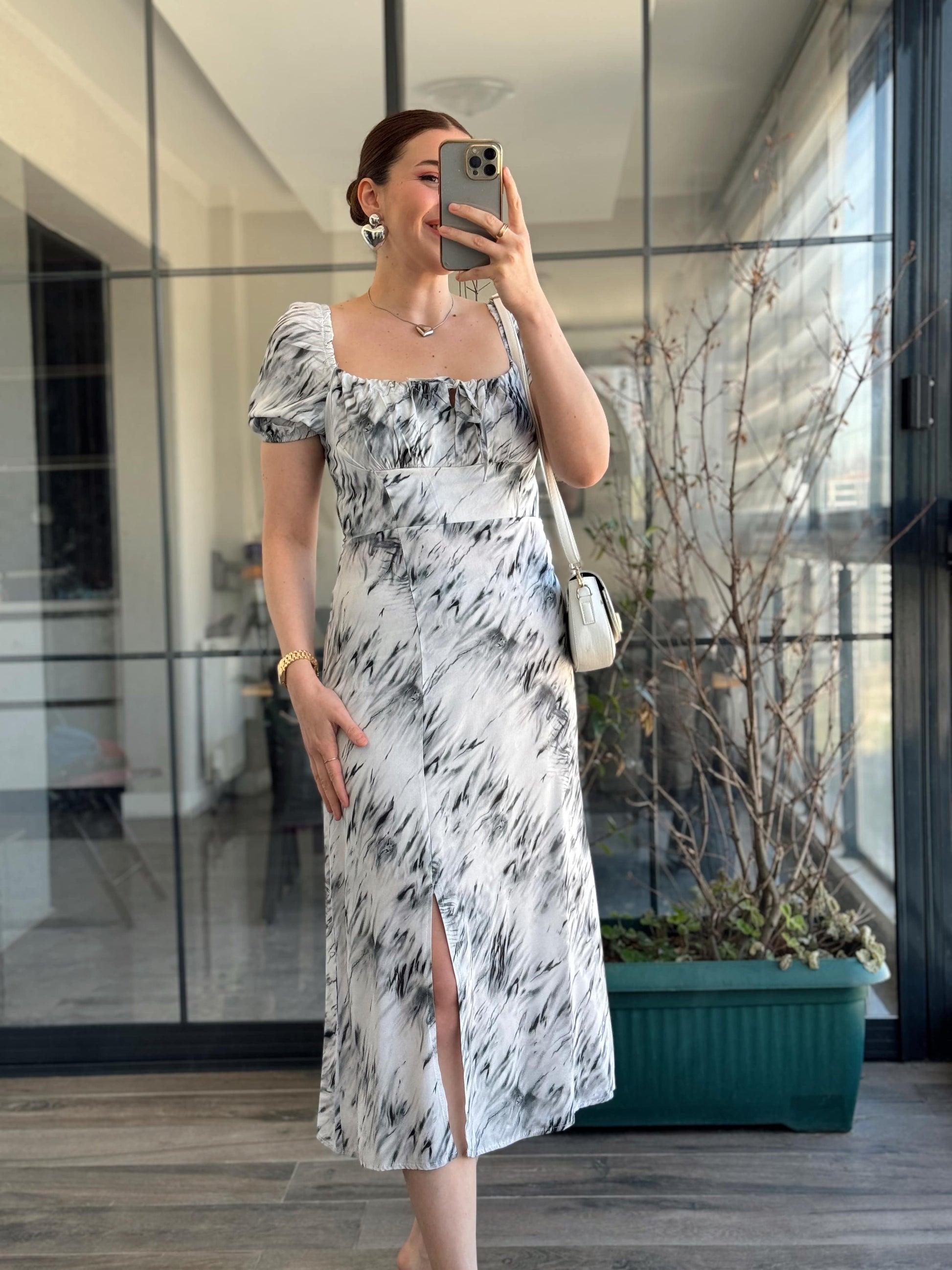Vintage Desen Yırtmaçlı Kurdeleli Elbise - GRİ