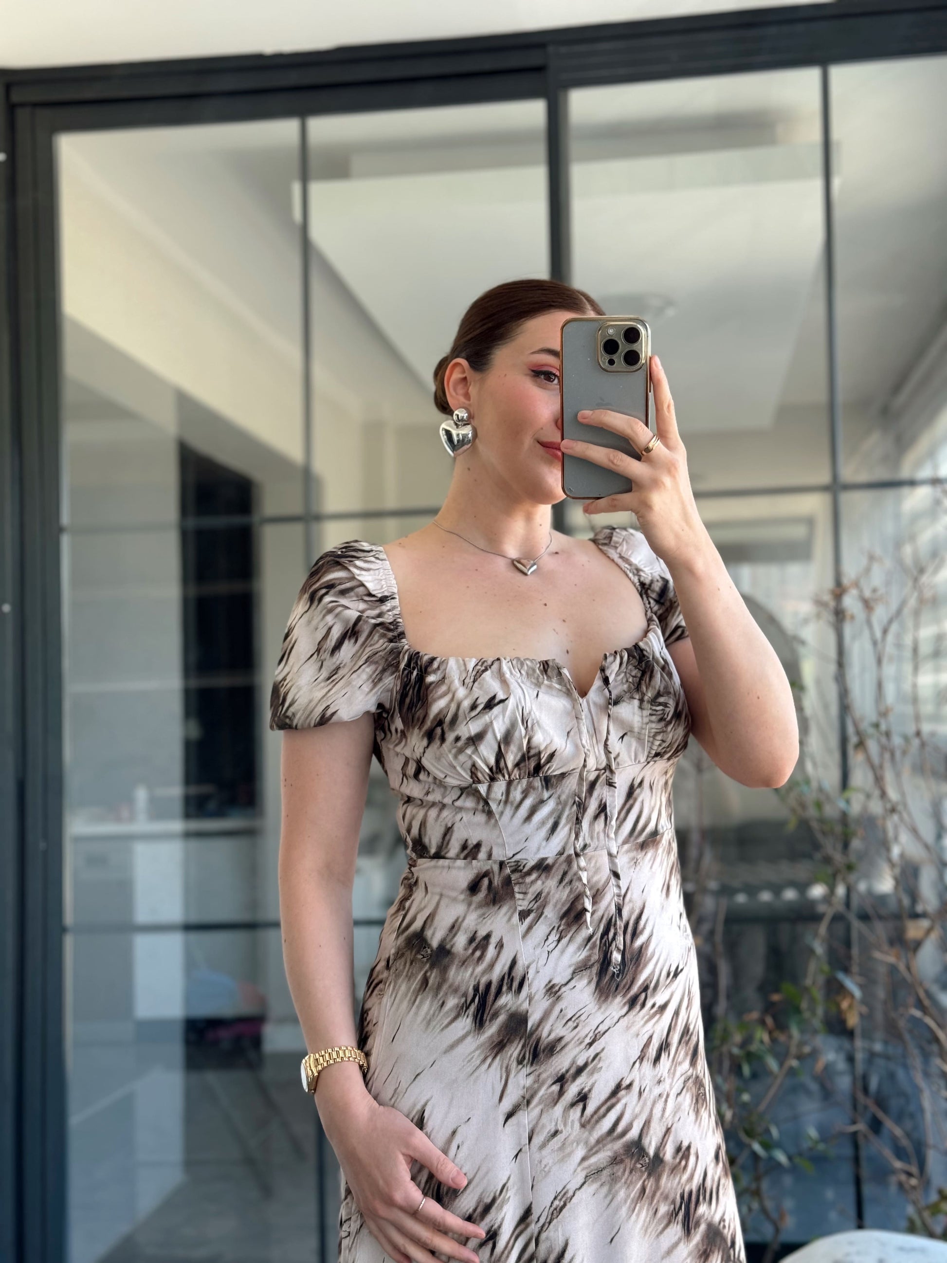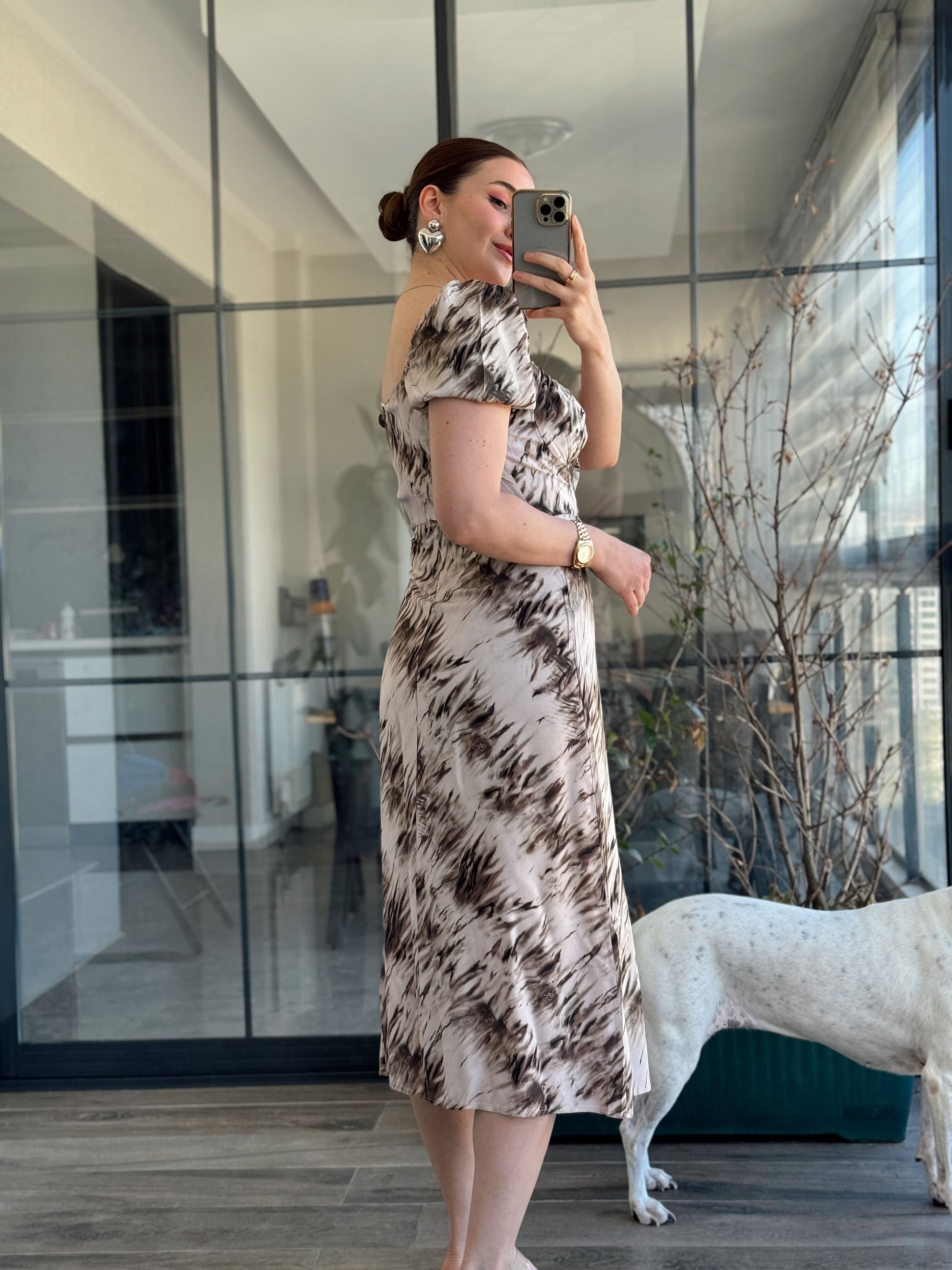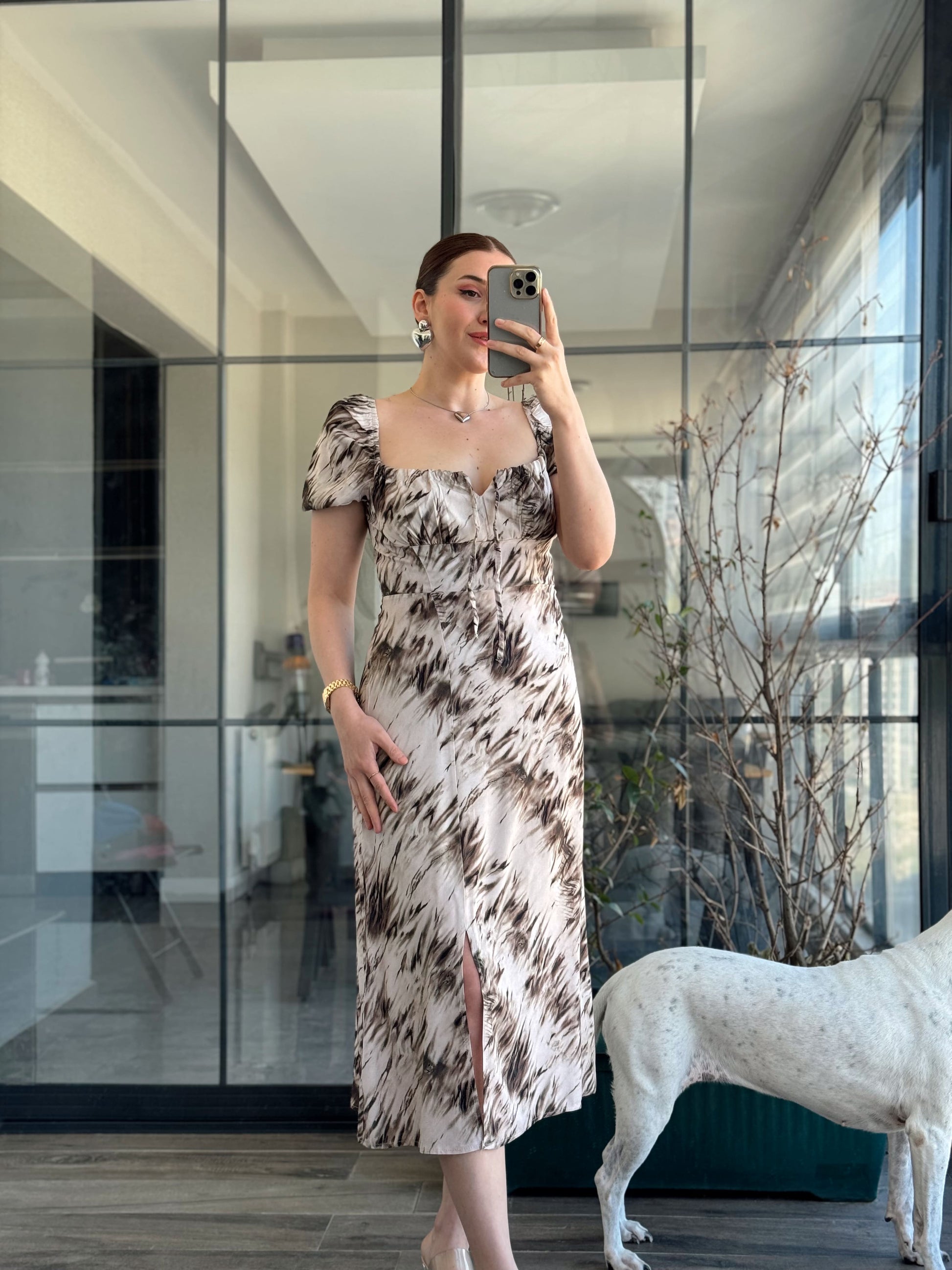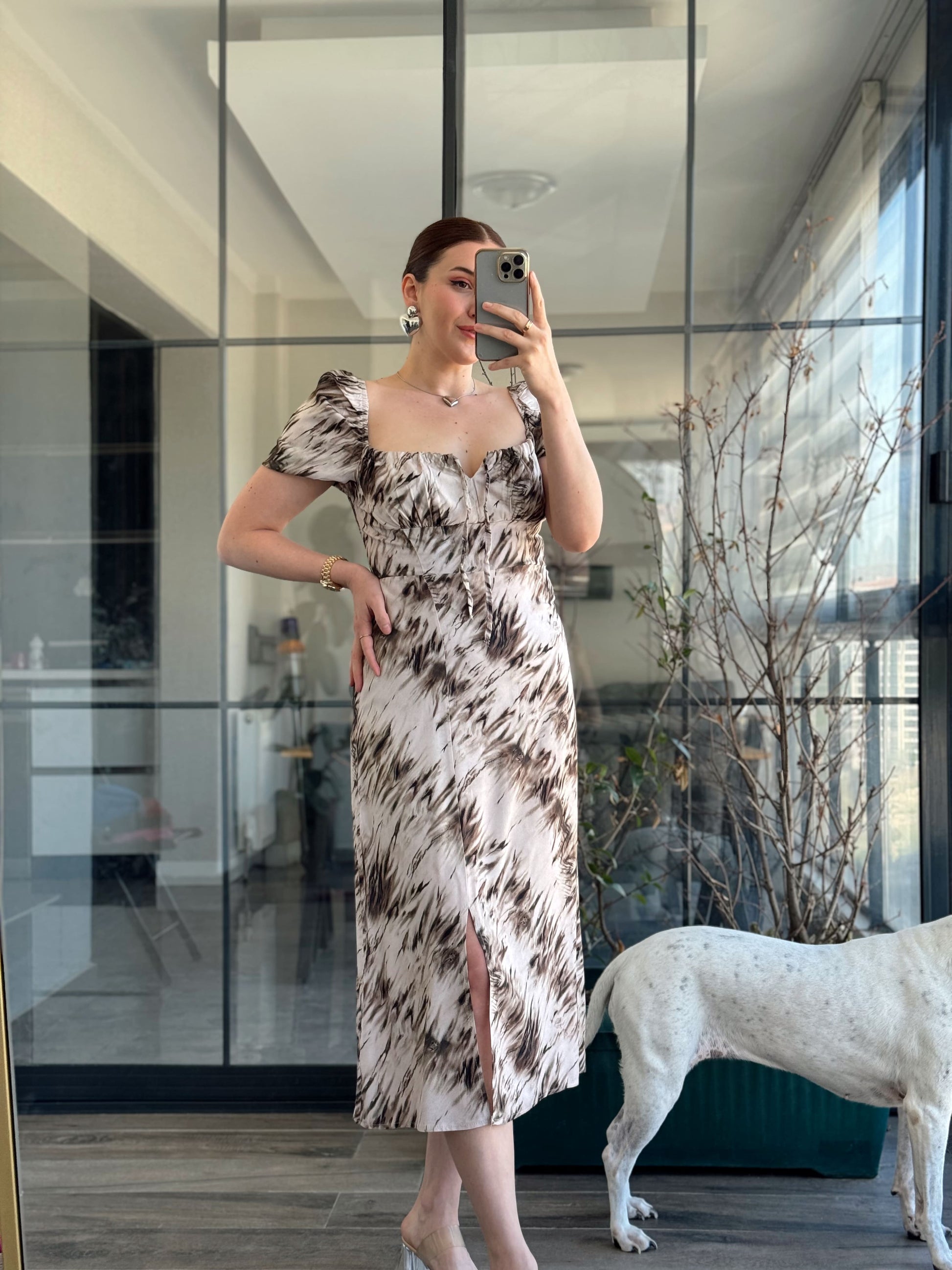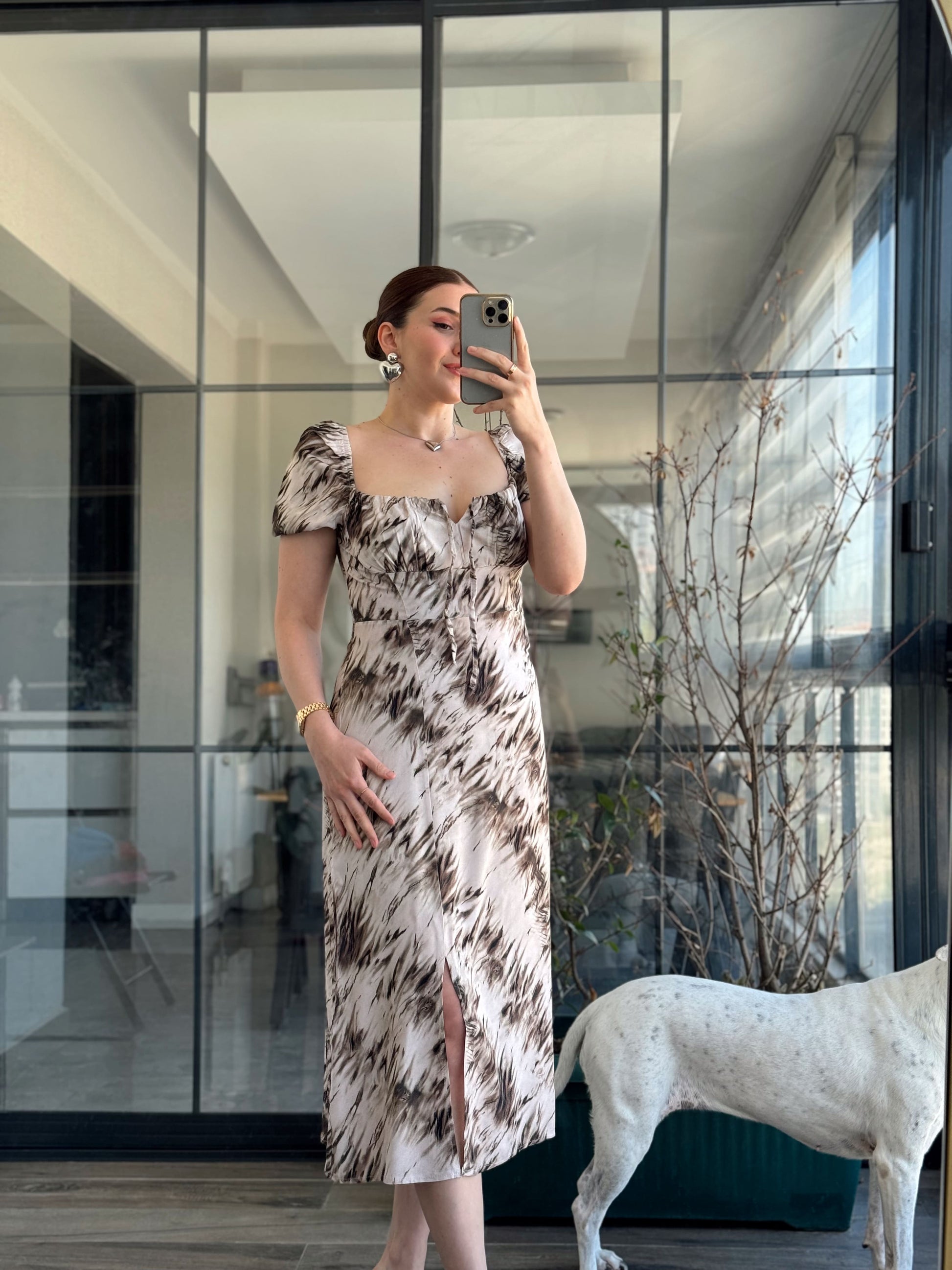 Vintage Desen Yırtmaçlı Kurdeleli Elbise - KAHVERENGİ