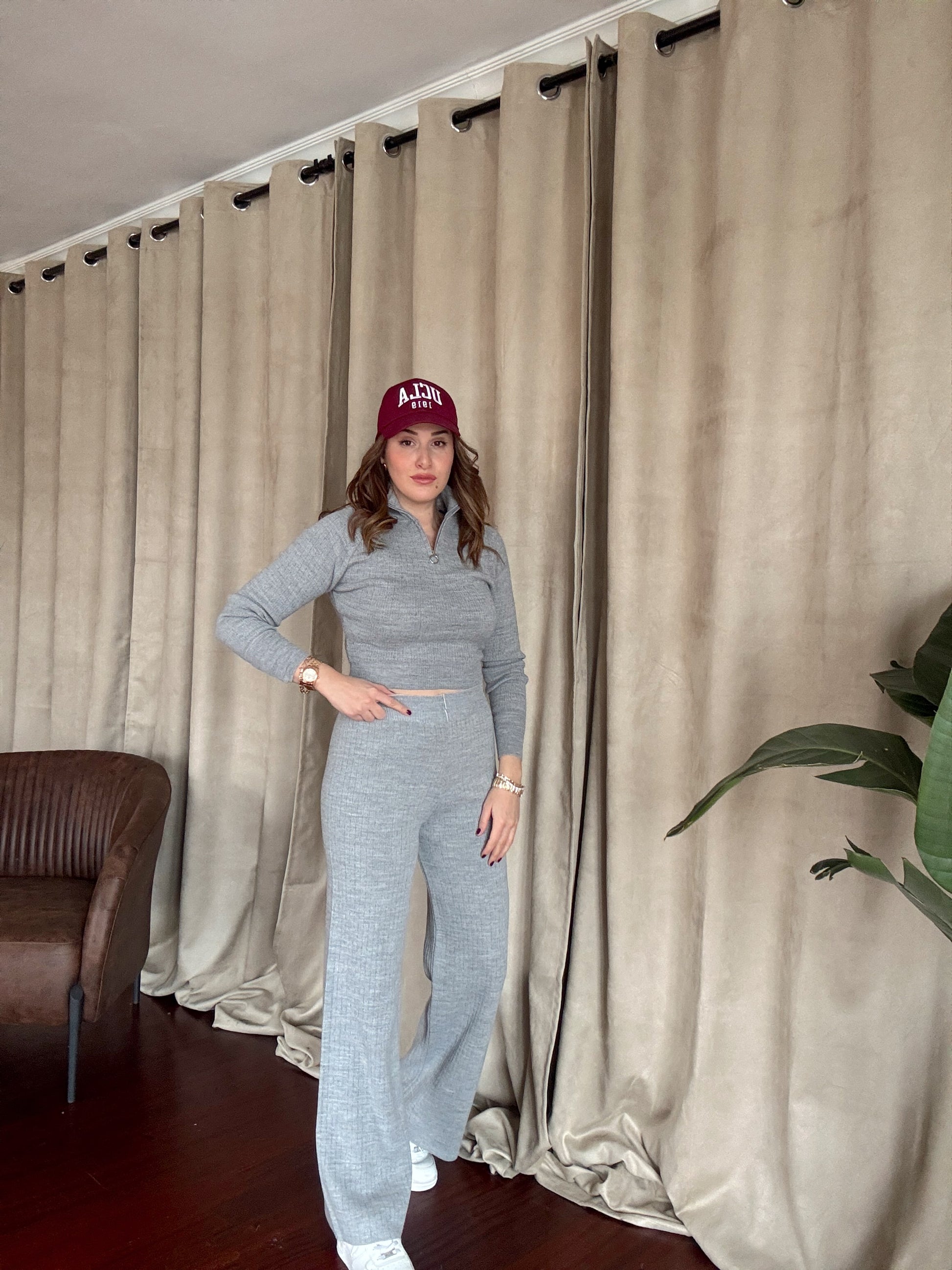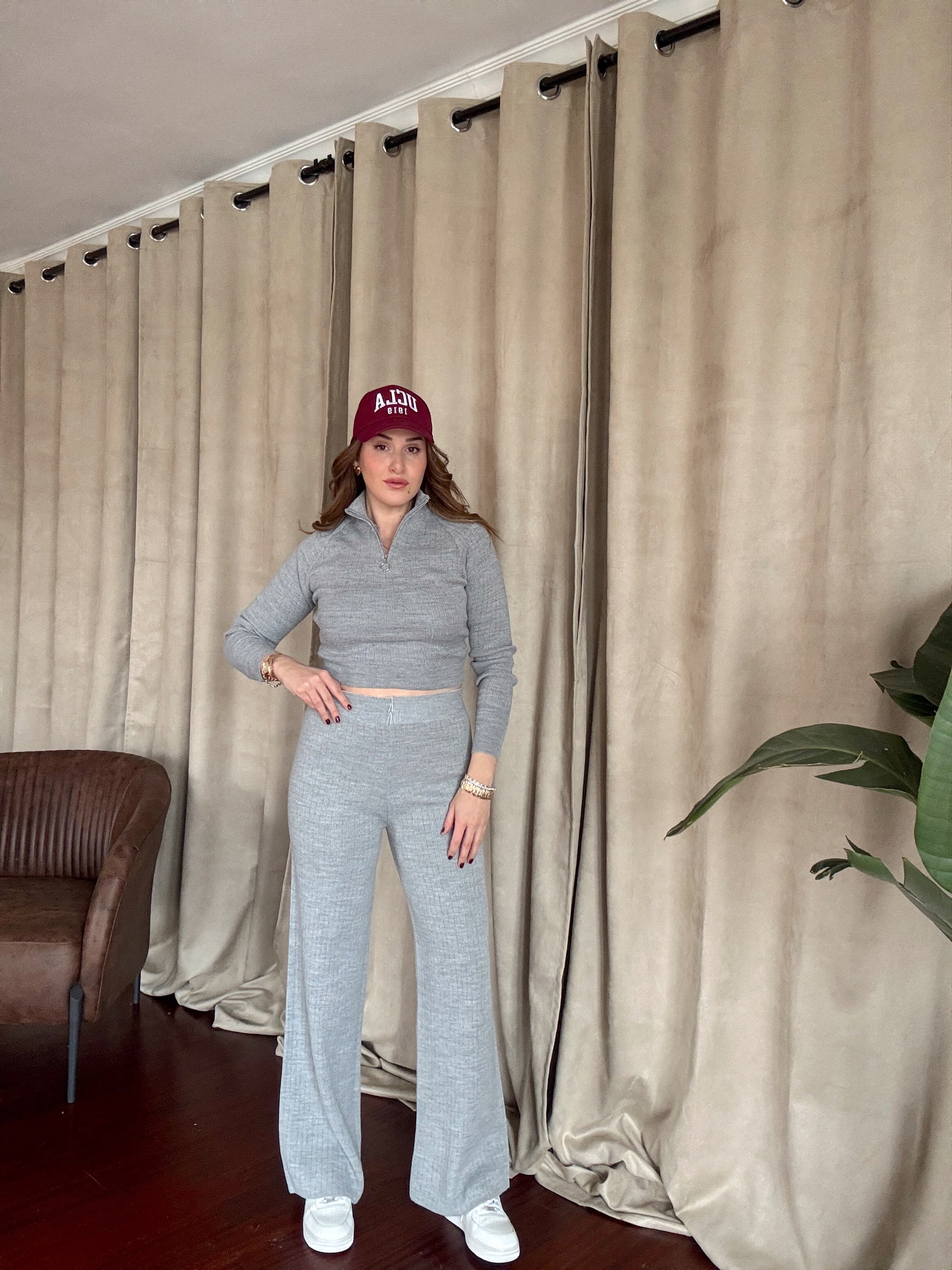 Yaka Fermuar Fitilli Triko Takım - GRİ