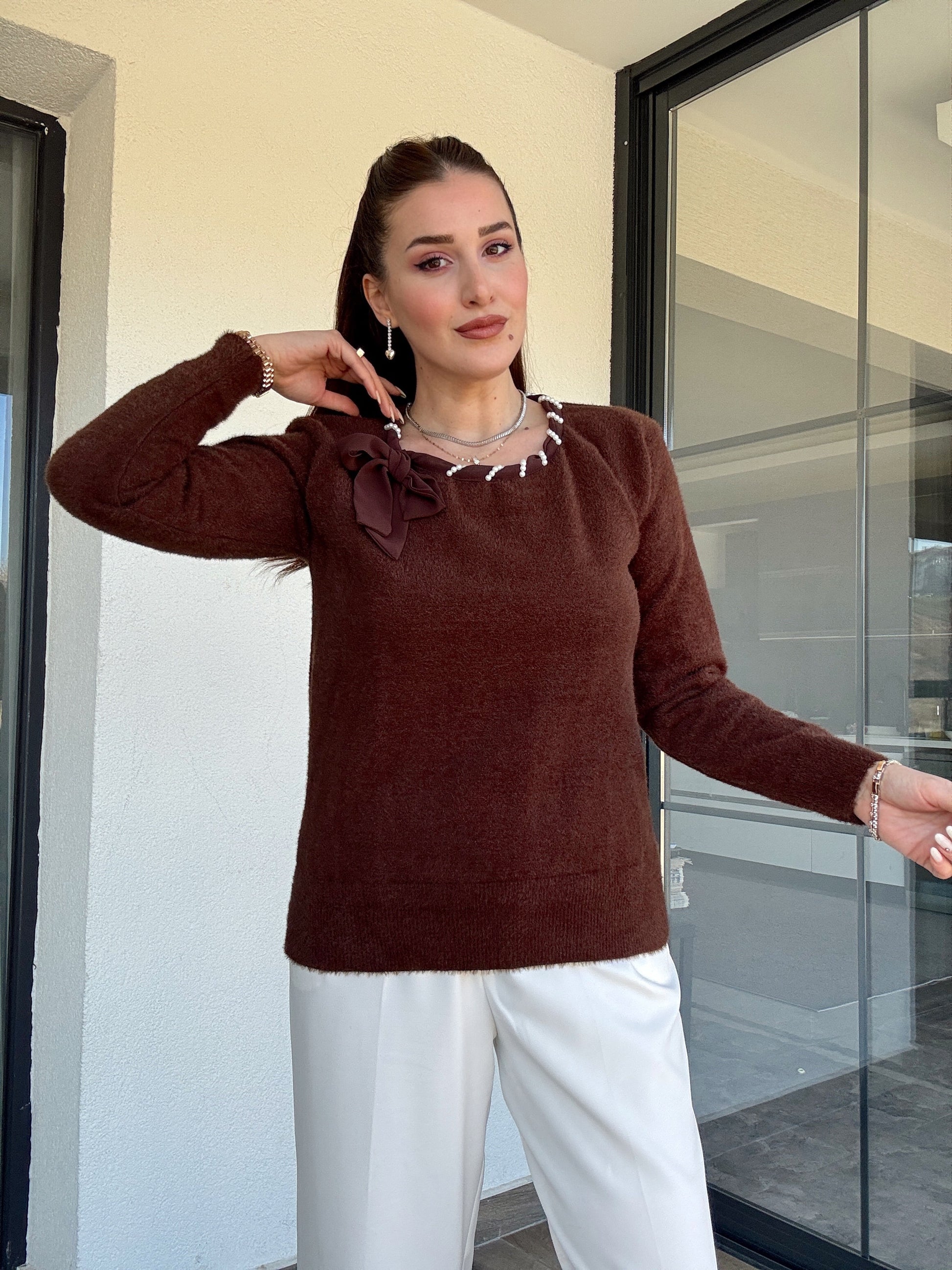 Yaka inci detaylı SİMLİ kazak KAHVERENGİ