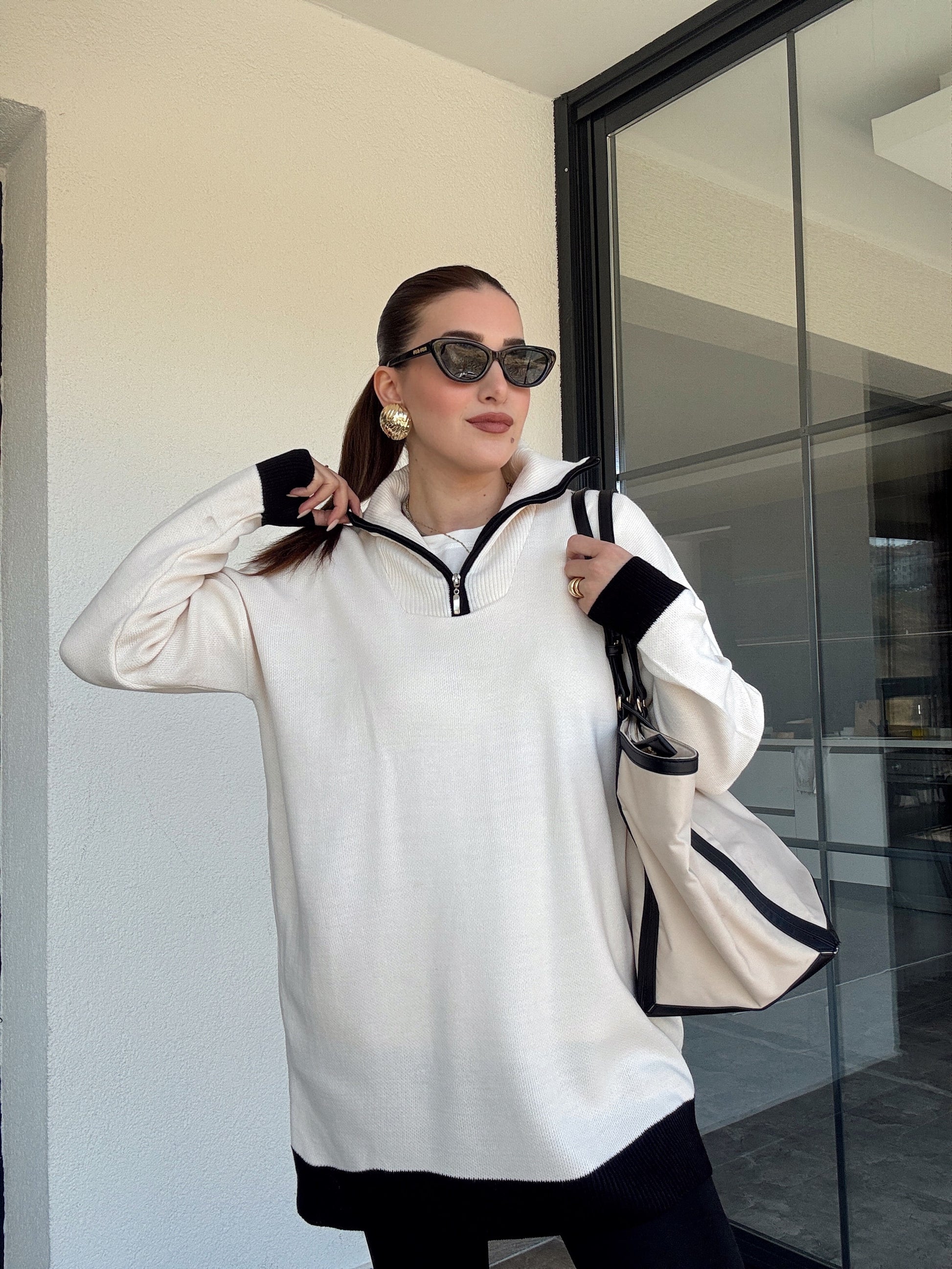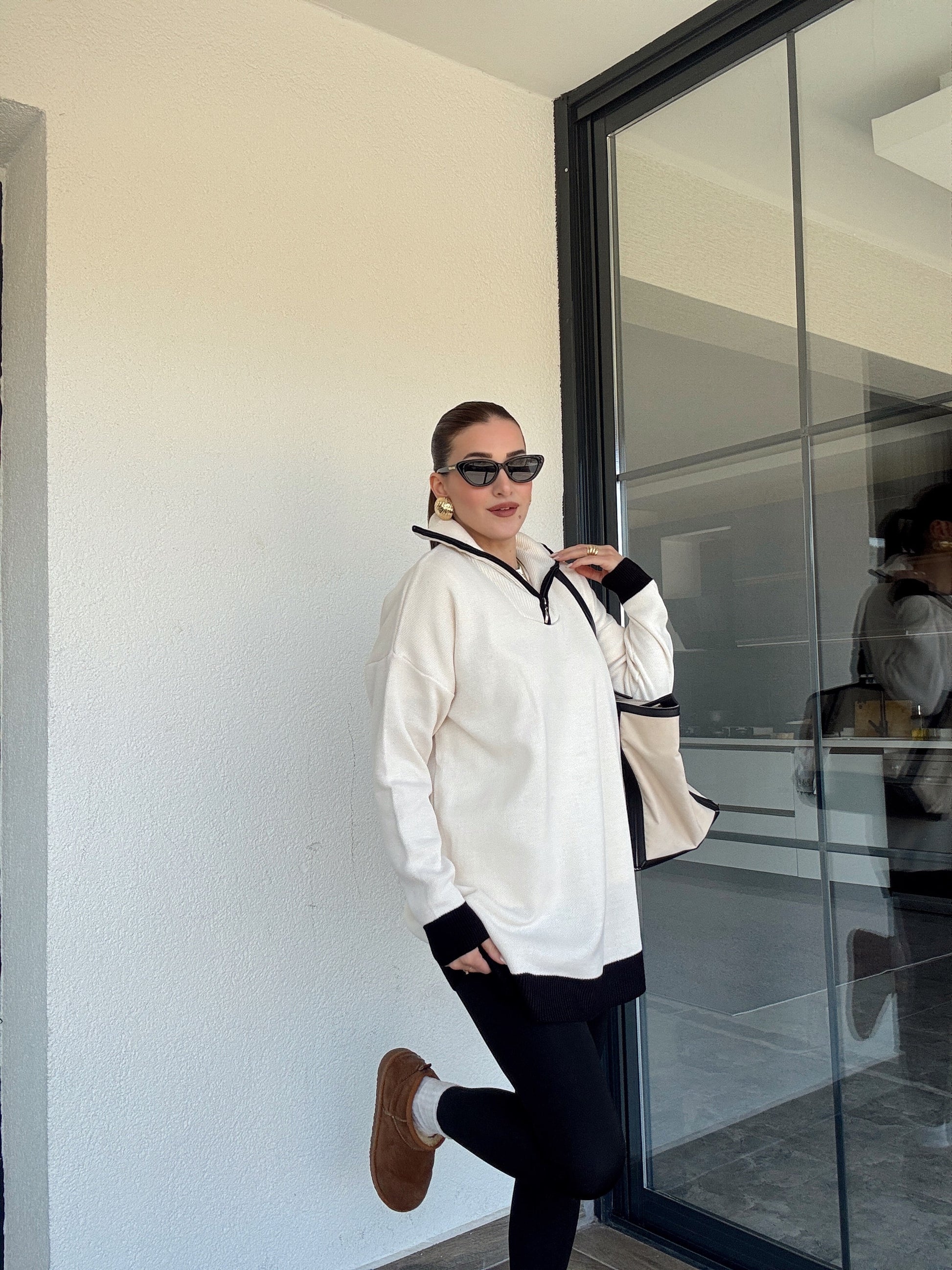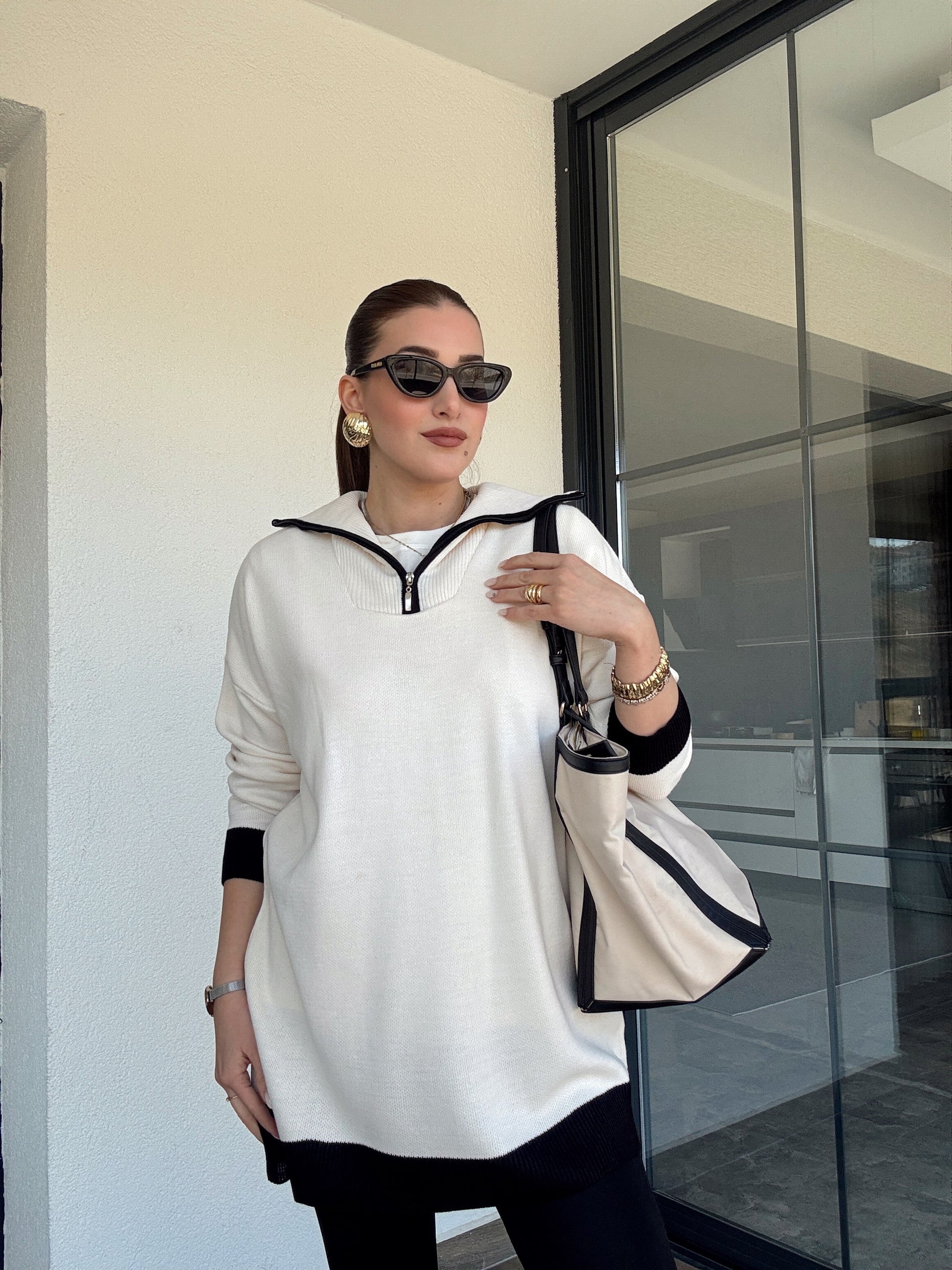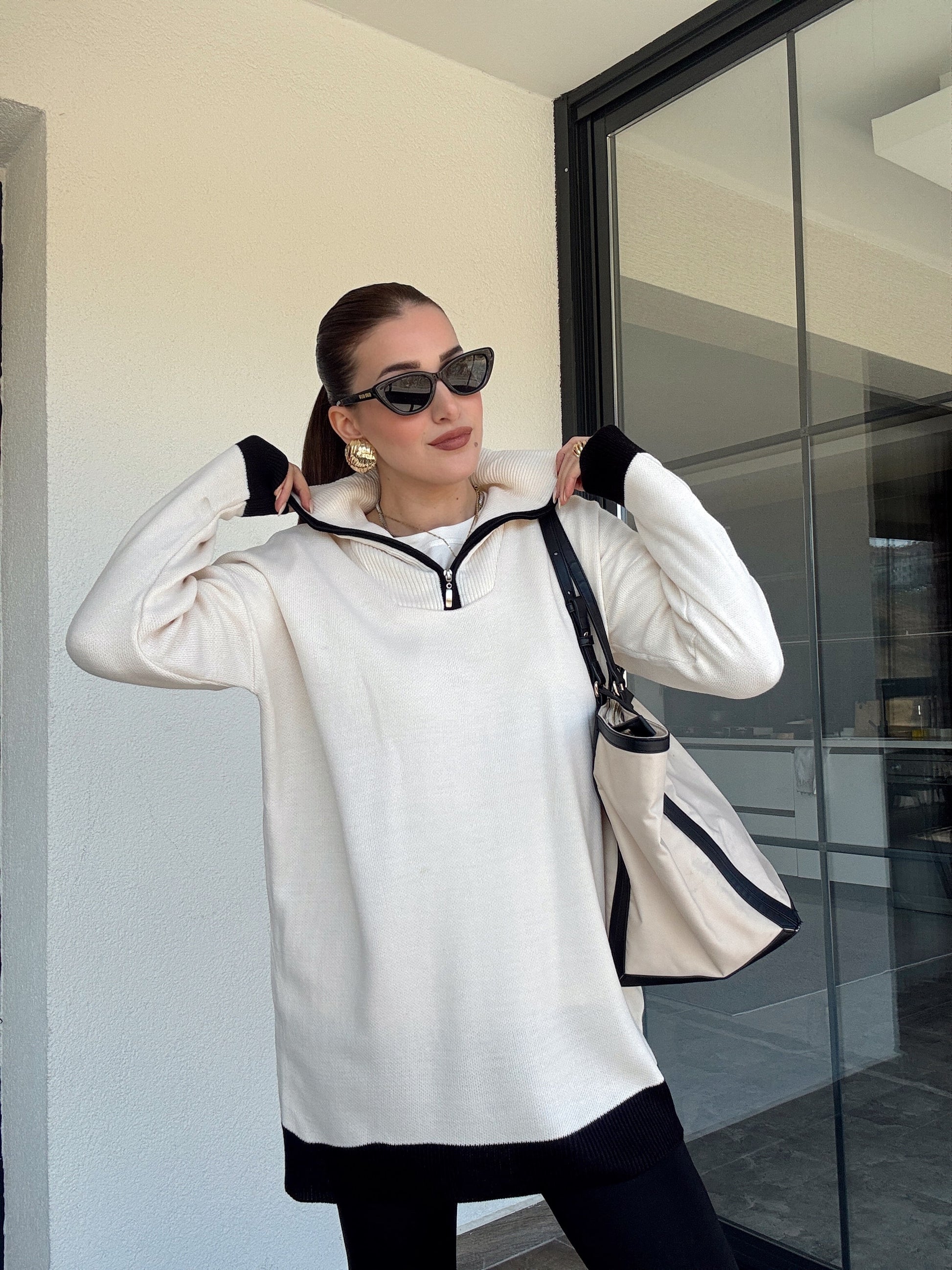 Yaka Renkli Fermuarlı Triko Kazak - LATTE SİYAH