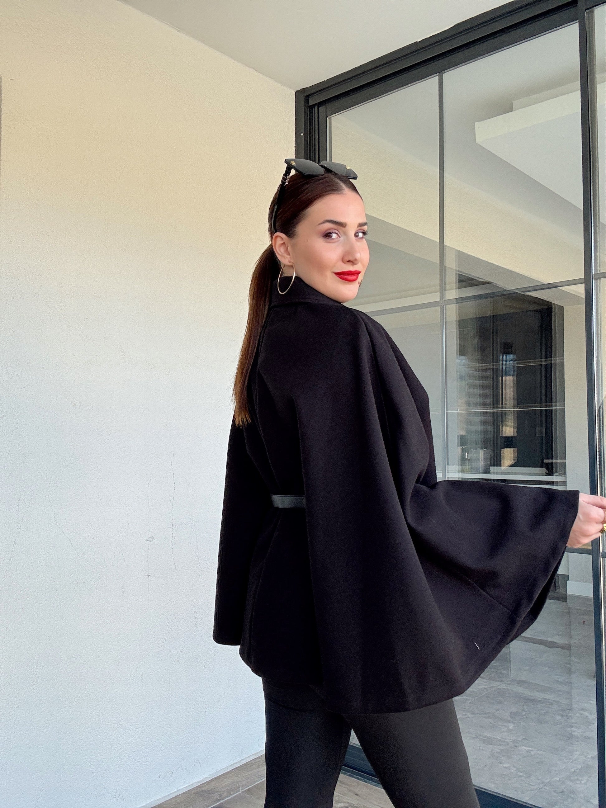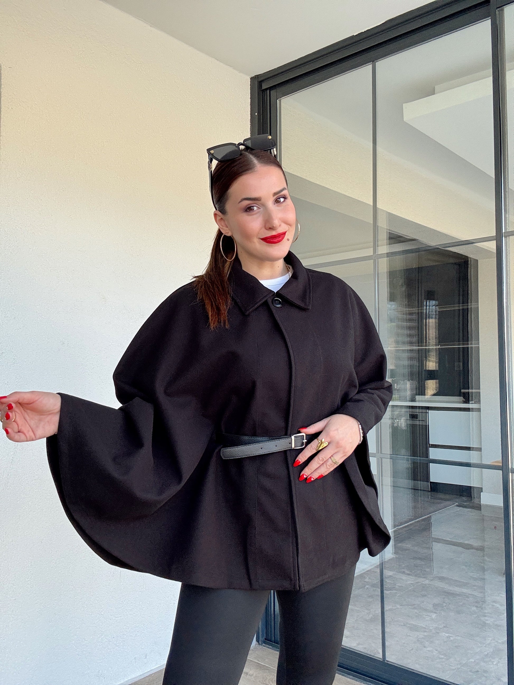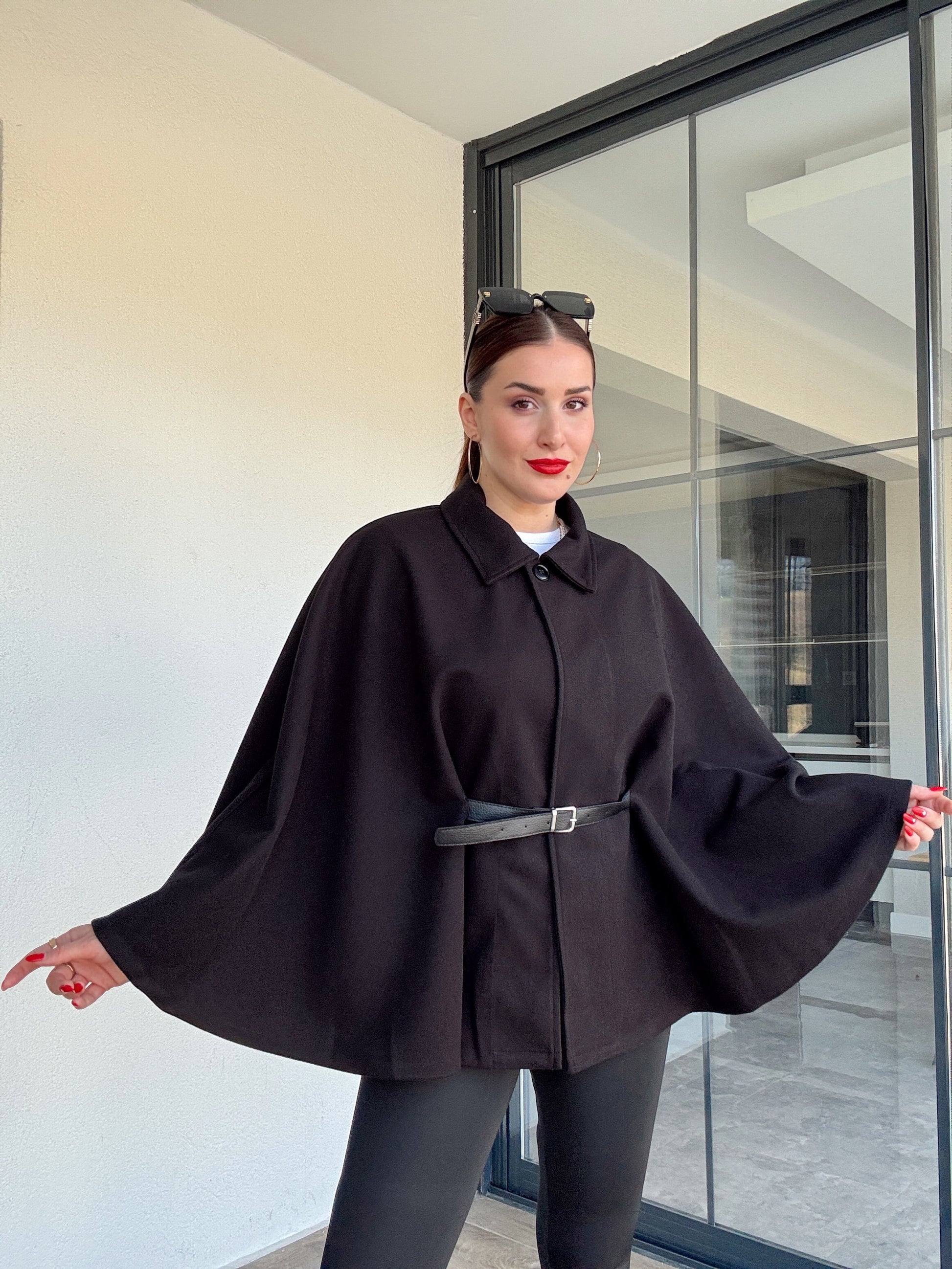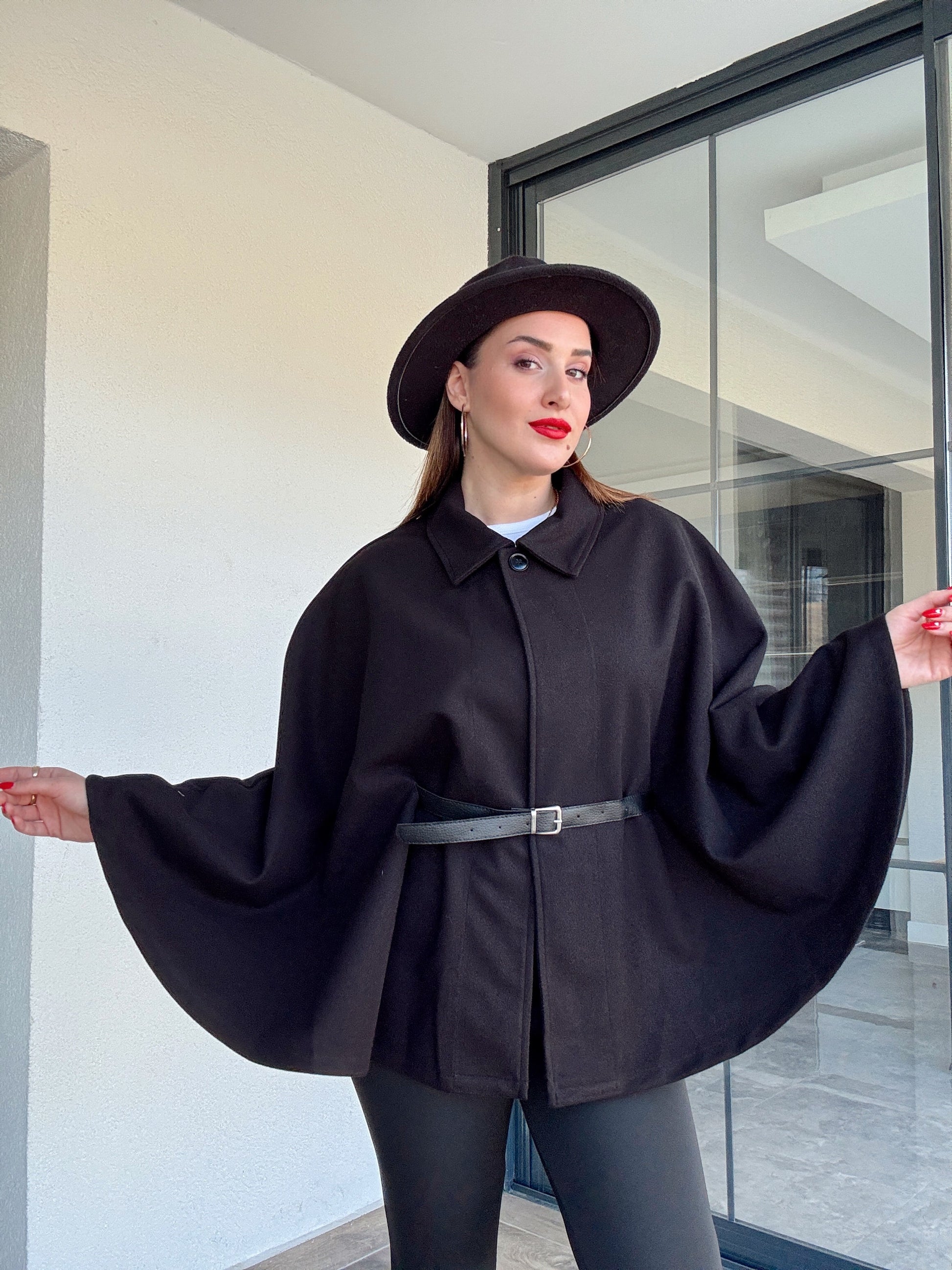 Yakalı kemerli panço siyah