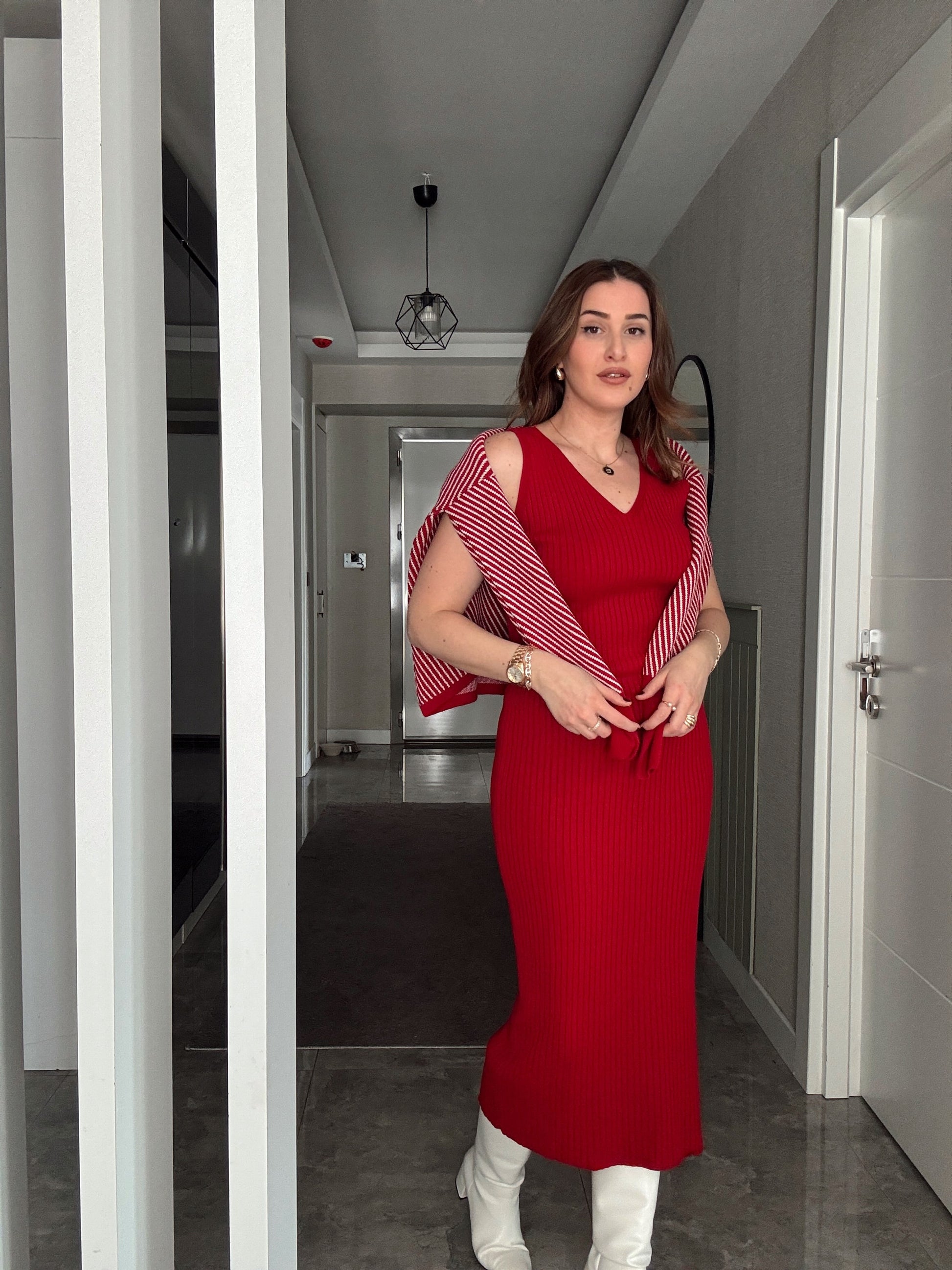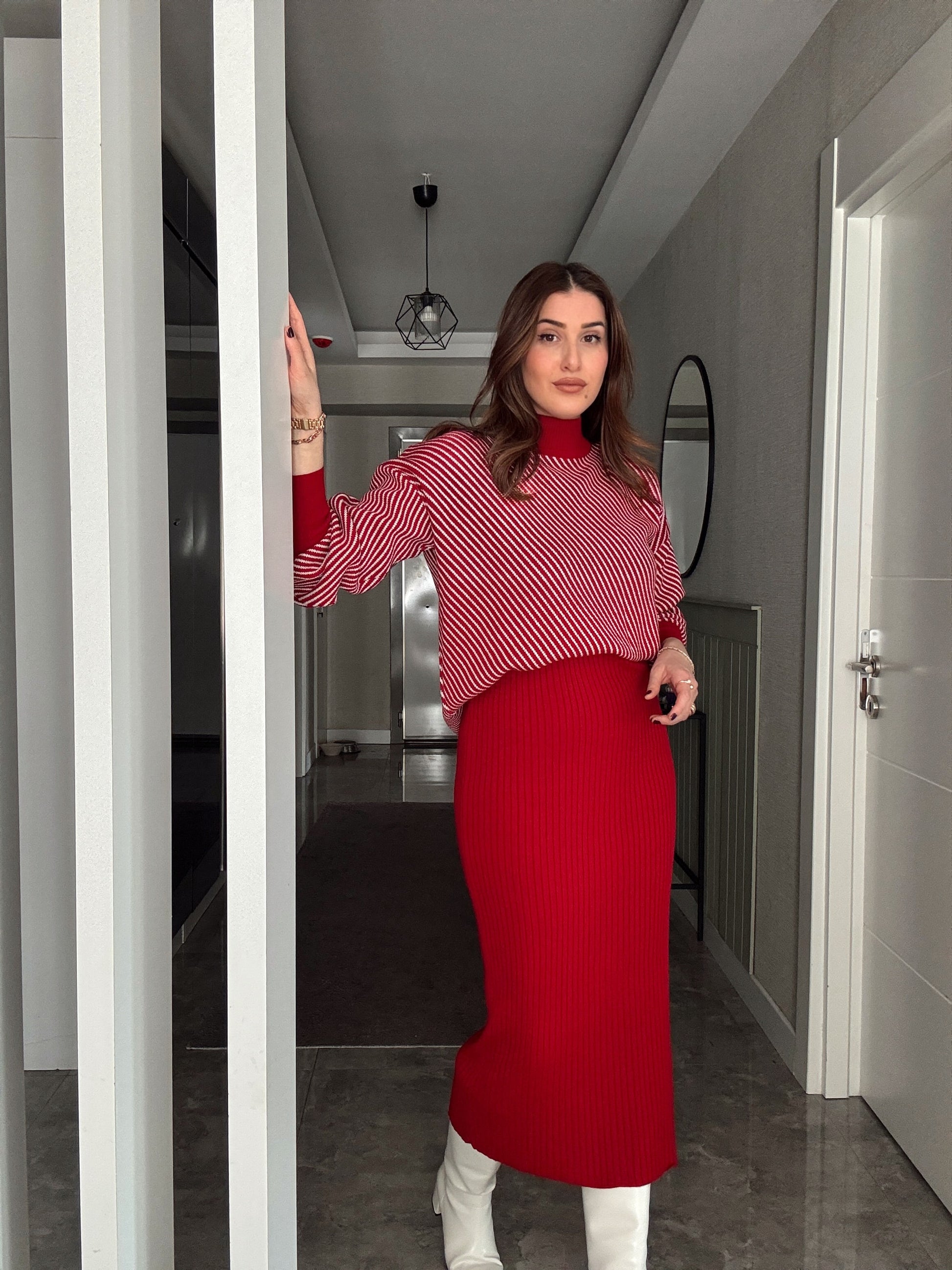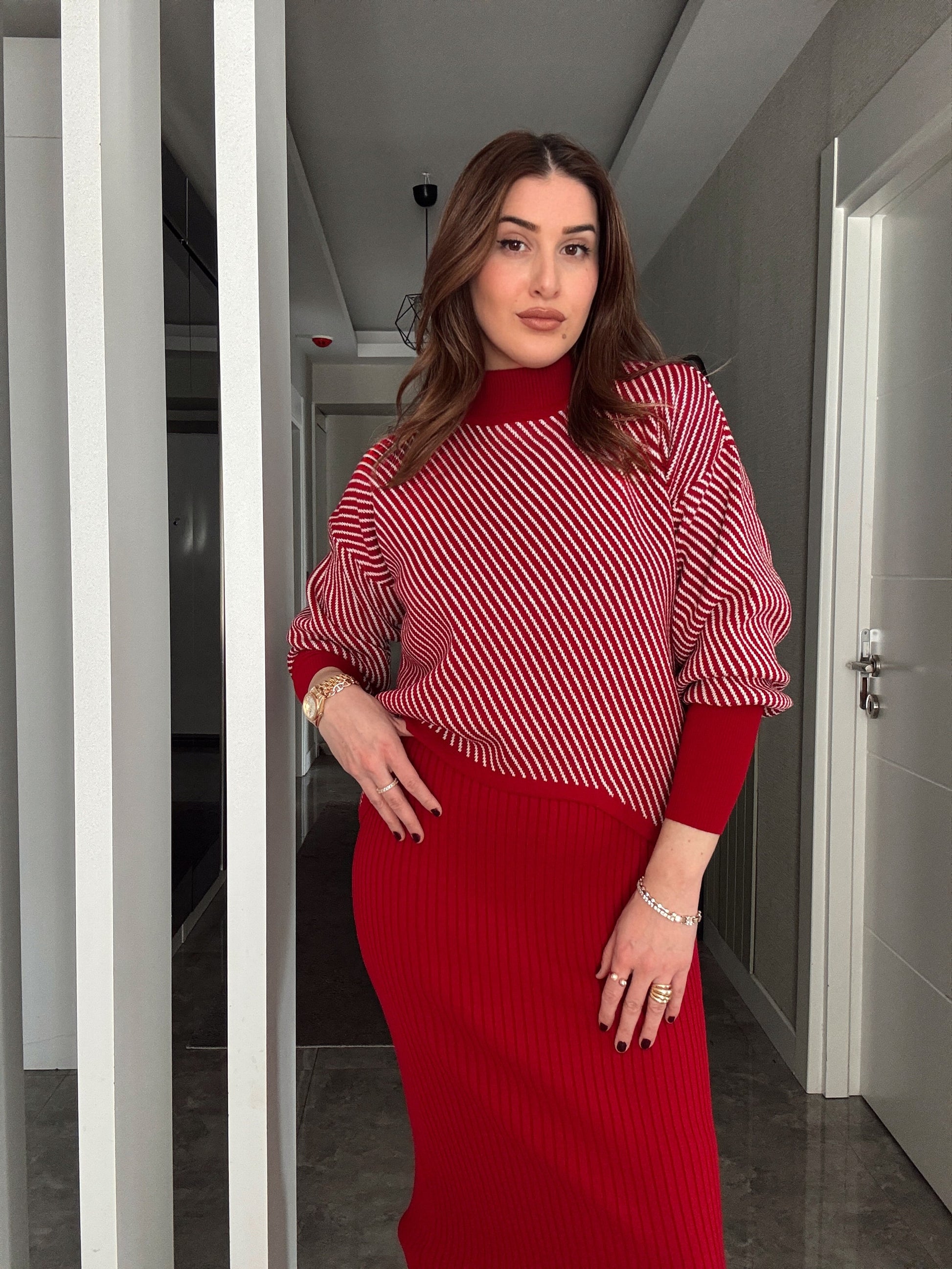 Yatay Çizgili Pikeli Jileli Takım - KIRMIZI