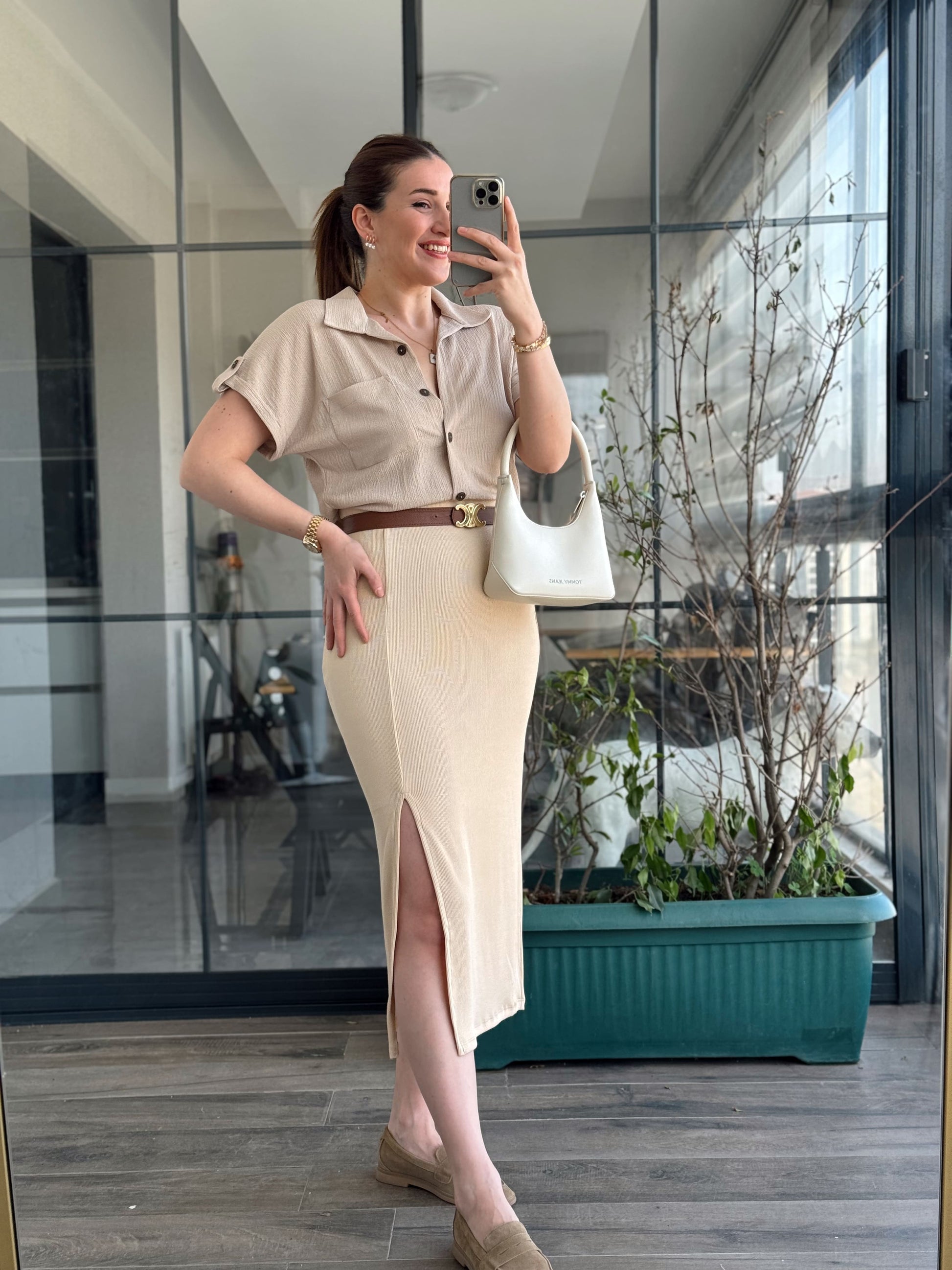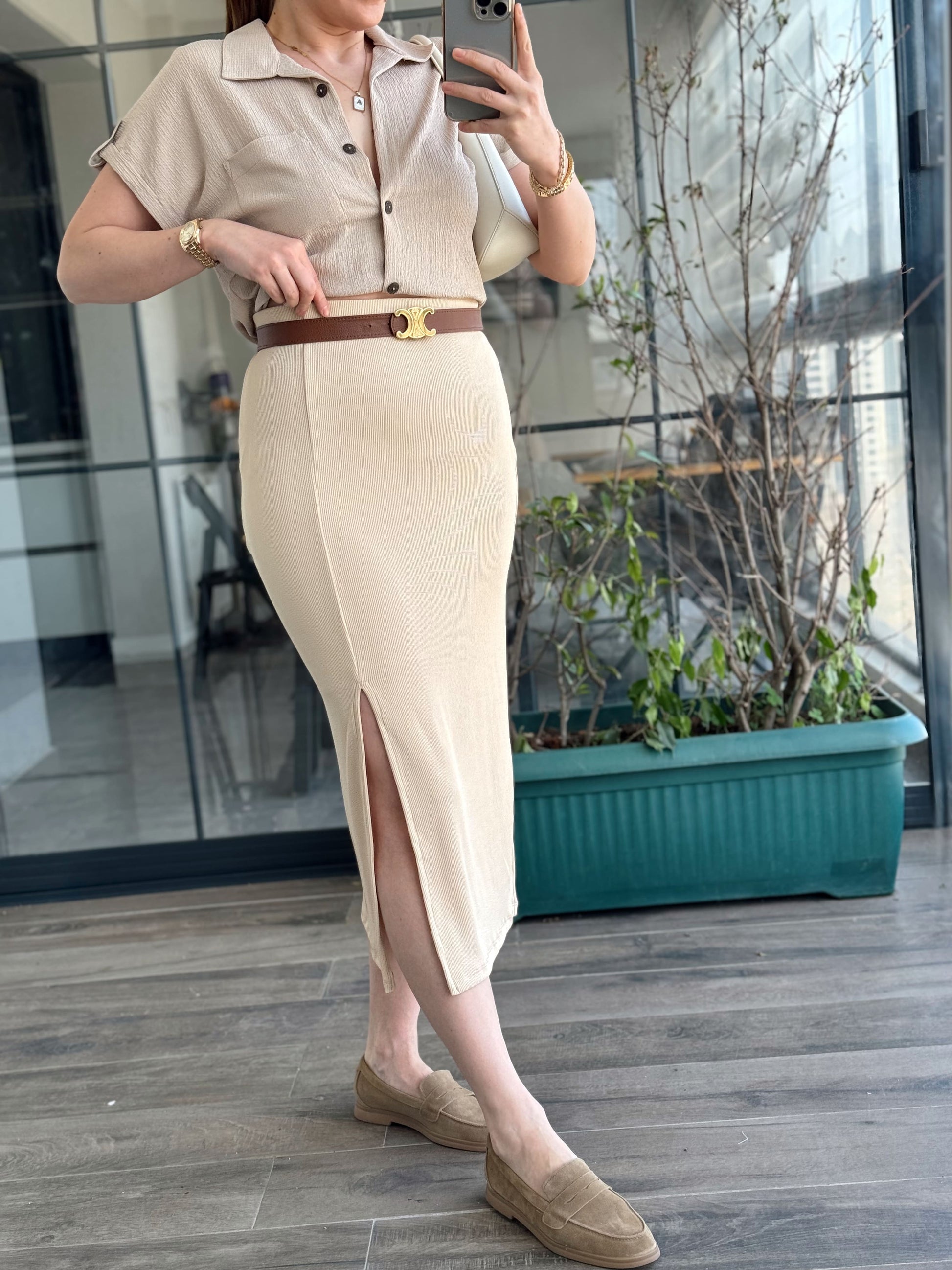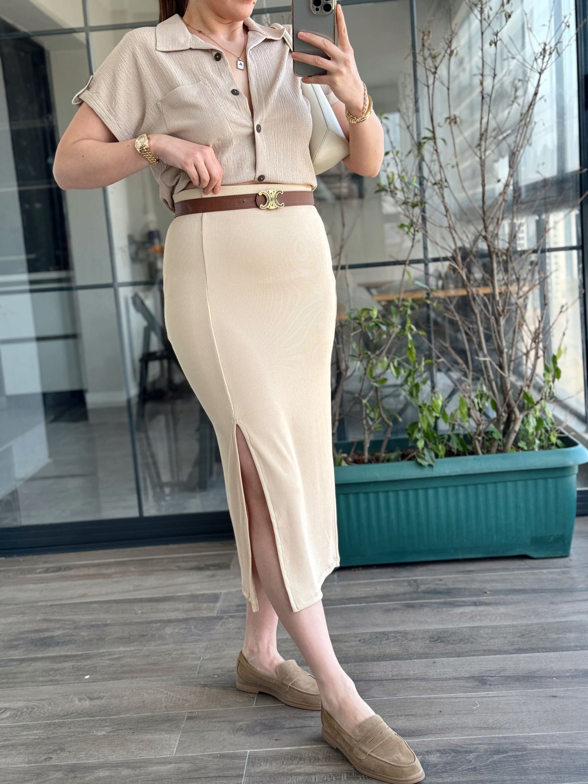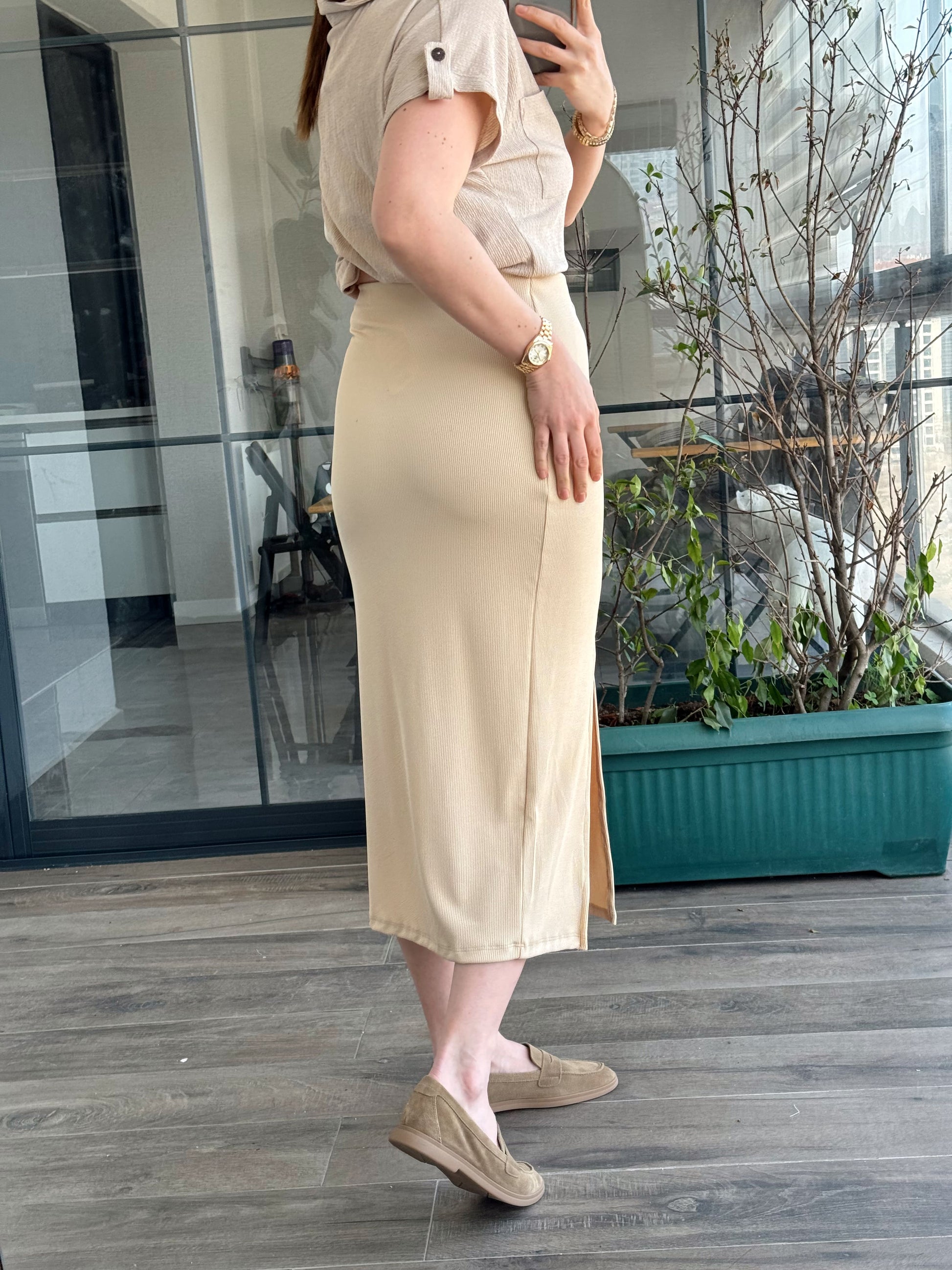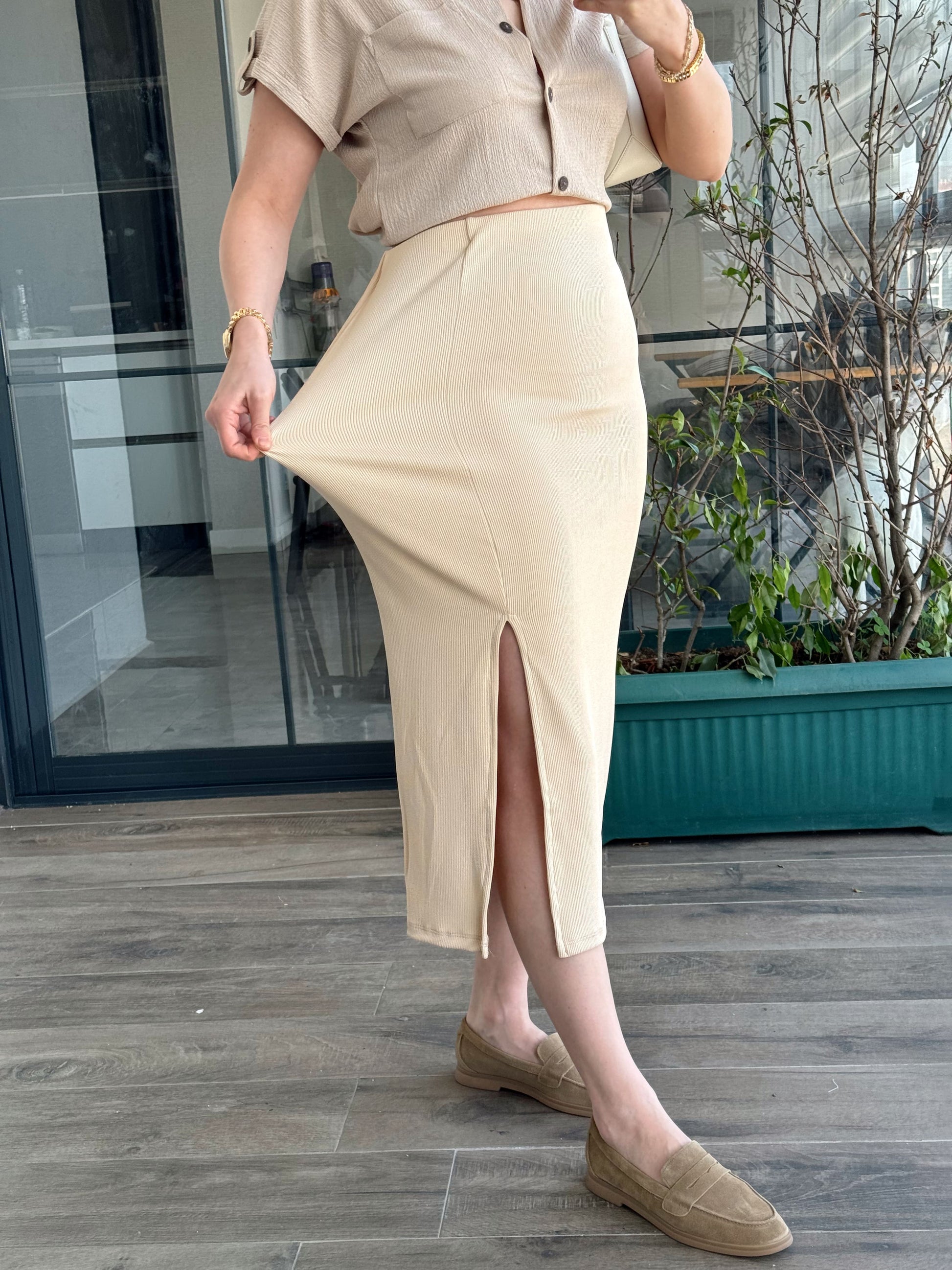 Yırtmaçlı Basic Etek - BEJ